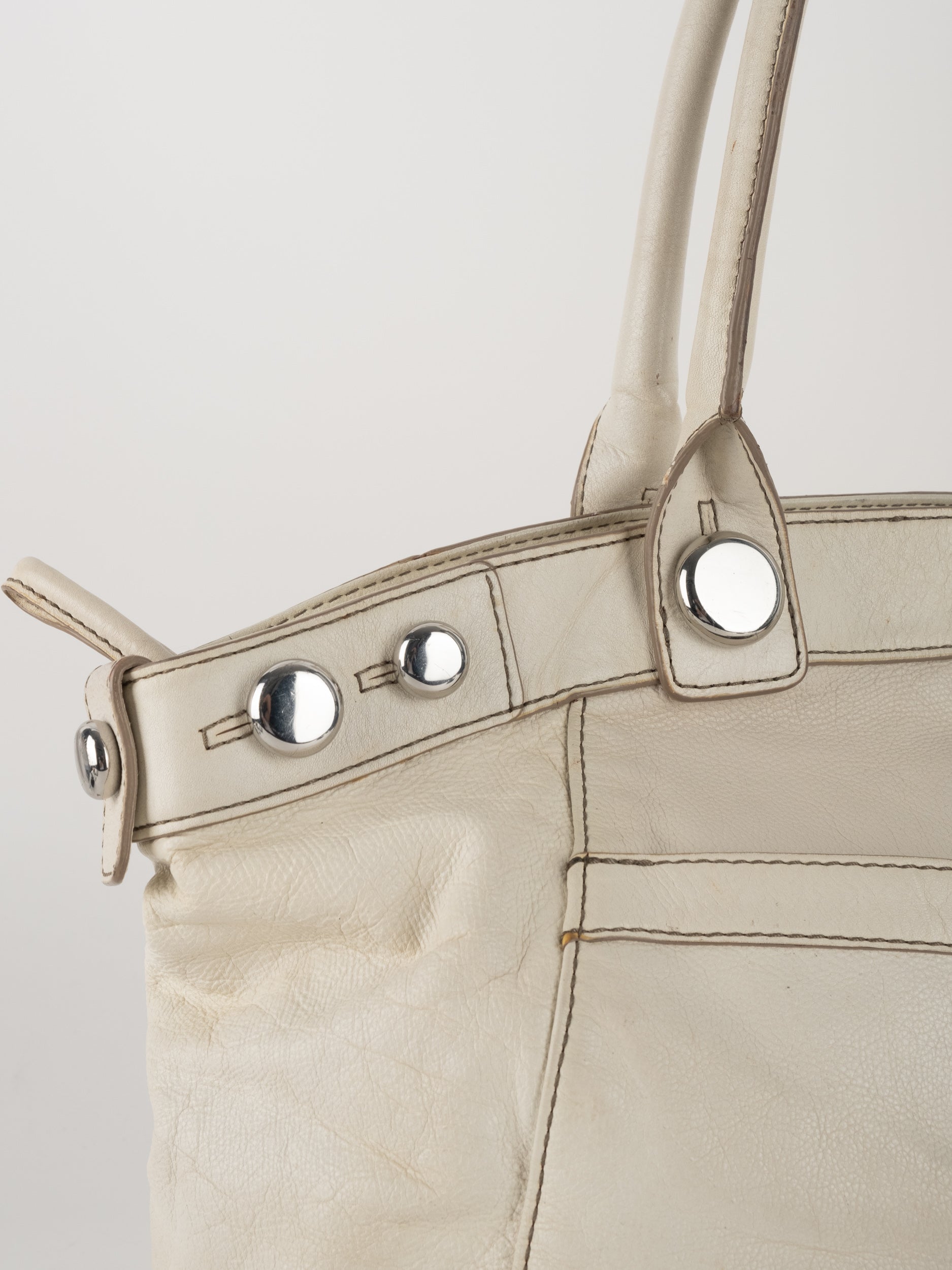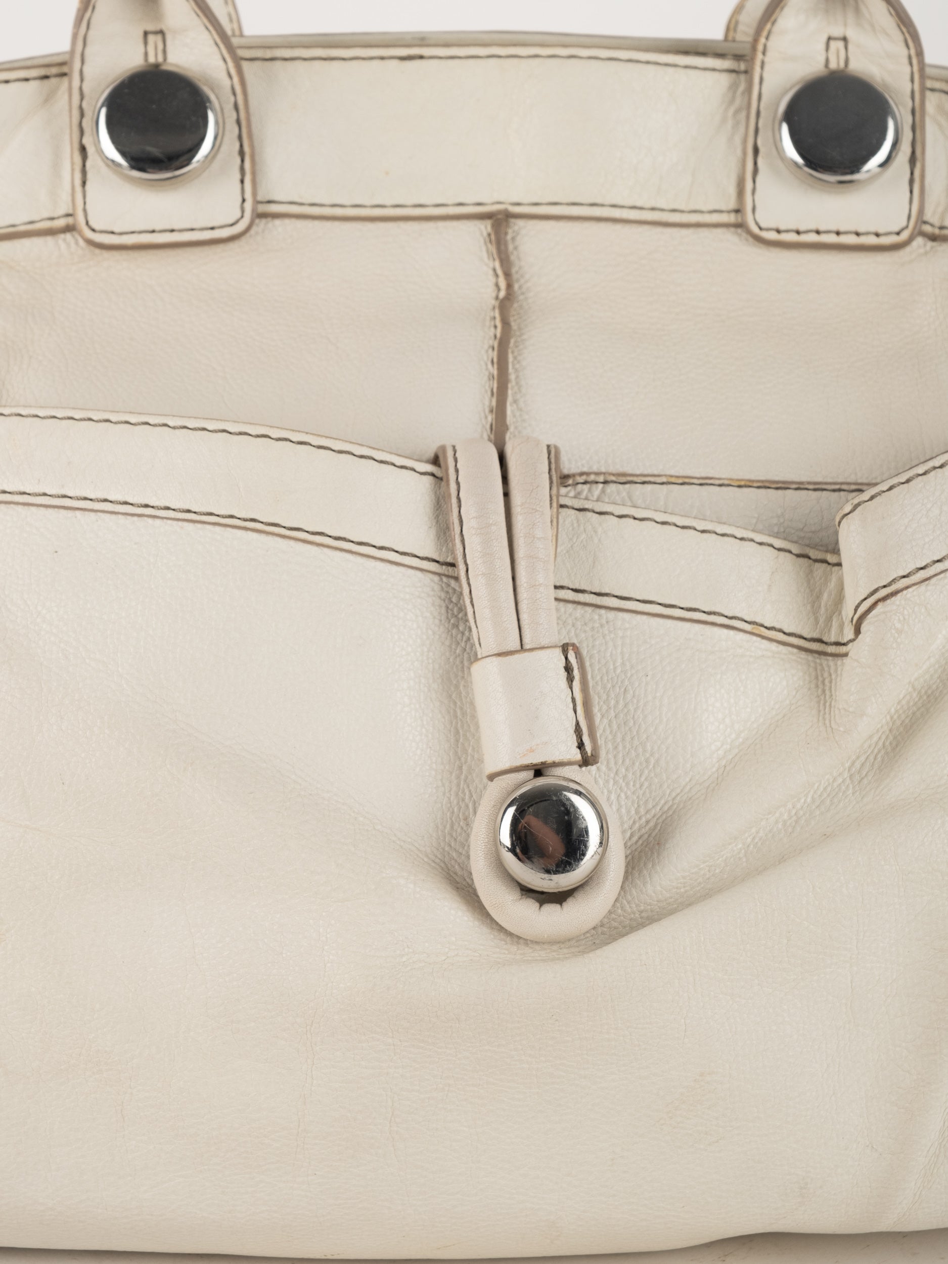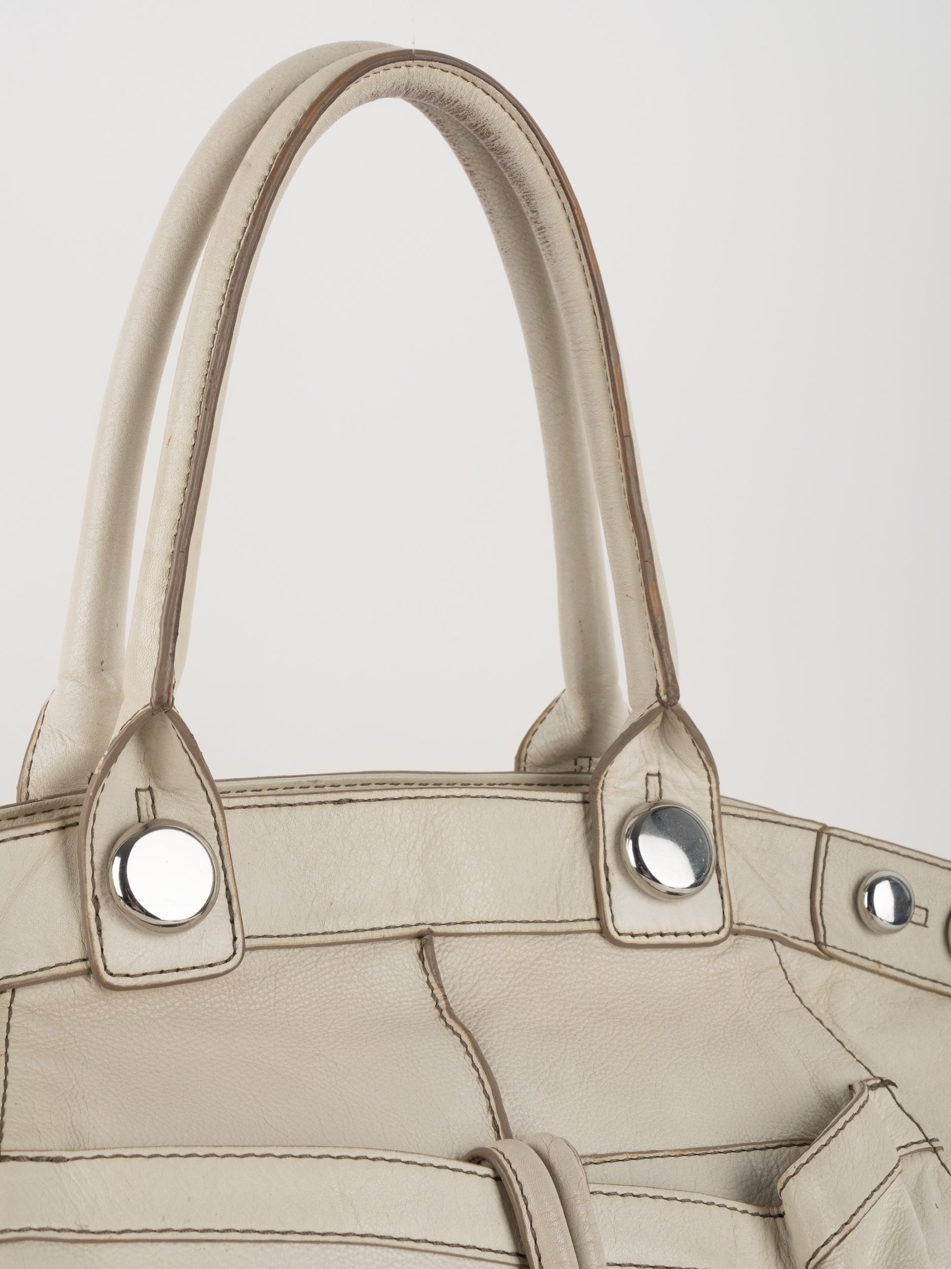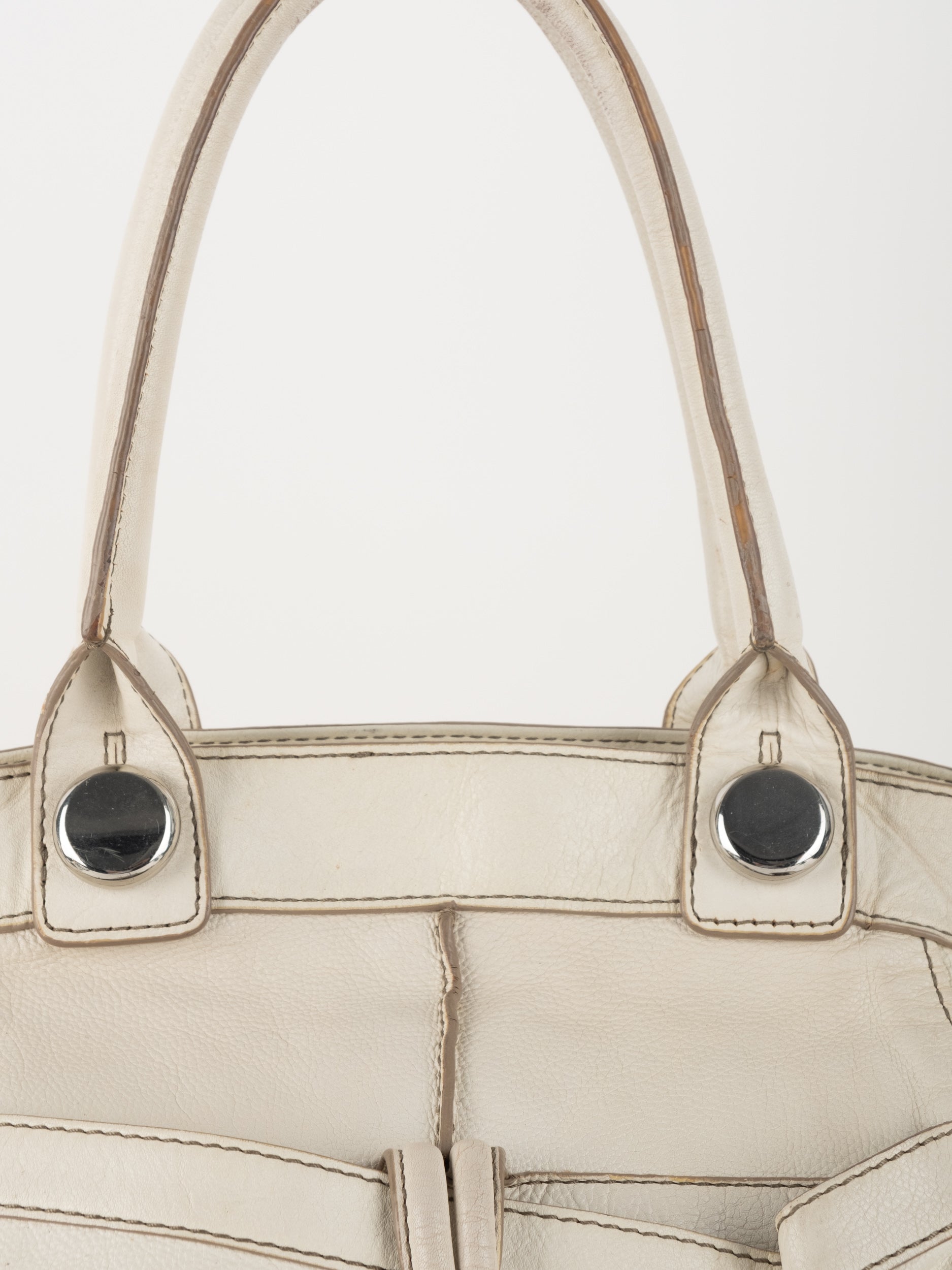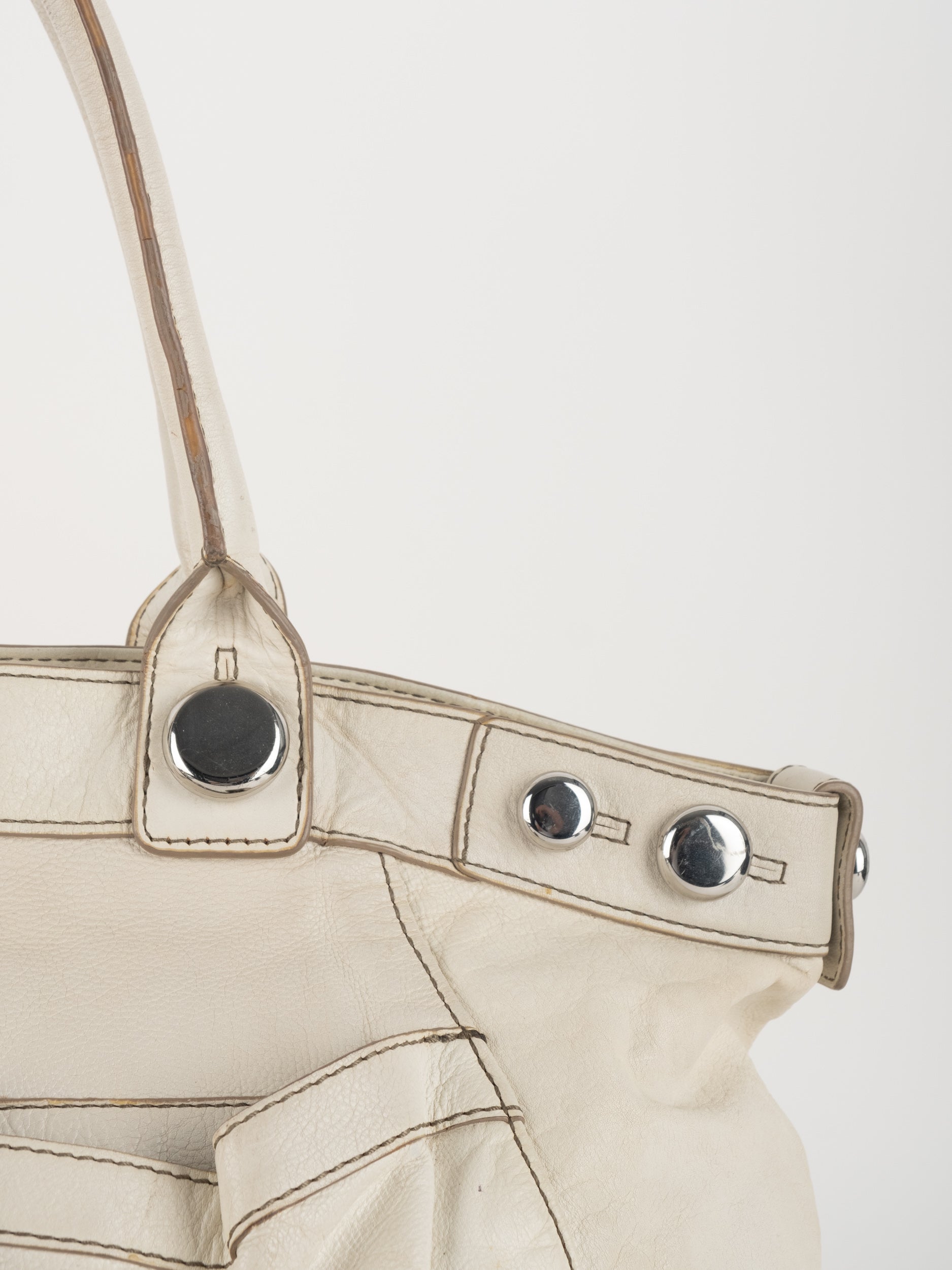 התיק עשוי עור במרקם טבעי בגוון קרם, עם שתי ידיות כתף לנשיאה נוחה. בחזית התיק מופיעים כיסים דקורטיביים ואלמנטים מתכתיים המעניקים לו מראה ייחודי. התא המרכזי מרווח ומתאים לנשיאת חפצים יומיומיים.