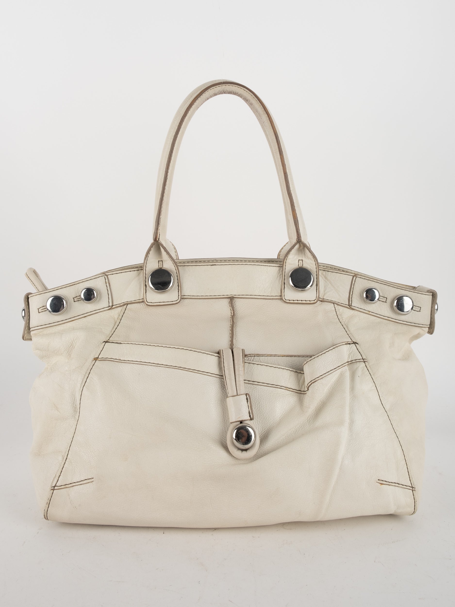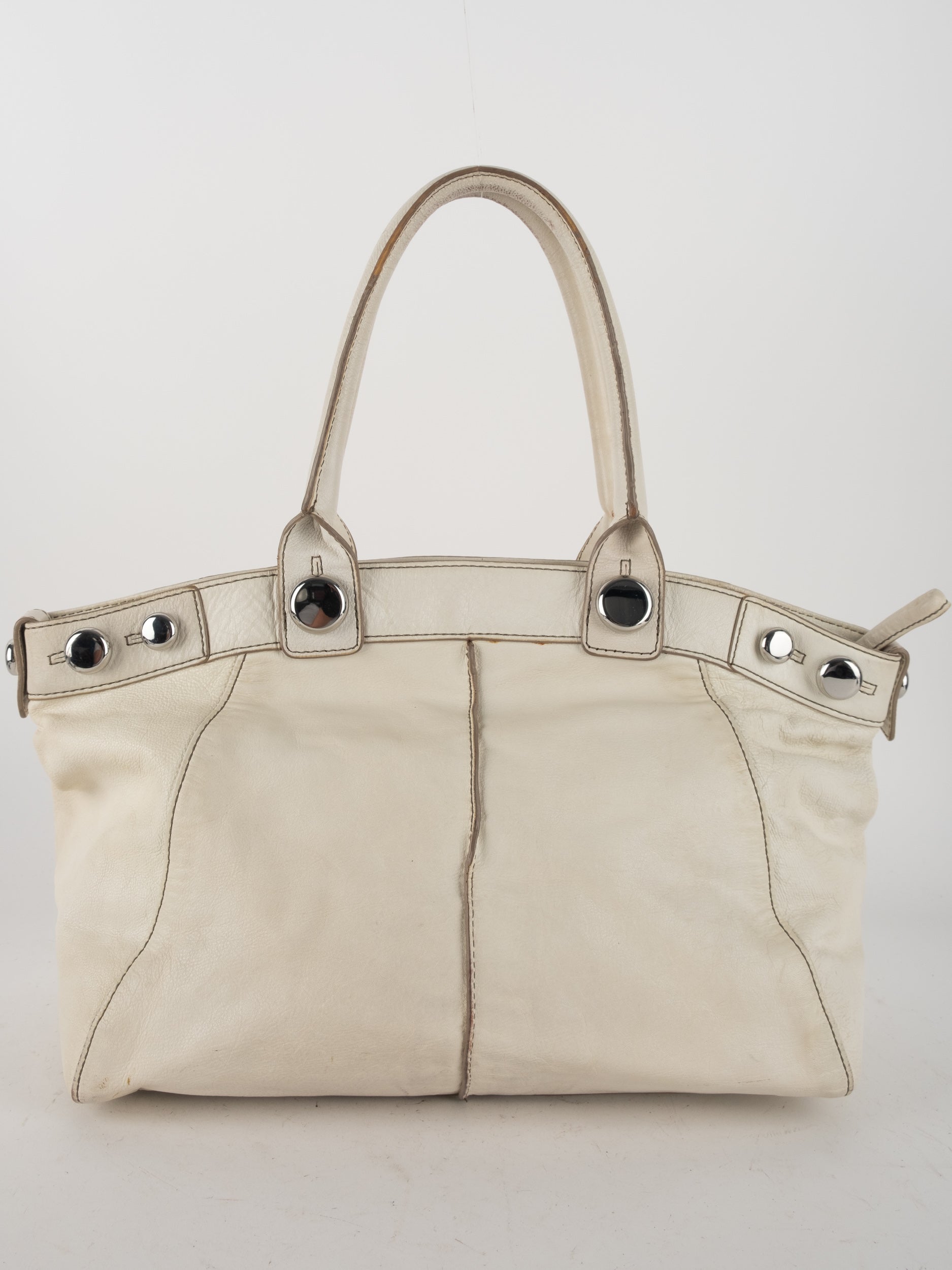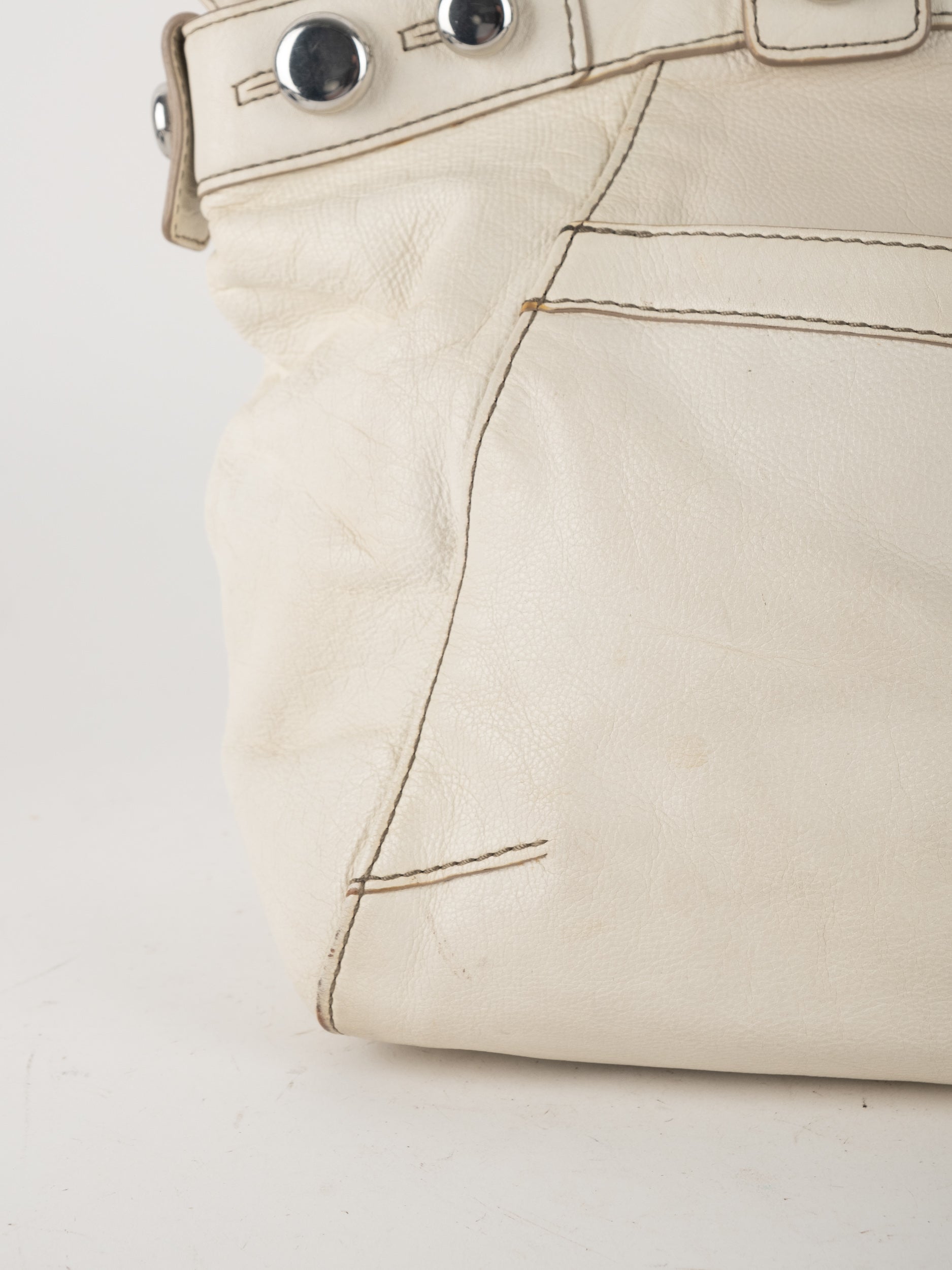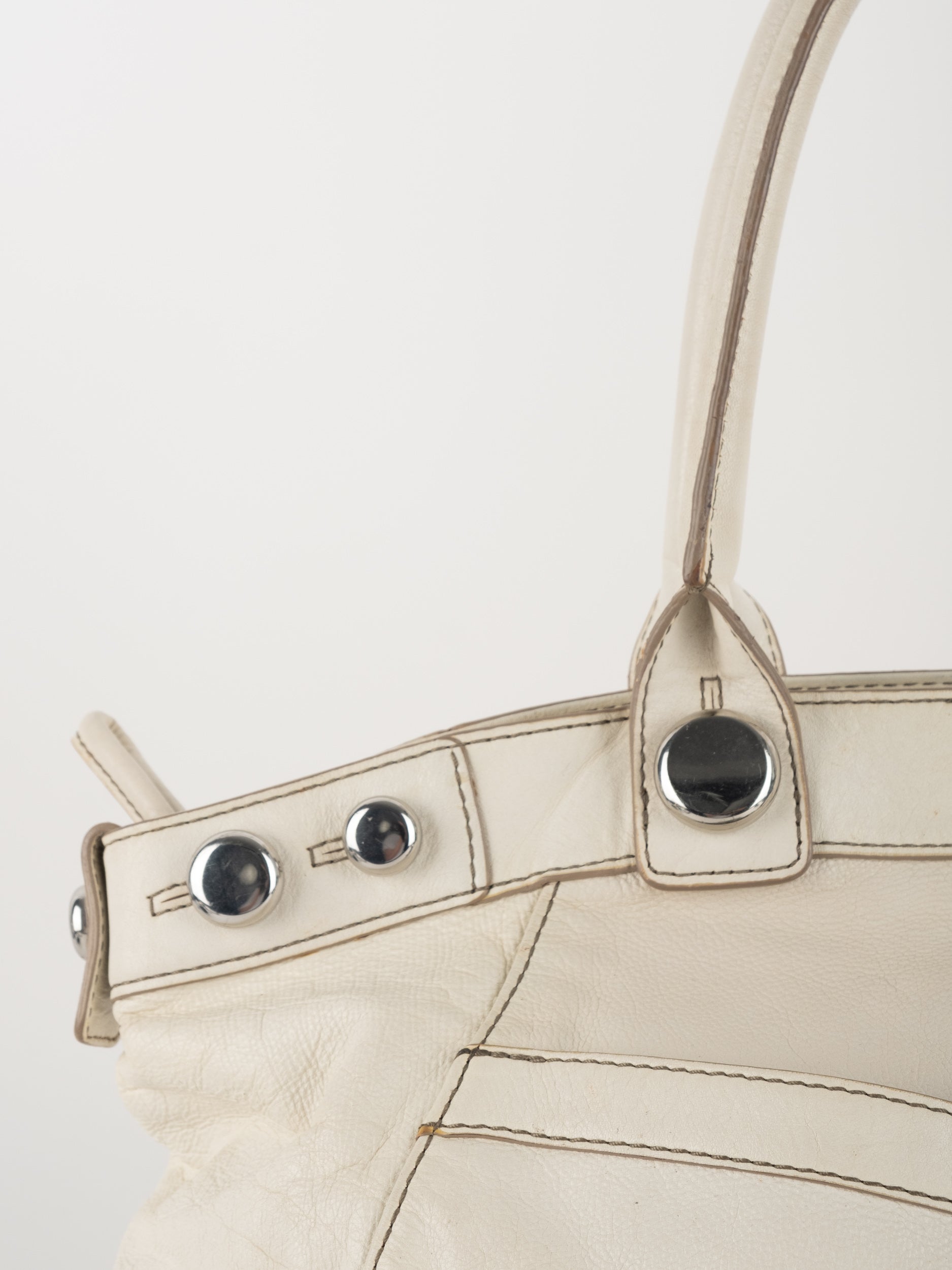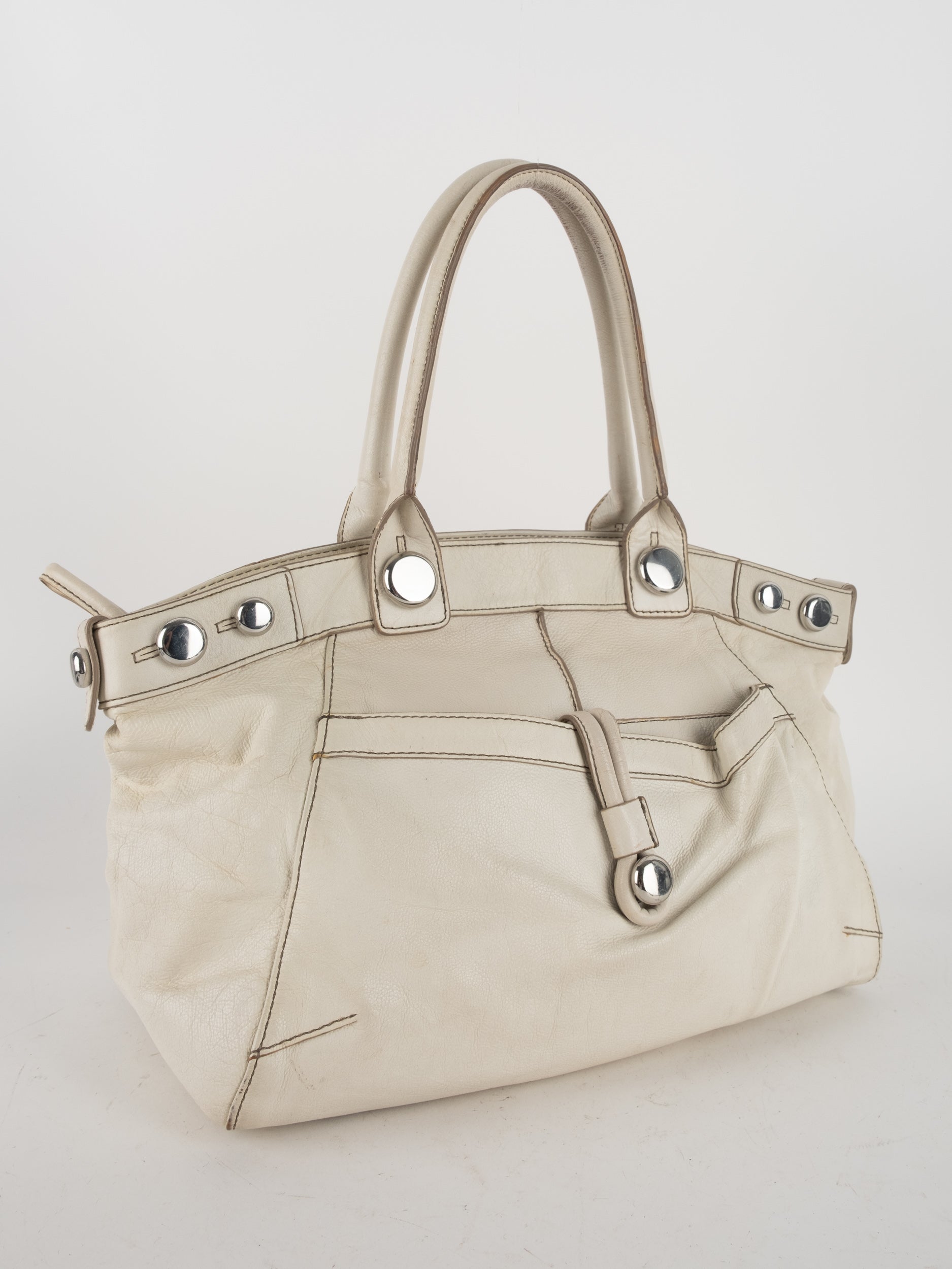 התיק עשוי עור במרקם טבעי בגוון קרם, עם שתי ידיות כתף לנשיאה נוחה. בחזית התיק מופיעים כיסים דקורטיביים ואלמנטים מתכתיים המעניקים לו מראה ייחודי. התא המרכזי מרווח ומתאים לנשיאת חפצים יומיומיים.
