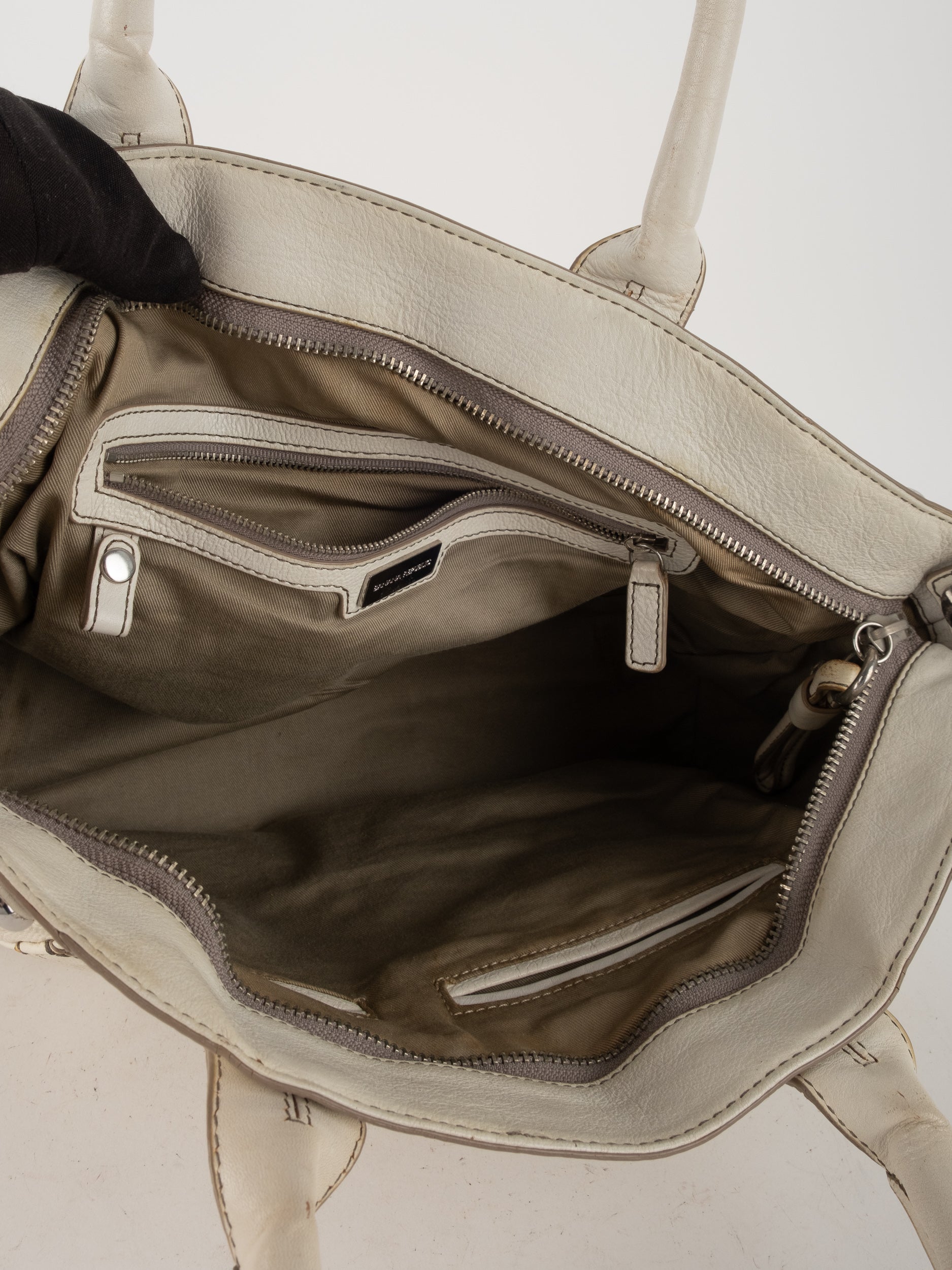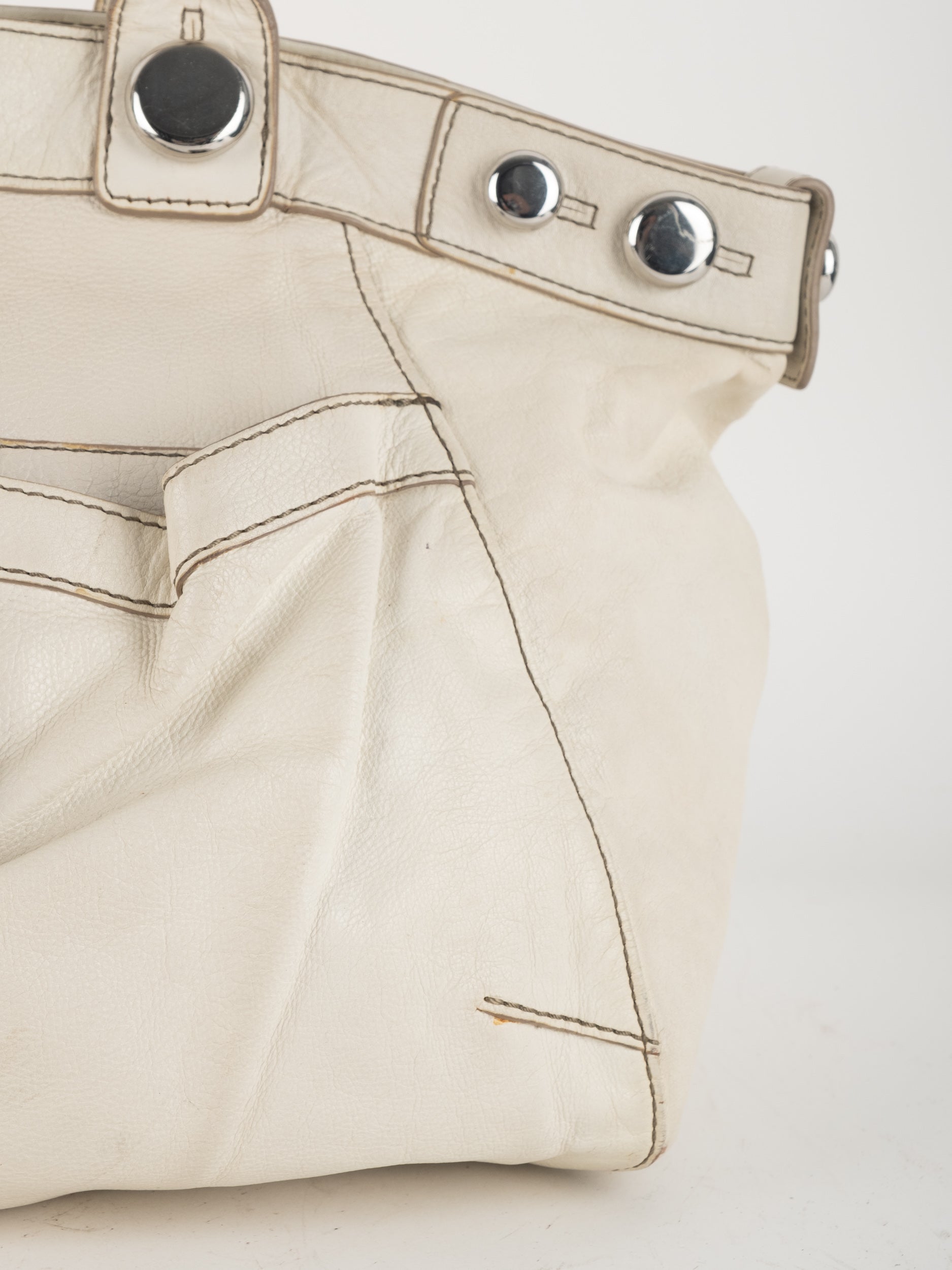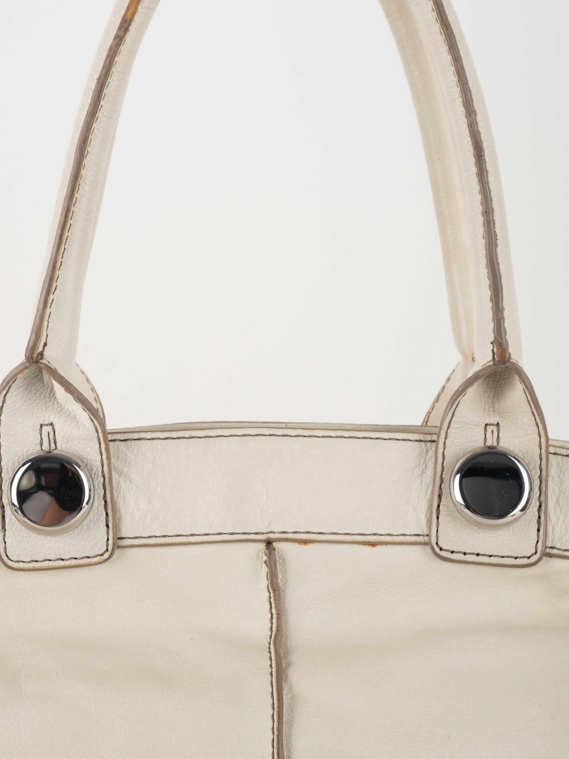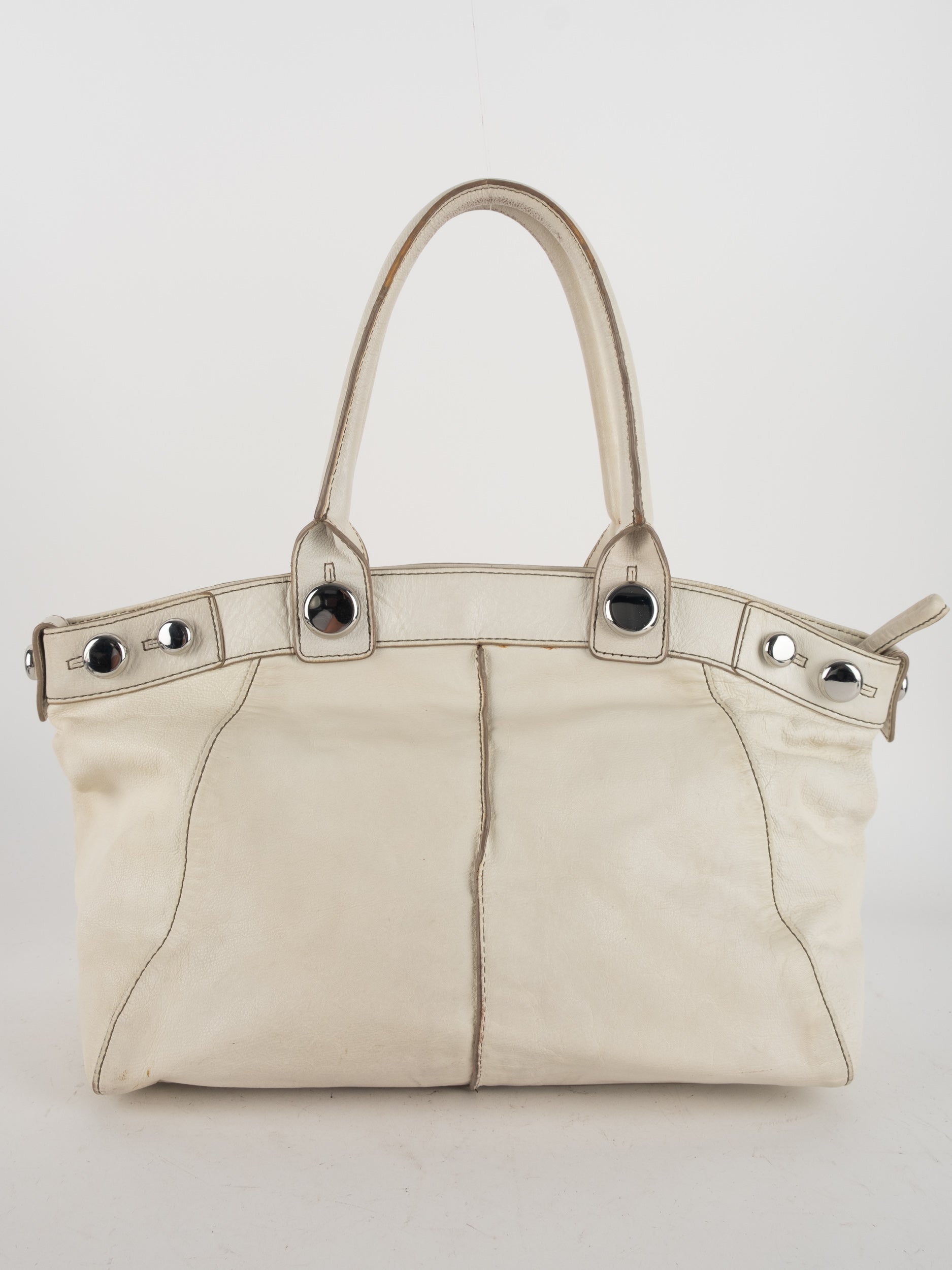 התיק עשוי עור במרקם טבעי בגוון קרם, עם שתי ידיות כתף לנשיאה נוחה. בחזית התיק מופיעים כיסים דקורטיביים ואלמנטים מתכתיים המעניקים לו מראה ייחודי. התא המרכזי מרווח ומתאים לנשיאת חפצים יומיומיים.