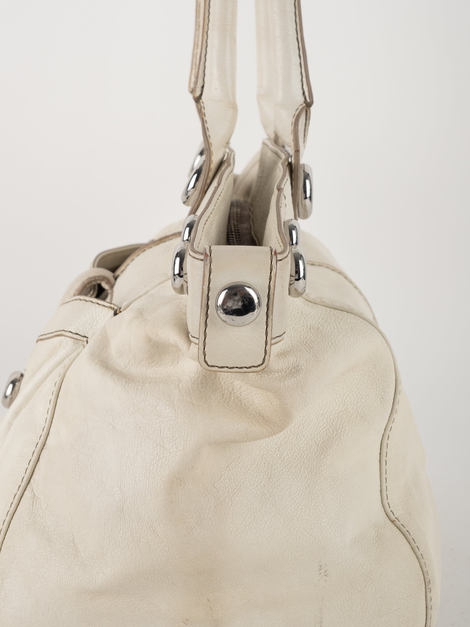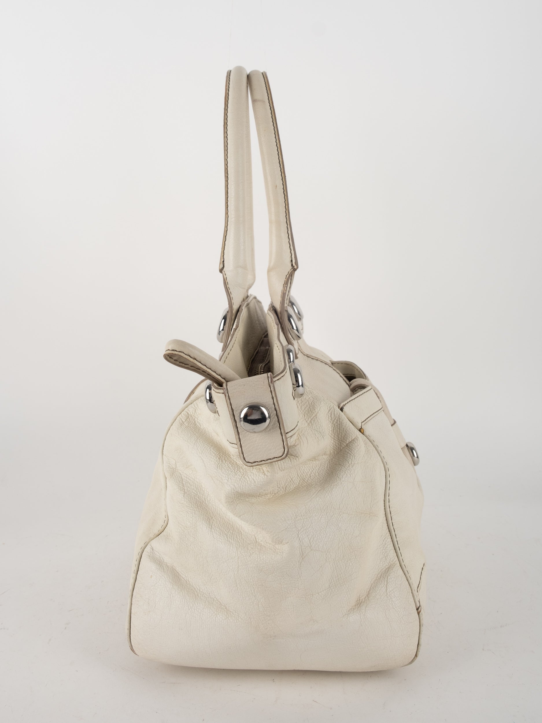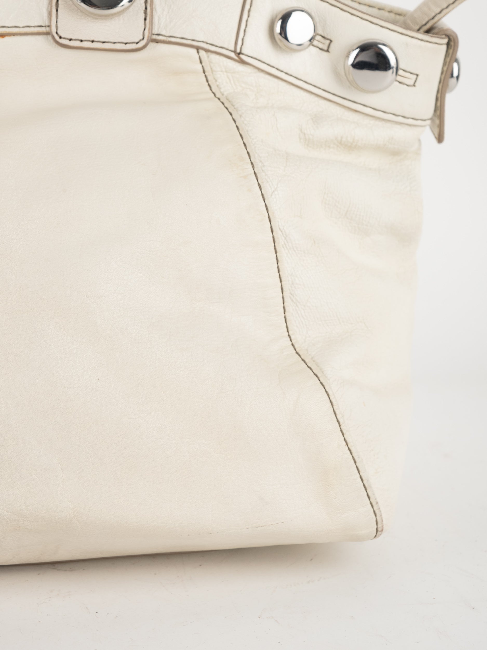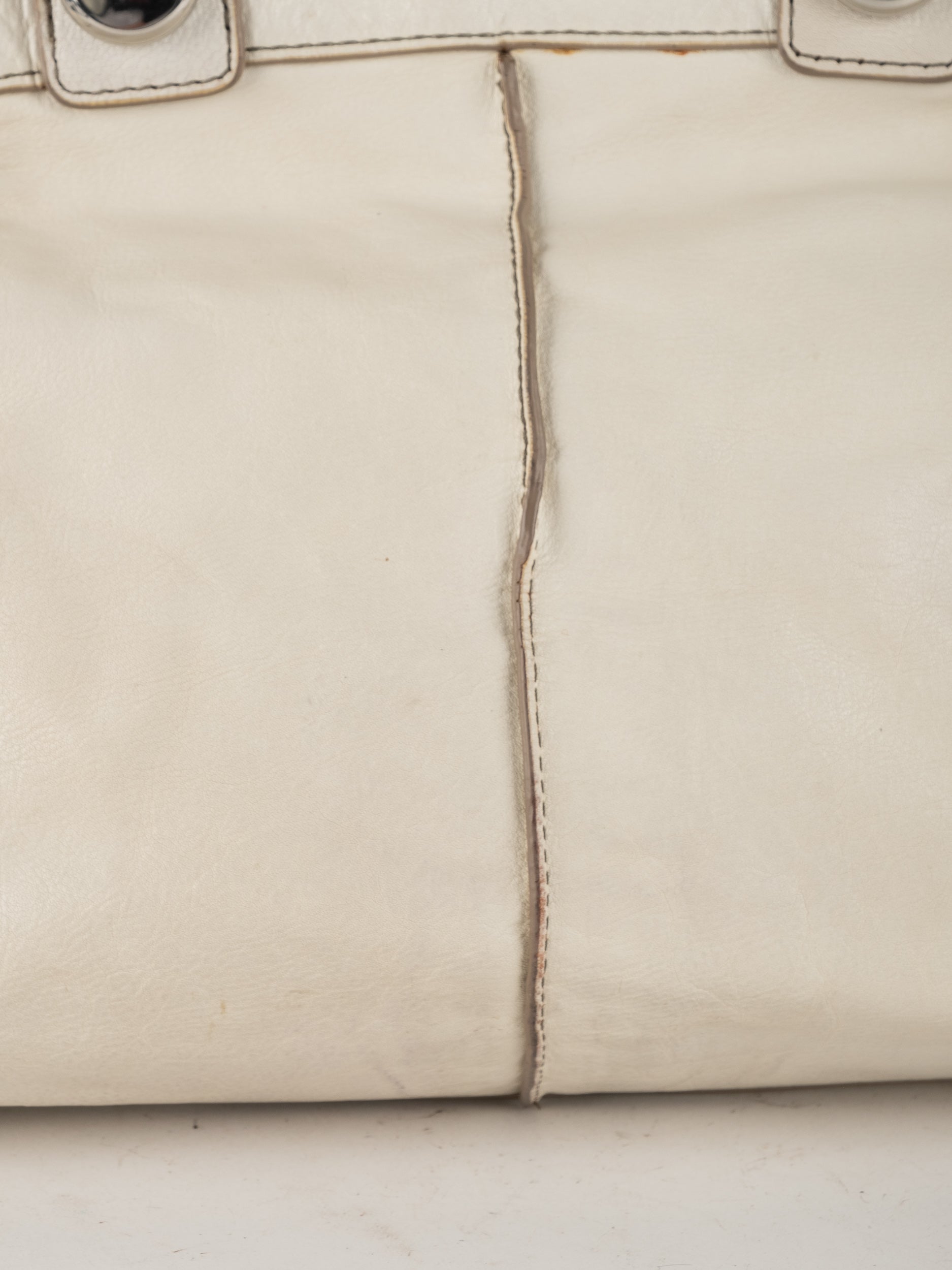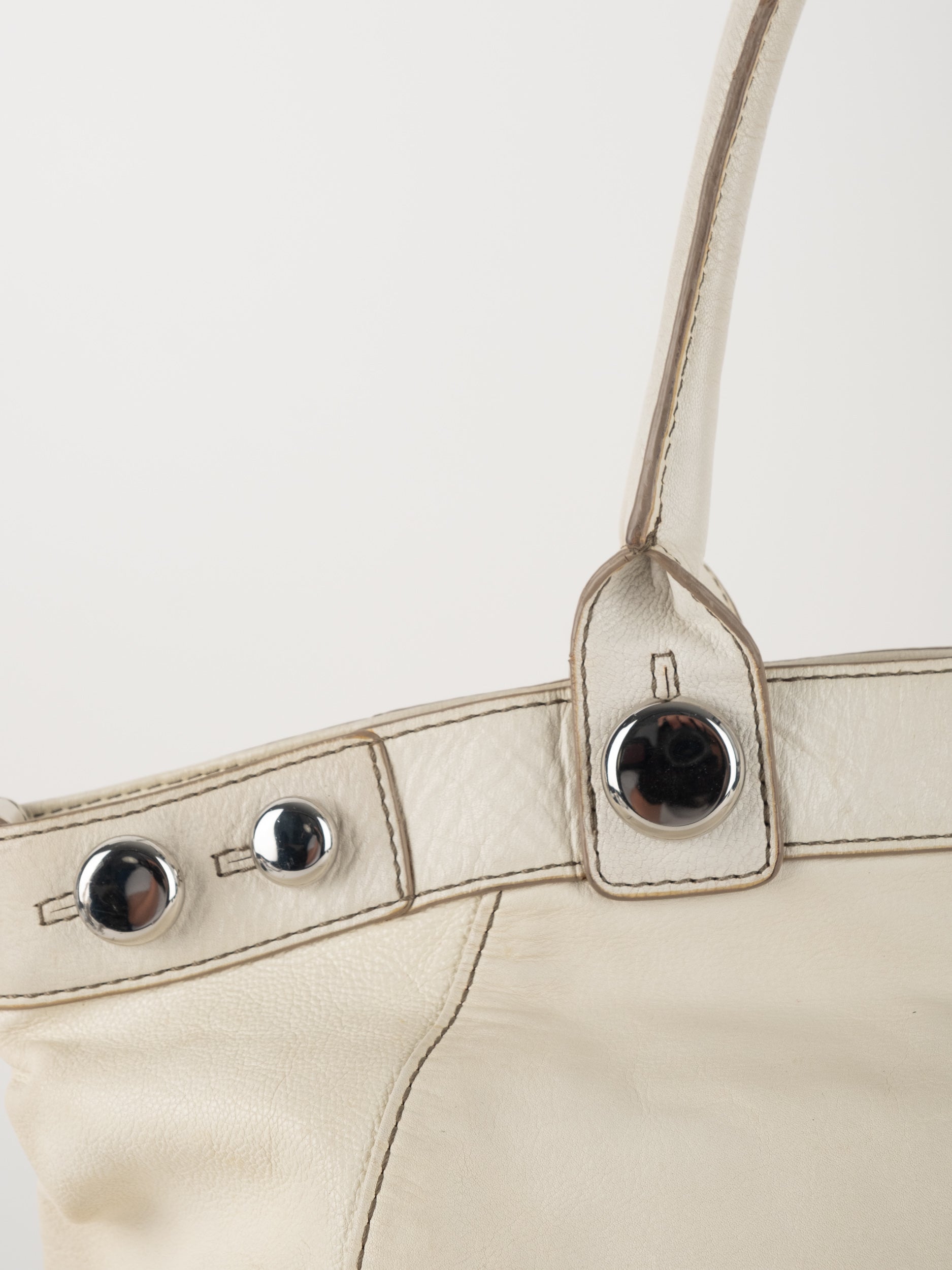 התיק עשוי עור במרקם טבעי בגוון קרם, עם שתי ידיות כתף לנשיאה נוחה. בחזית התיק מופיעים כיסים דקורטיביים ואלמנטים מתכתיים המעניקים לו מראה ייחודי. התא המרכזי מרווח ומתאים לנשיאת חפצים יומיומיים.