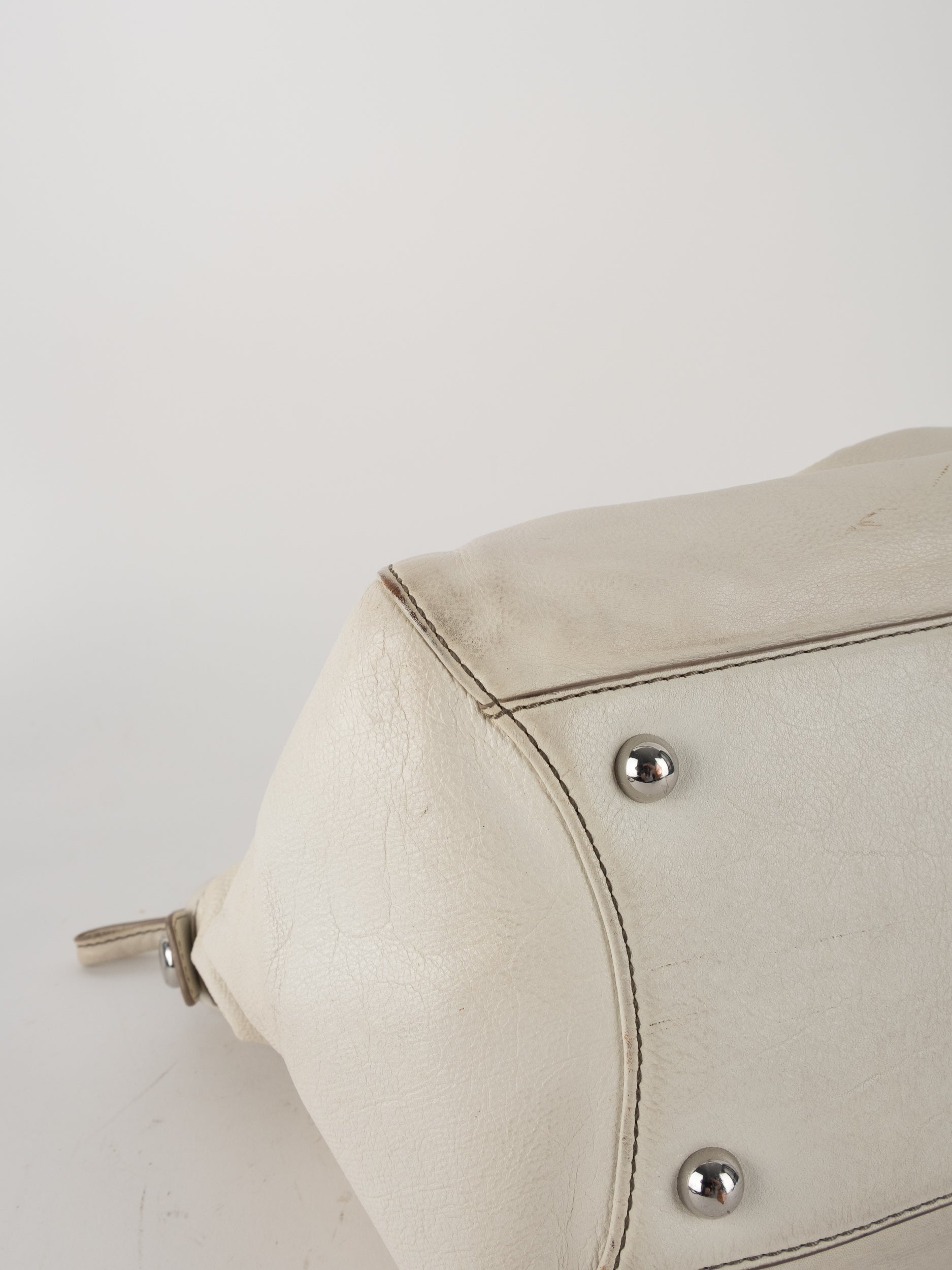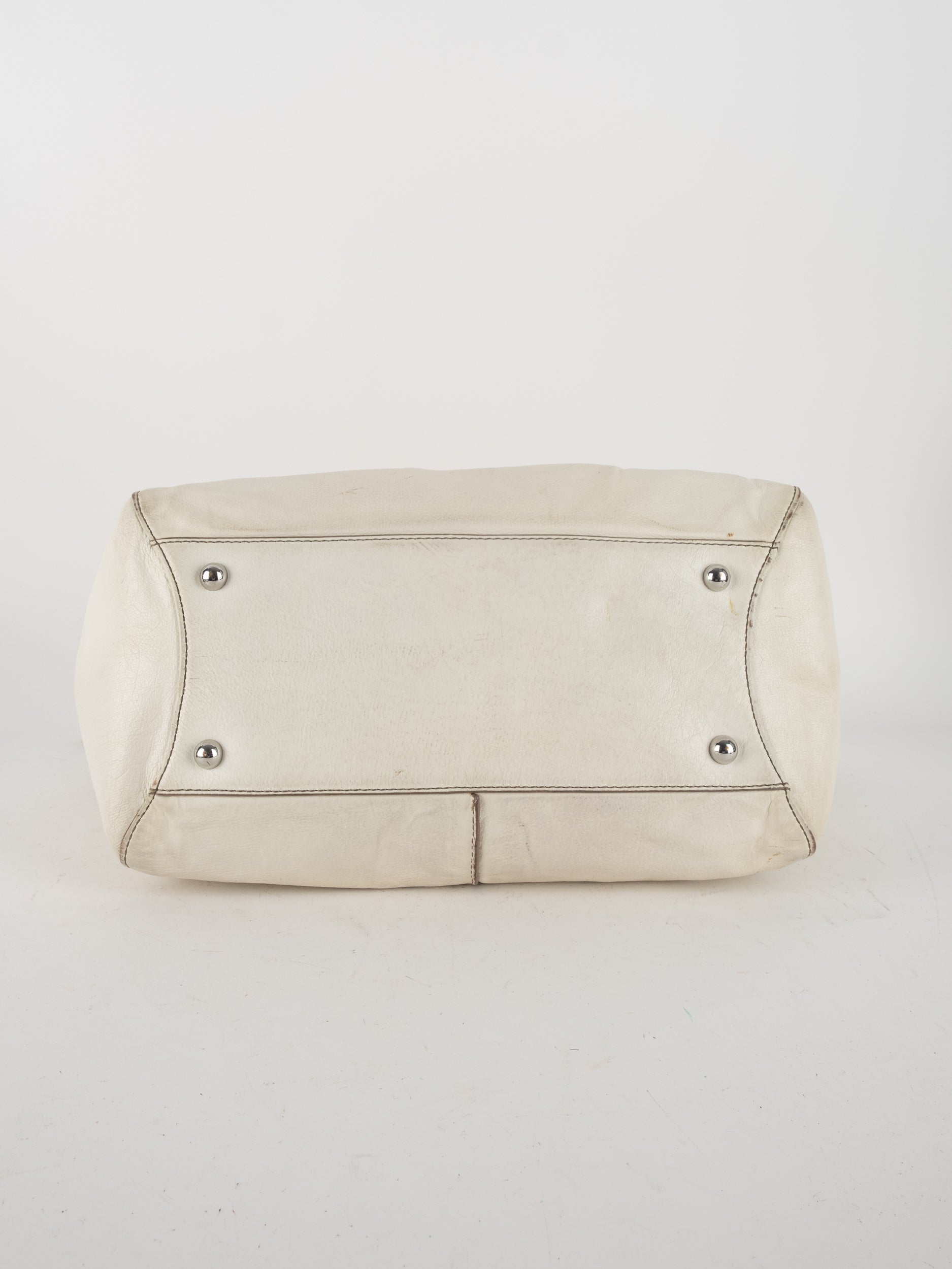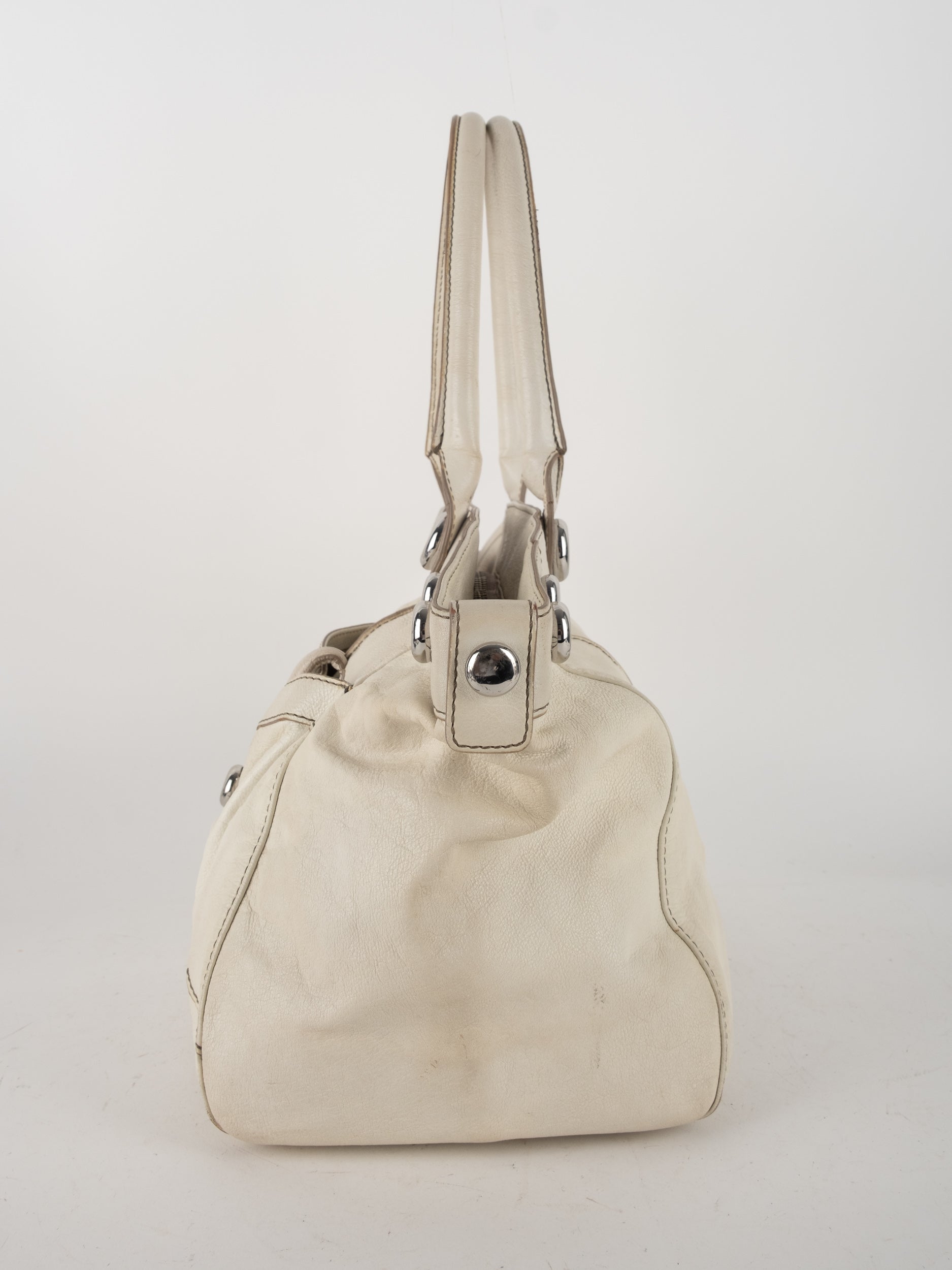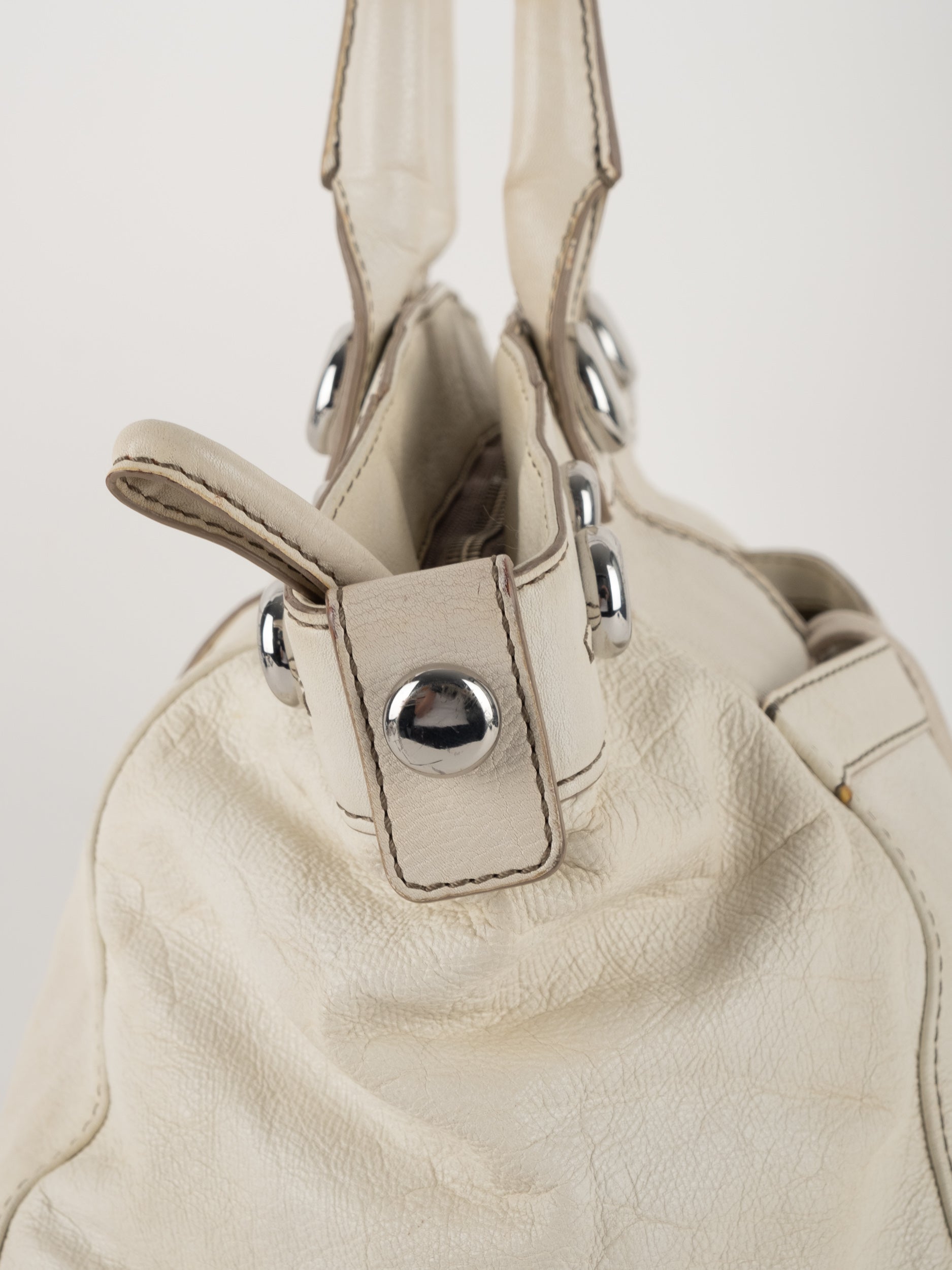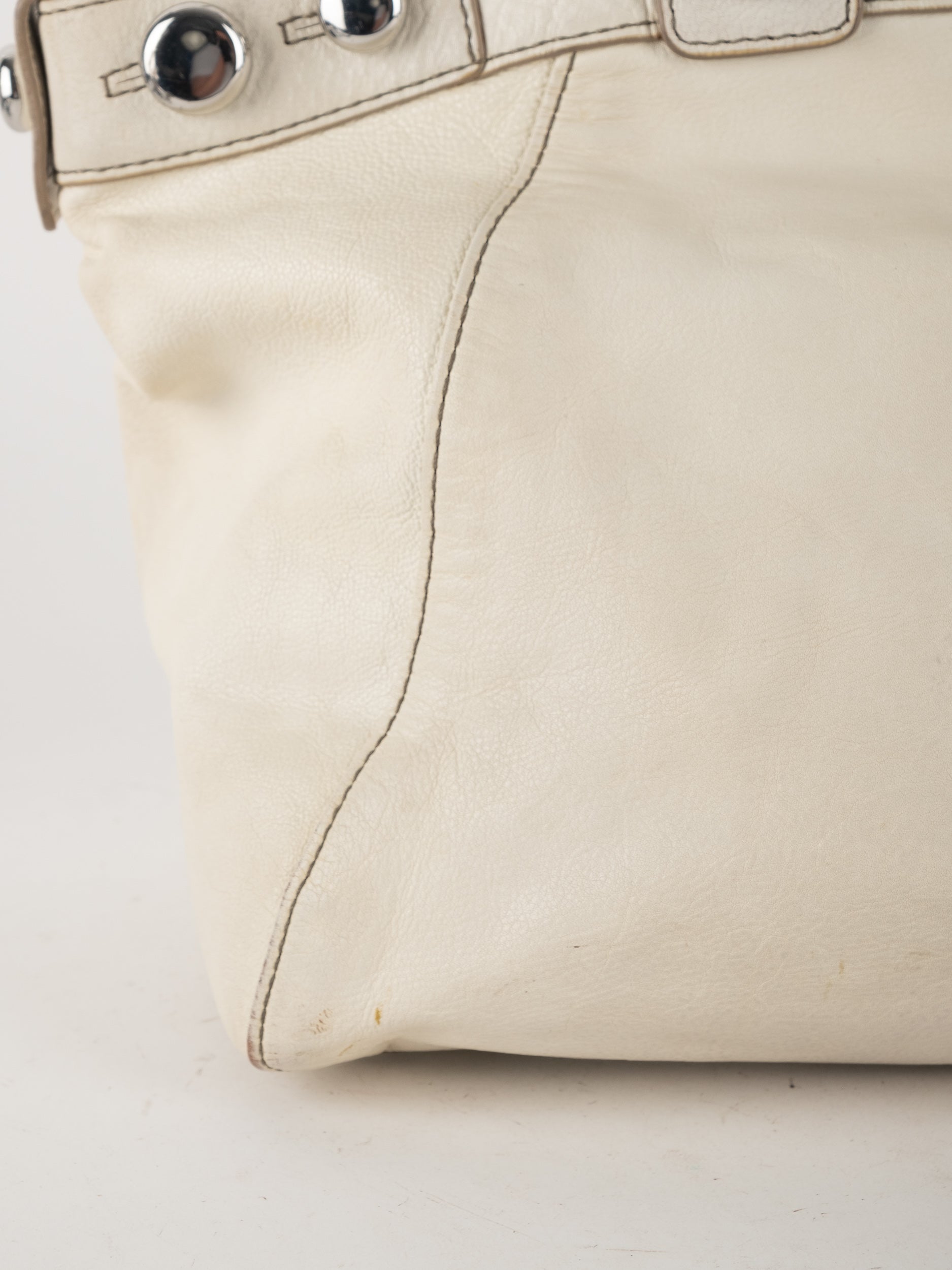 התיק עשוי עור במרקם טבעי בגוון קרם, עם שתי ידיות כתף לנשיאה נוחה. בחזית התיק מופיעים כיסים דקורטיביים ואלמנטים מתכתיים המעניקים לו מראה ייחודי. התא המרכזי מרווח ומתאים לנשיאת חפצים יומיומיים.