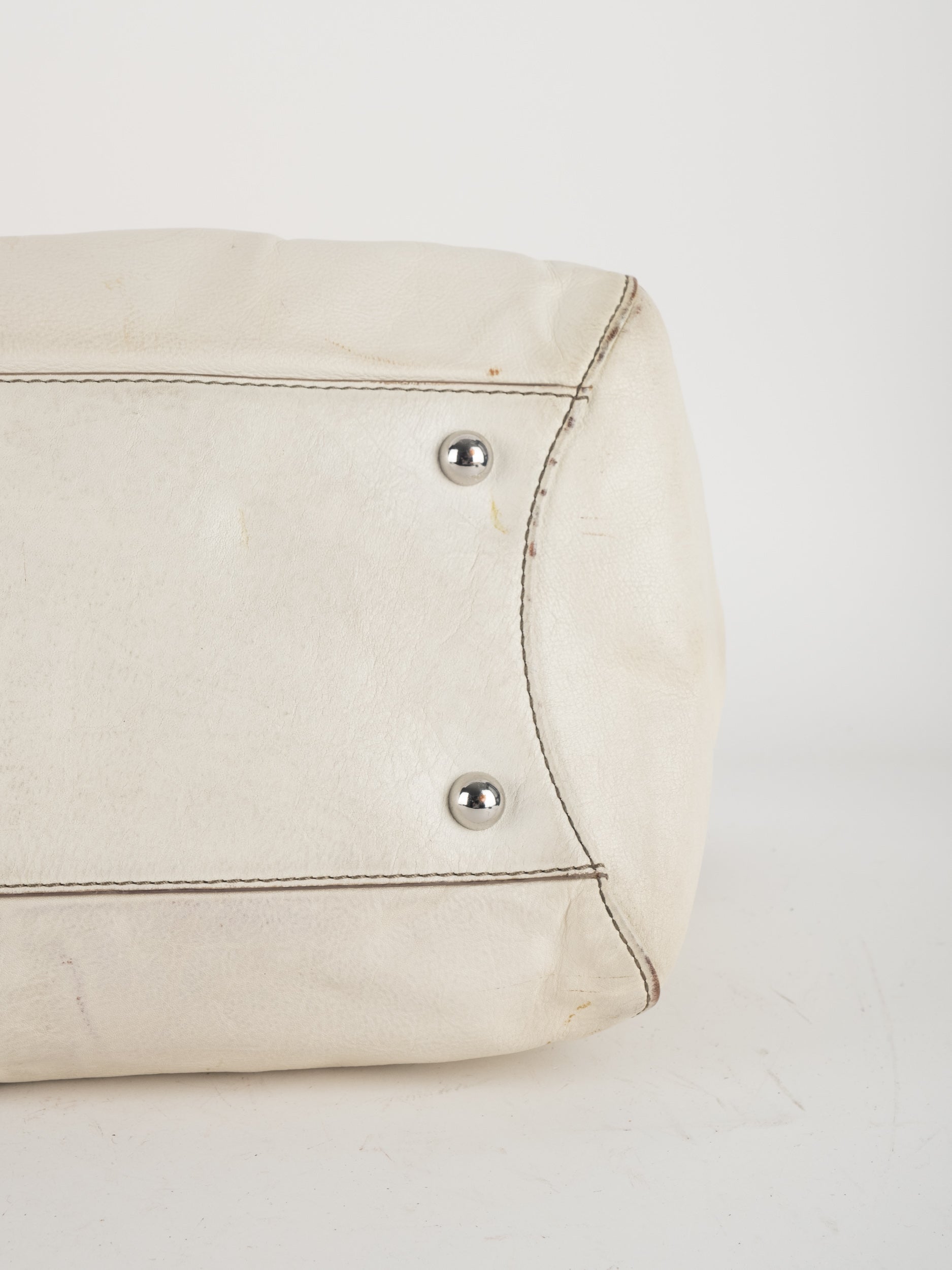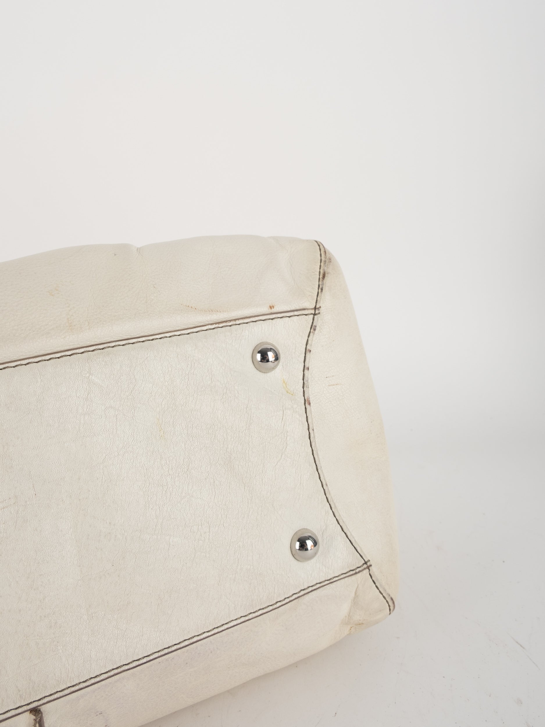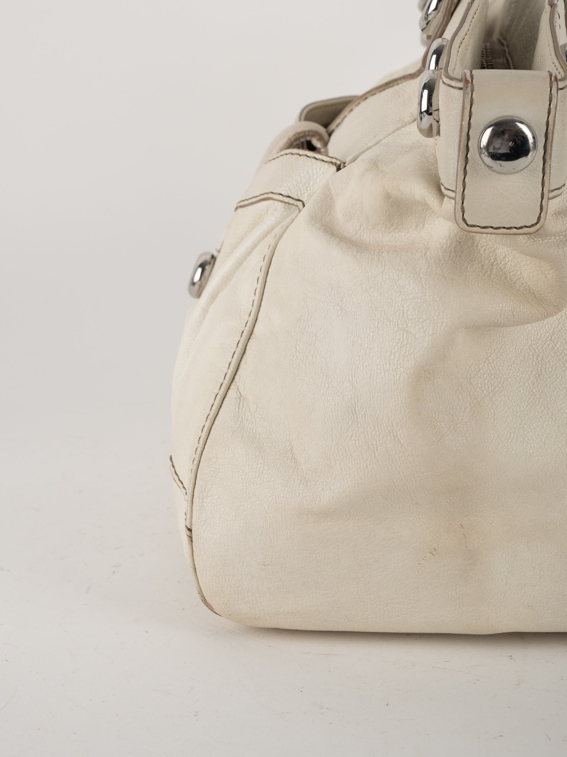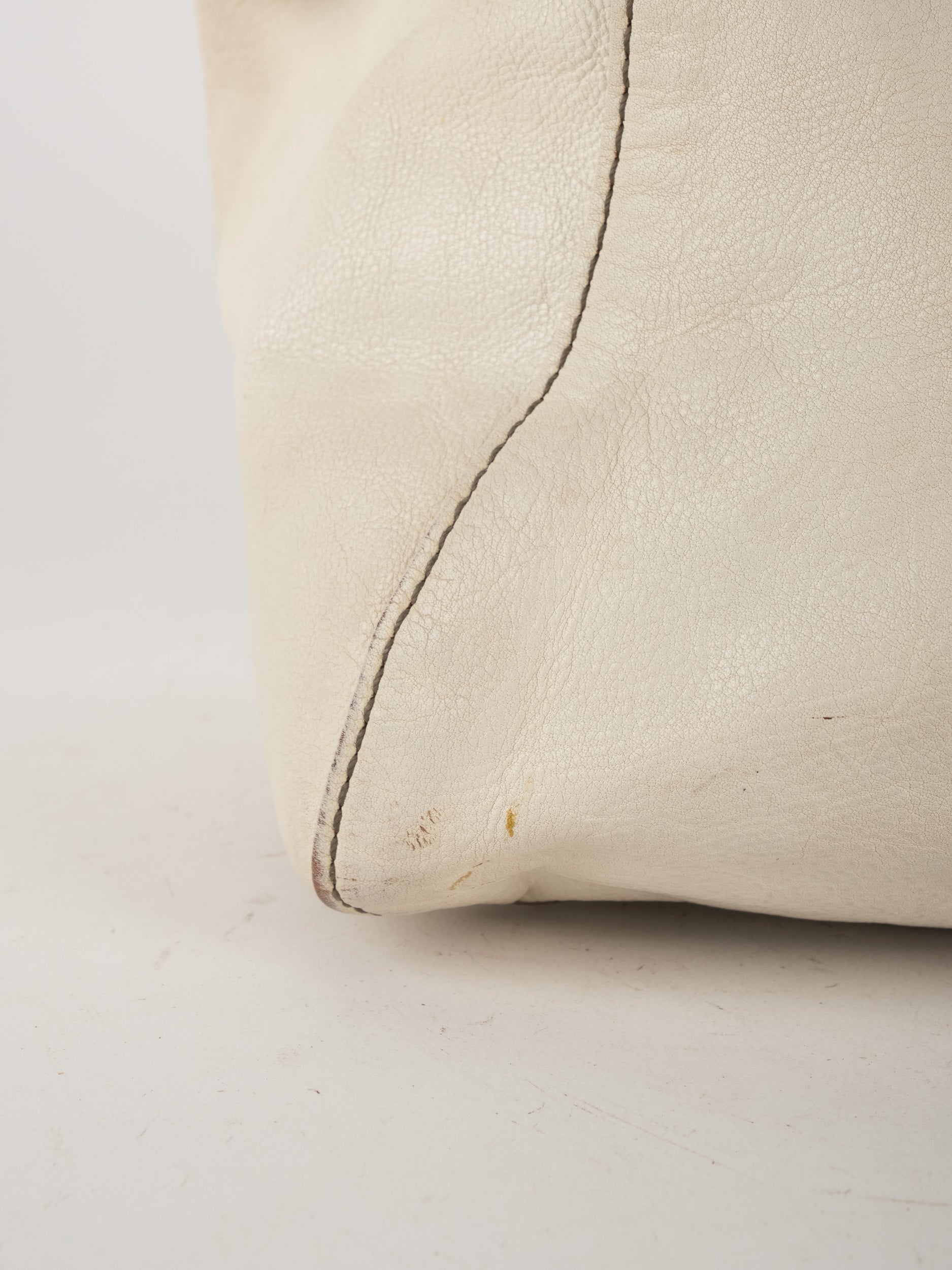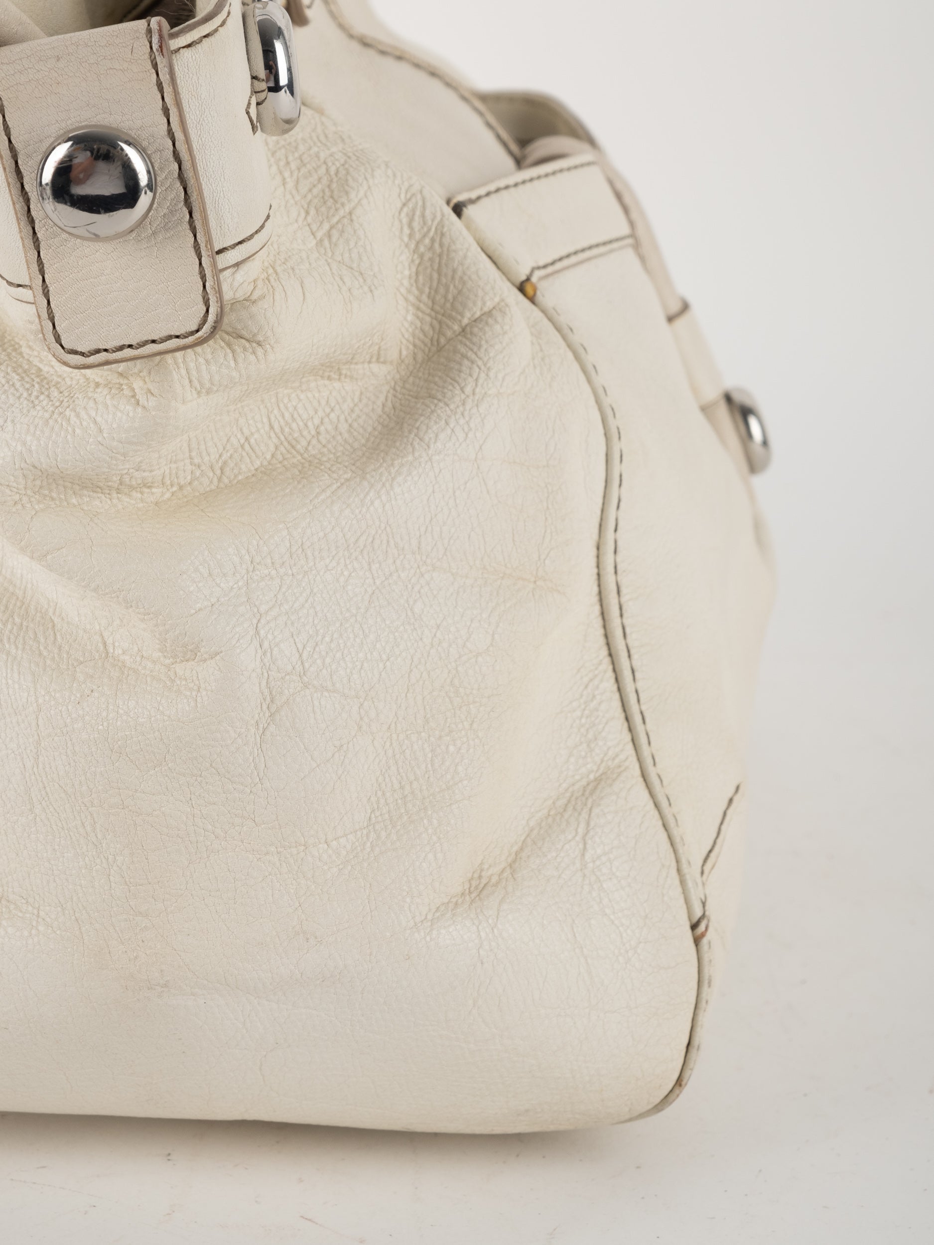 התיק עשוי עור במרקם טבעי בגוון קרם, עם שתי ידיות כתף לנשיאה נוחה. בחזית התיק מופיעים כיסים דקורטיביים ואלמנטים מתכתיים המעניקים לו מראה ייחודי. התא המרכזי מרווח ומתאים לנשיאת חפצים יומיומיים.