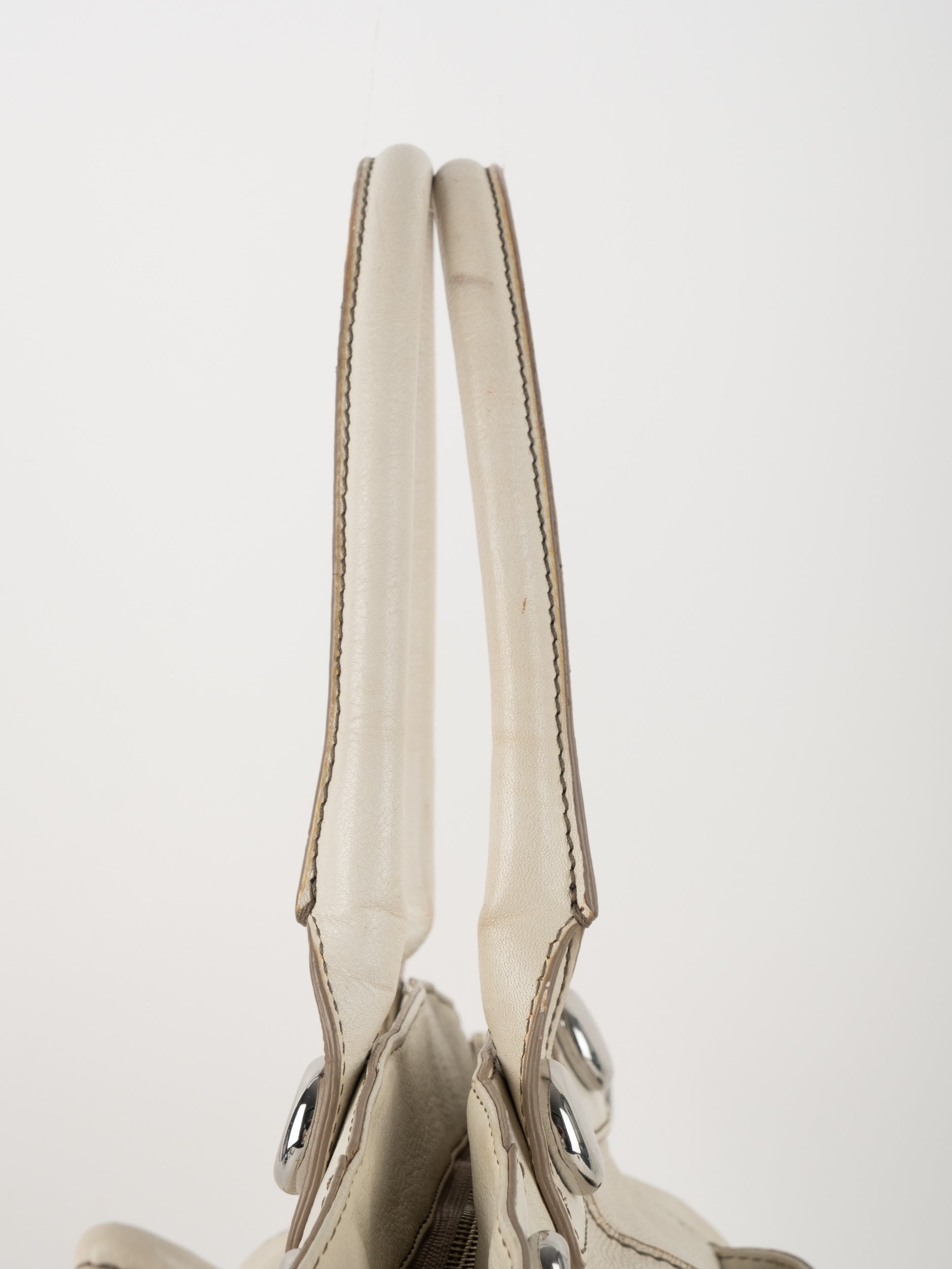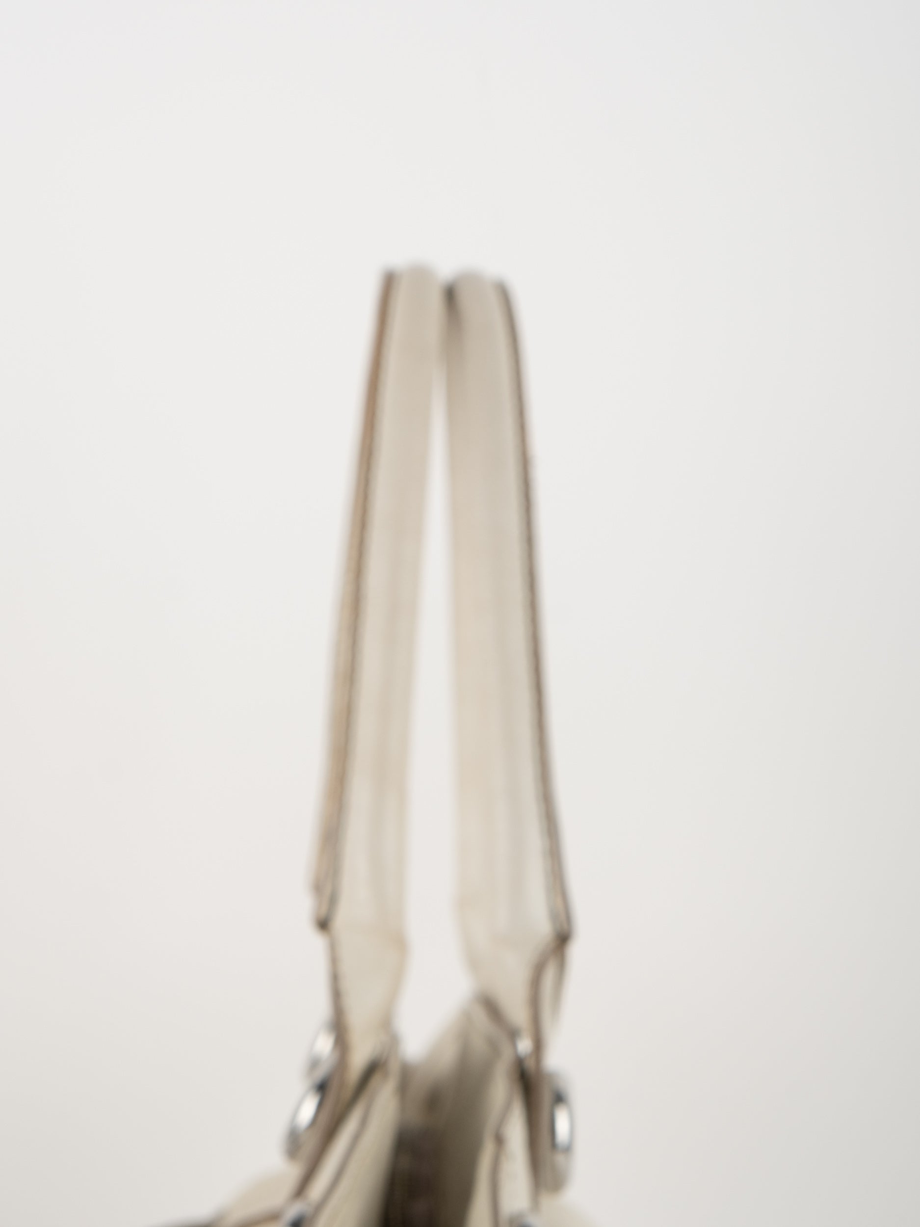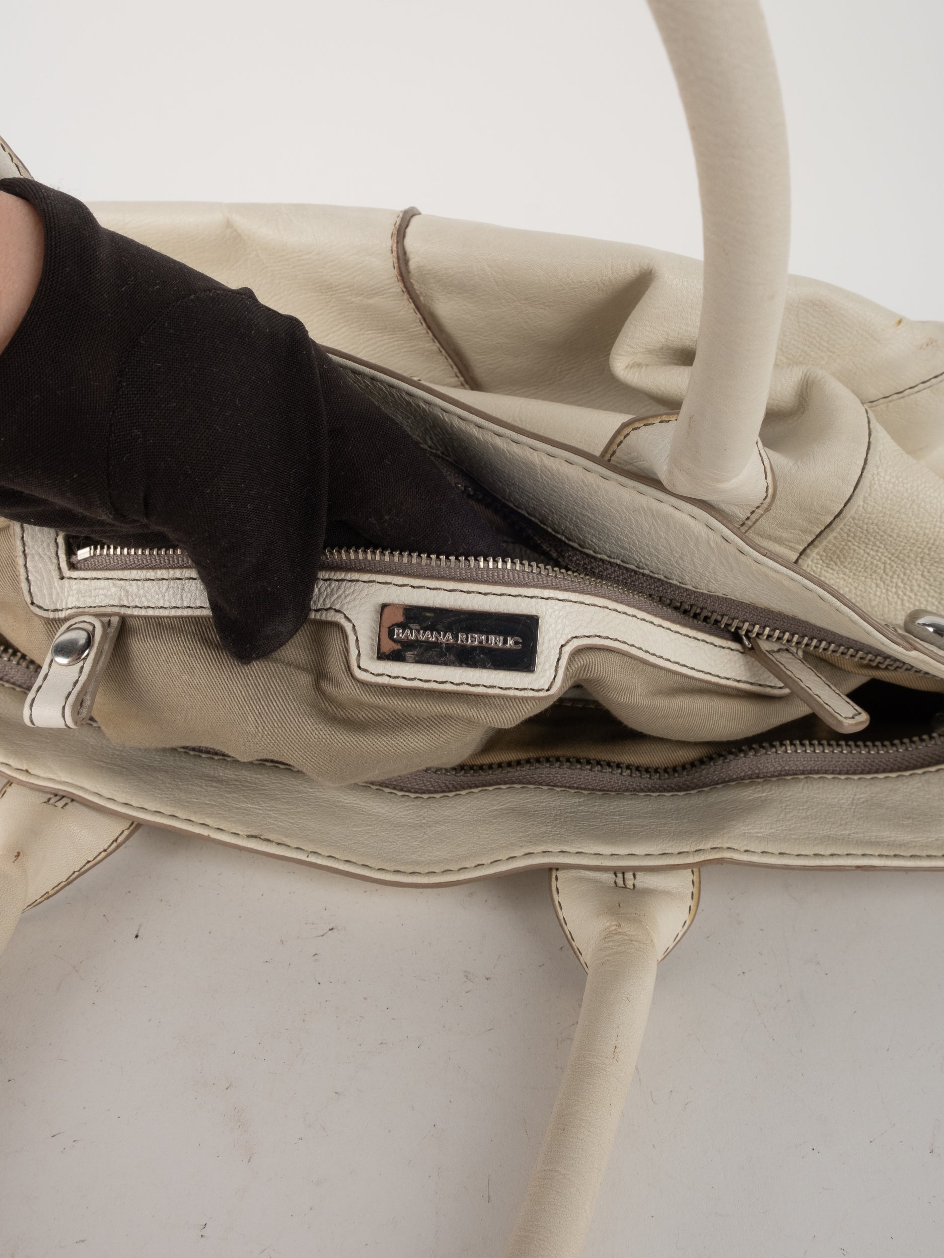 תיק של המותג Banana Republic בננה ריפבליק – וינטג' יד שנייה, בעיצוב אלגנטי בגוון קרם בהיר עם פרטי מתכת בגוון כהה. מדובר בתיק כתף נשי ומוקפד המשלב בין מראה קלאסי לבין קווים מודרניים, ומתאים לשימוש יומיומי לצד הופעות אלגנטיות יותר.