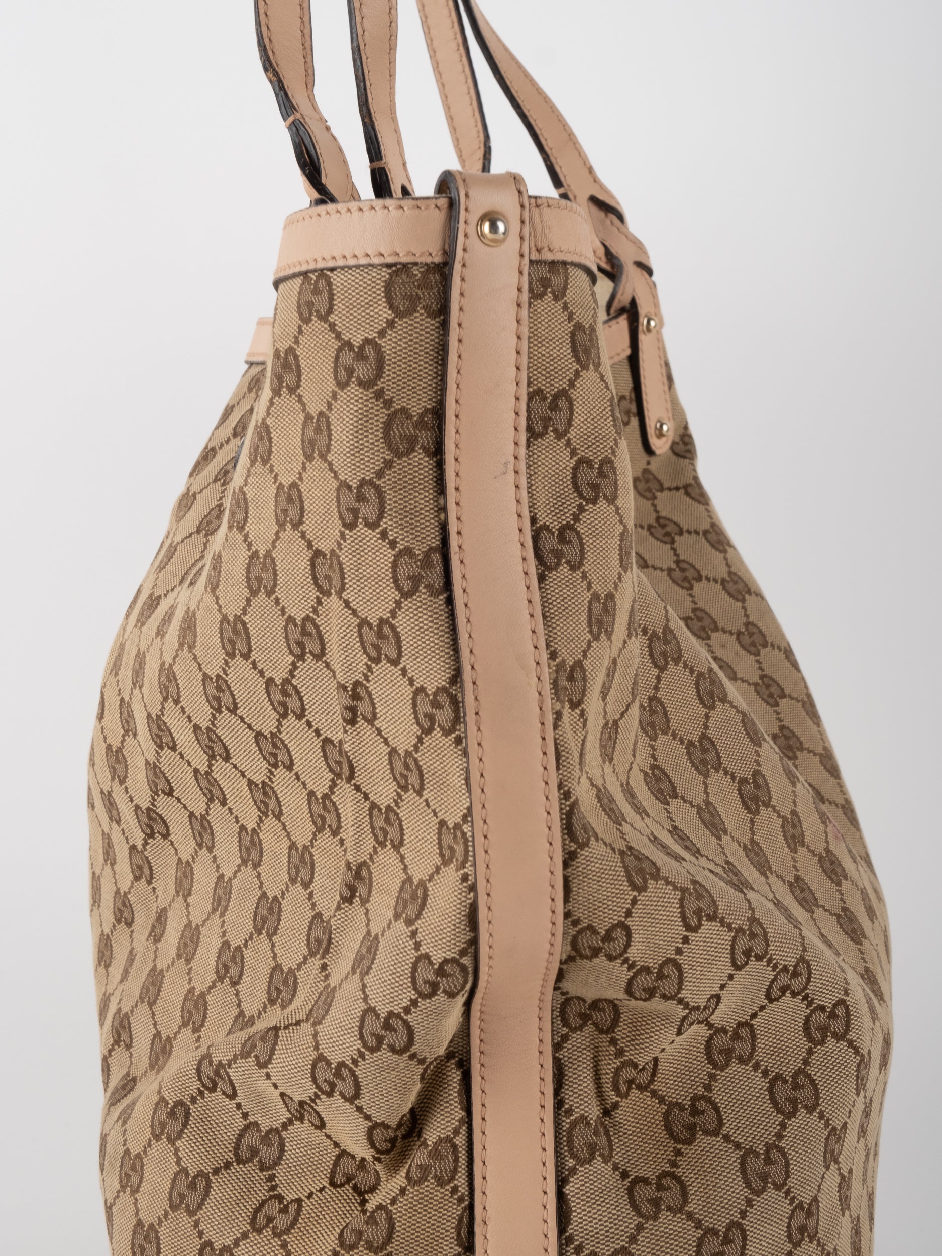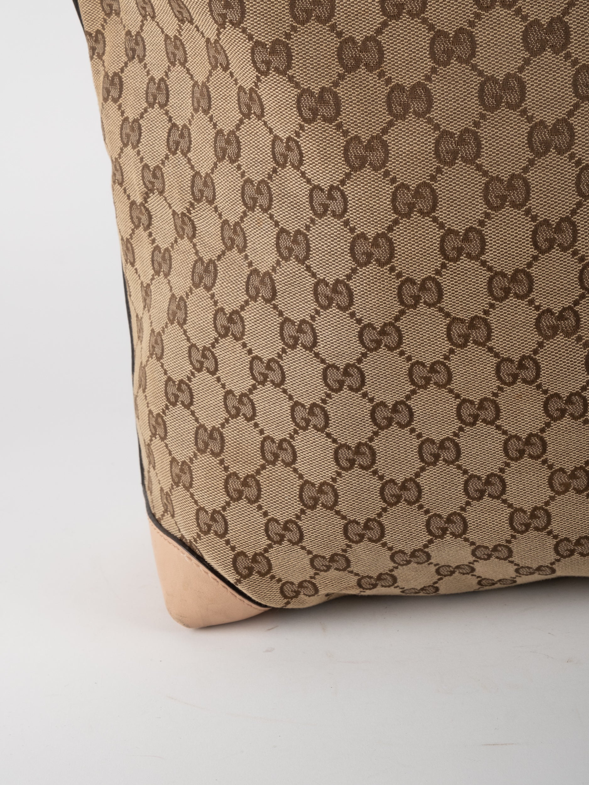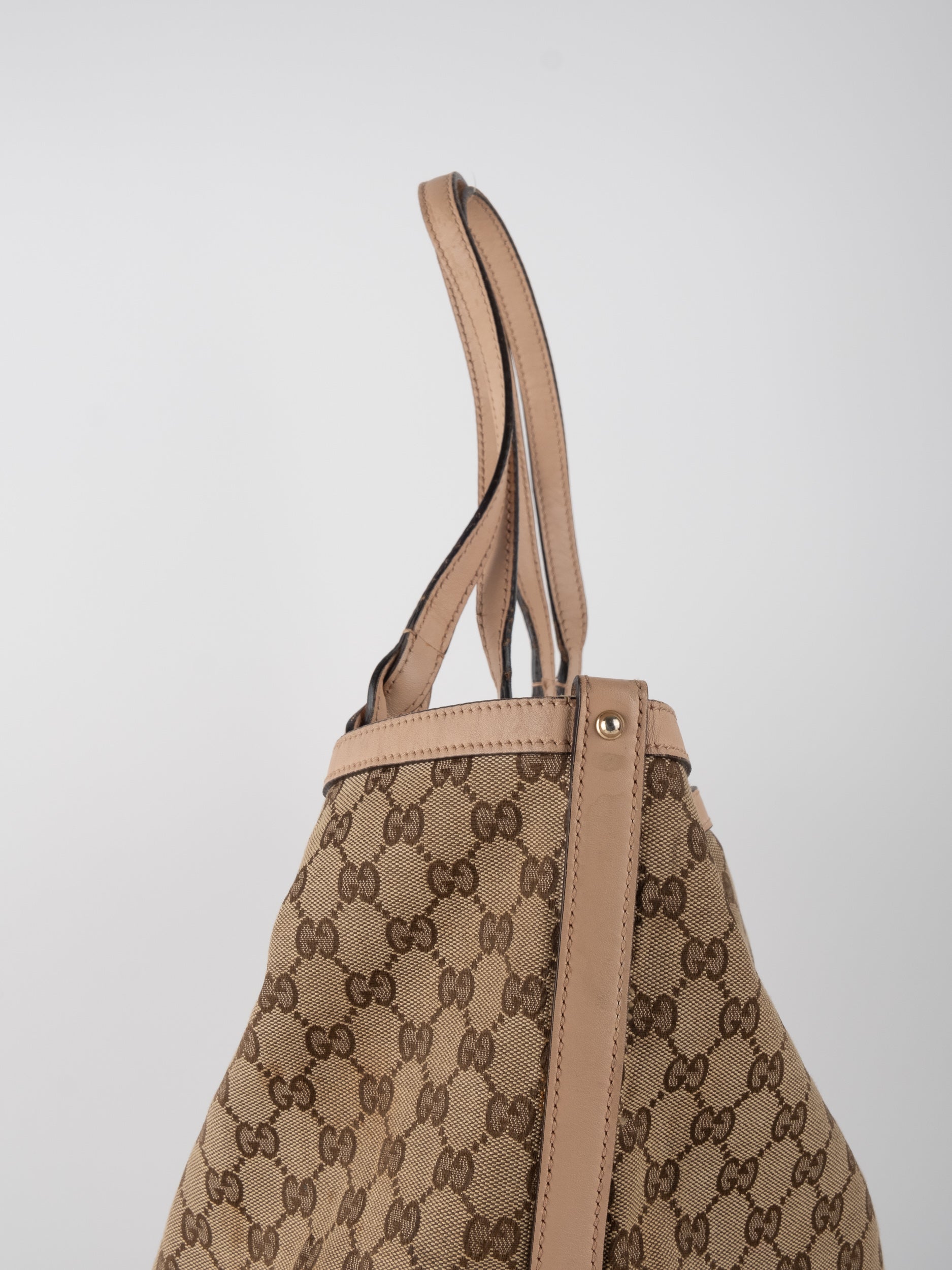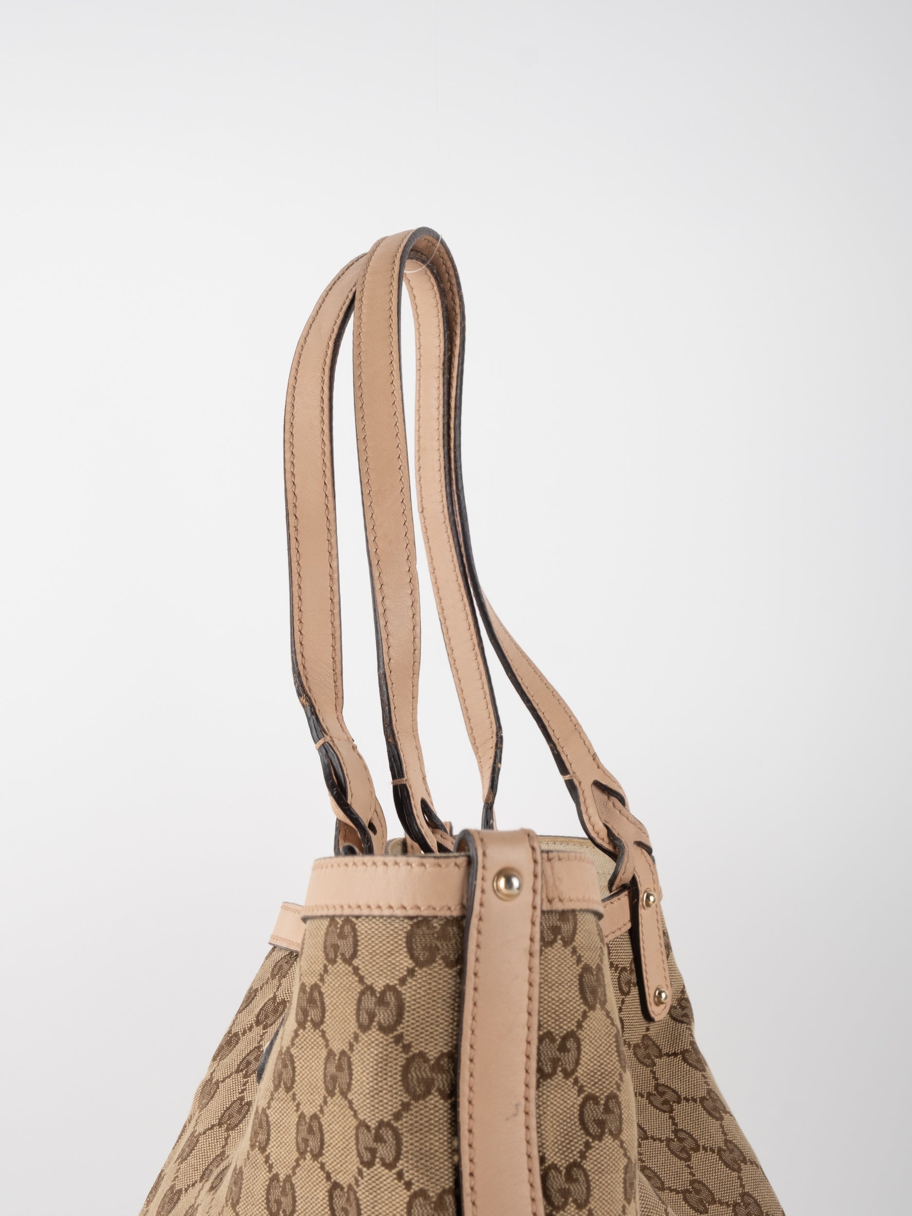 התיק עשוי קנבס בדוגמת GG בגווני בז’ וחום, עם ידיות כתף מעור בגוון ניוד בהיר וסגירה עליונה. מגיע עם נרתיק תואם נשלף שניתן לשימוש כקלאץ’ או לארגון פנימי. מבנה רך ומרווח במיוחד, אידיאלי לעבודה, יום עמוס או נסיעה קצרה.
