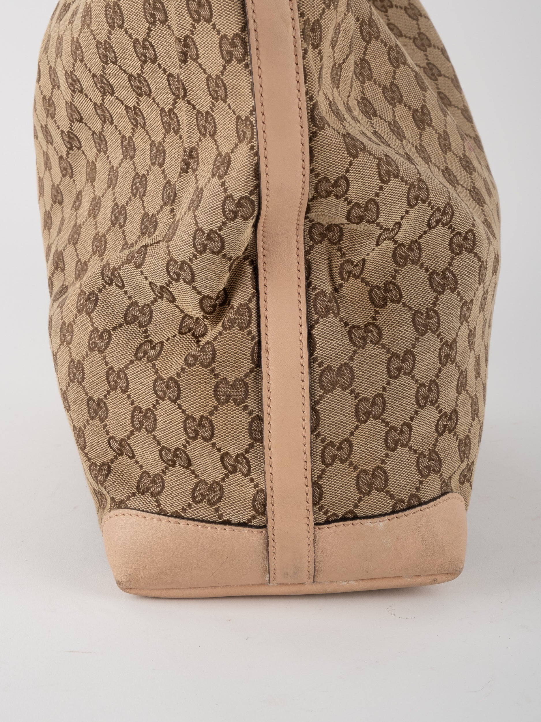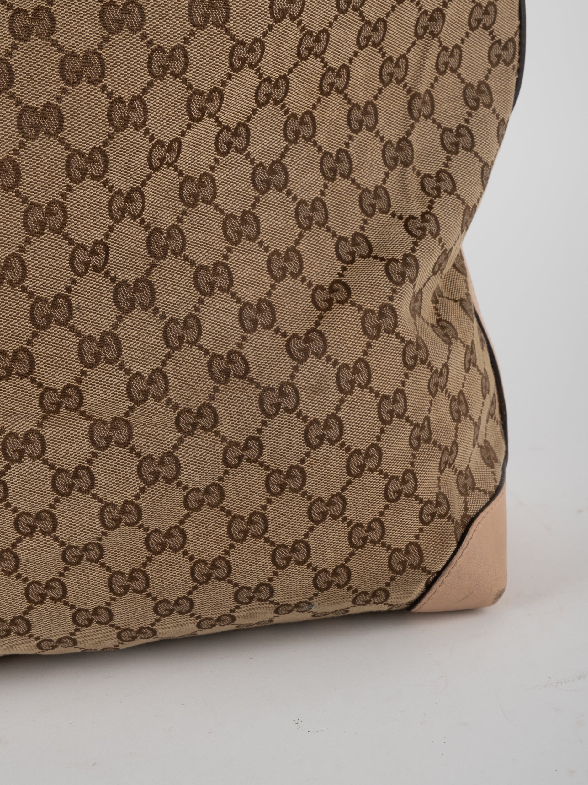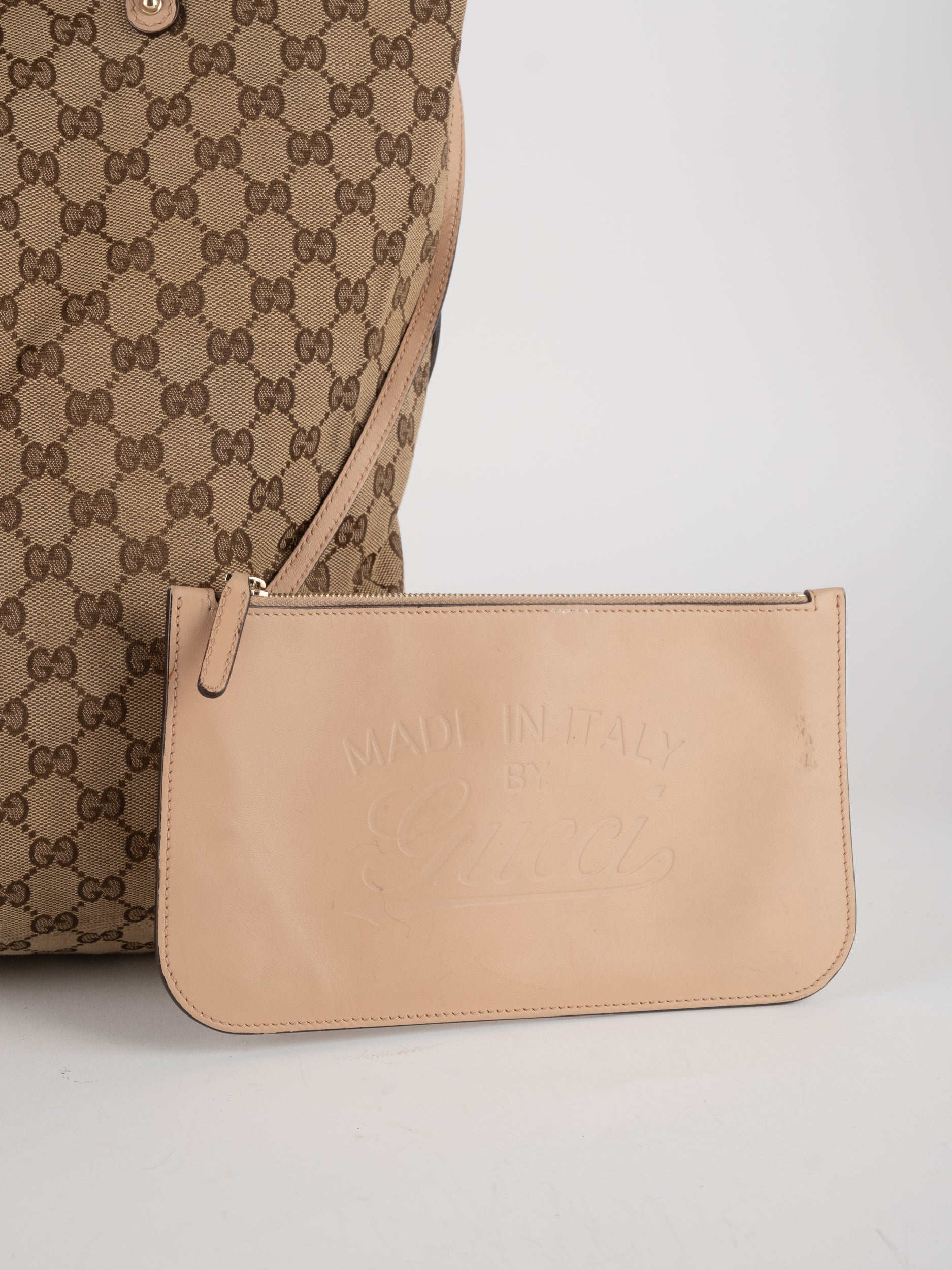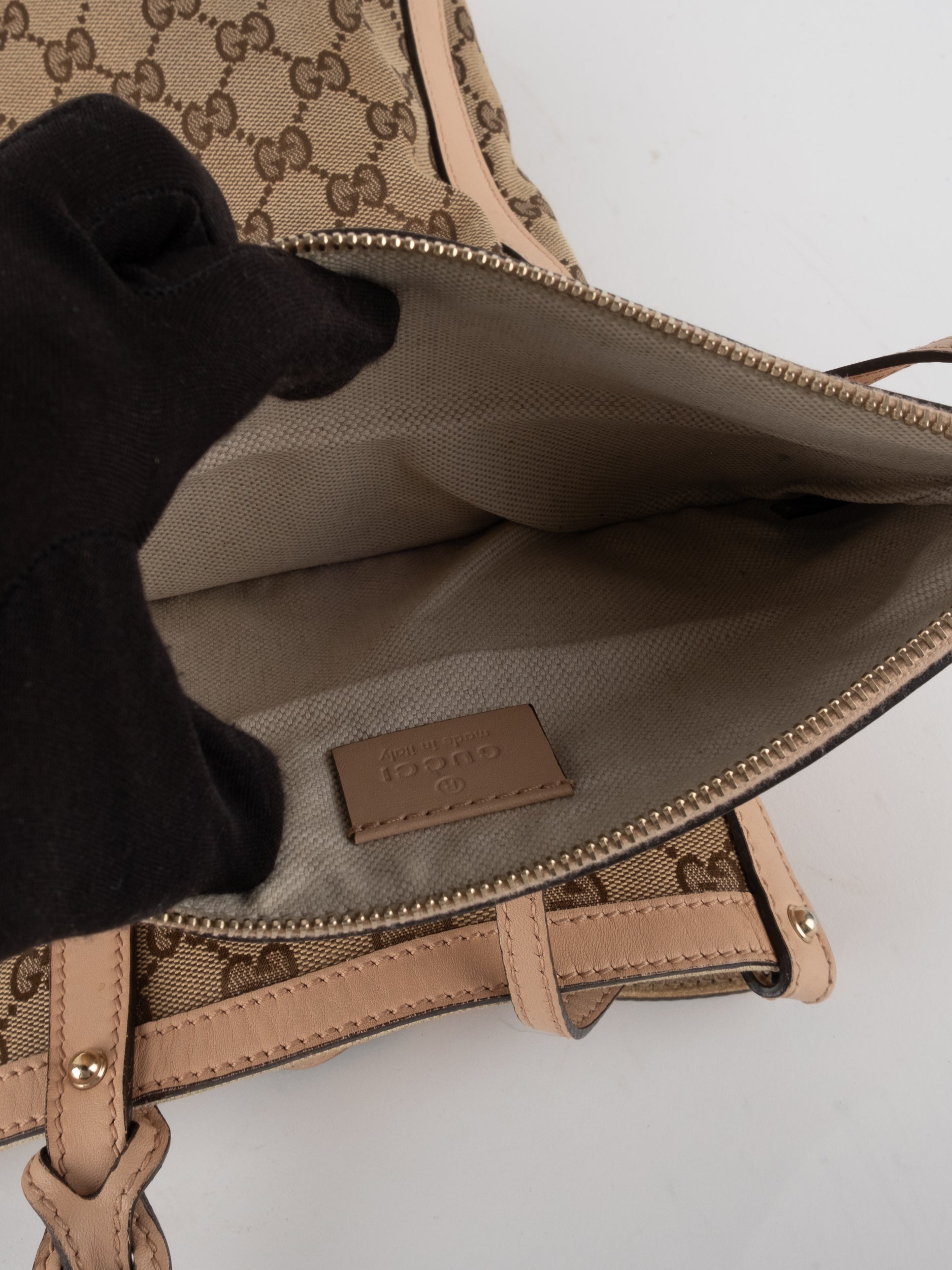 התיק עשוי קנבס בדוגמת GG בגווני בז’ וחום, עם ידיות כתף מעור בגוון ניוד בהיר וסגירה עליונה. מגיע עם נרתיק תואם נשלף שניתן לשימוש כקלאץ’ או לארגון פנימי. מבנה רך ומרווח במיוחד, אידיאלי לעבודה, יום עמוס או נסיעה קצרה.