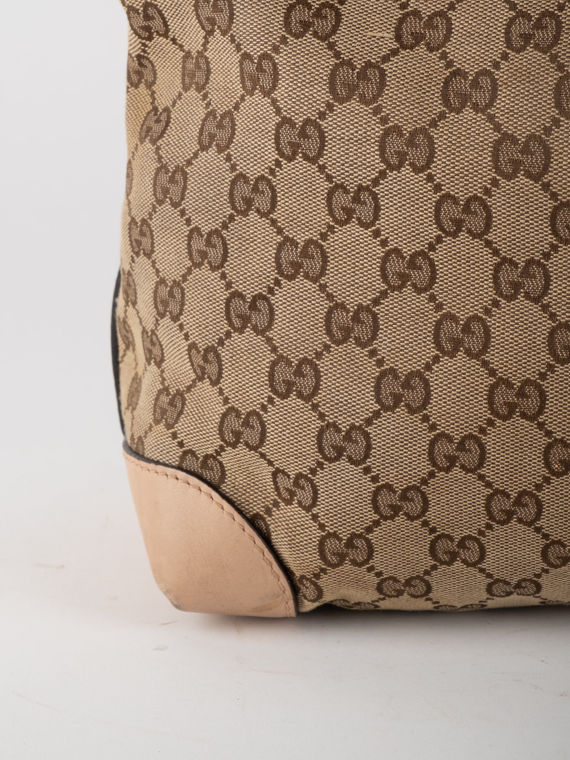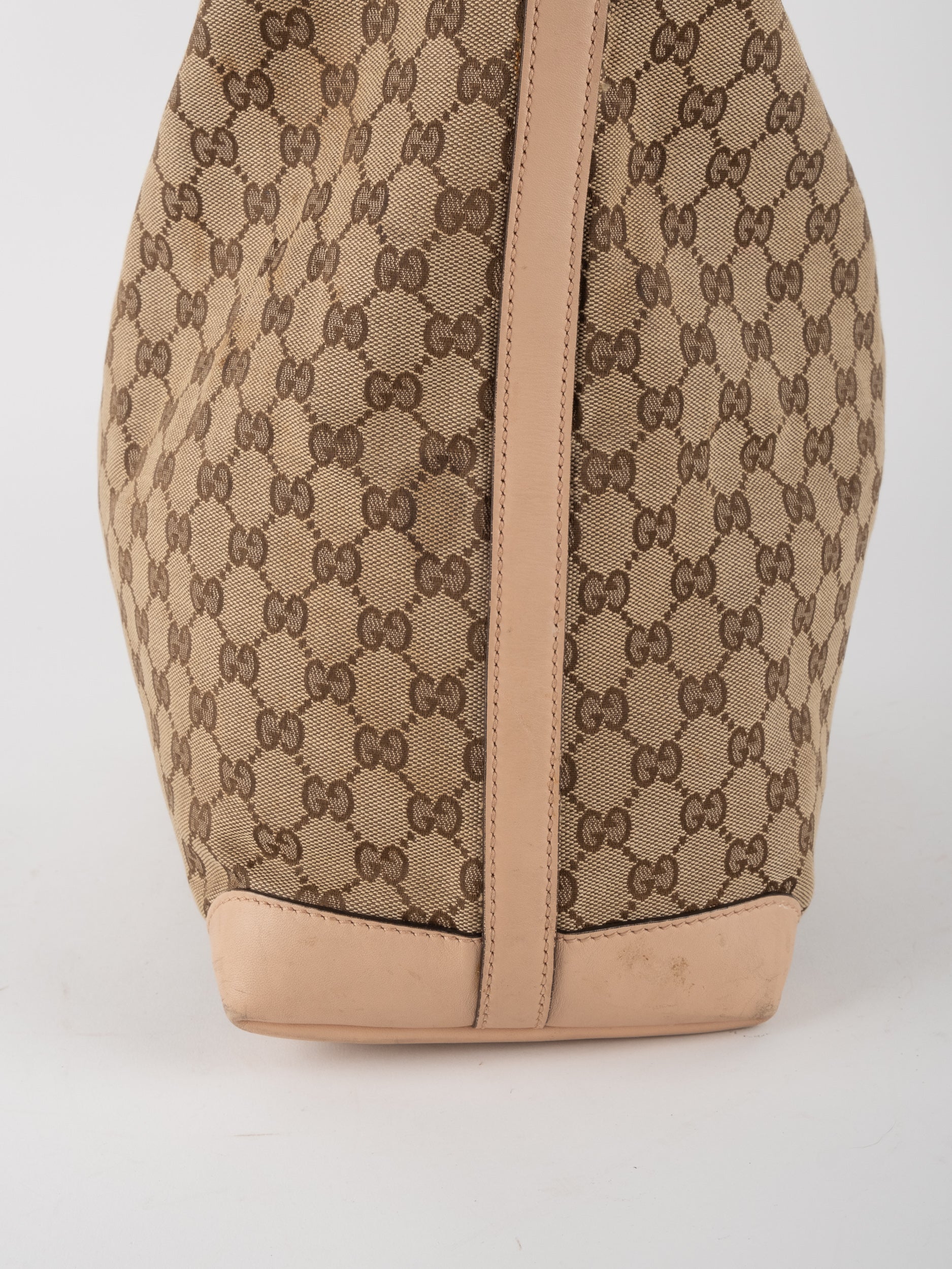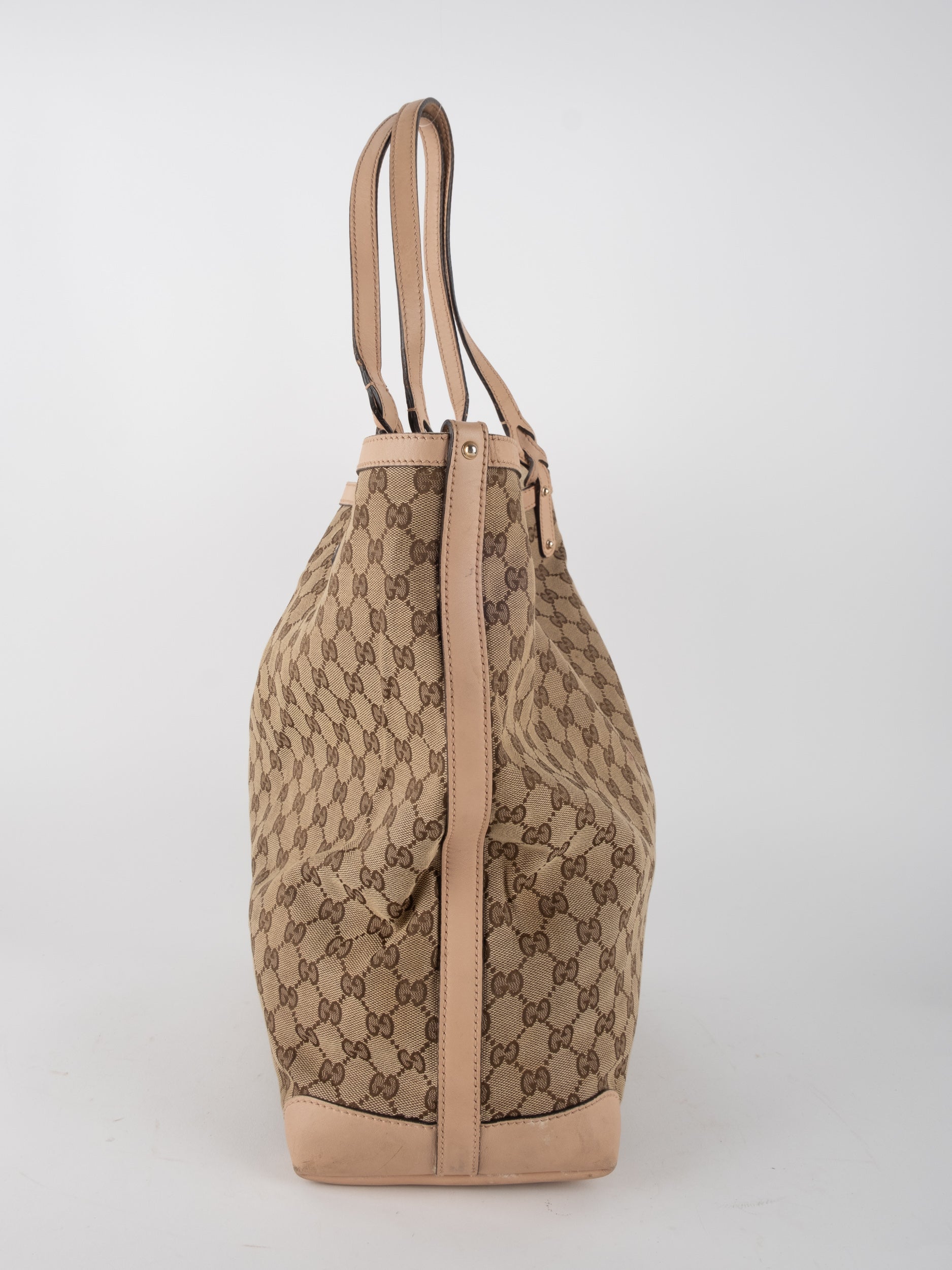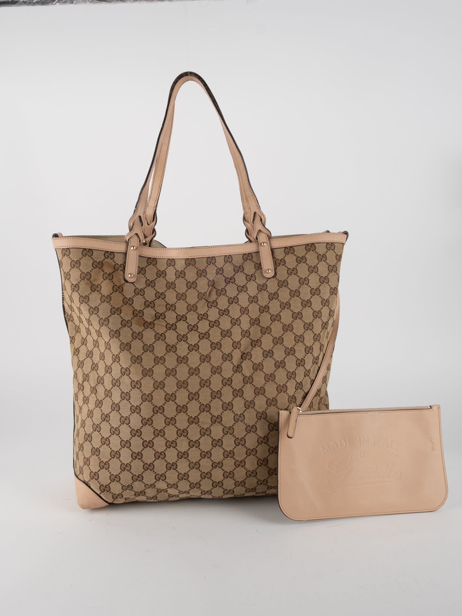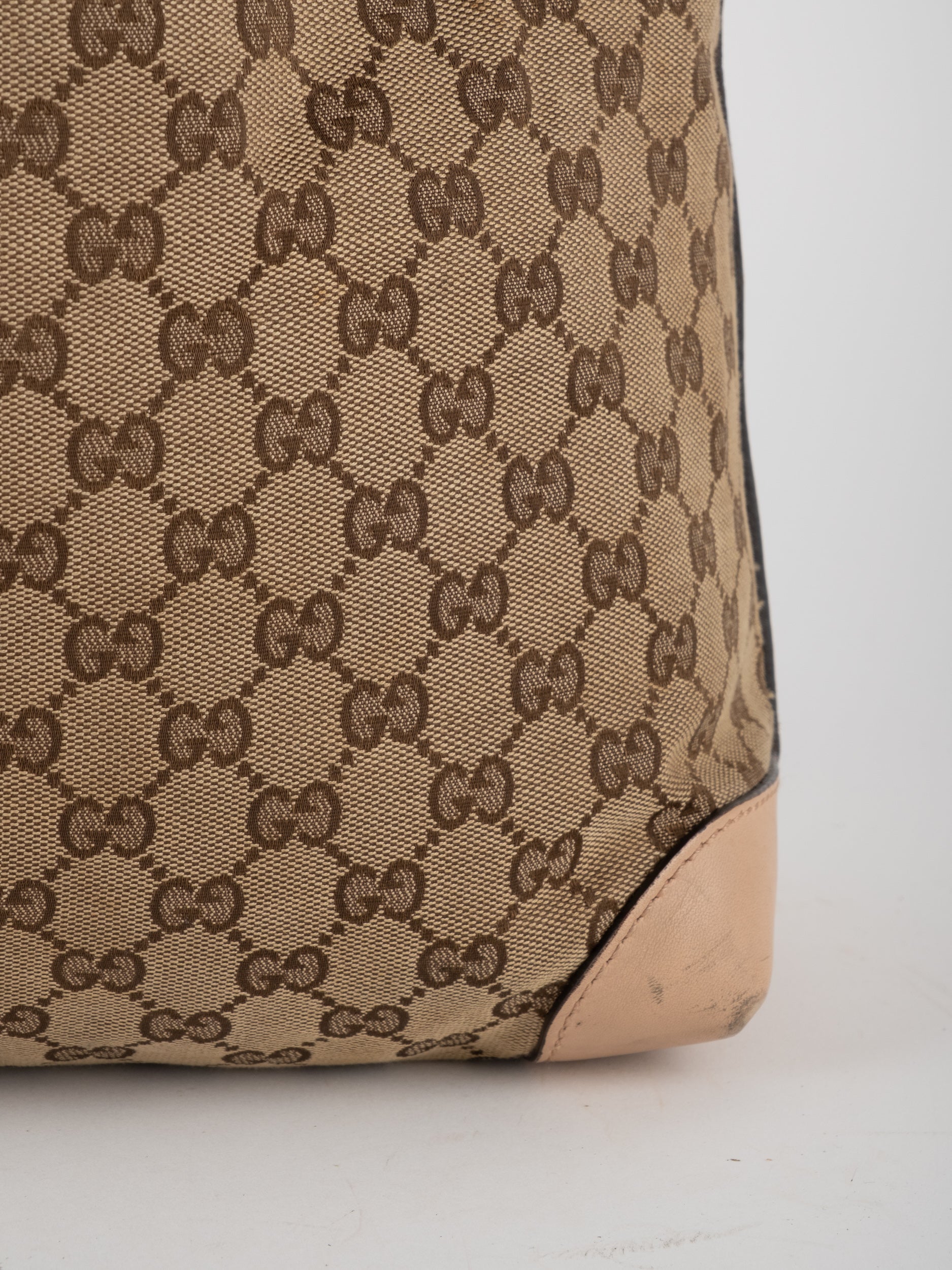 התיק עשוי קנבס בדוגמת GG בגווני בז’ וחום, עם ידיות כתף מעור בגוון ניוד בהיר וסגירה עליונה. מגיע עם נרתיק תואם נשלף שניתן לשימוש כקלאץ’ או לארגון פנימי. מבנה רך ומרווח במיוחד, אידיאלי לעבודה, יום עמוס או נסיעה קצרה.