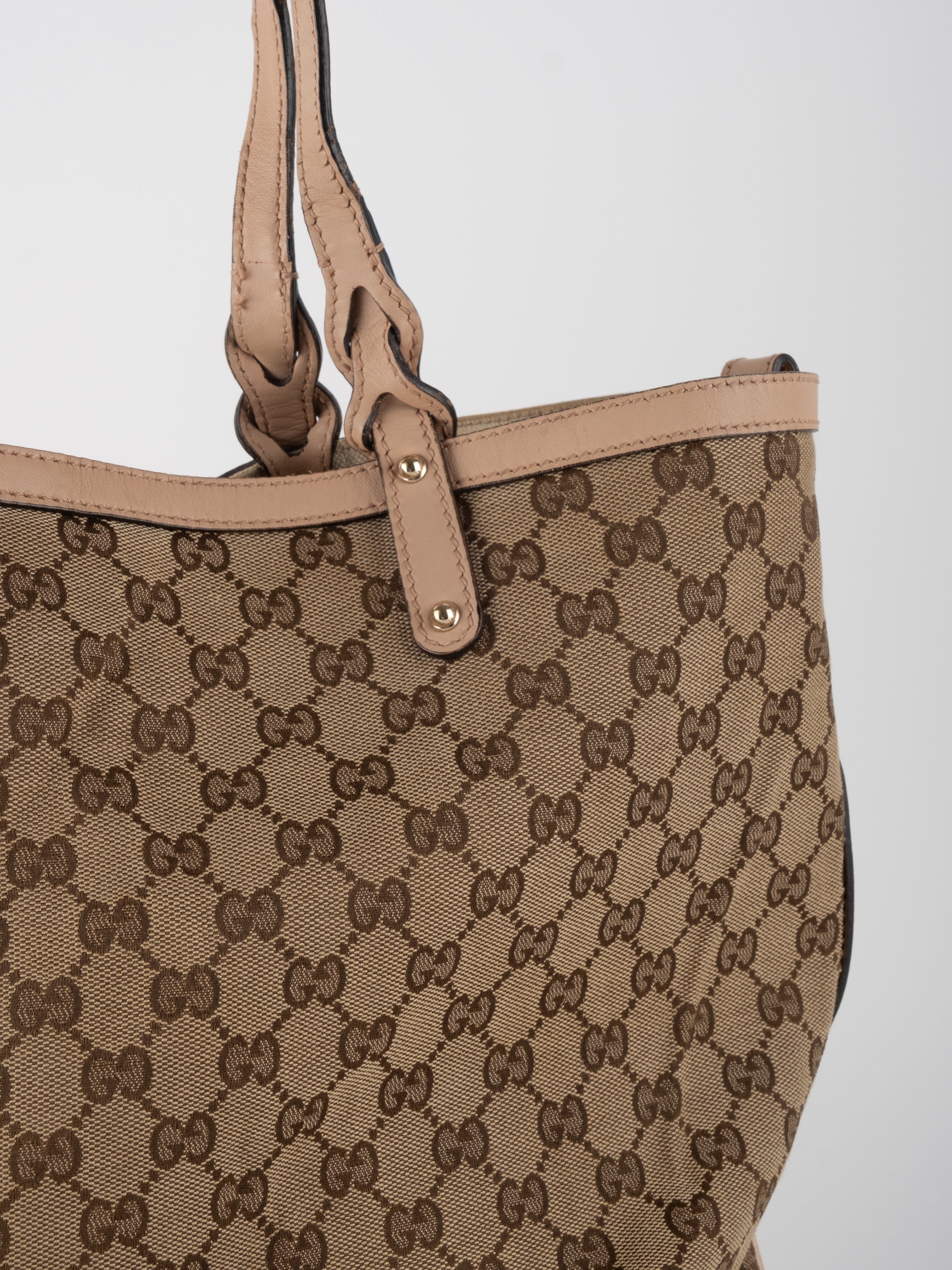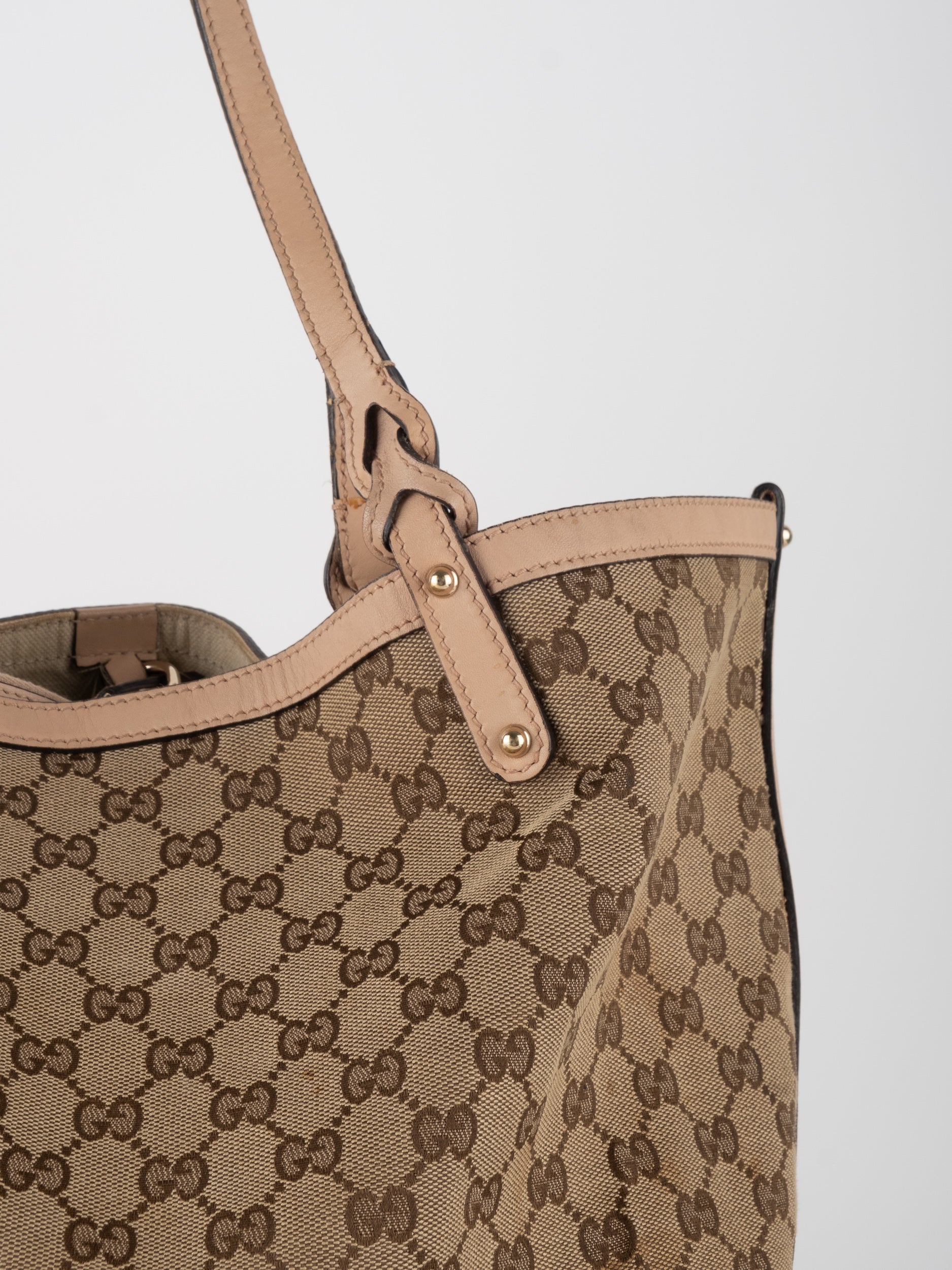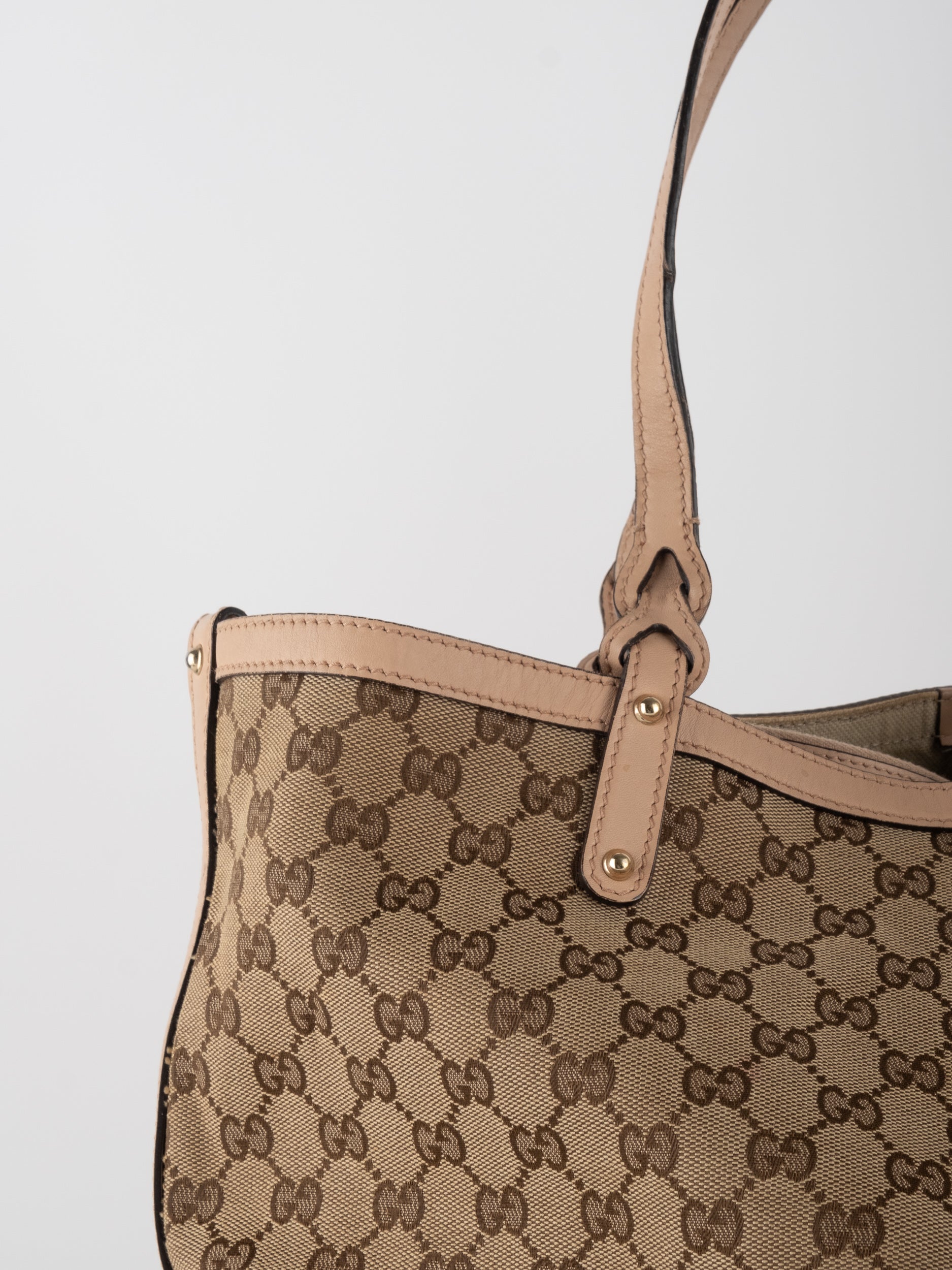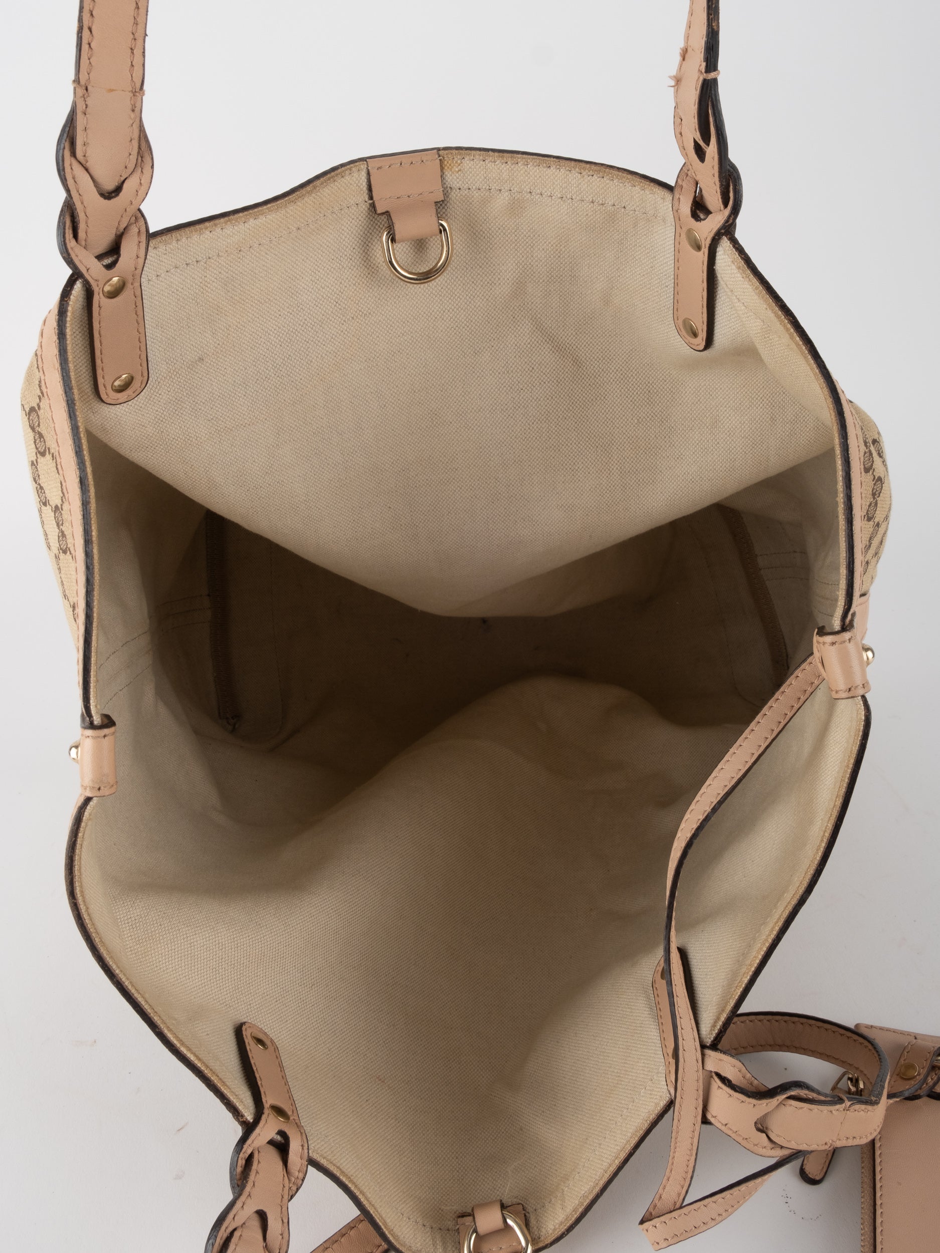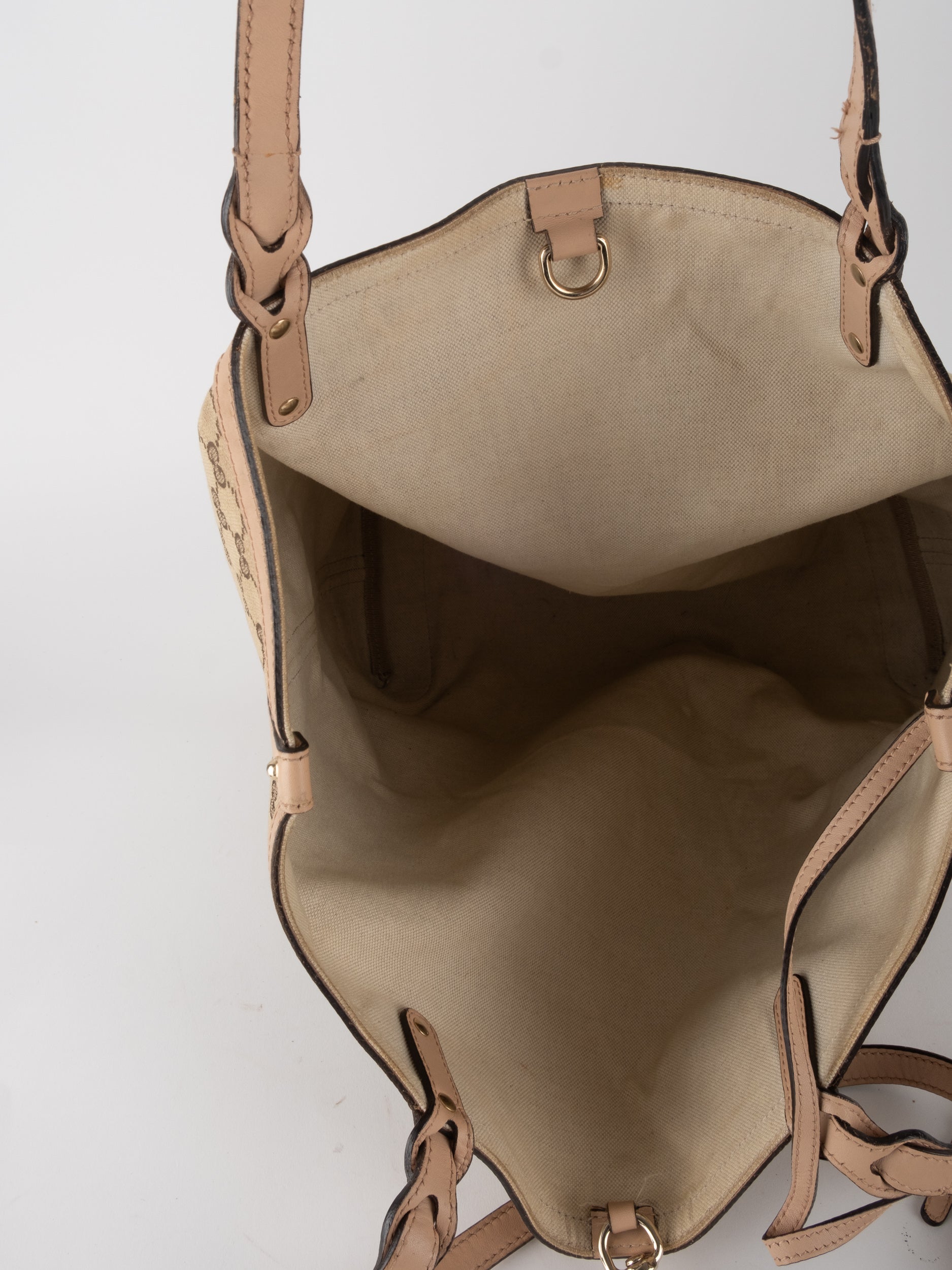 גוצ'י GUCCI וינטג' יד שנייה בדוגמת GG בגוון בז’ חם עם עיטורי עור בהיר ותיקון תואם נשלף. טוט קלאסי, מרווח ומדויק – כזה שנראה יוקרתי בלי להתאמץ ומשתלב מושלם עם לוק יומי אלגנטי.