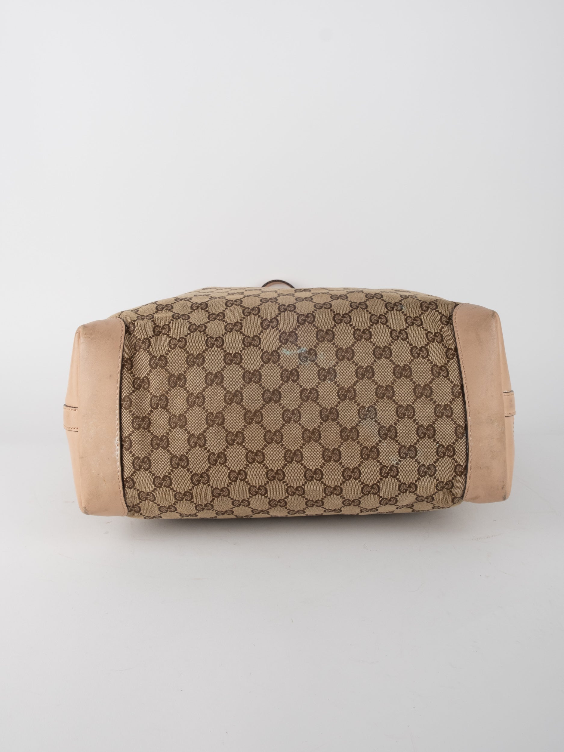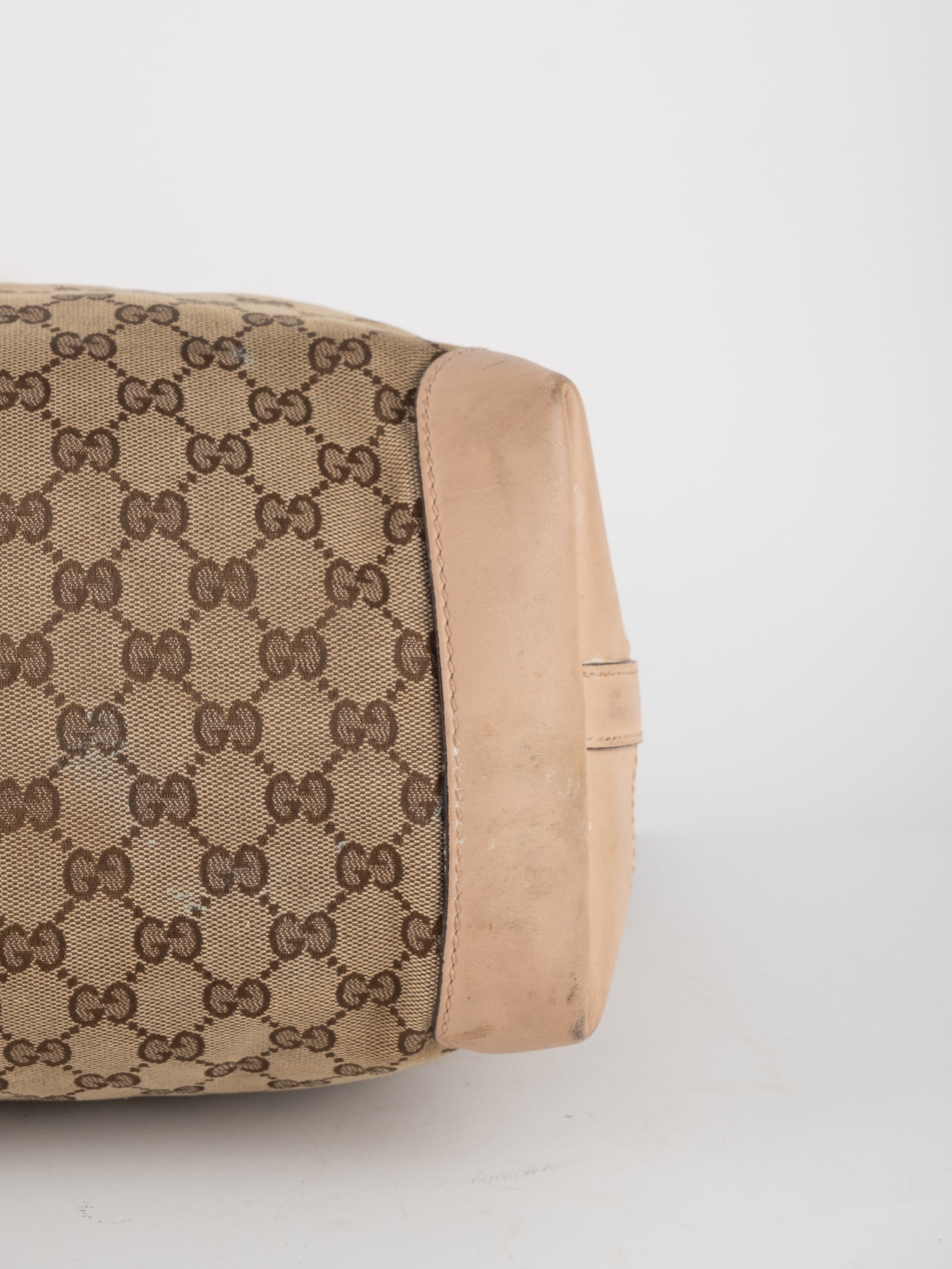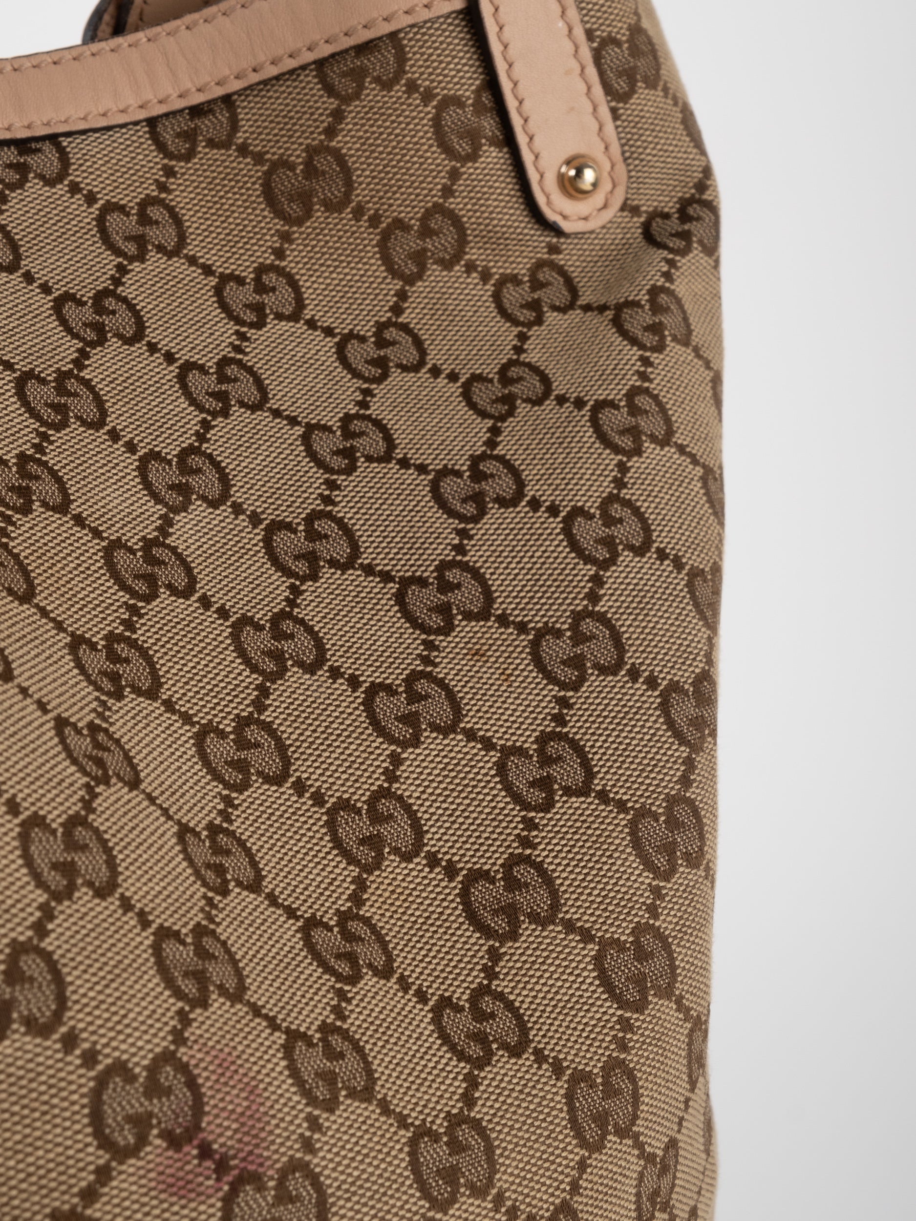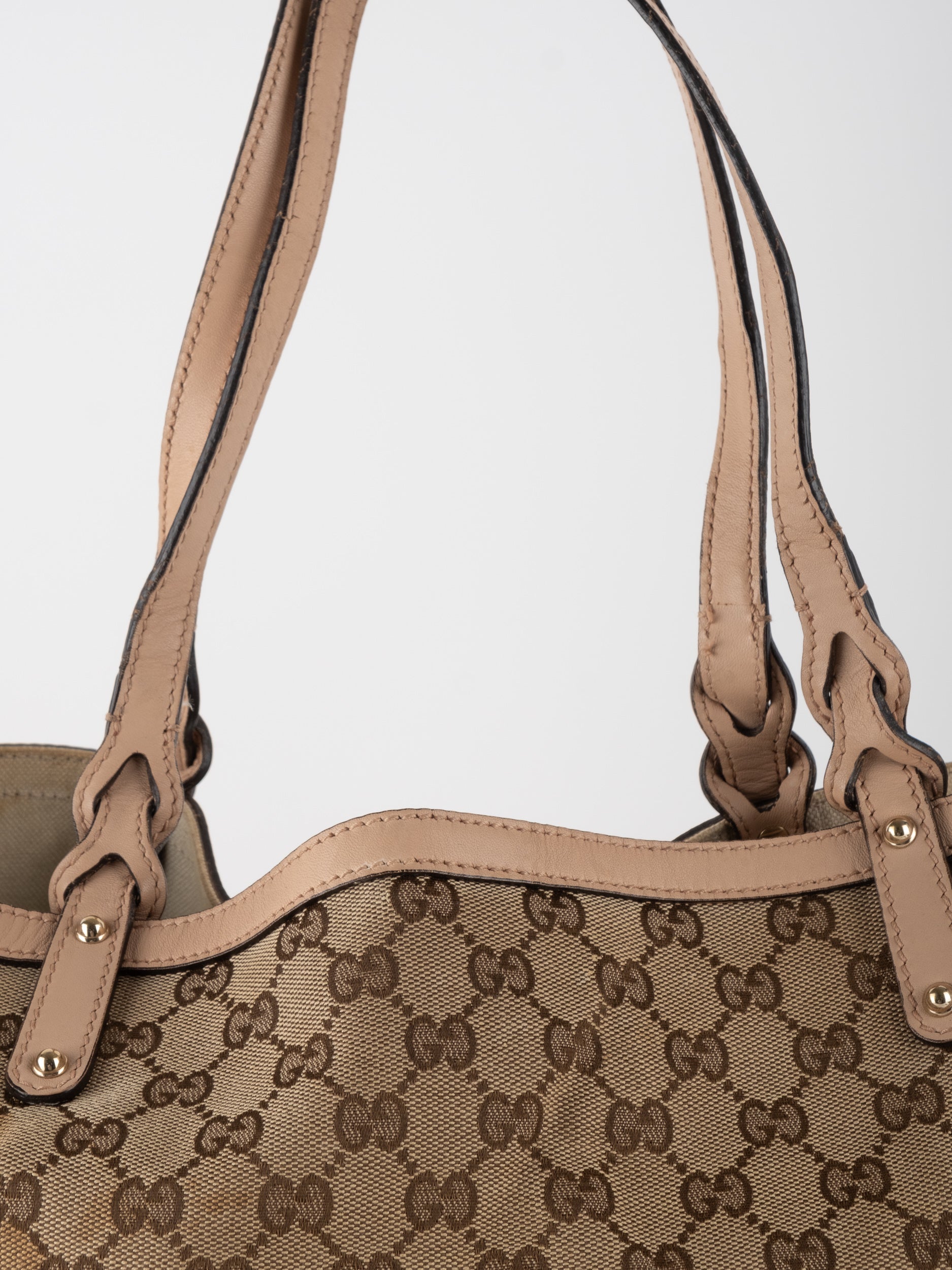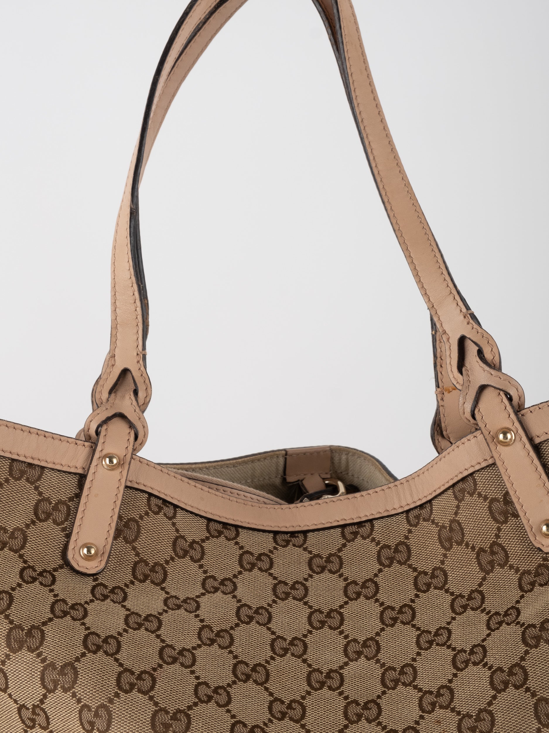 גוצ'י GUCCI וינטג' יד שנייה בדוגמת GG בגוון בז’ חם עם עיטורי עור בהיר ותיקון תואם נשלף. טוט קלאסי, מרווח ומדויק – כזה שנראה יוקרתי בלי להתאמץ ומשתלב מושלם עם לוק יומי אלגנטי.