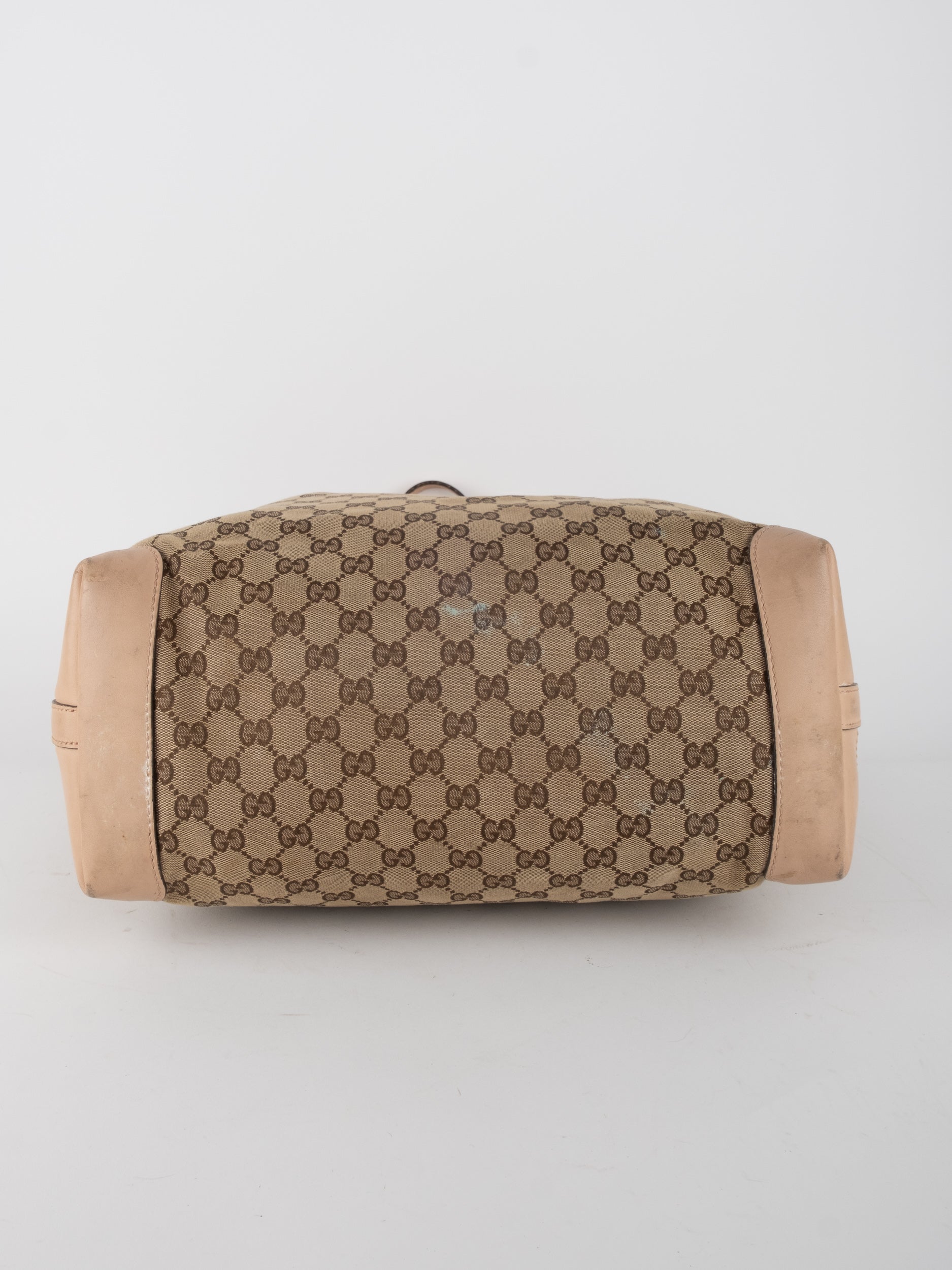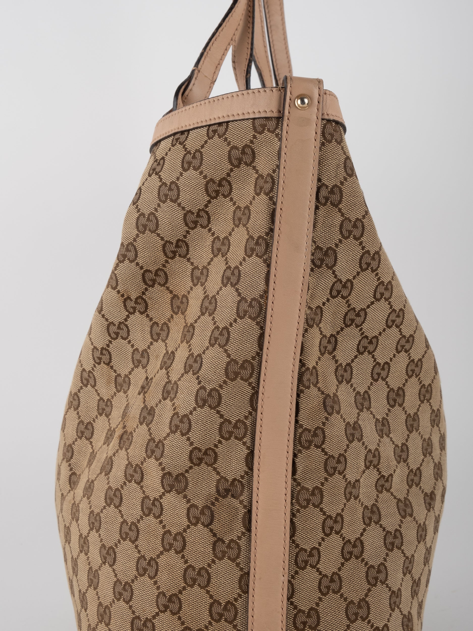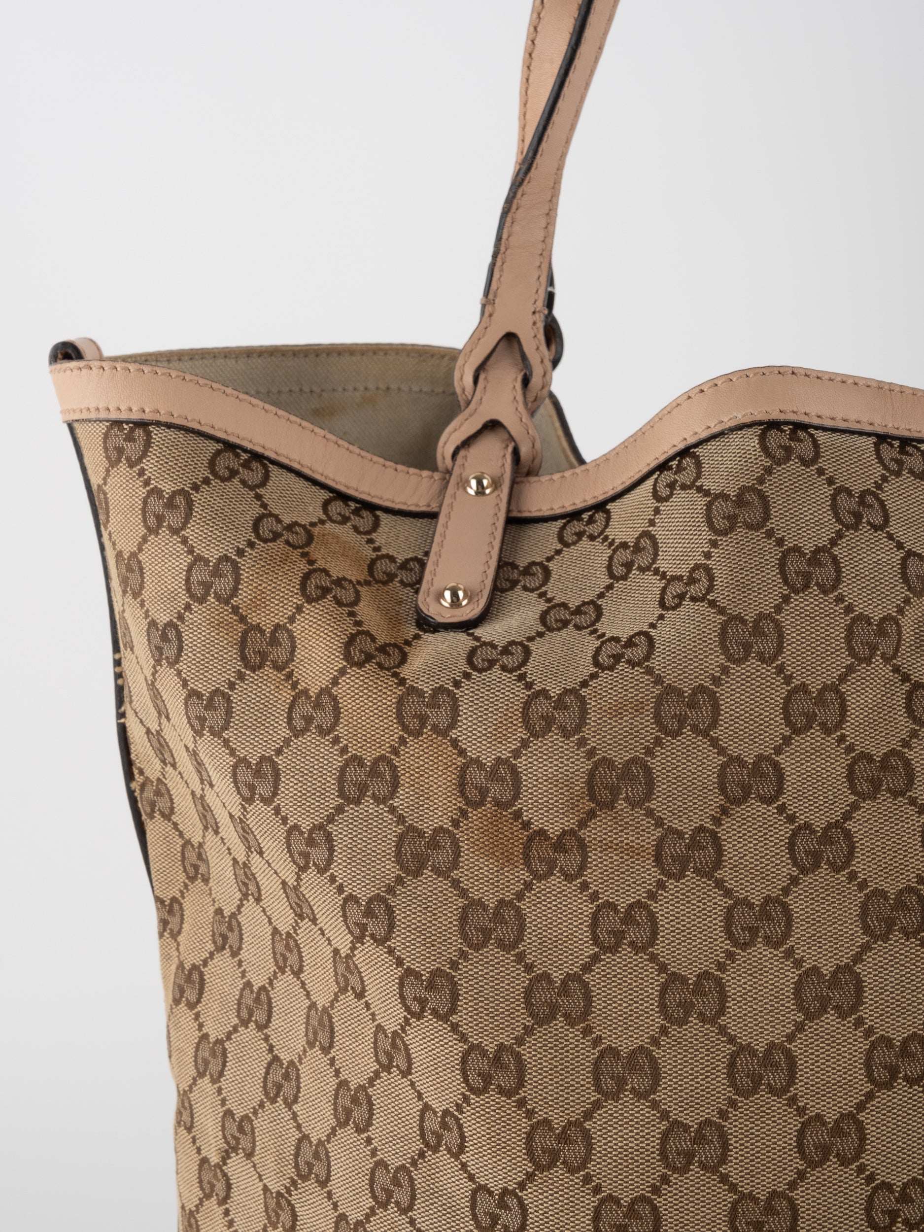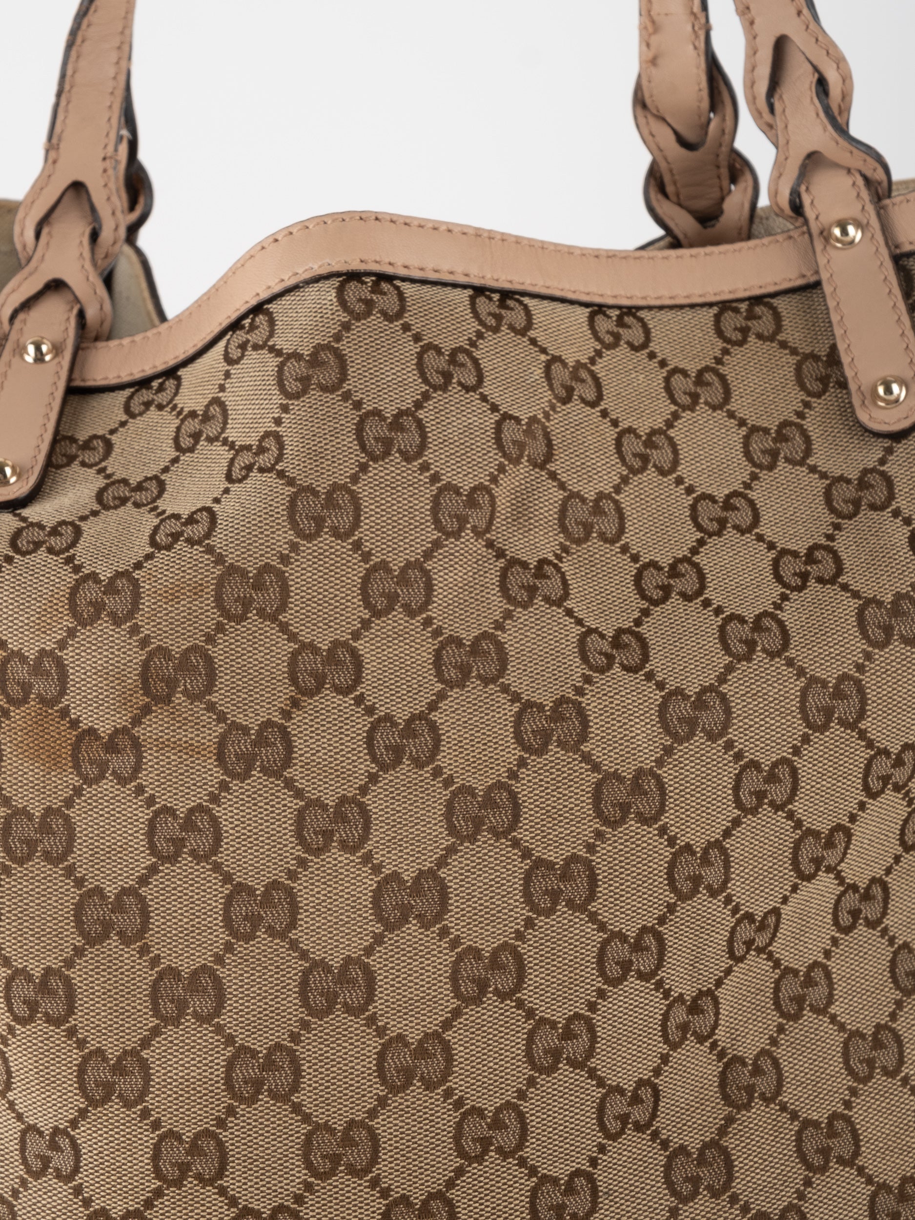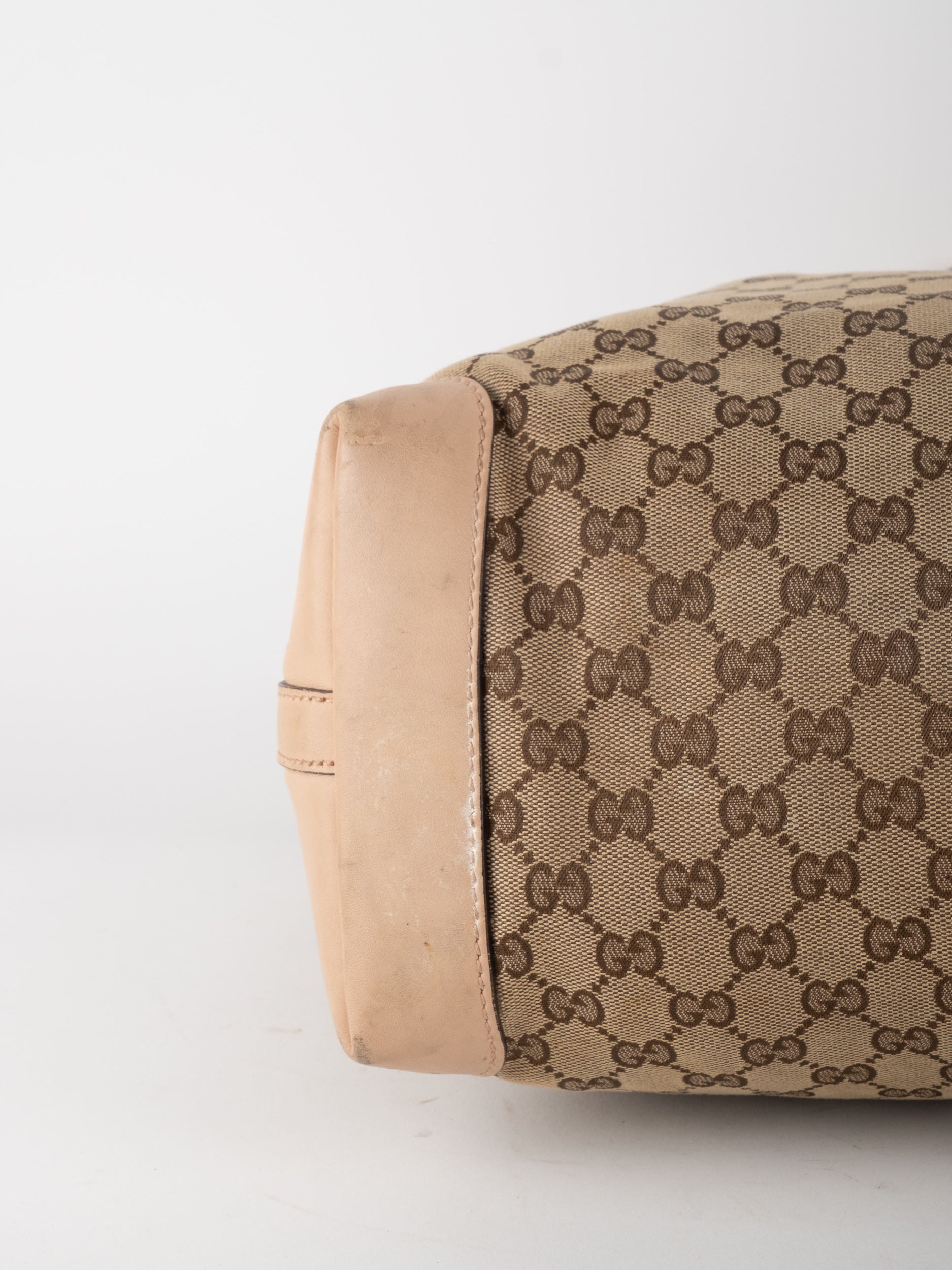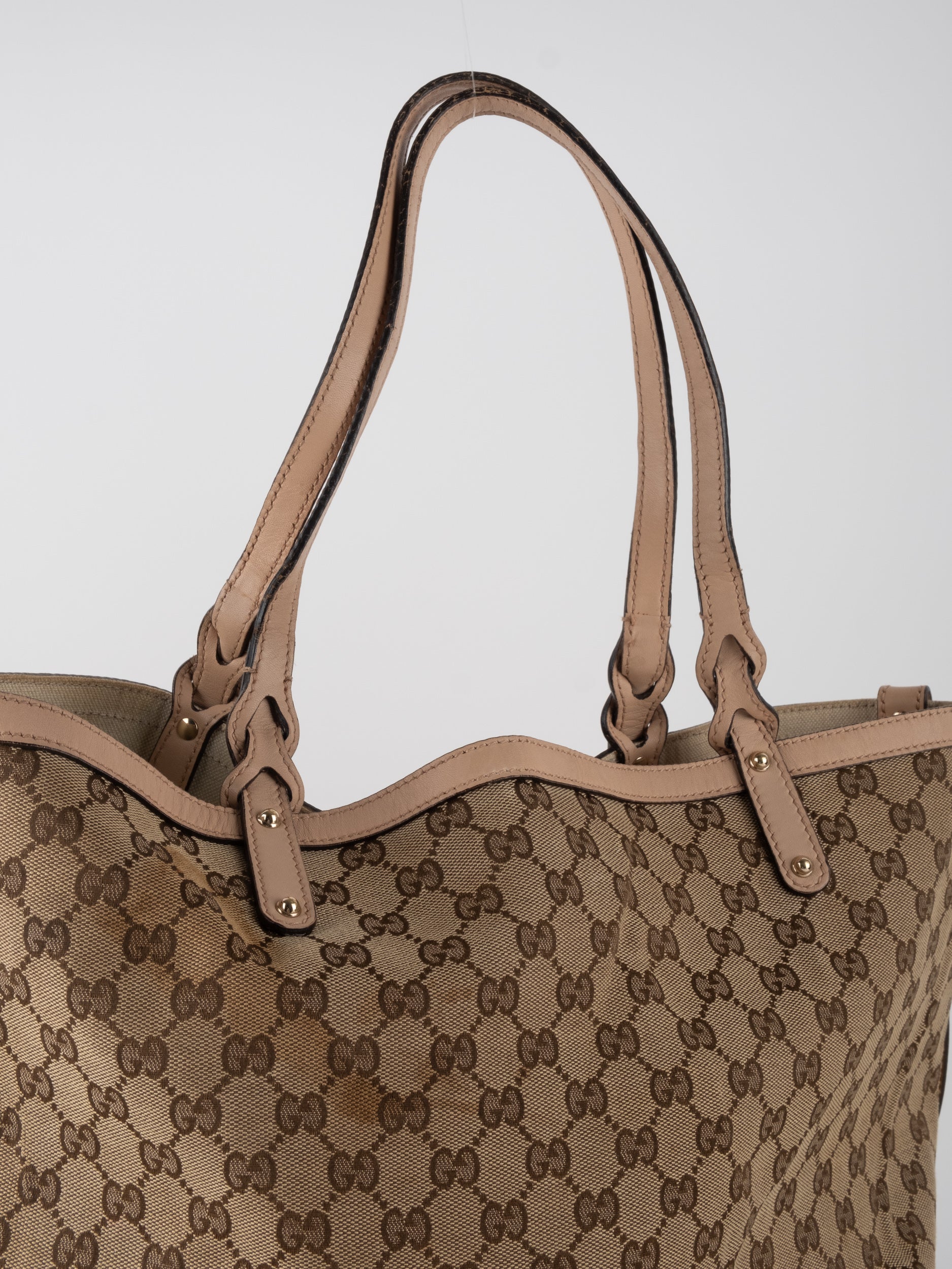 גוצ'י GUCCI וינטג' יד שנייה בדוגמת GG בגוון בז’ חם עם עיטורי עור בהיר ותיקון תואם נשלף. טוט קלאסי, מרווח ומדויק – כזה שנראה יוקרתי בלי להתאמץ ומשתלב מושלם עם לוק יומי אלגנטי.