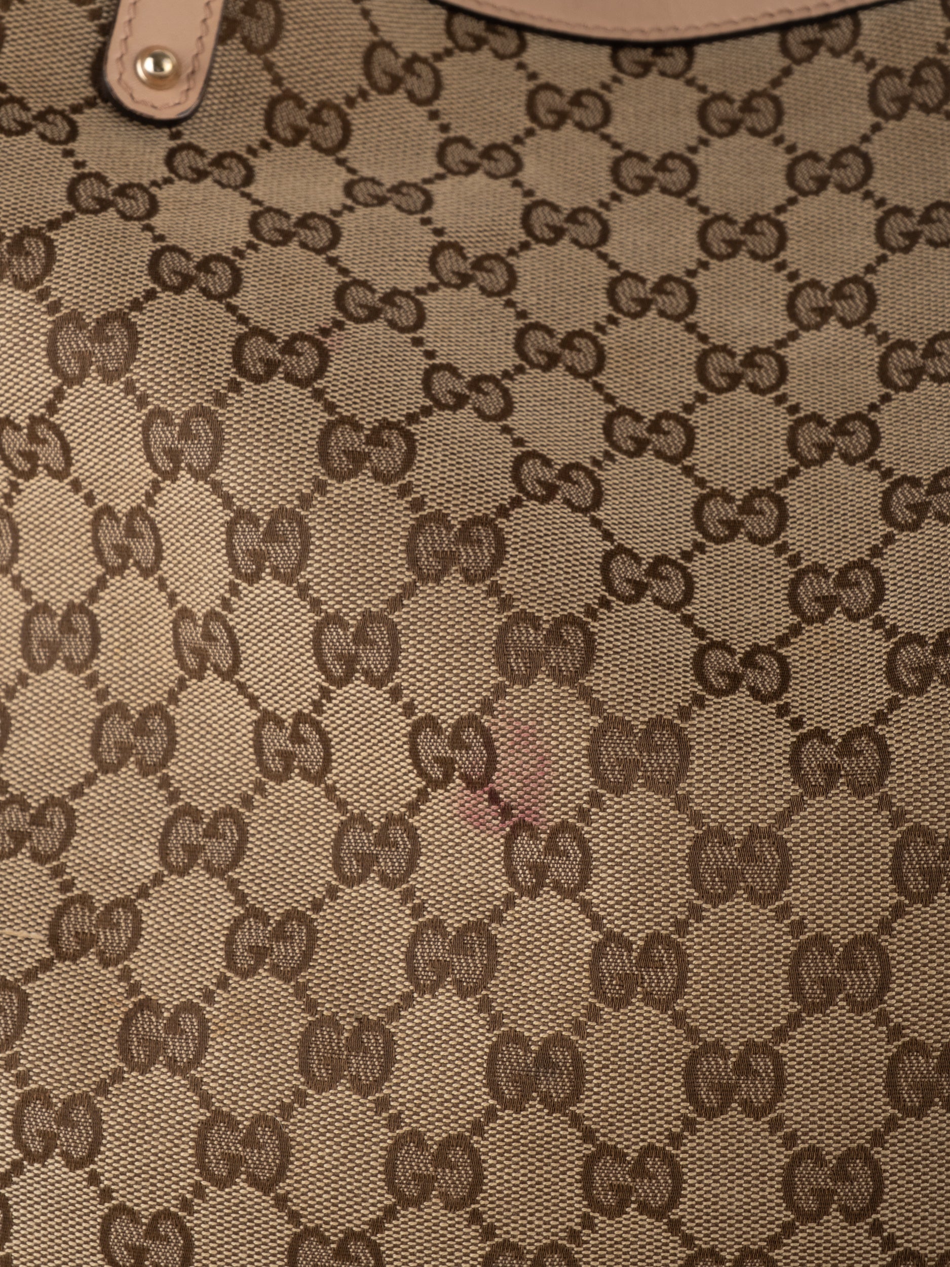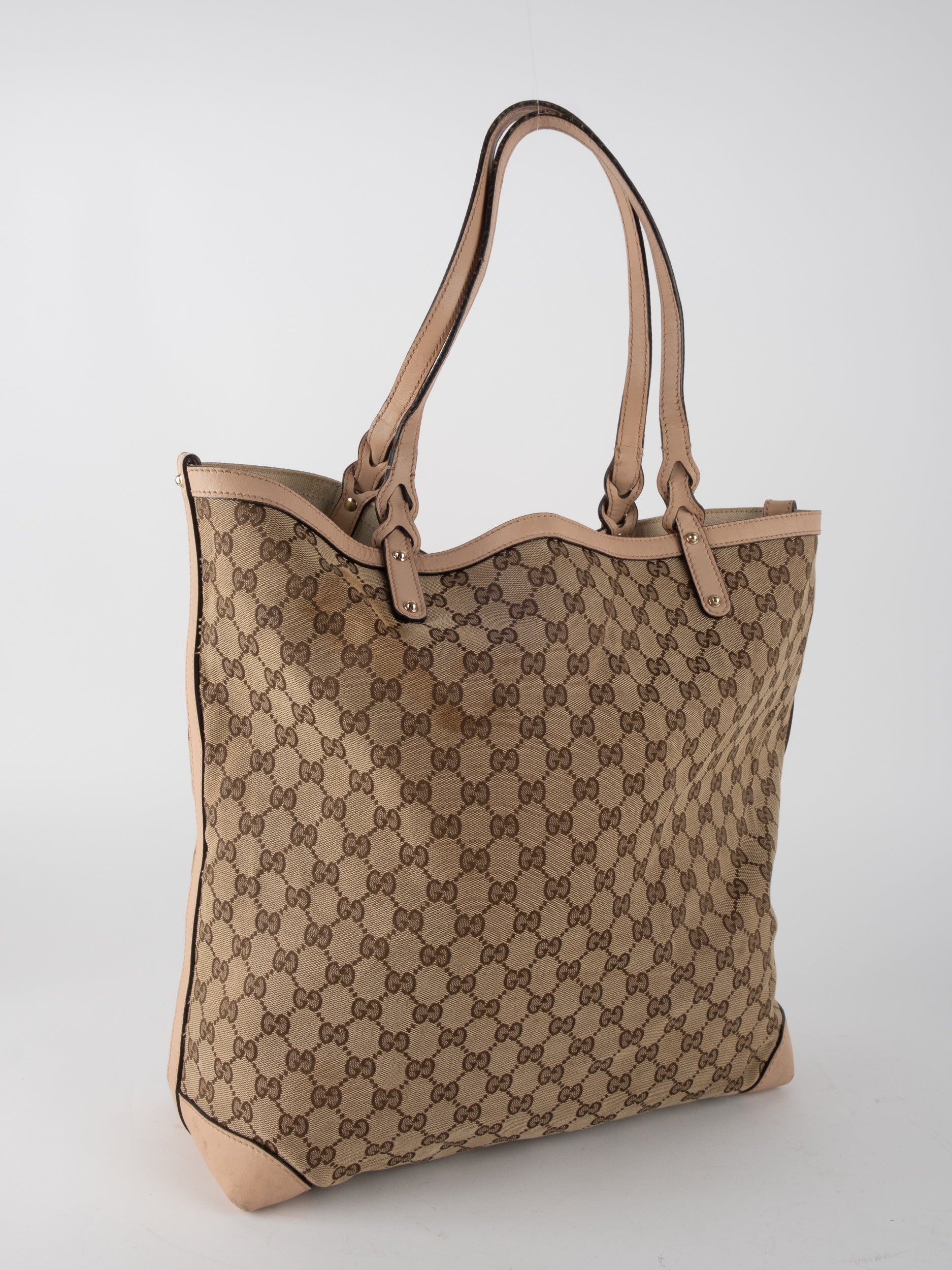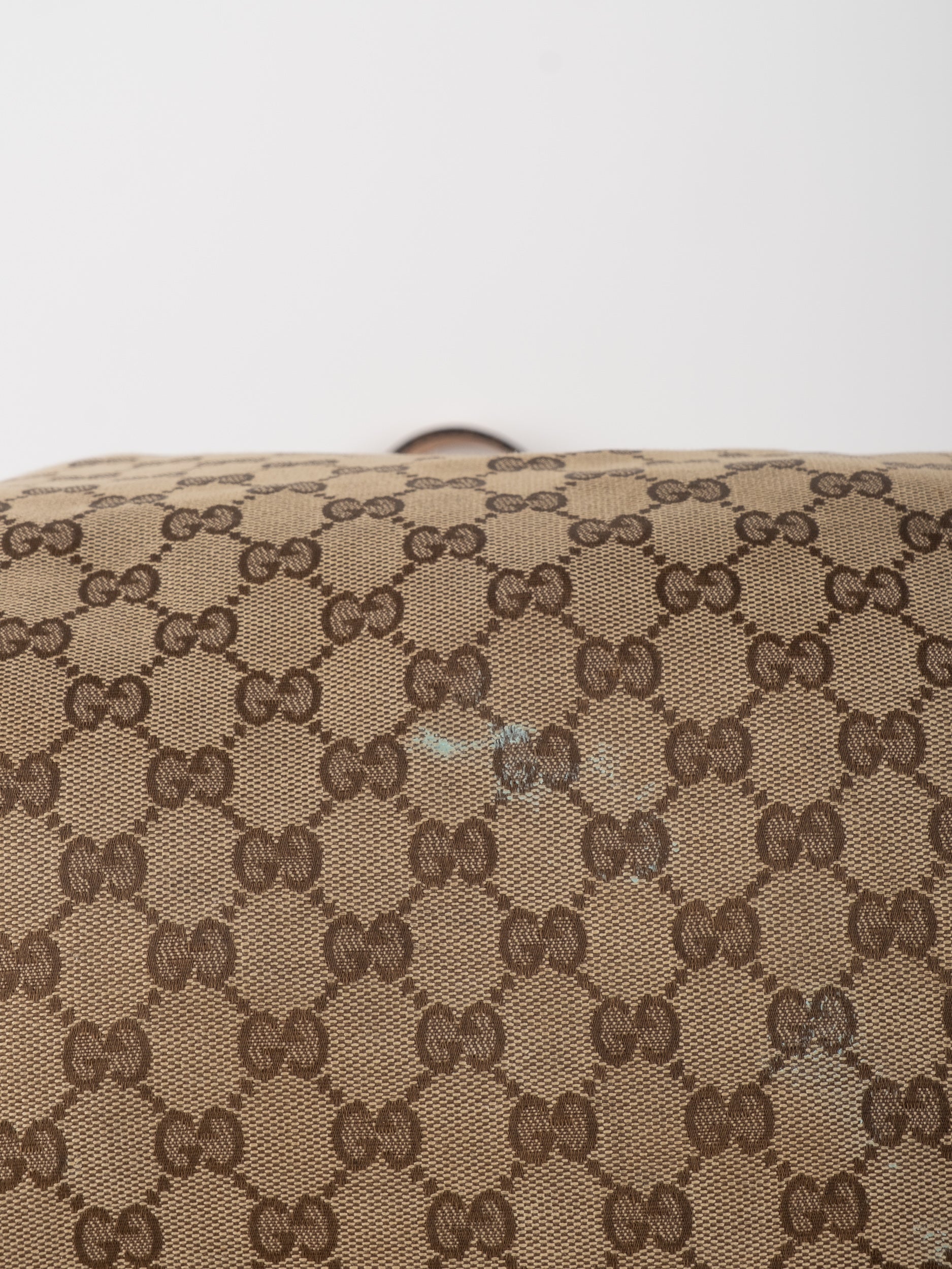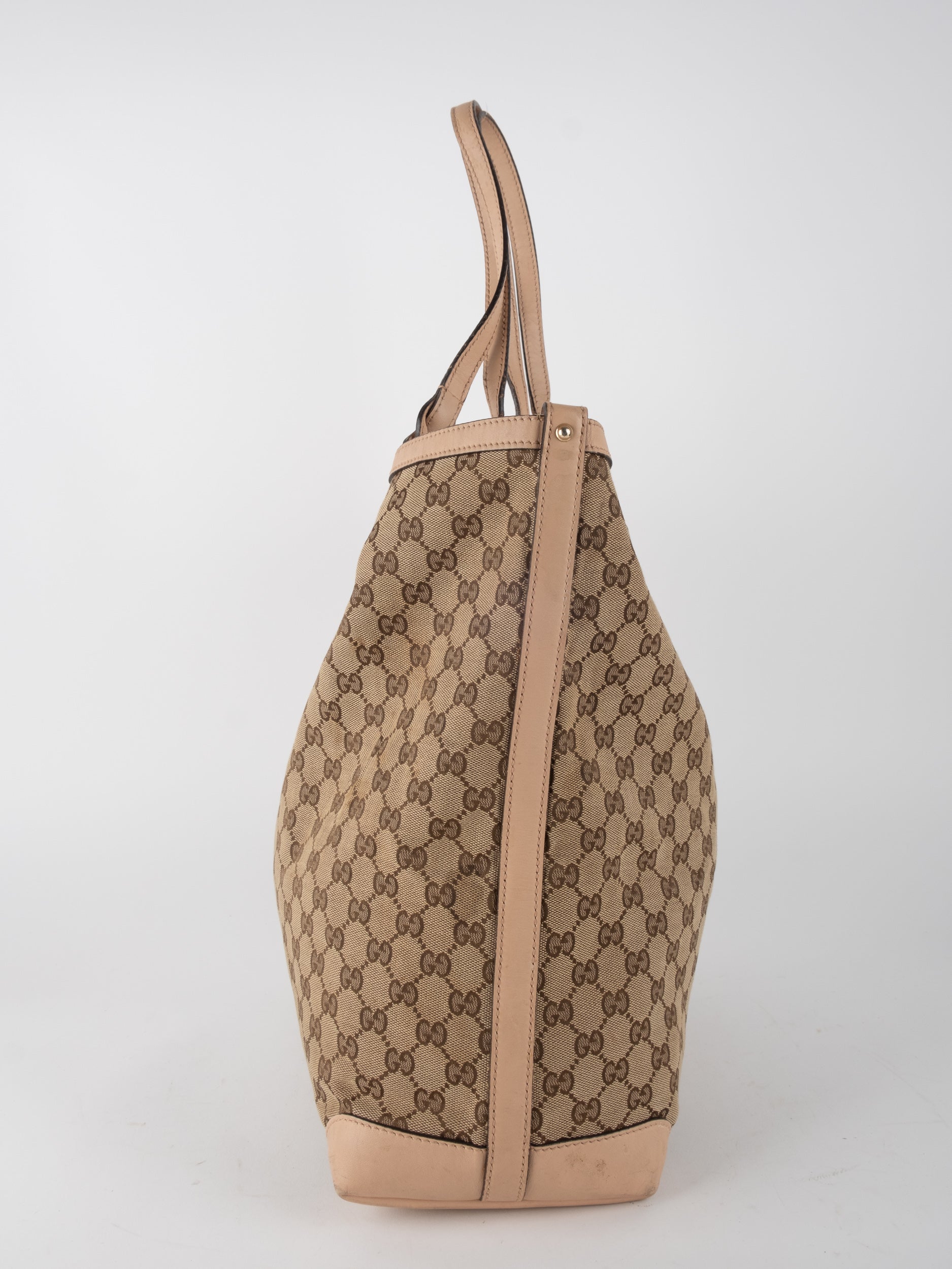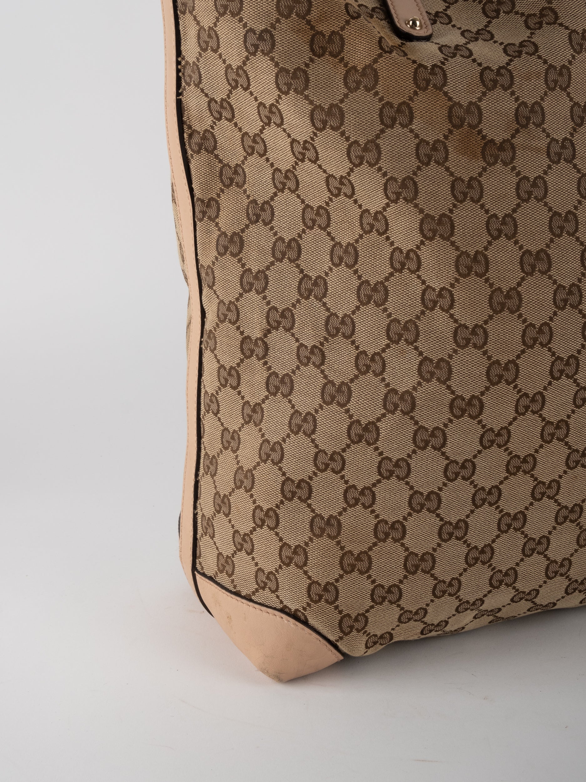 גוצ'י GUCCI וינטג' יד שנייה בדוגמת GG בגוון בז’ חם עם עיטורי עור בהיר ותיקון תואם נשלף. טוט קלאסי, מרווח ומדויק – כזה שנראה יוקרתי בלי להתאמץ ומשתלב מושלם עם לוק יומי אלגנטי.