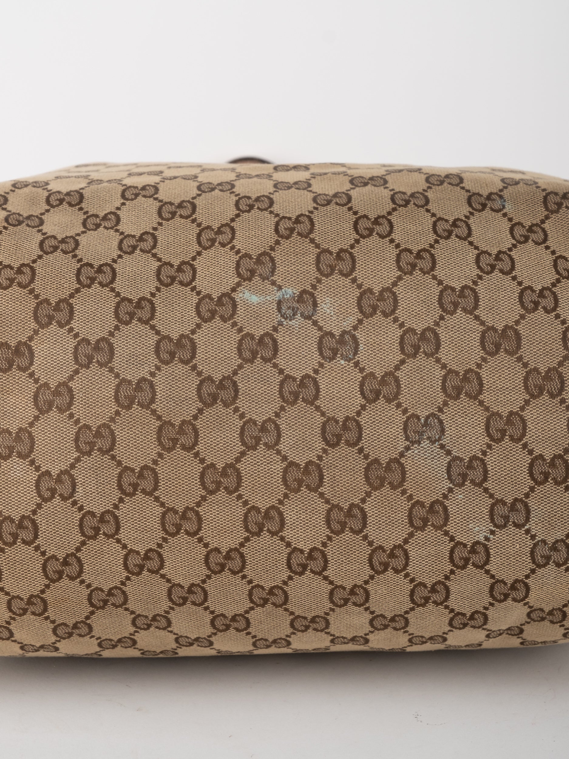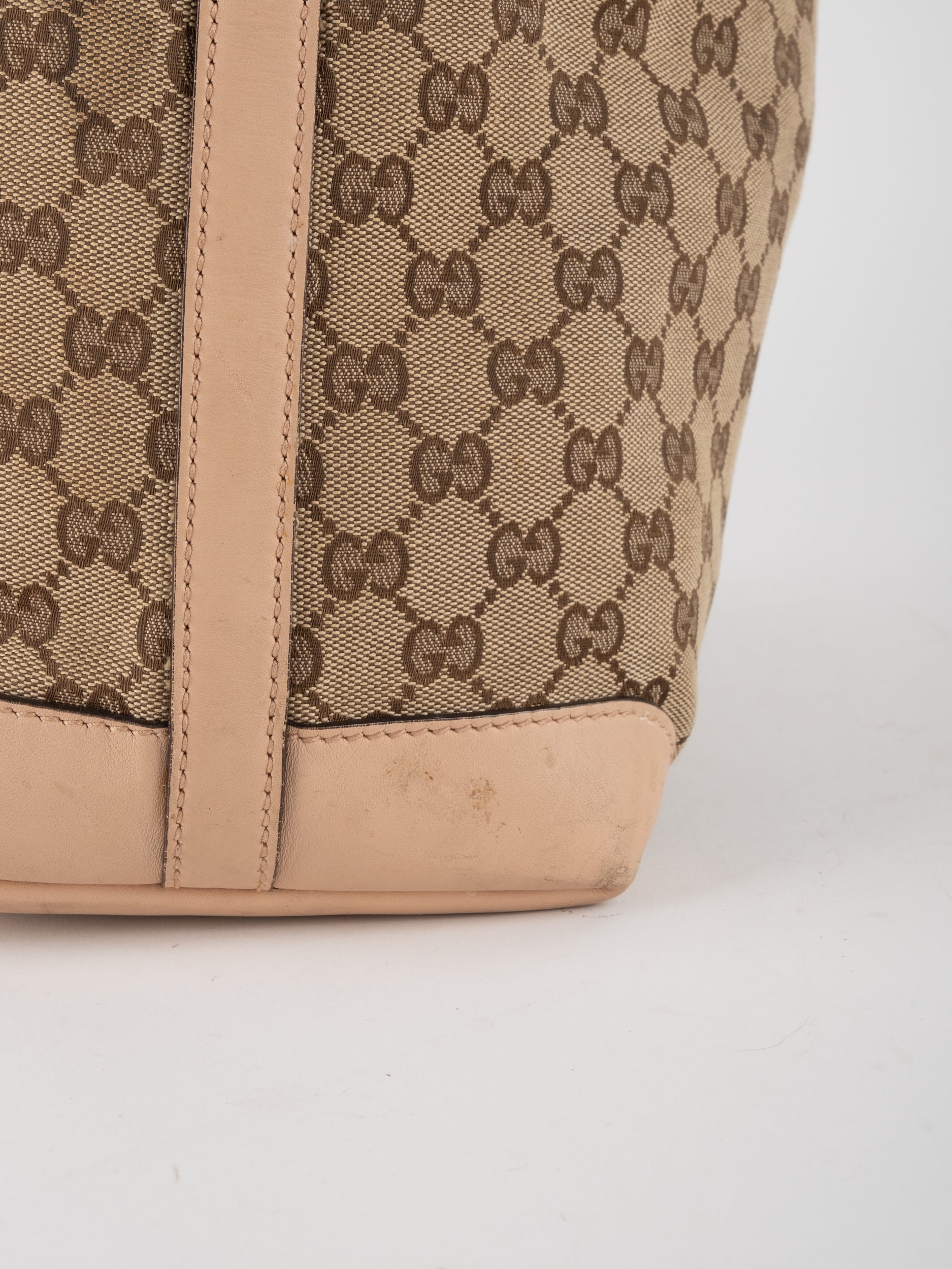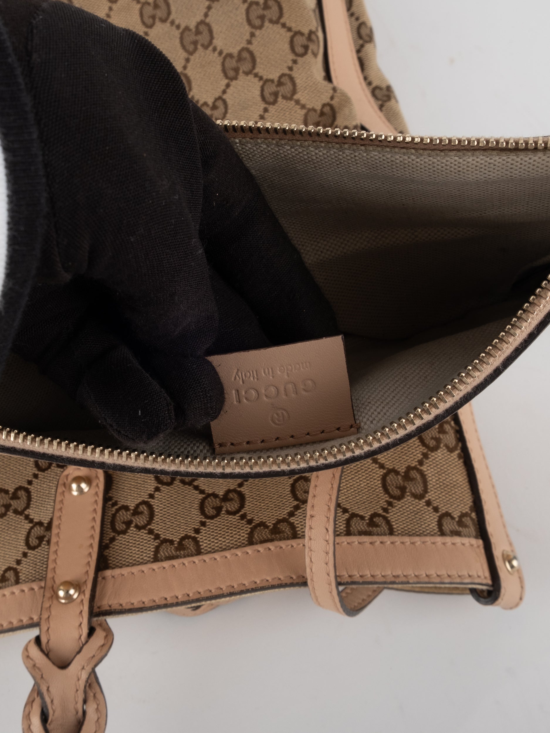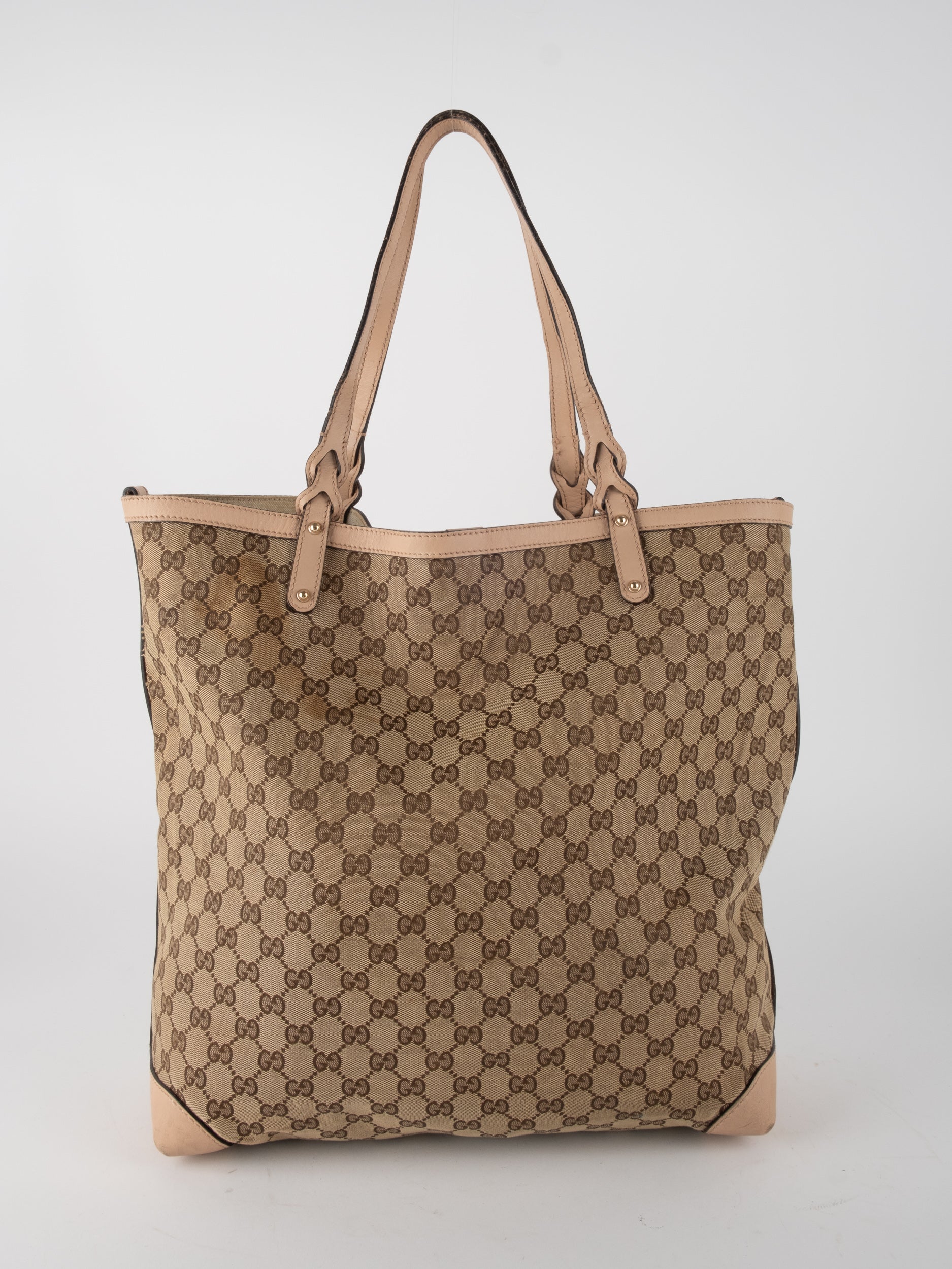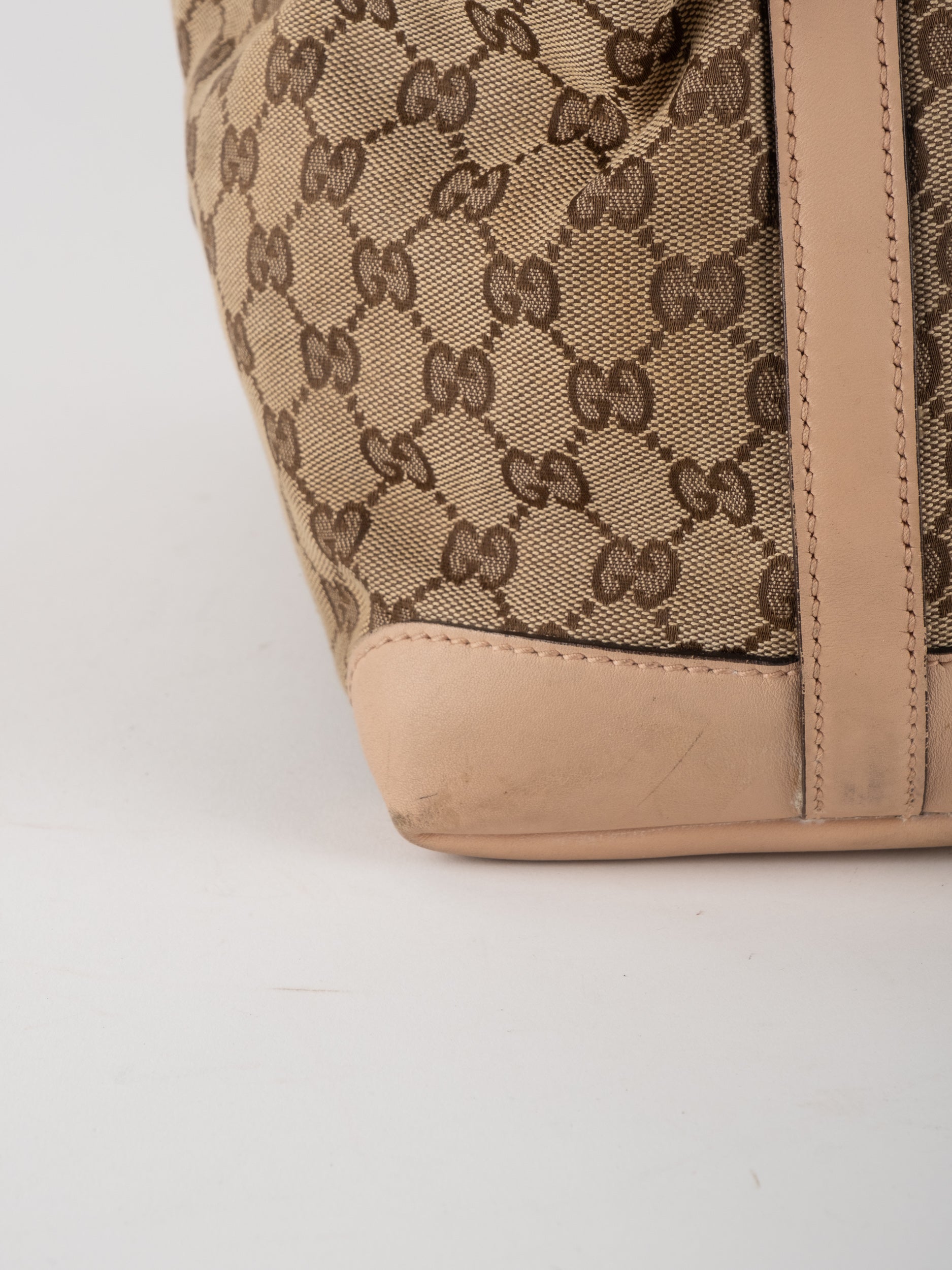 גוצ'י GUCCI וינטג' יד שנייה בדוגמת GG בגוון בז’ חם עם עיטורי עור בהיר ותיקון תואם נשלף. טוט קלאסי, מרווח ומדויק – כזה שנראה יוקרתי בלי להתאמץ ומשתלב מושלם עם לוק יומי אלגנטי.