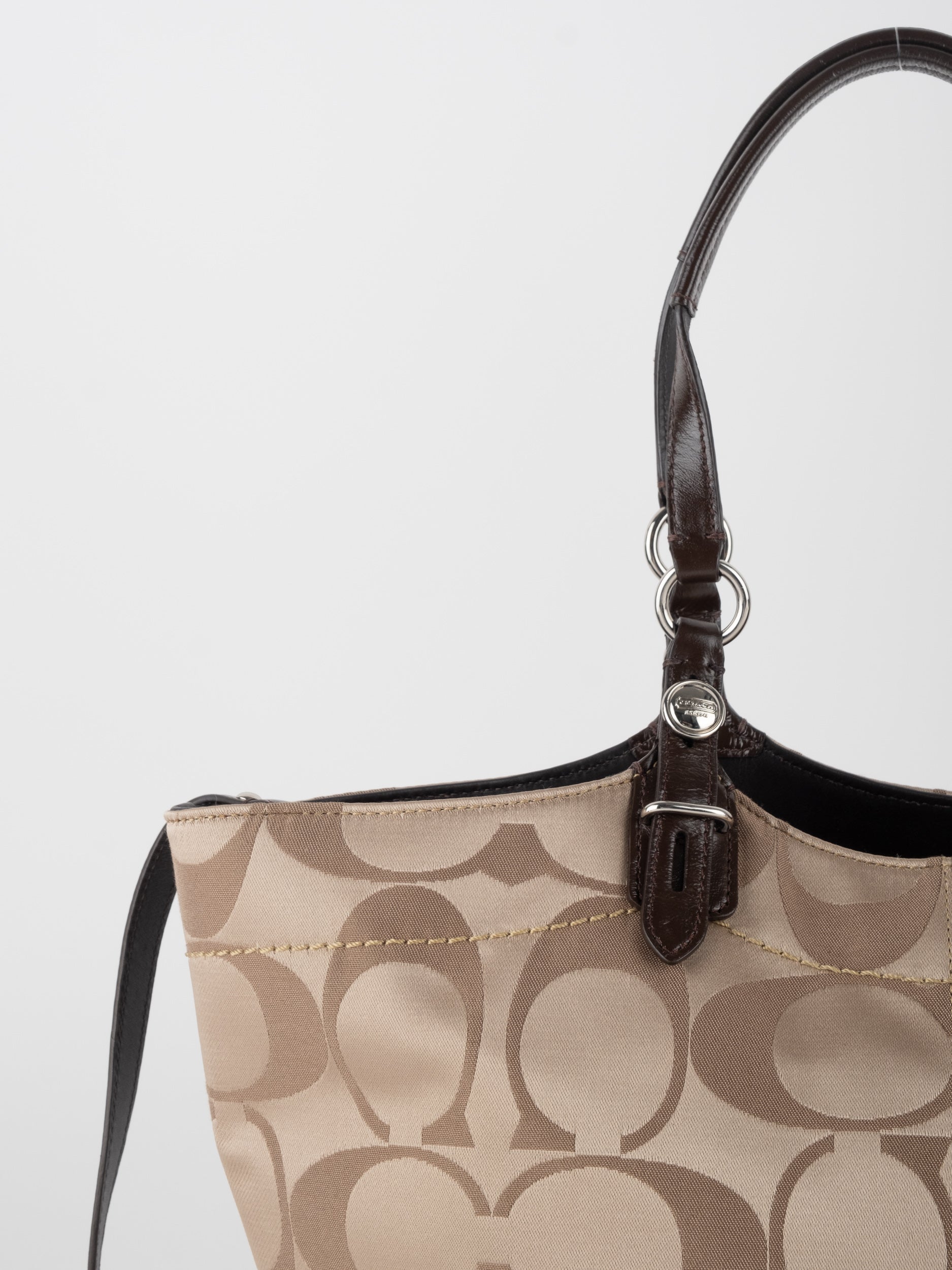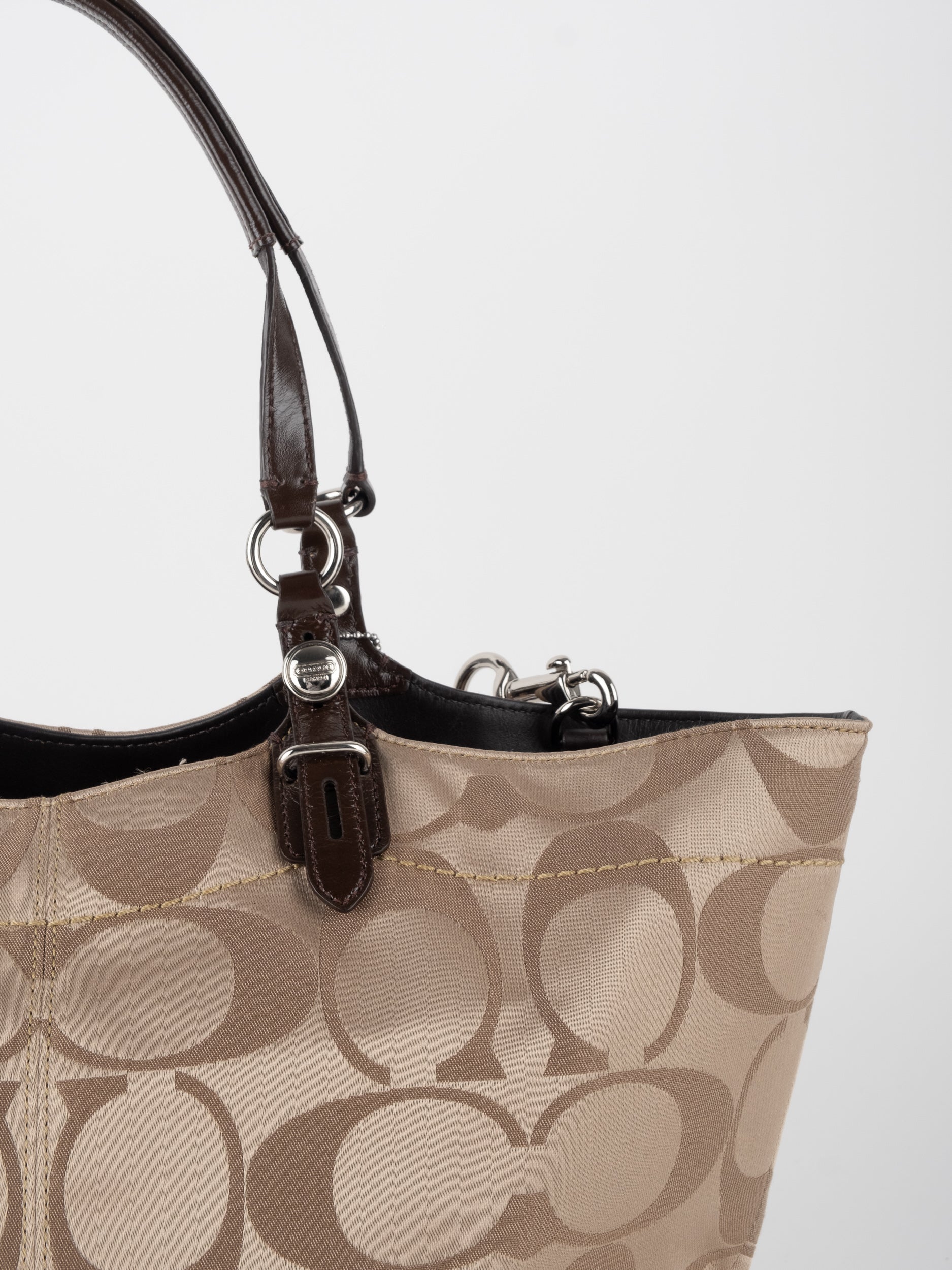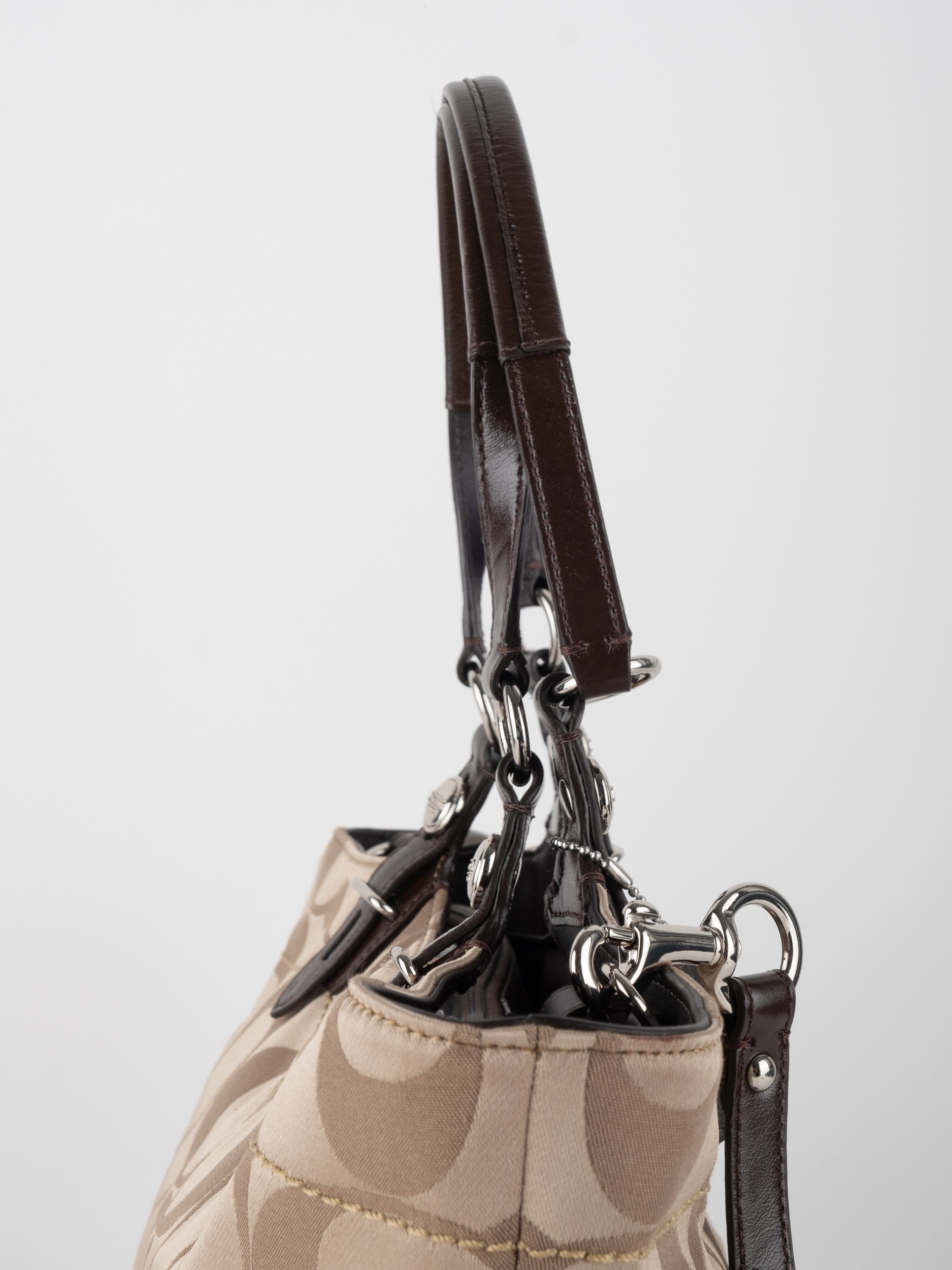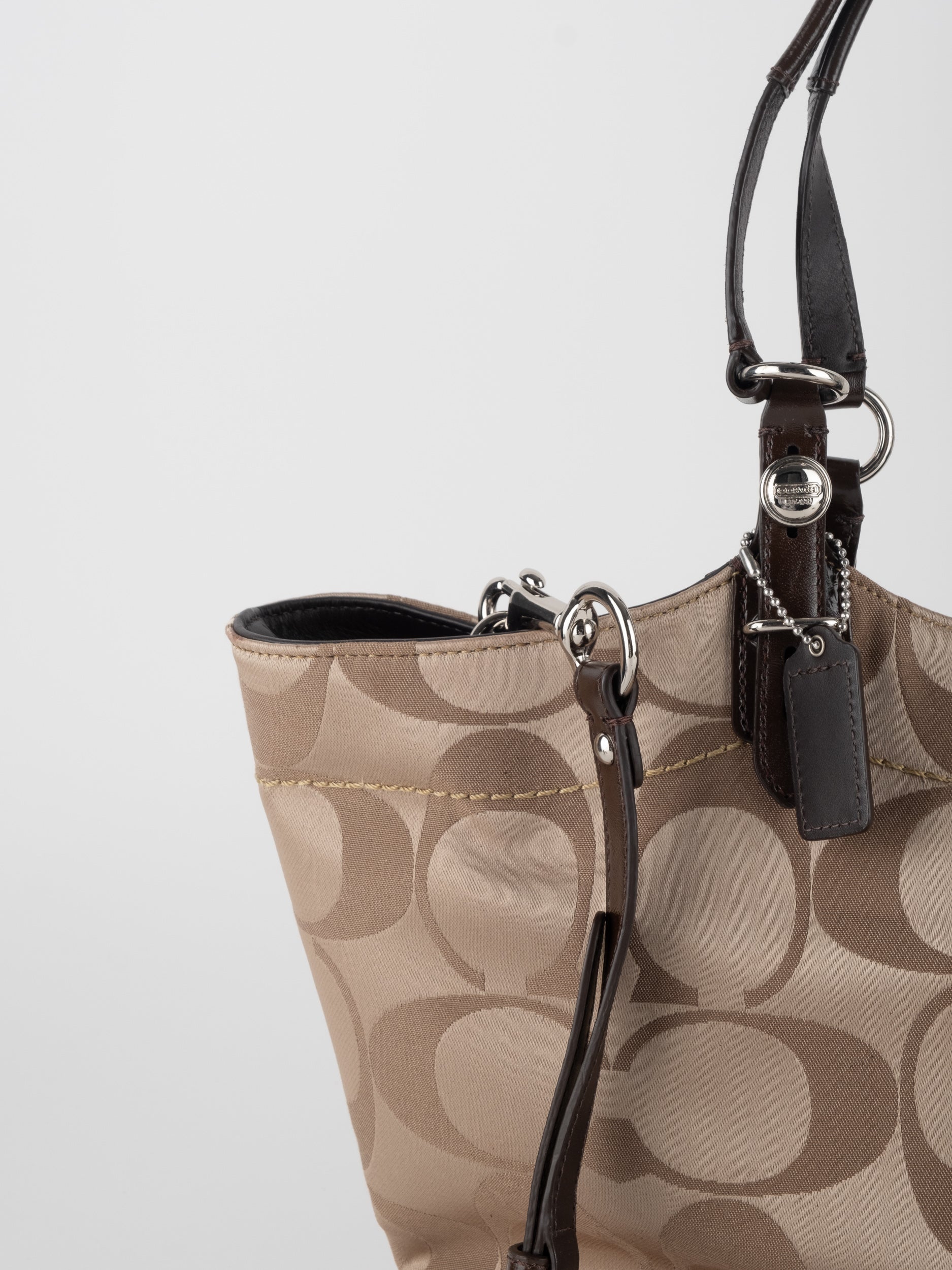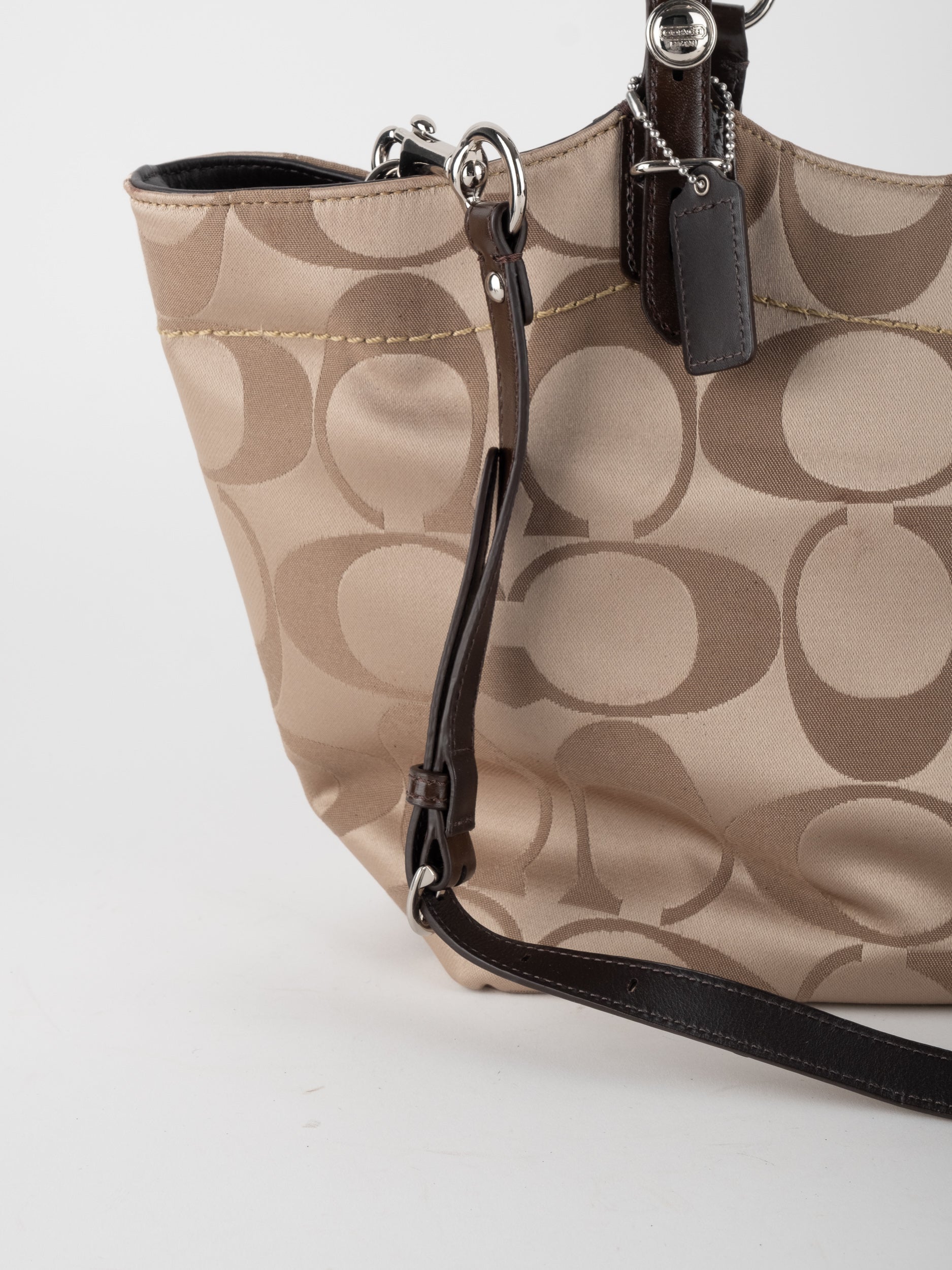 View Similar Productsקואץ' COACH וינטג' יד שנייה בדוגמת Signature בגווני בז’ וחום כהה, בעיצוב נשי ורך עם ידית קצרה ורצועת כתף ארוכה מתכווננת. תיק אלגנטי אך יומיומי, כזה שמרגיש קליל ונוח אבל עדיין מוקפד.