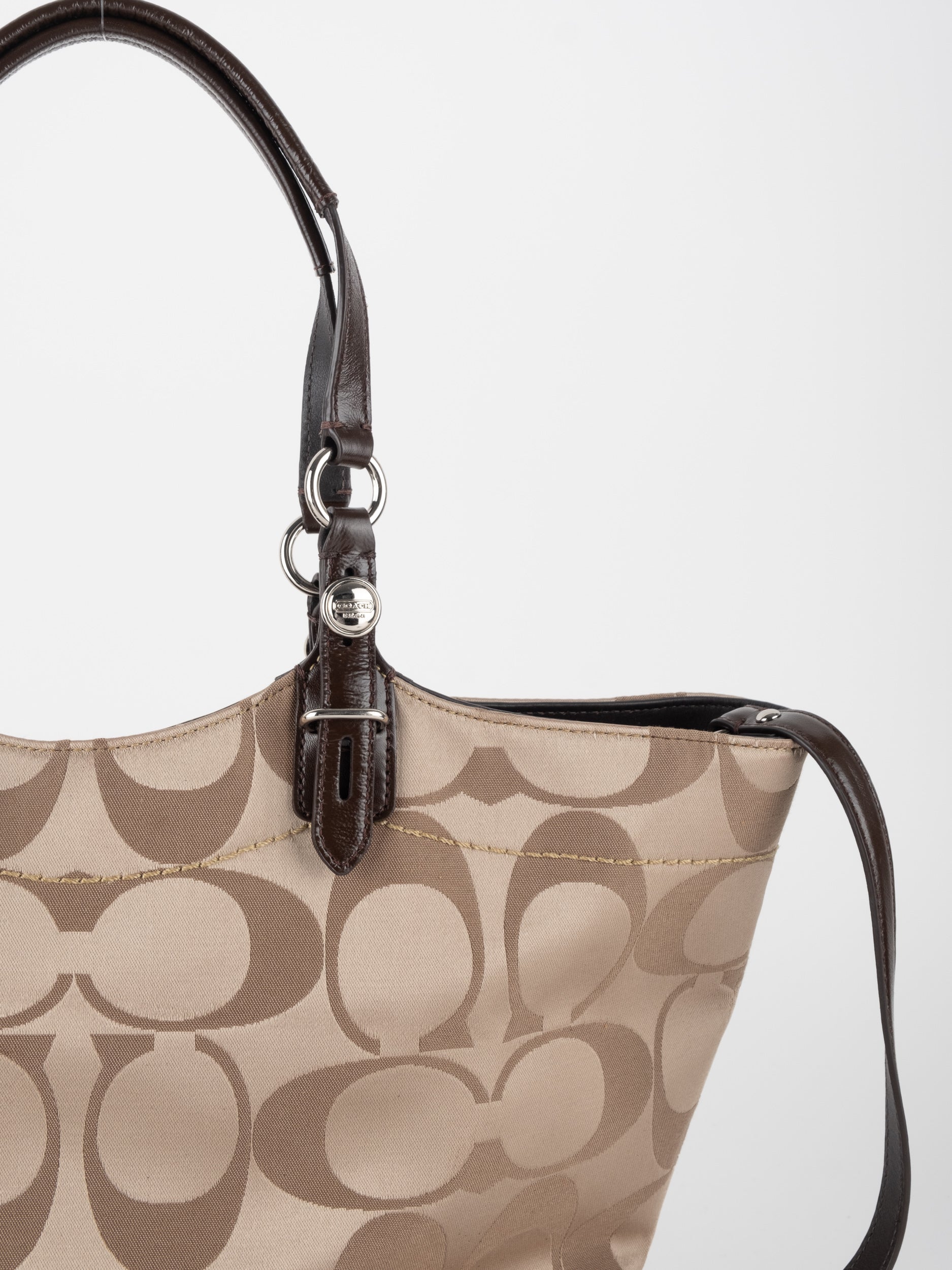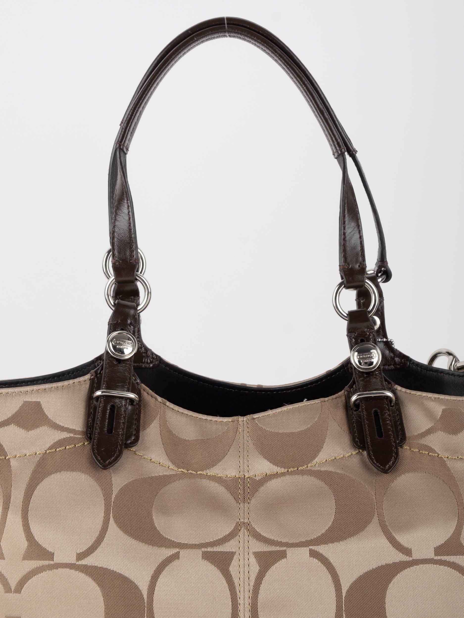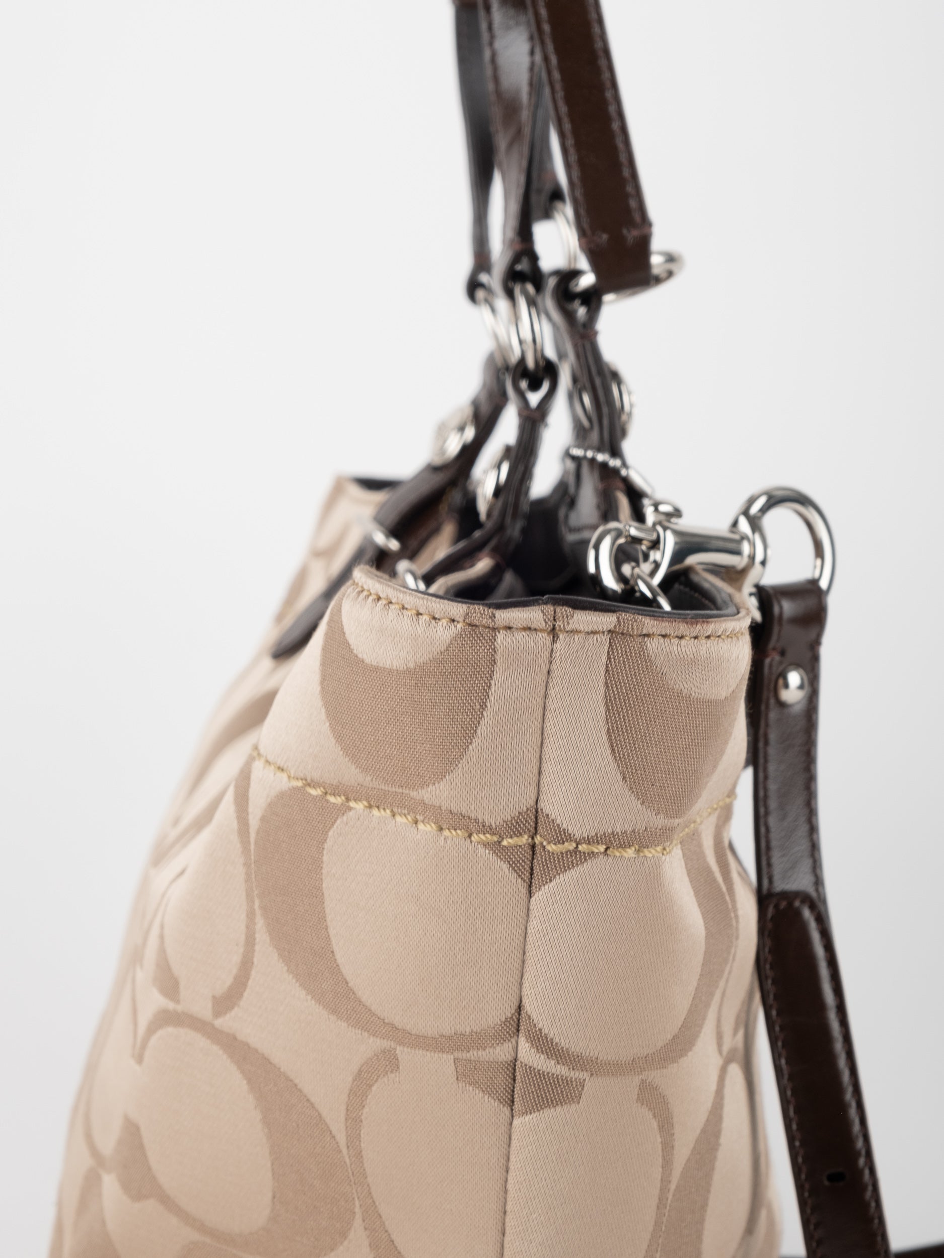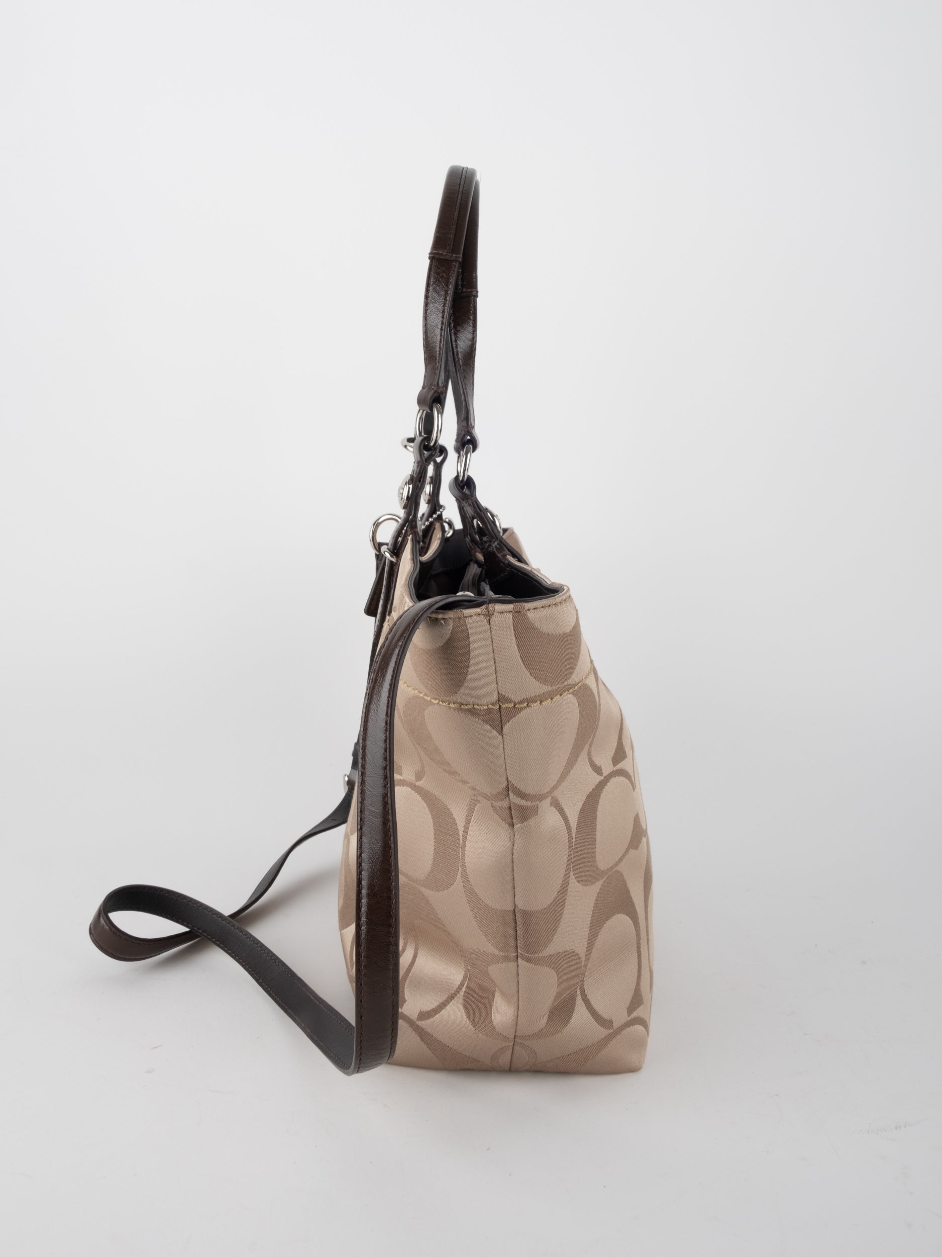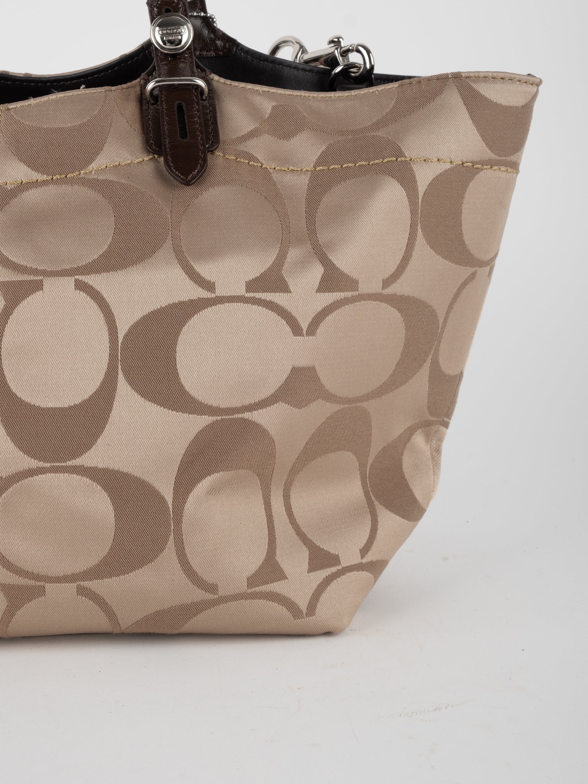 View Similar Productsקואץ' COACH וינטג' יד שנייה בדוגמת Signature בגווני בז’ וחום כהה, בעיצוב נשי ורך עם ידית קצרה ורצועת כתף ארוכה מתכווננת. תיק אלגנטי אך יומיומי, כזה שמרגיש קליל ונוח אבל עדיין מוקפד.