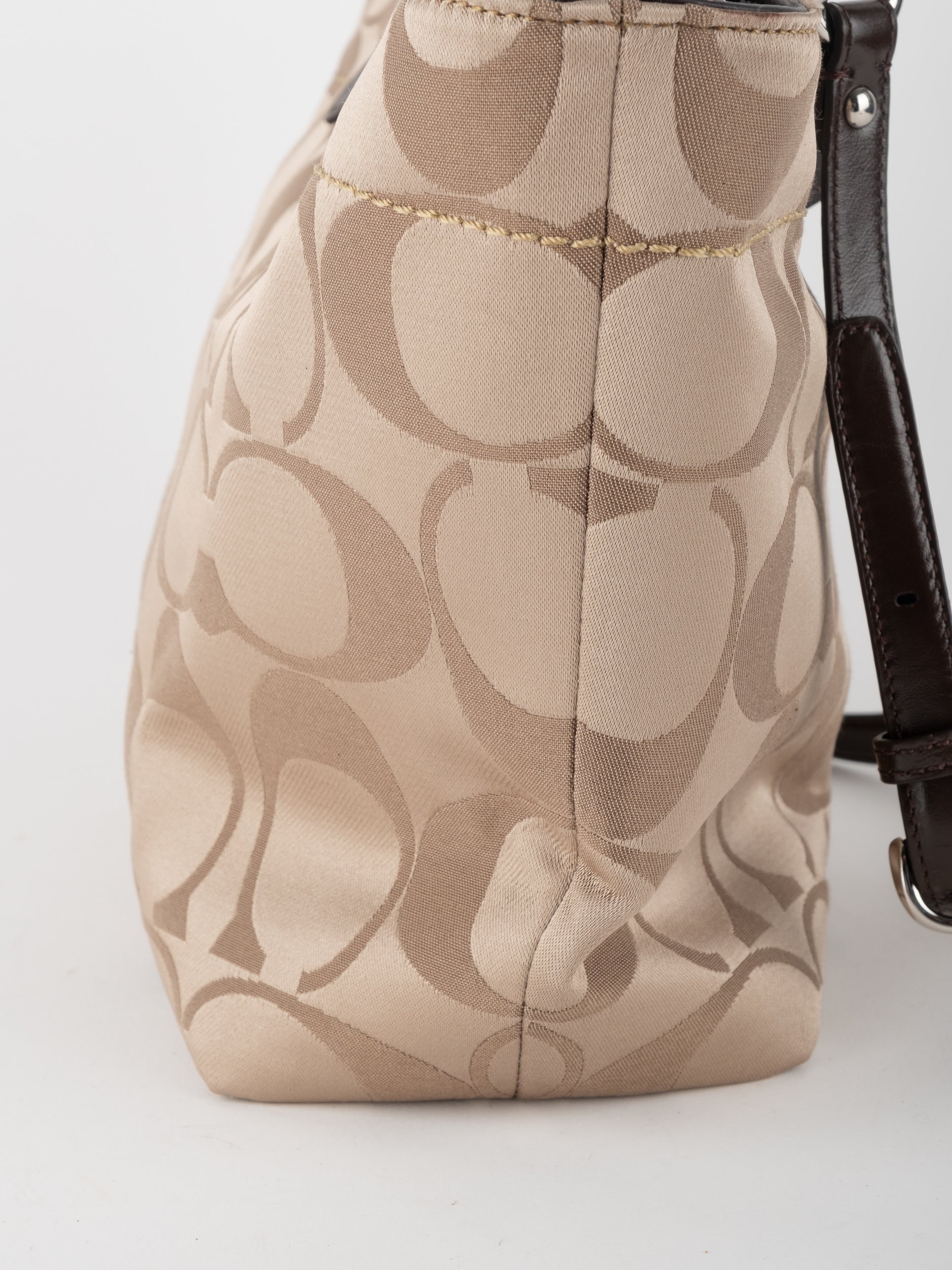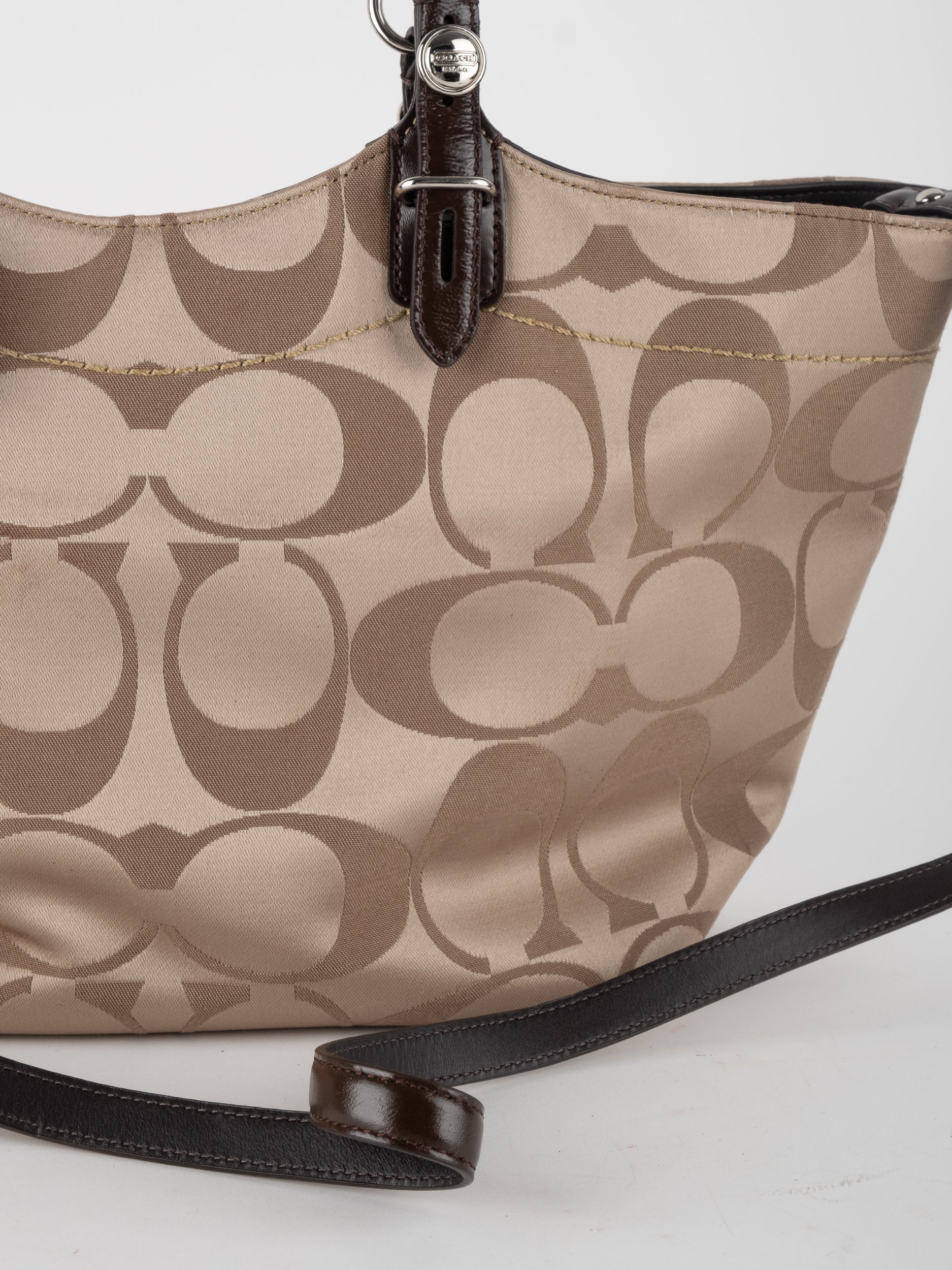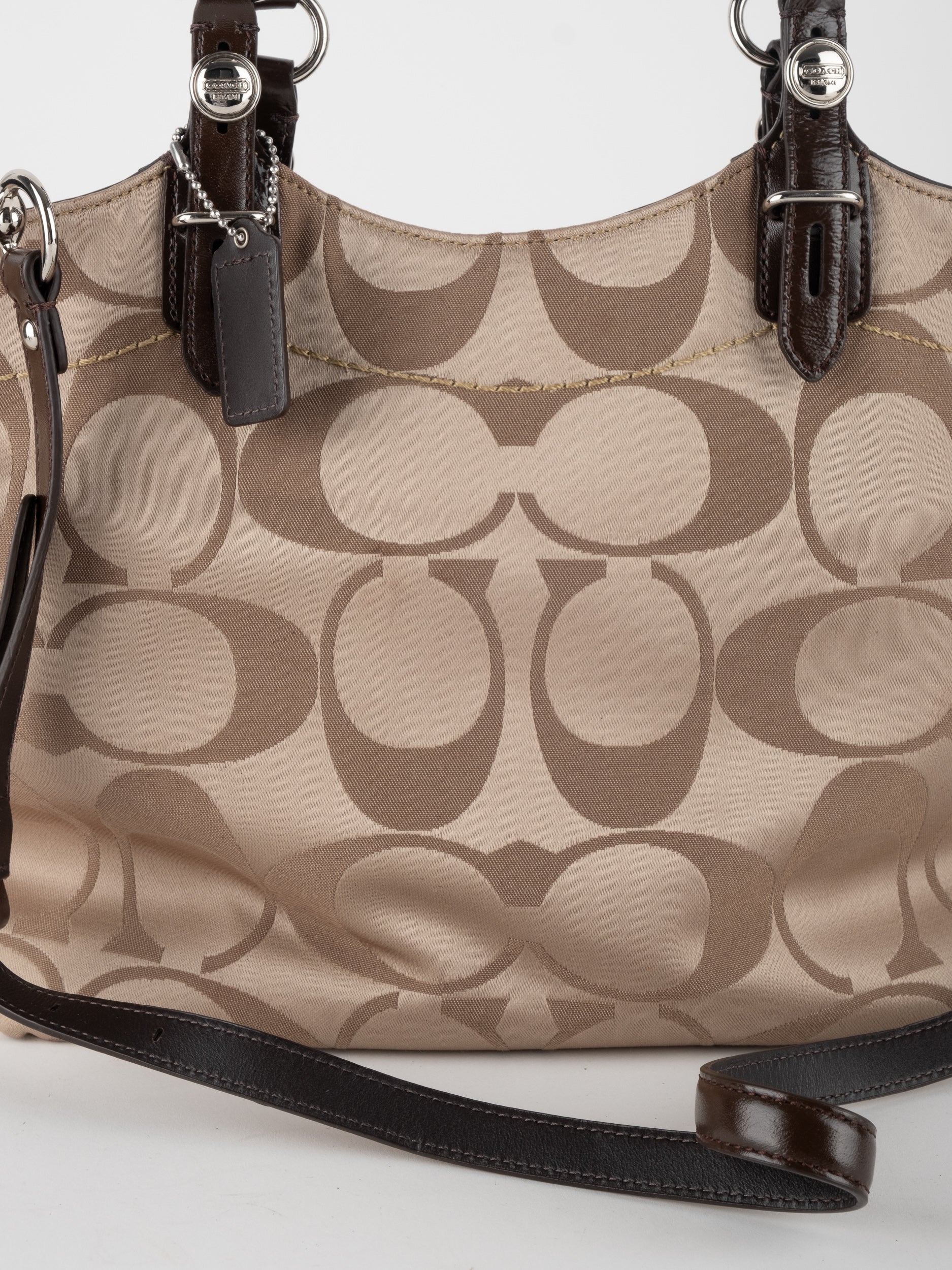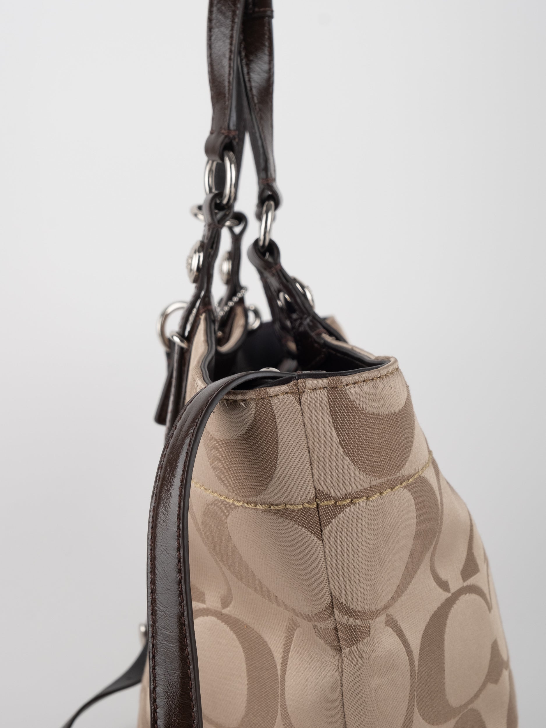 View Similar Productsקואץ' COACH וינטג' יד שנייה בדוגמת Signature בגווני בז’ וחום כהה, בעיצוב נשי ורך עם ידית קצרה ורצועת כתף ארוכה מתכווננת. תיק אלגנטי אך יומיומי, כזה שמרגיש קליל ונוח אבל עדיין מוקפד.