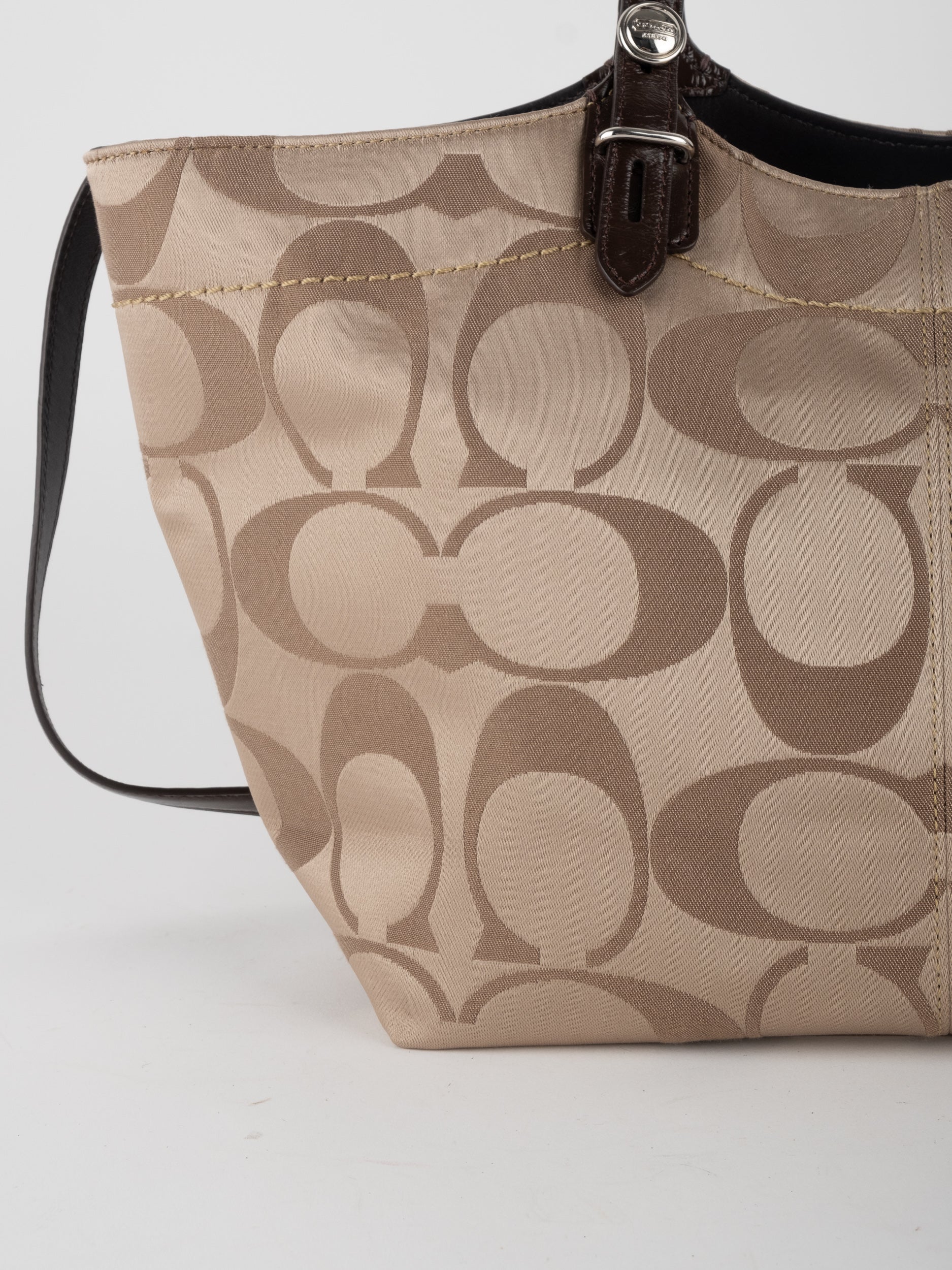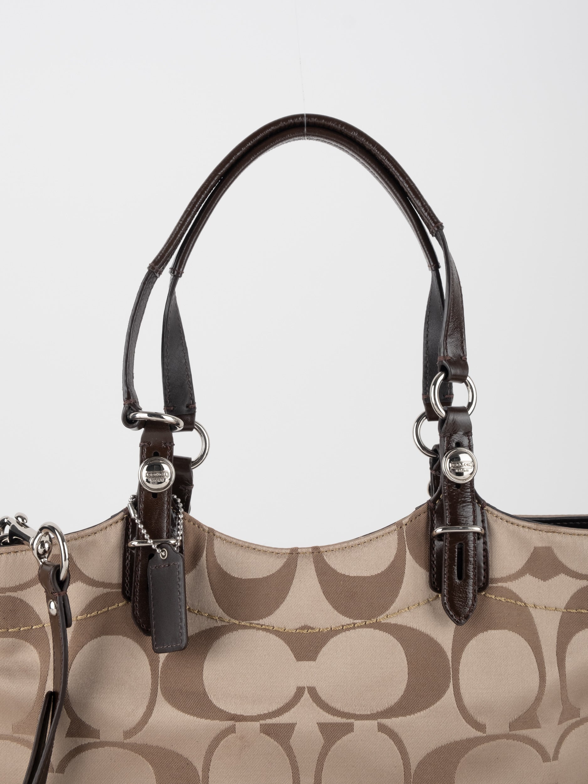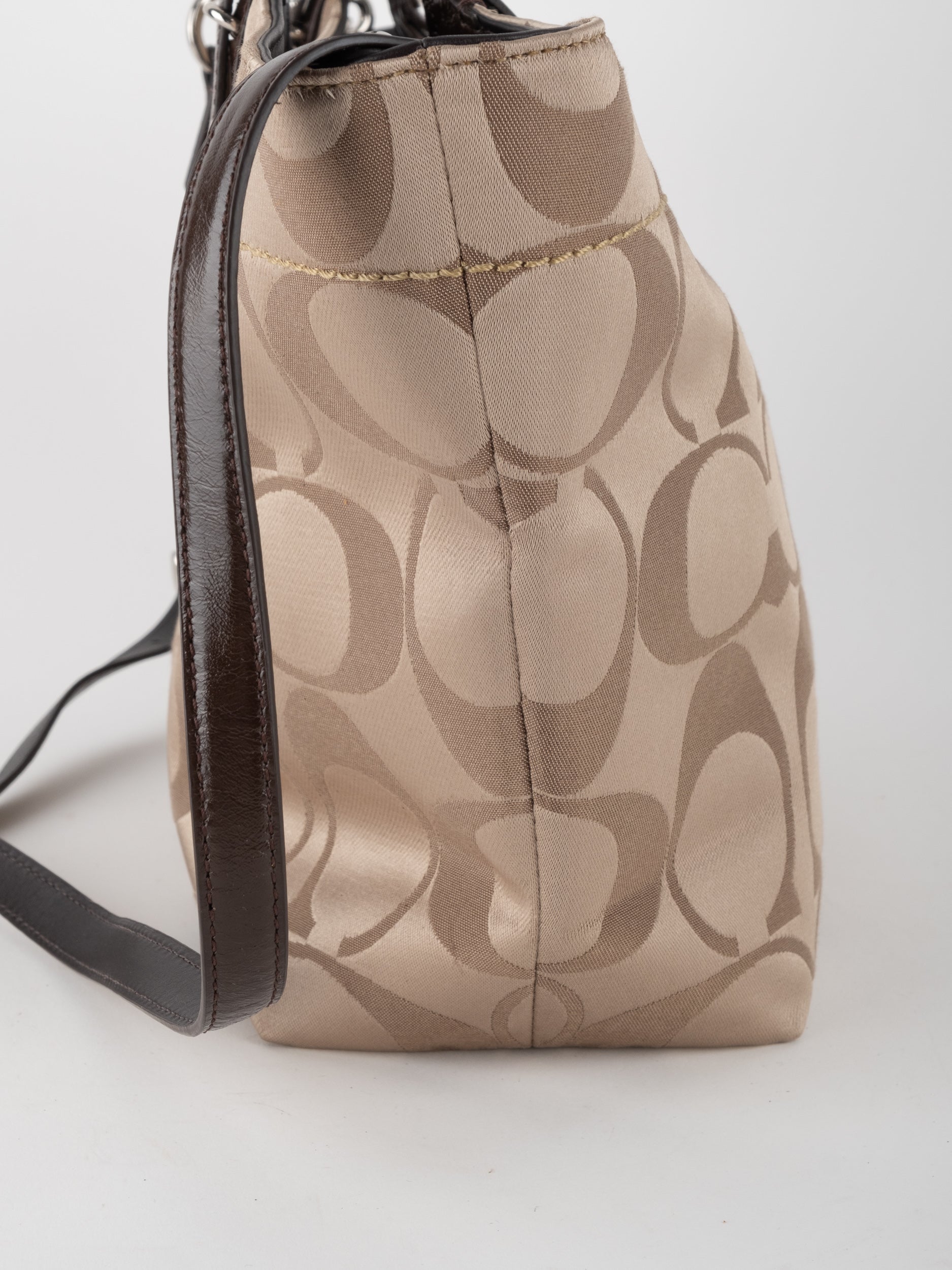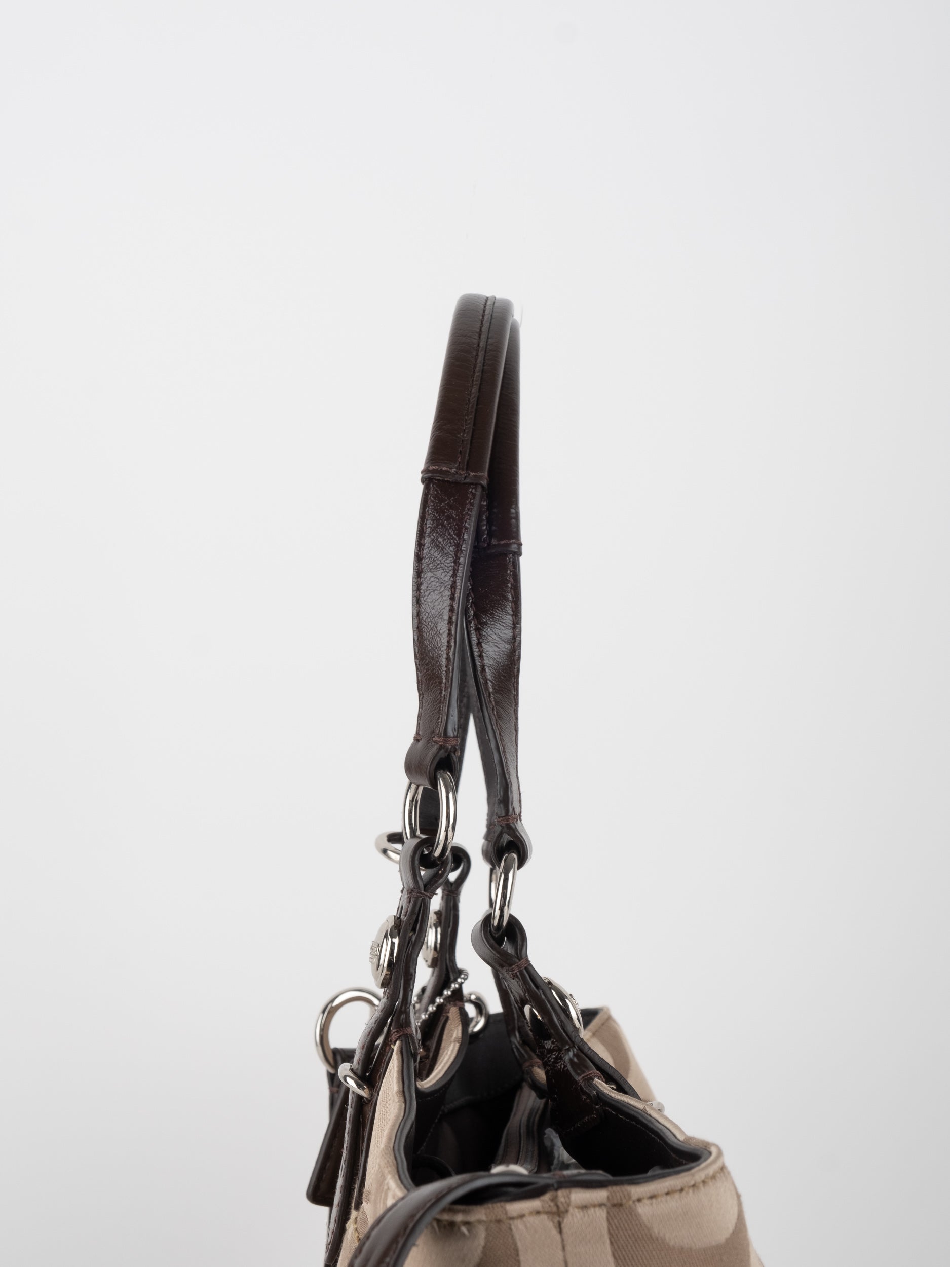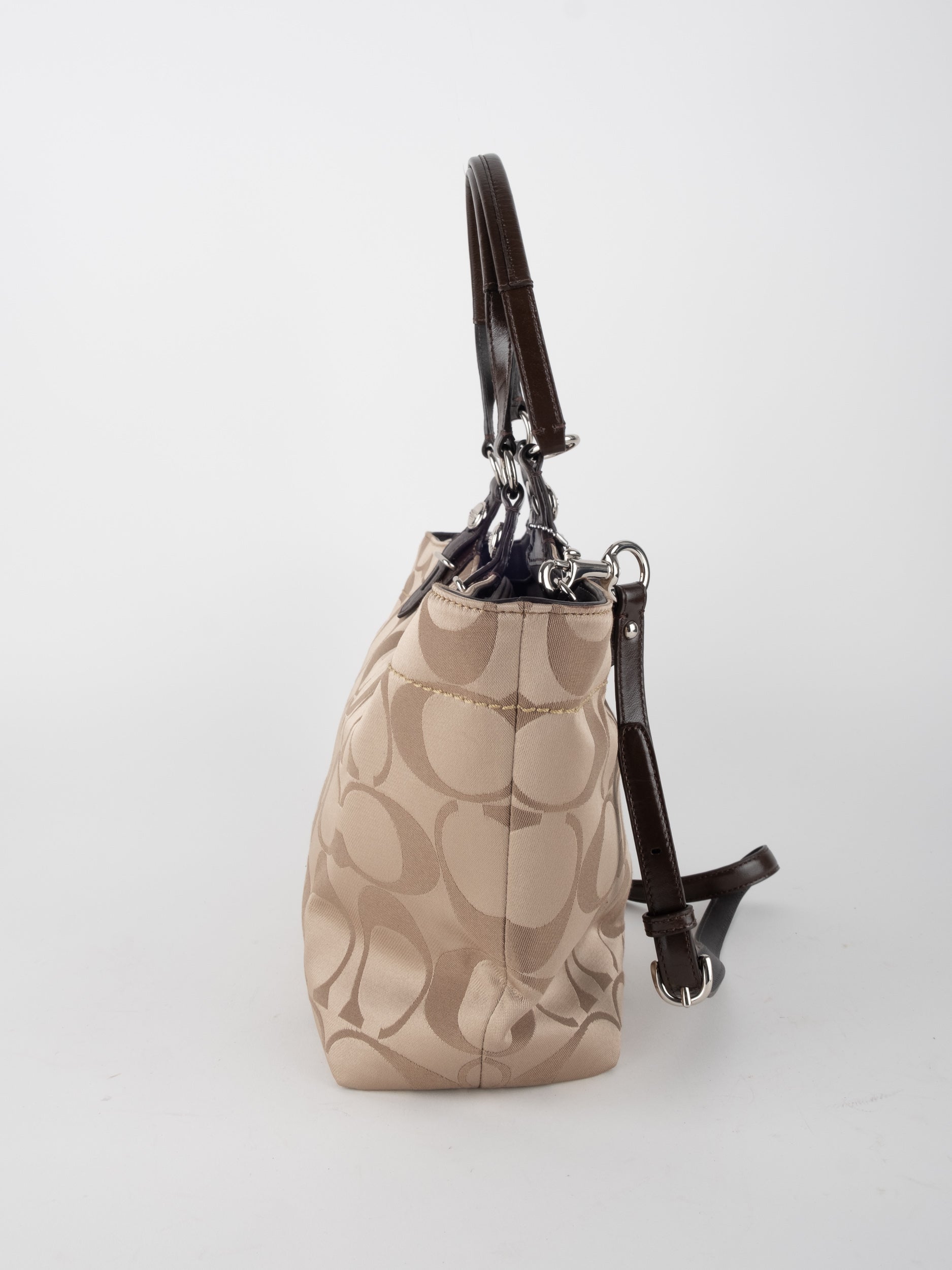 View Similar Productsקואץ' COACH וינטג' יד שנייה בדוגמת Signature בגווני בז’ וחום כהה, בעיצוב נשי ורך עם ידית קצרה ורצועת כתף ארוכה מתכווננת. תיק אלגנטי אך יומיומי, כזה שמרגיש קליל ונוח אבל עדיין מוקפד.