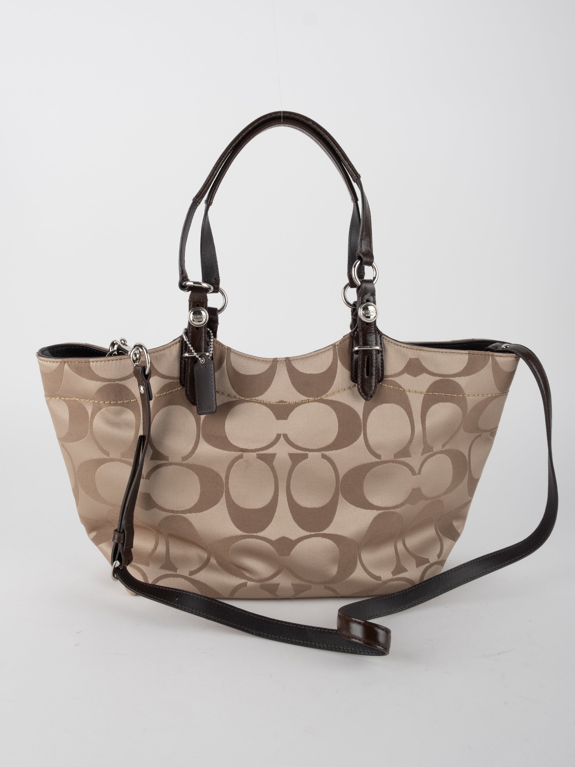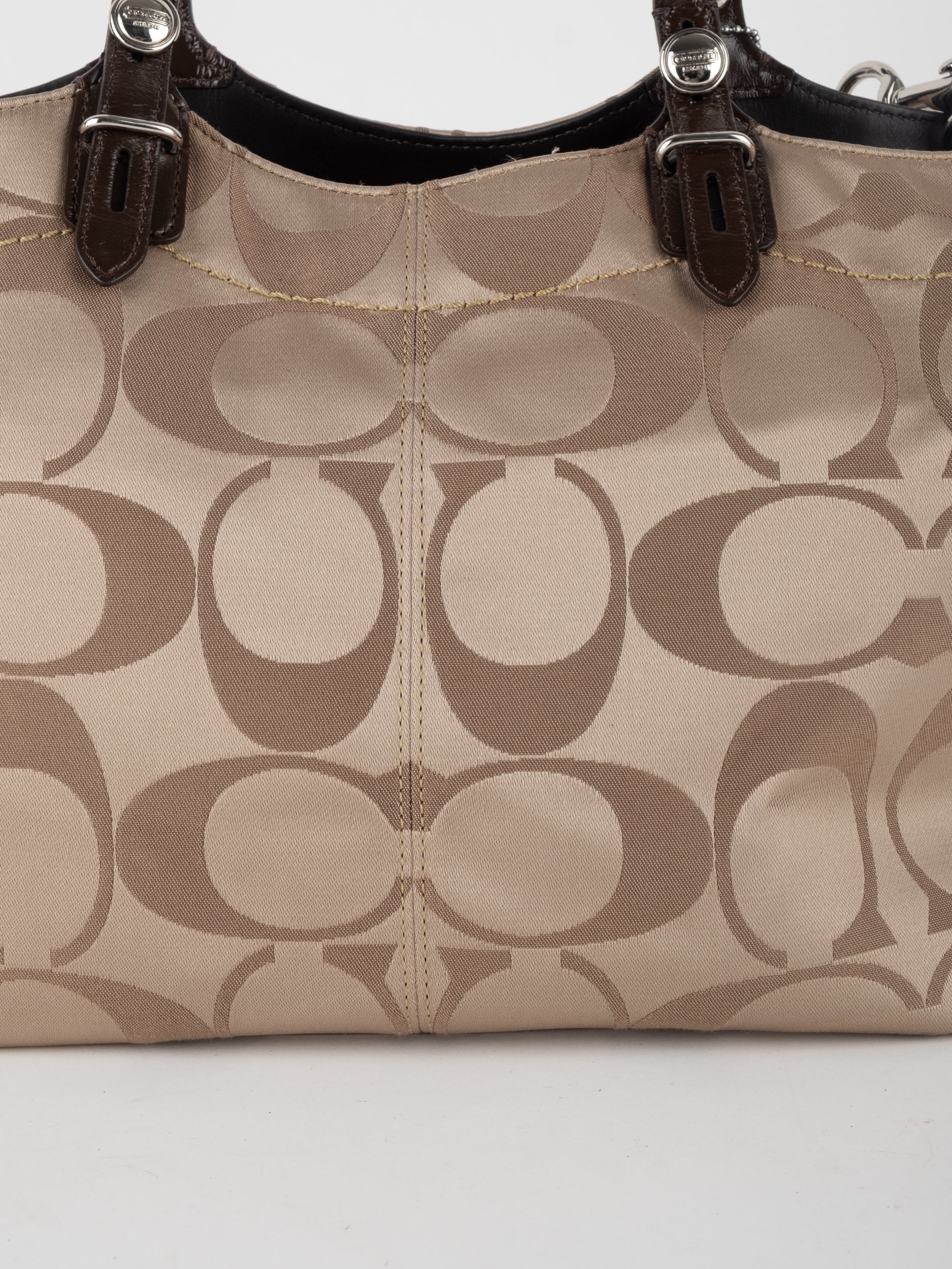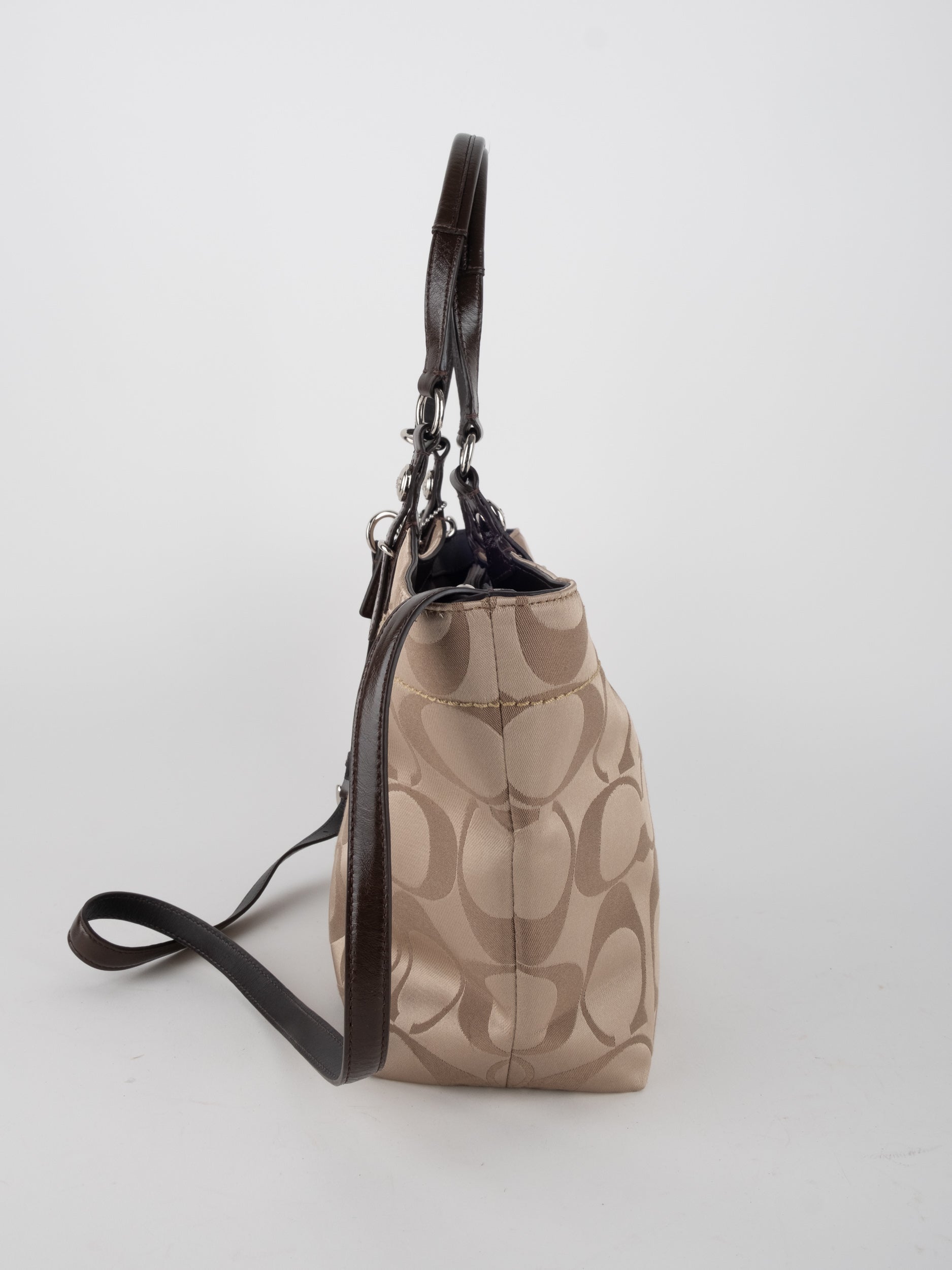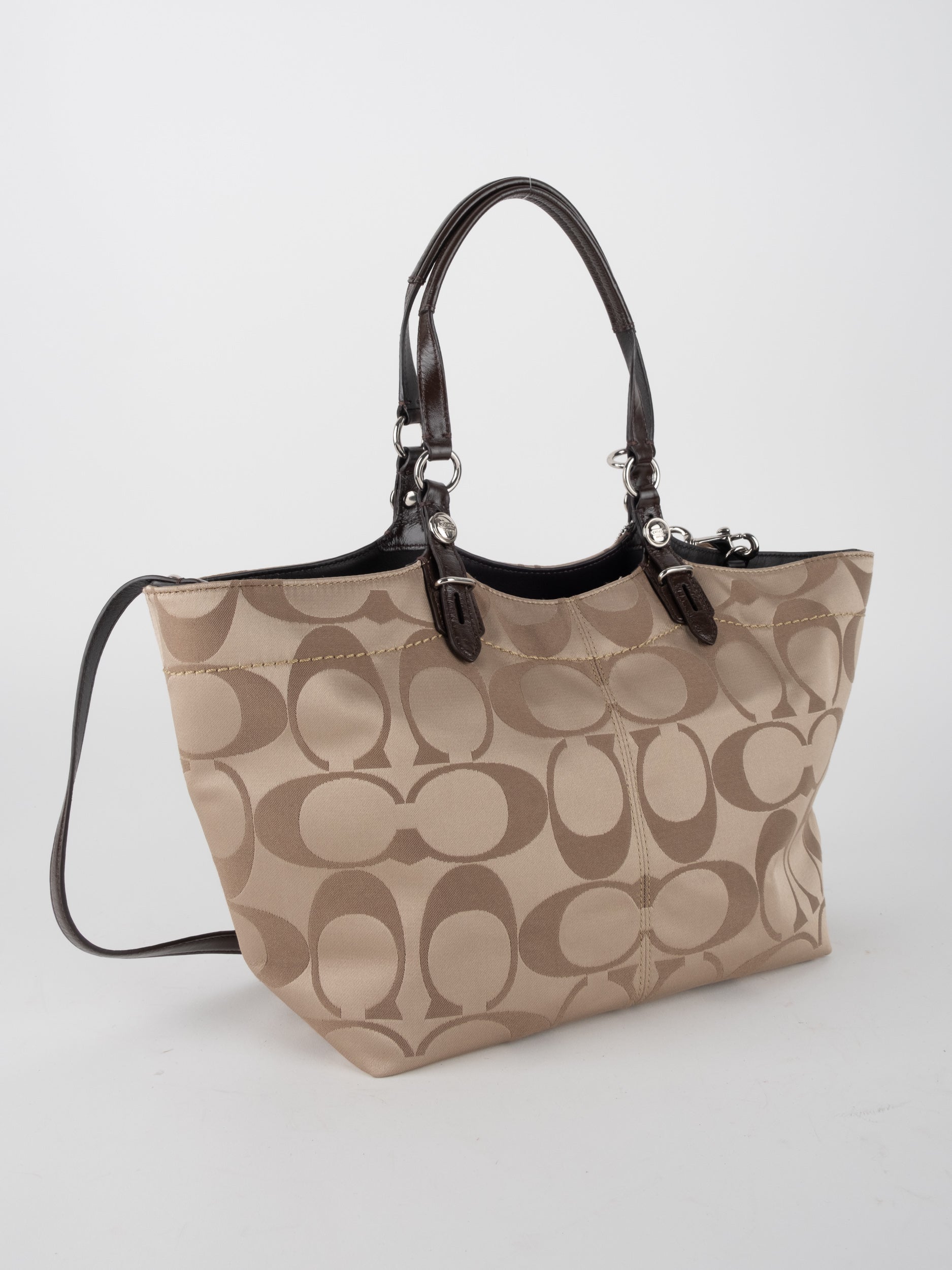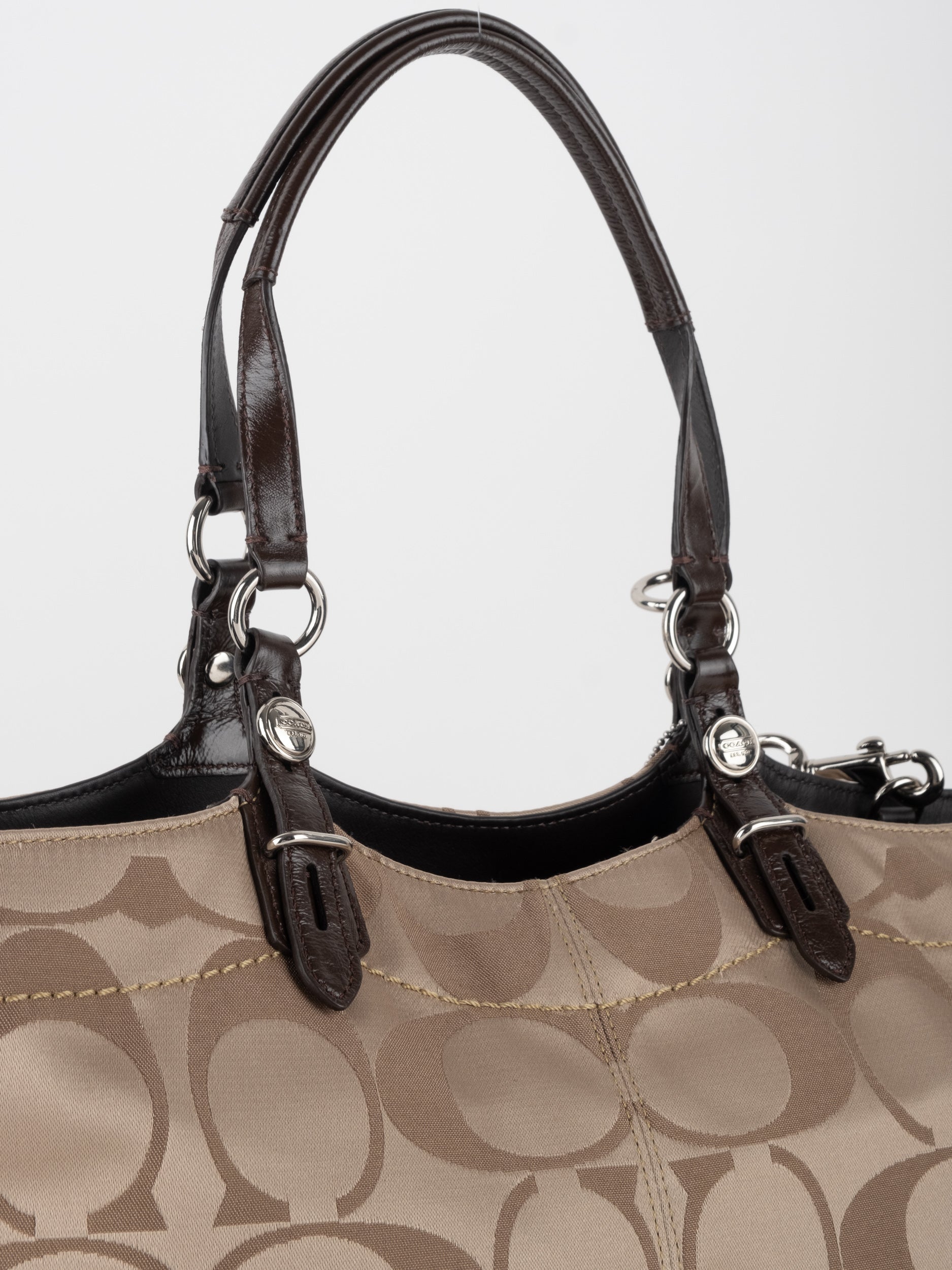 View Similar Productsקואץ' COACH וינטג' יד שנייה בדוגמת Signature בגווני בז’ וחום כהה, בעיצוב נשי ורך עם ידית קצרה ורצועת כתף ארוכה מתכווננת. תיק אלגנטי אך יומיומי, כזה שמרגיש קליל ונוח אבל עדיין מוקפד.