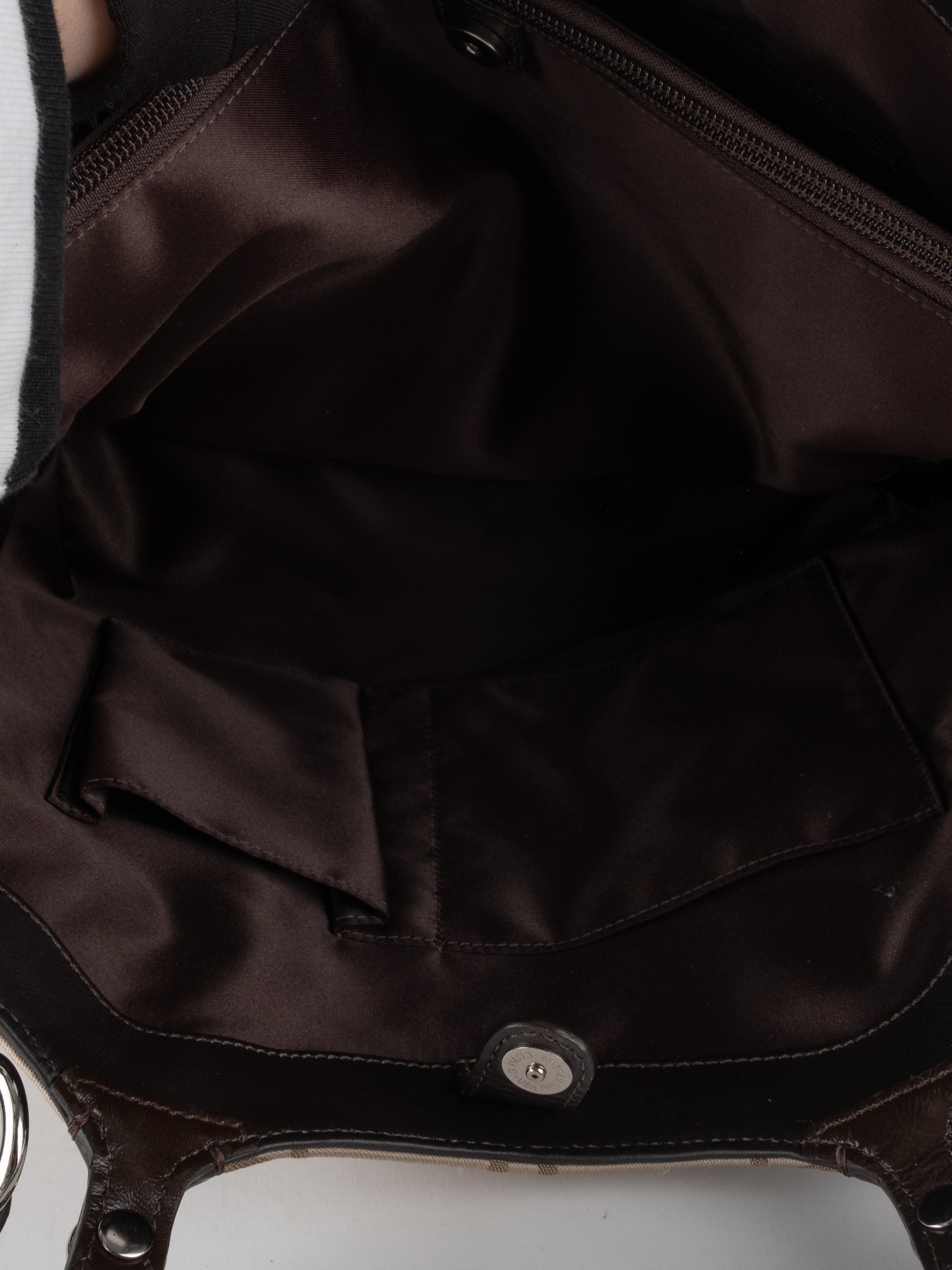 התיק עשוי קנבס בדוגמת Signature בגווני בז’ עם עיטורי עור חום כהה. כולל ידית עליונה ורצועת כתף ארוכה, סגירת רוכסן עליונה וחלל פנימי מרווח עם כיסים פנימיים. גודל אידיאלי ליום עבודה או יציאה יומיומית.