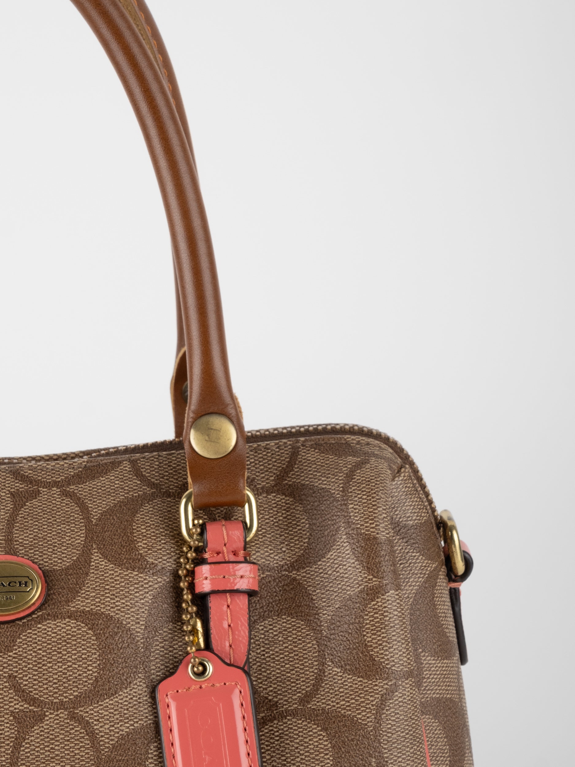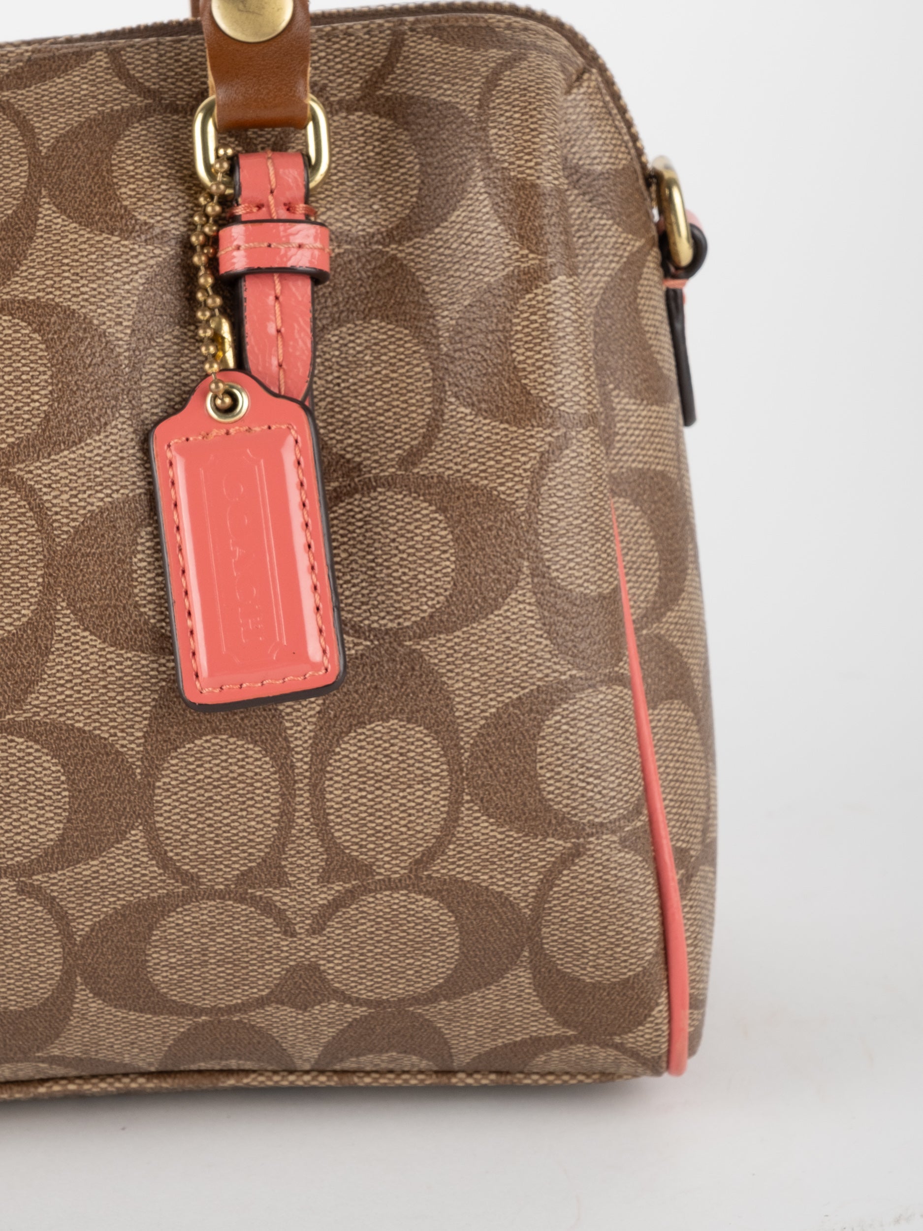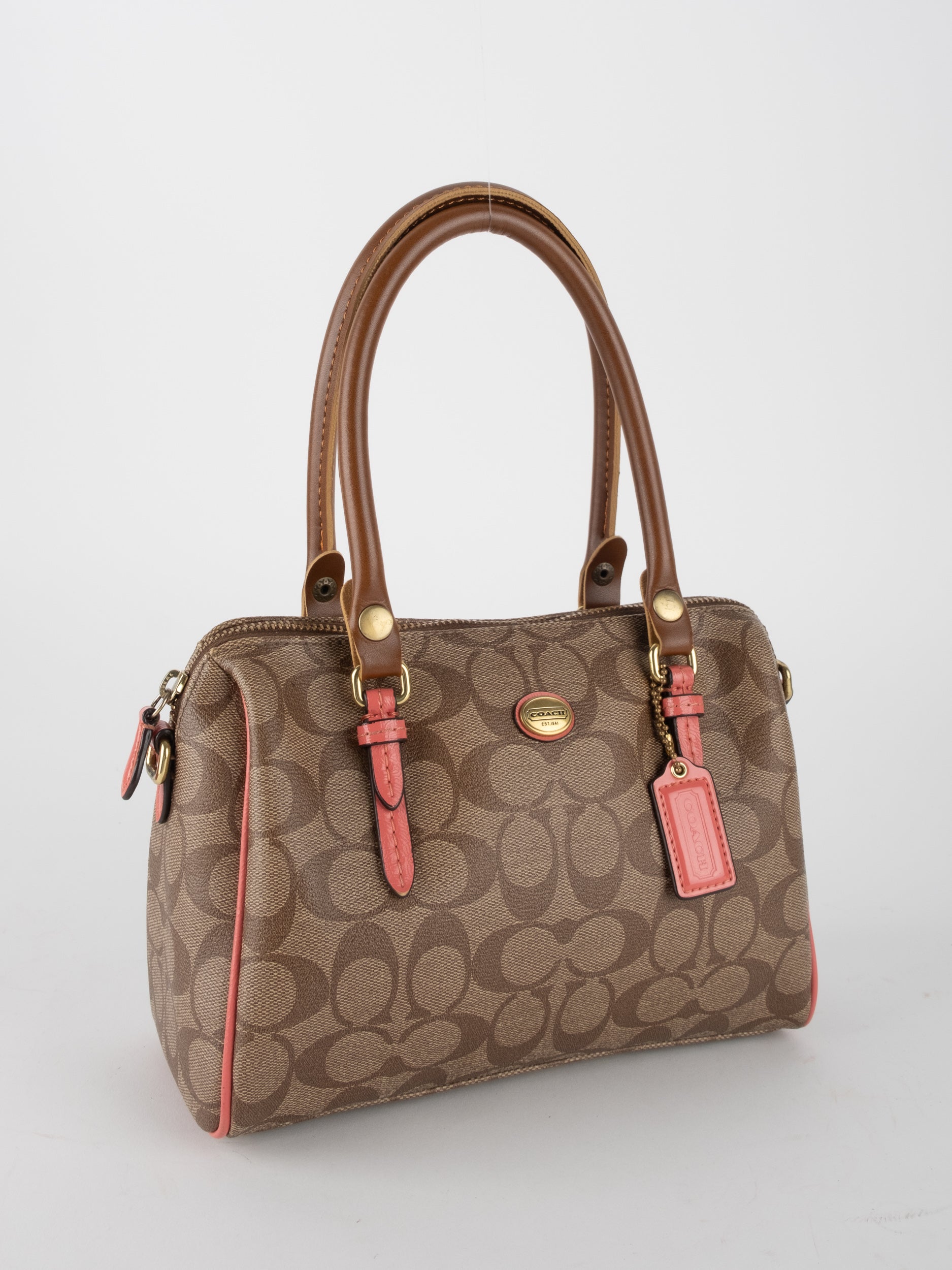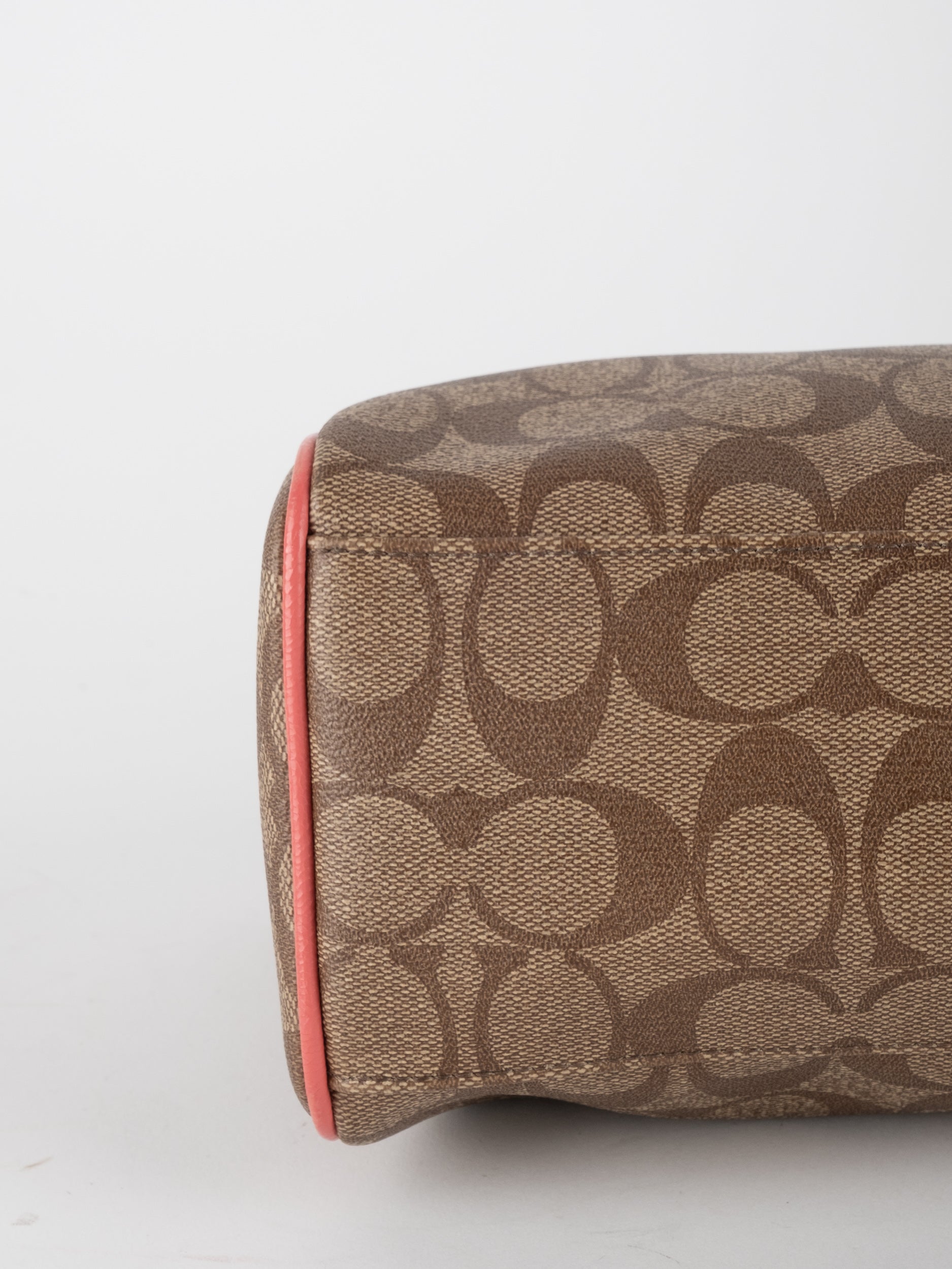 COACH Signature Satchel Brown with Coral Details