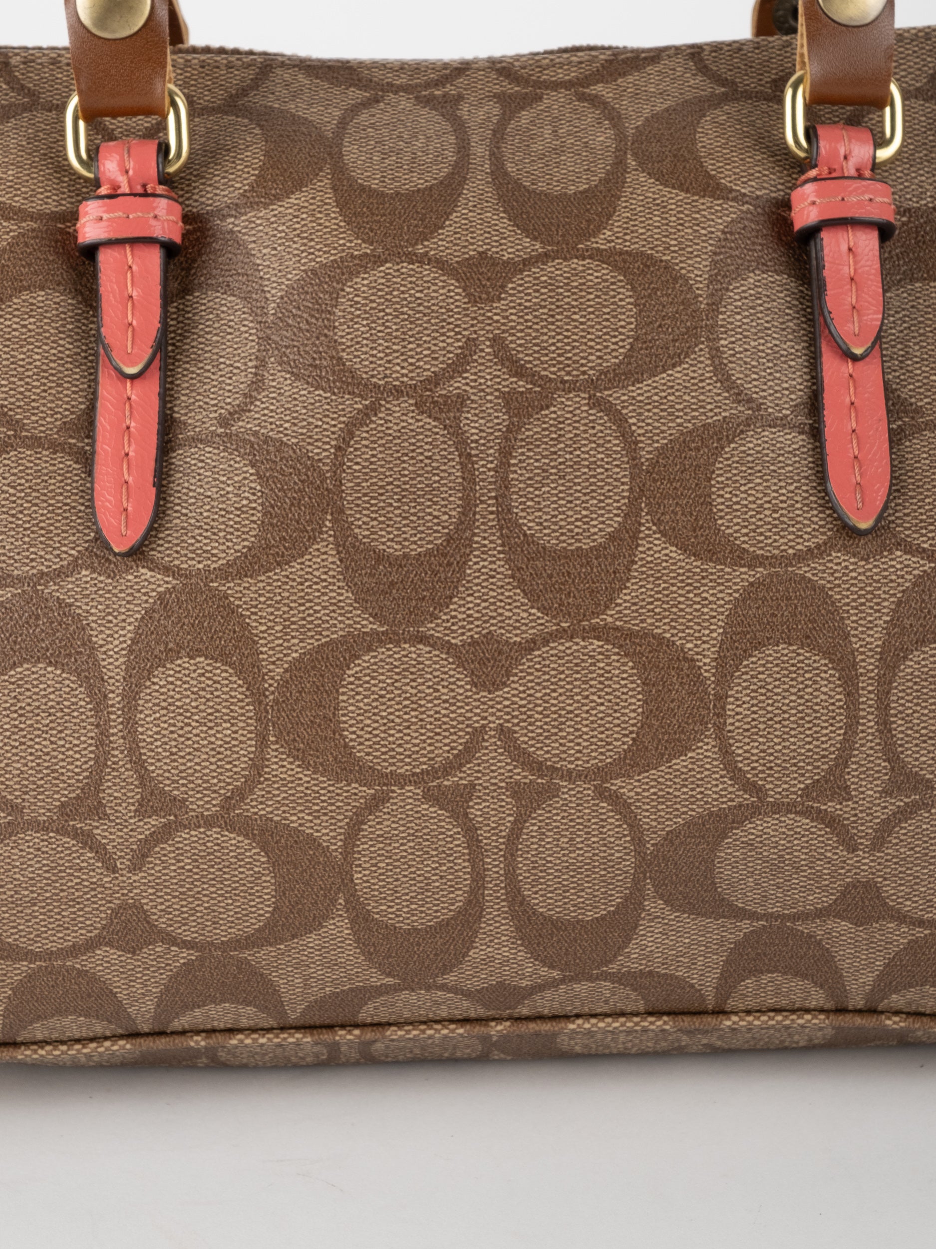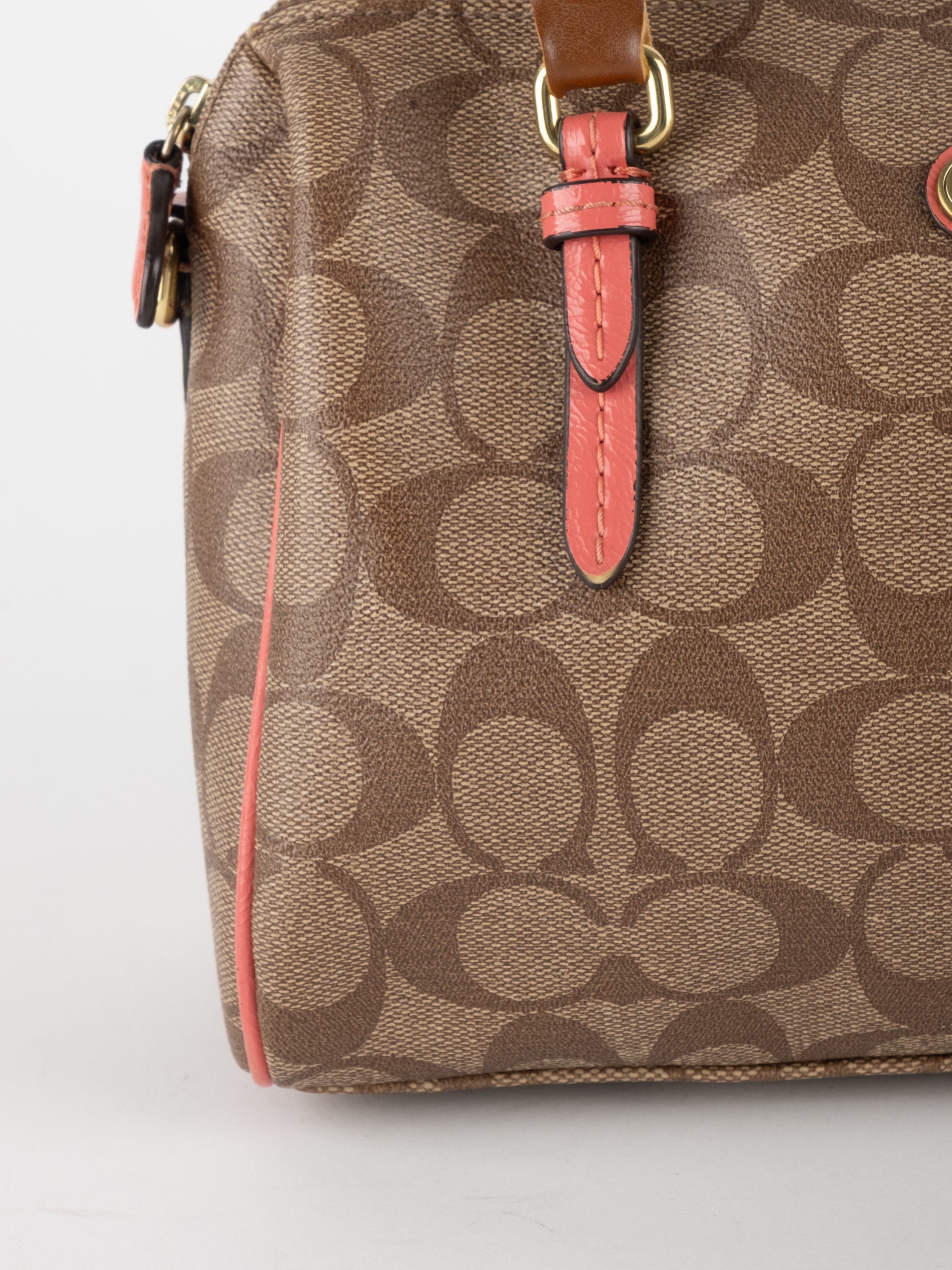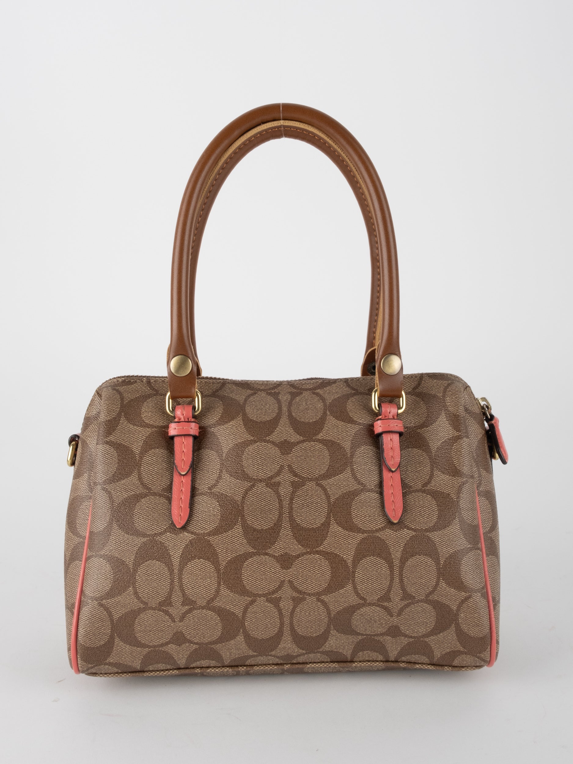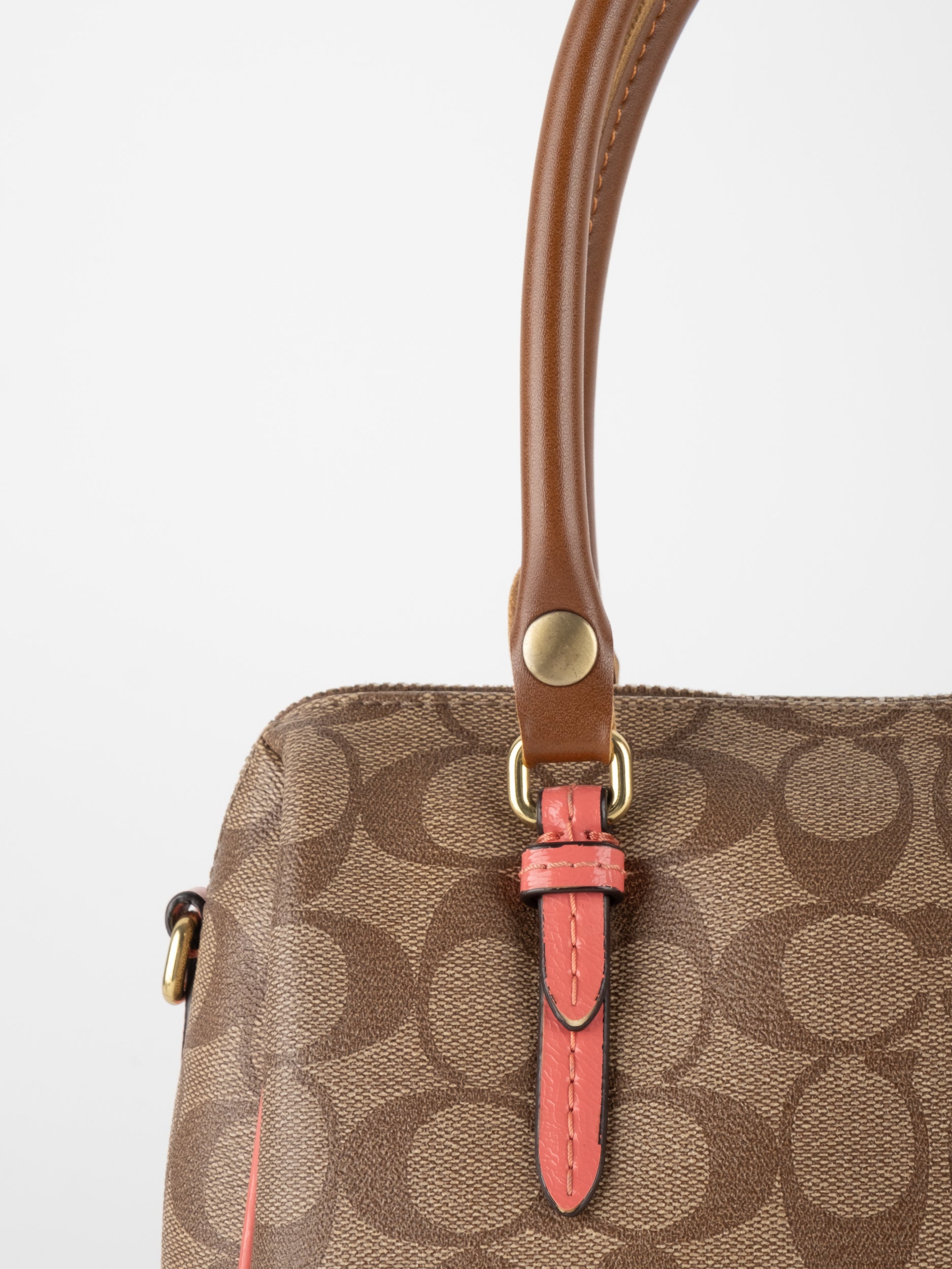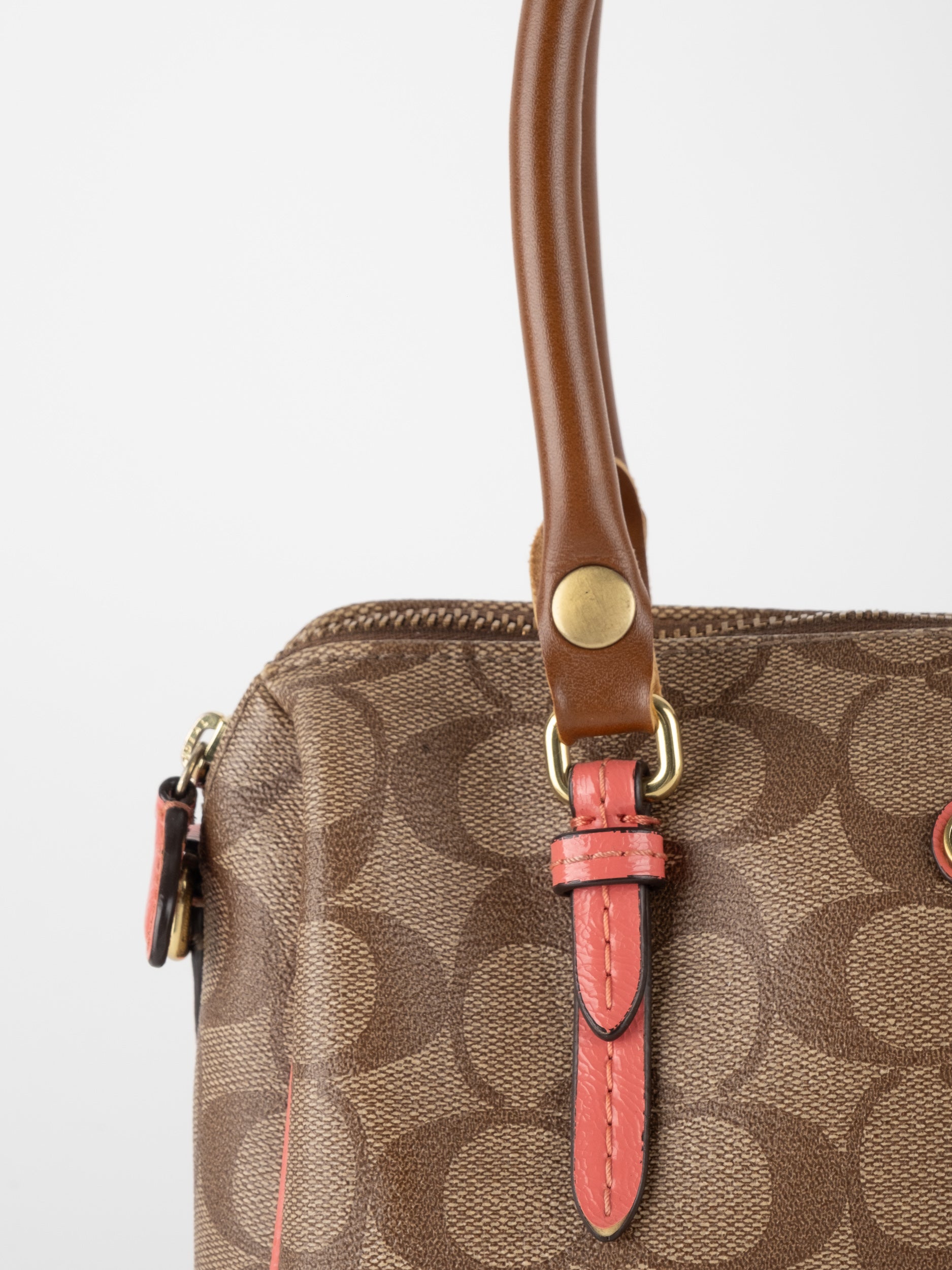 COACH Signature Satchel Brown with Coral Details