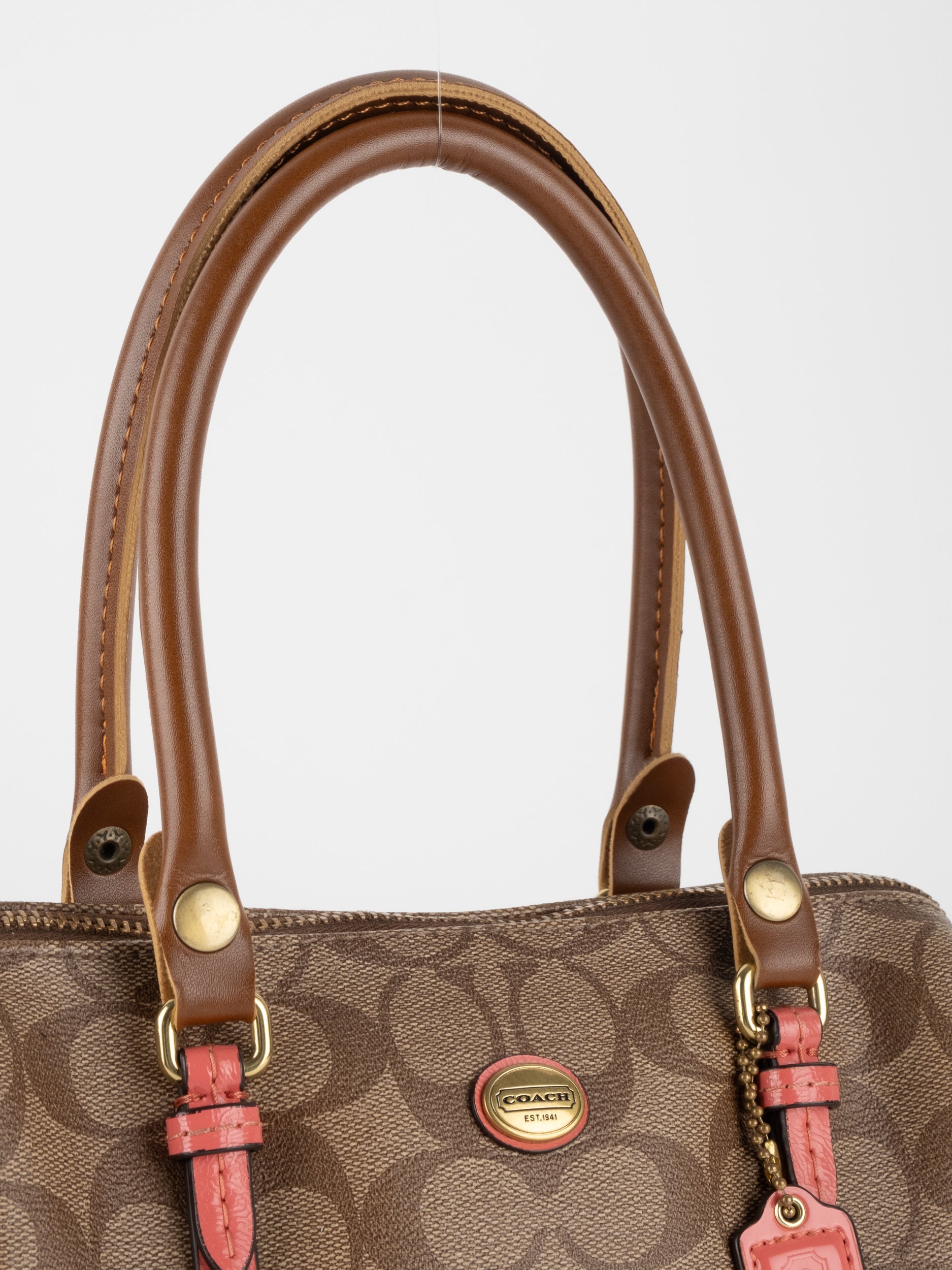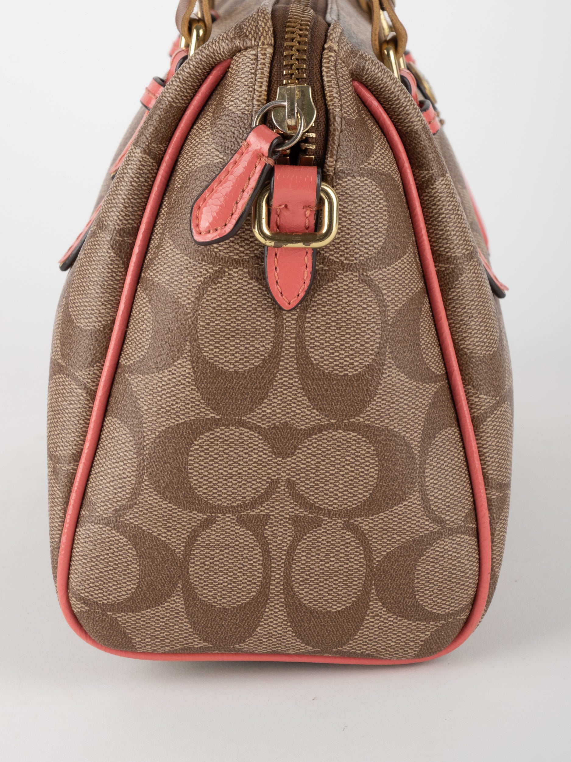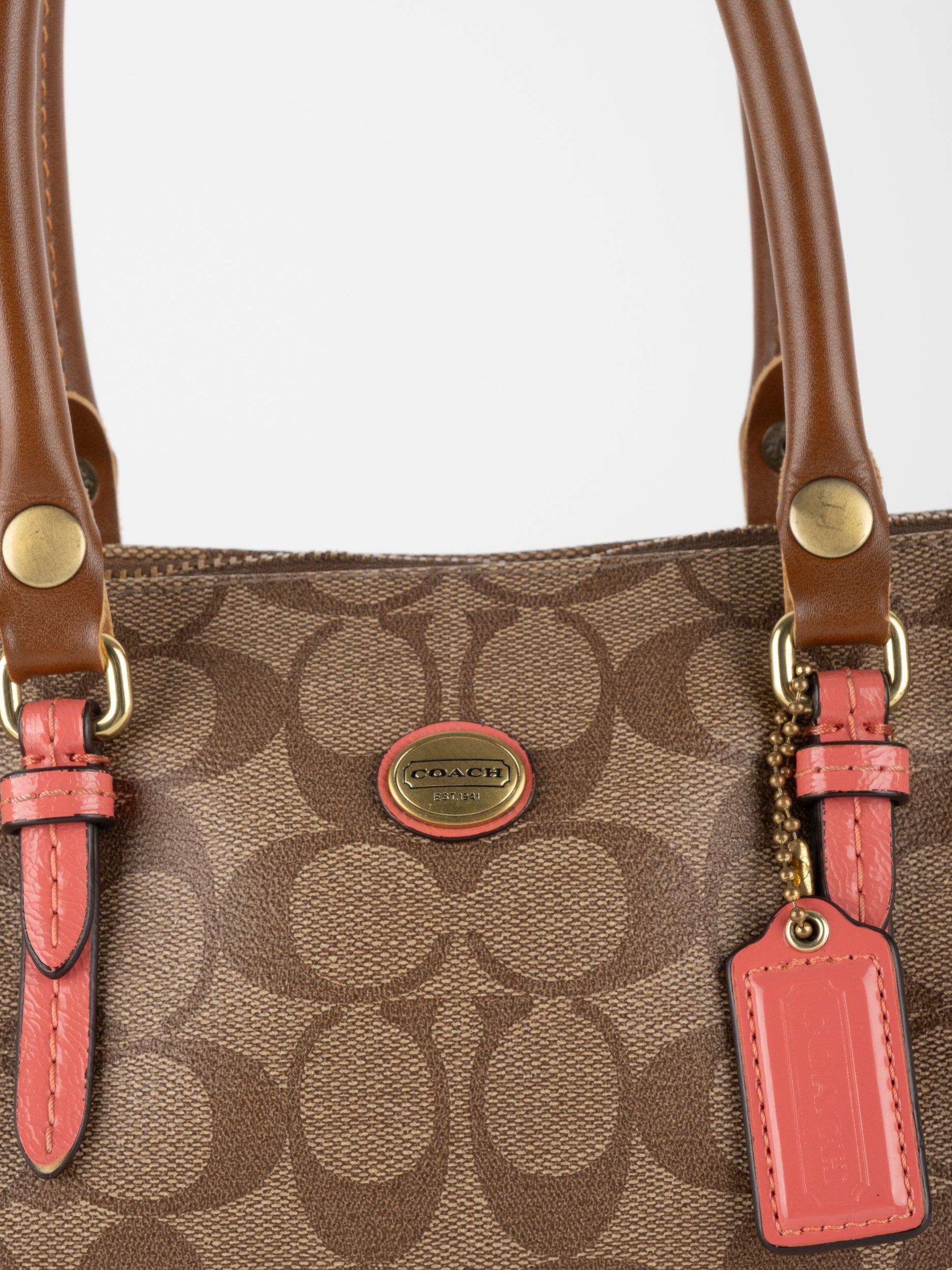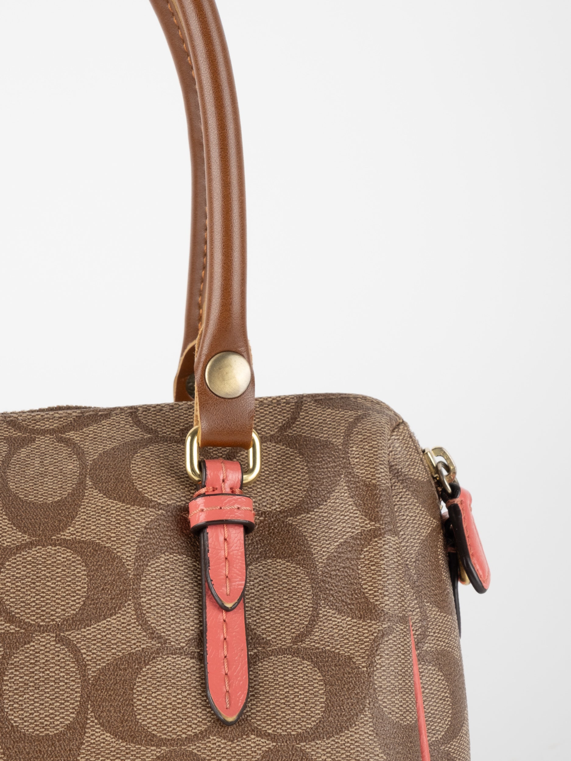 COACH Signature Satchel Brown with Coral Details