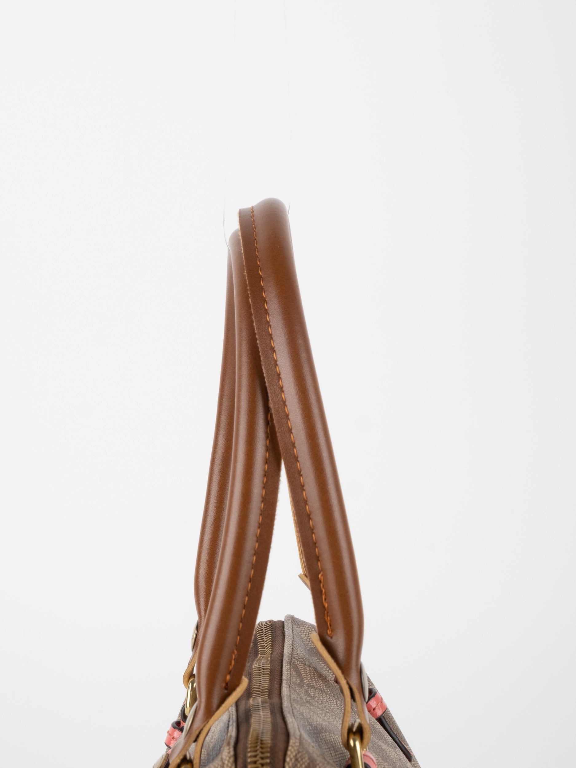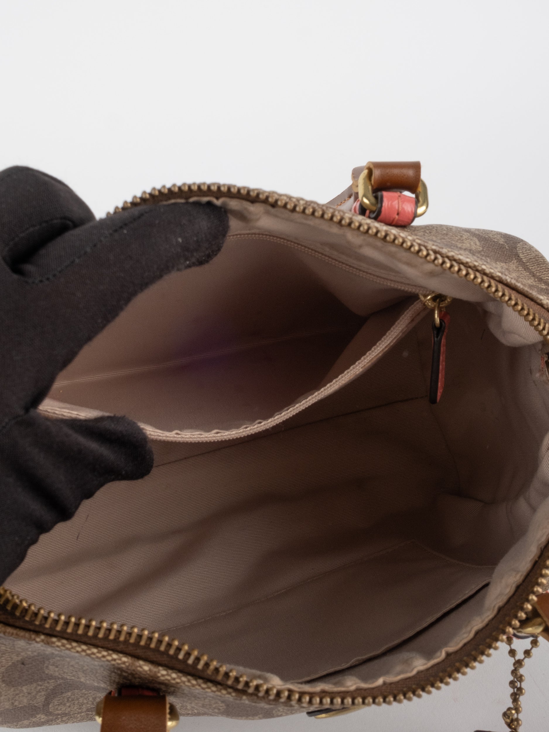 View Similar Productsקואץ' COACH וינטג' יד שנייה בדוגמת Signature בגווני חום עם נגיעות קורל חיות בידיות ובתג התלוי. שילוב מושלם בין קלאסי לשמח – תיק שמכניס צבע ואופי לכל הופעה.