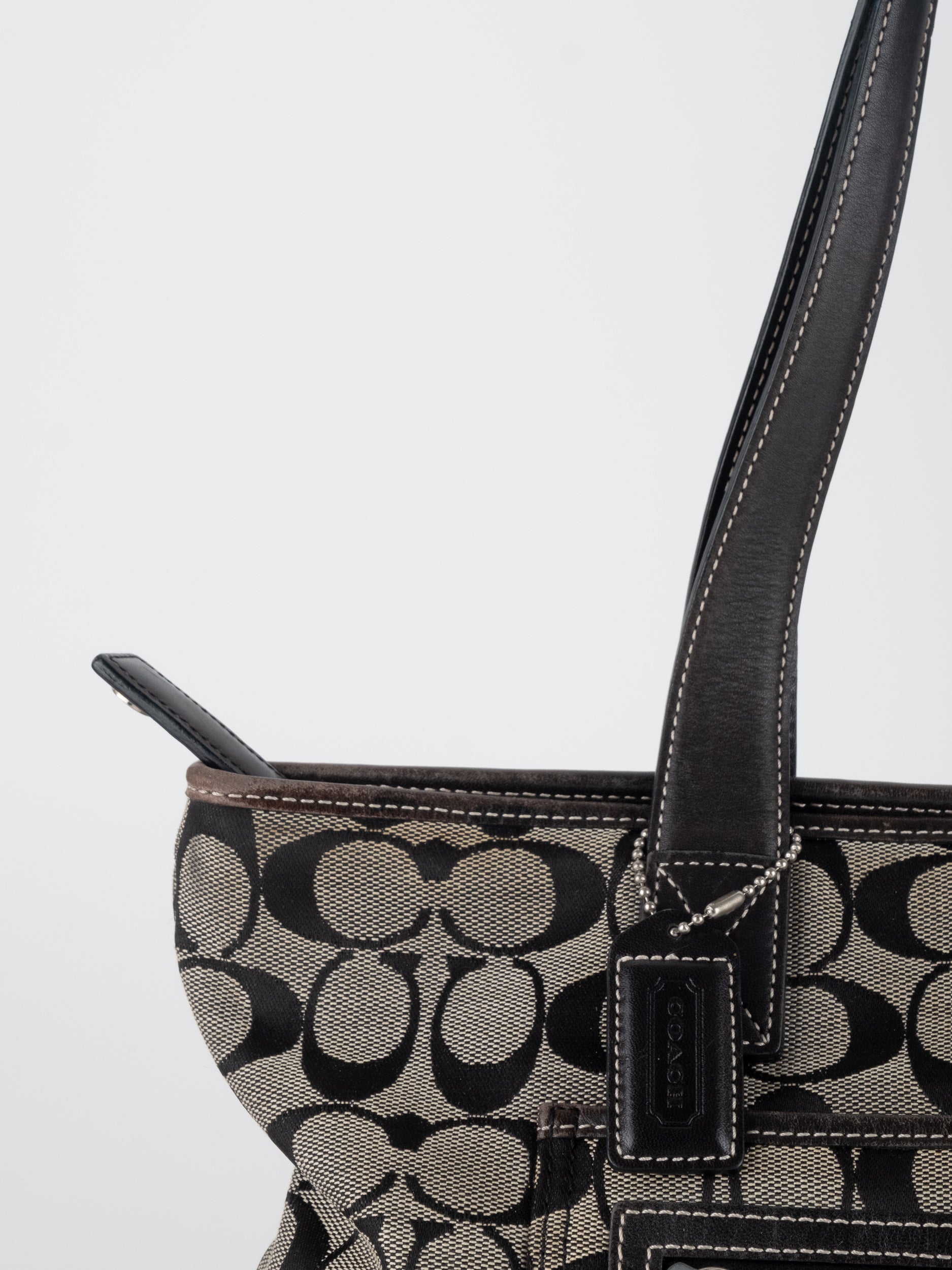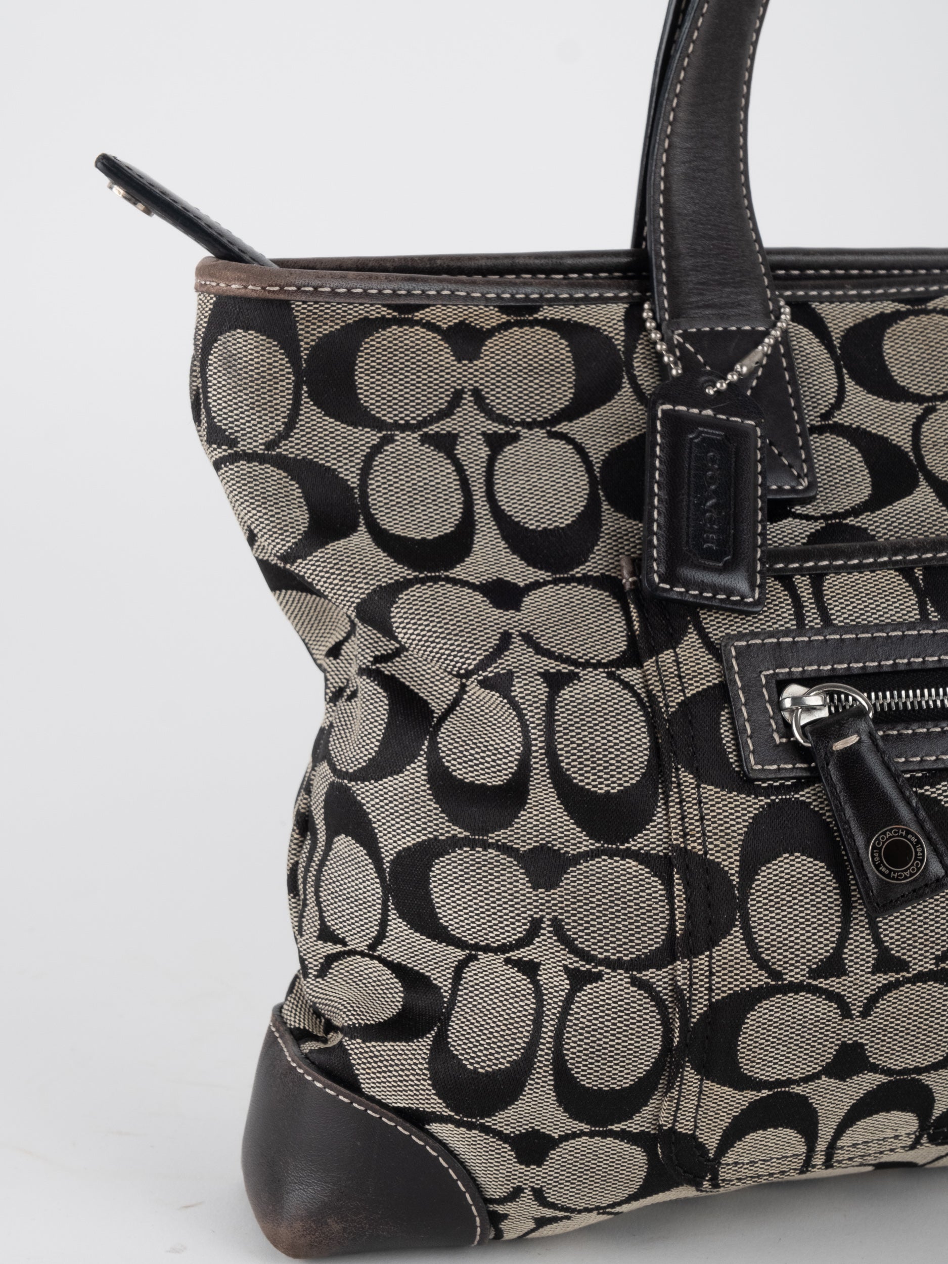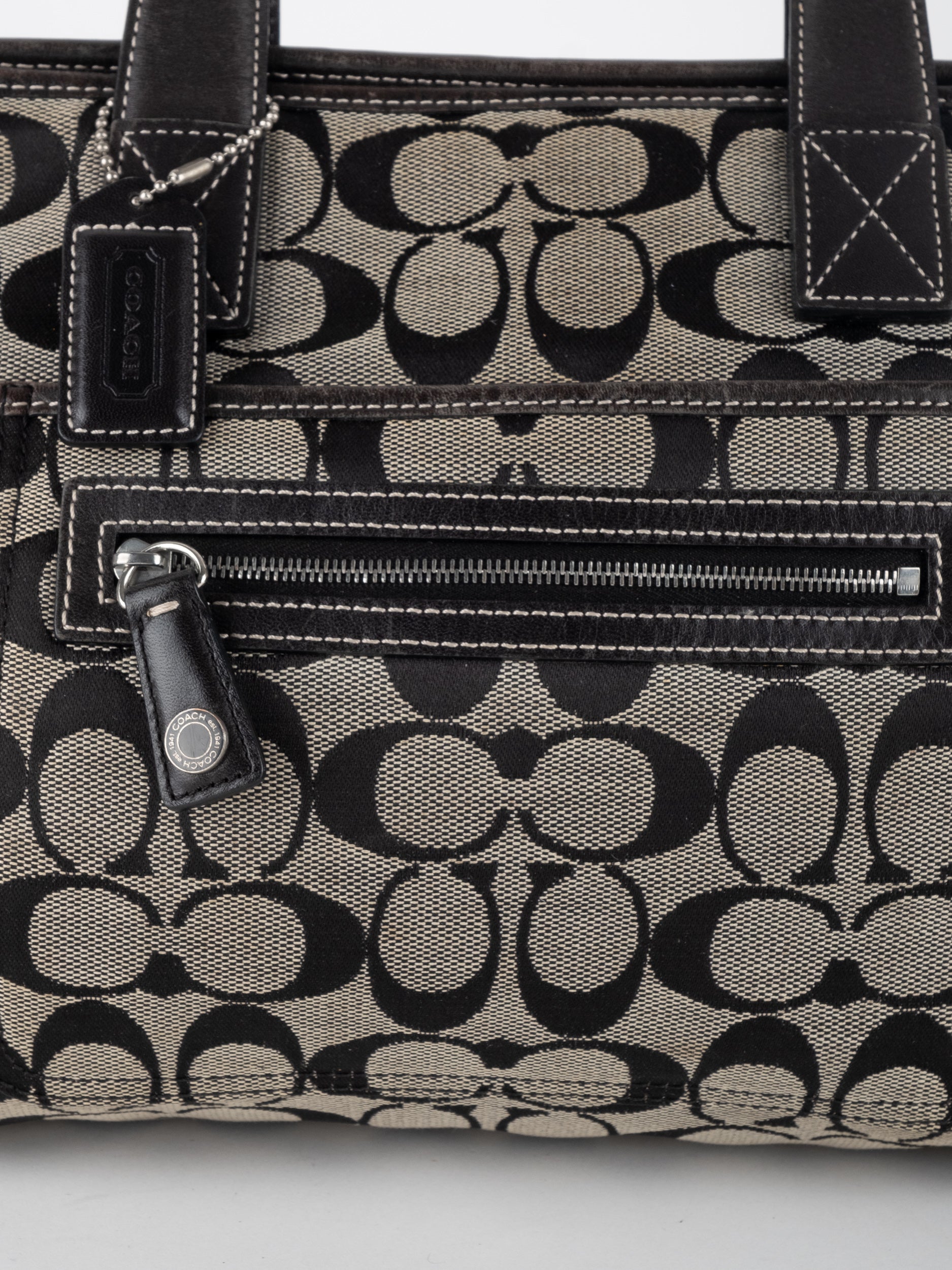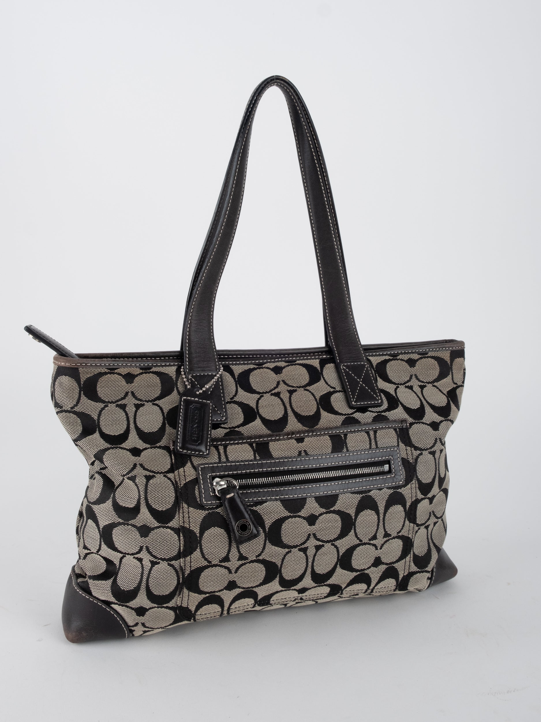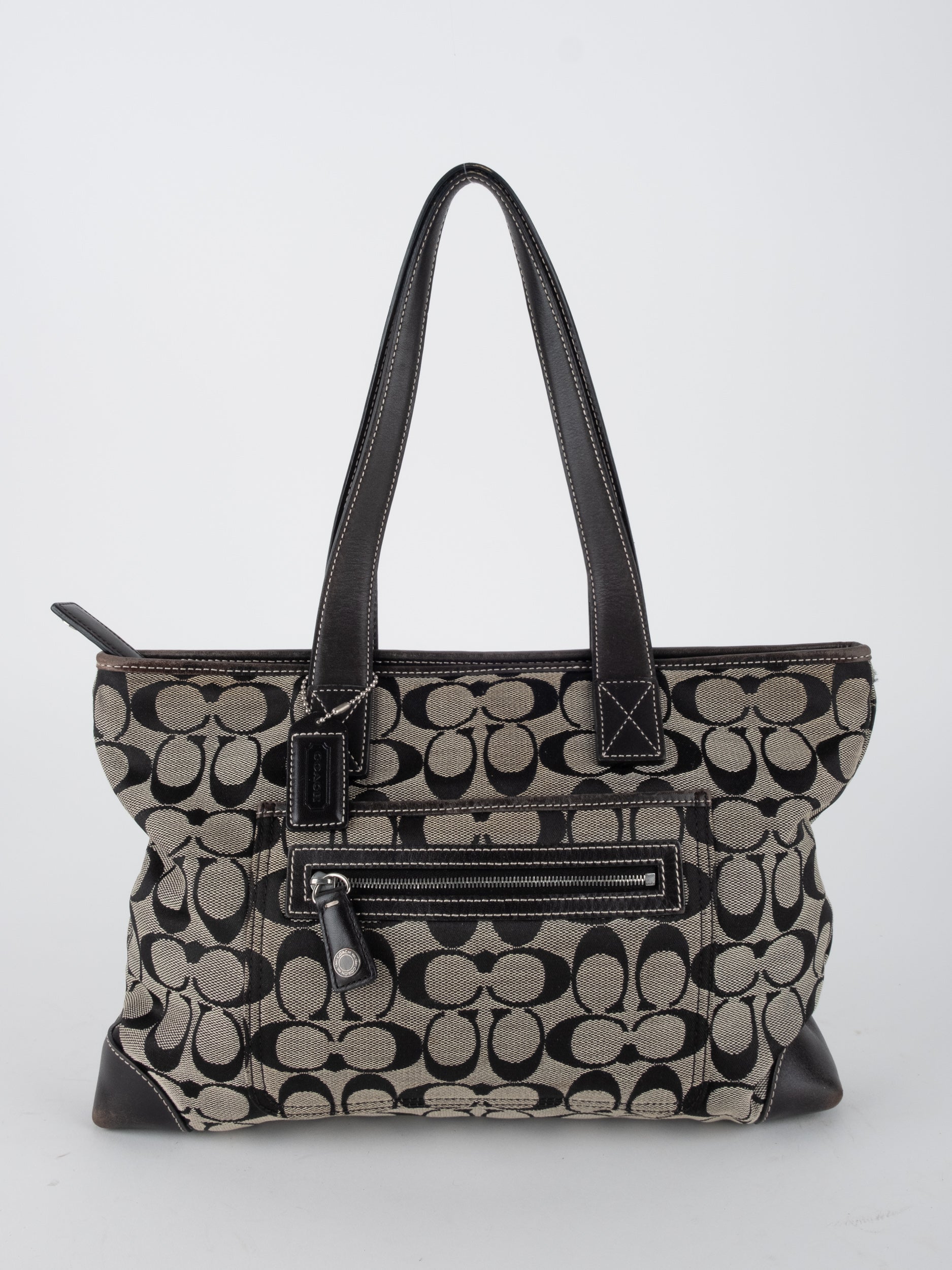 View Similar Productsקואץ' COACH וינטג' יד שנייה בדוגמת Signature בגווני שחור ואפור עם עיטורי עור שחור וכיס קדמי עם רוכסן. טote יומיומי פרקטי עם טאץ' אורבני.