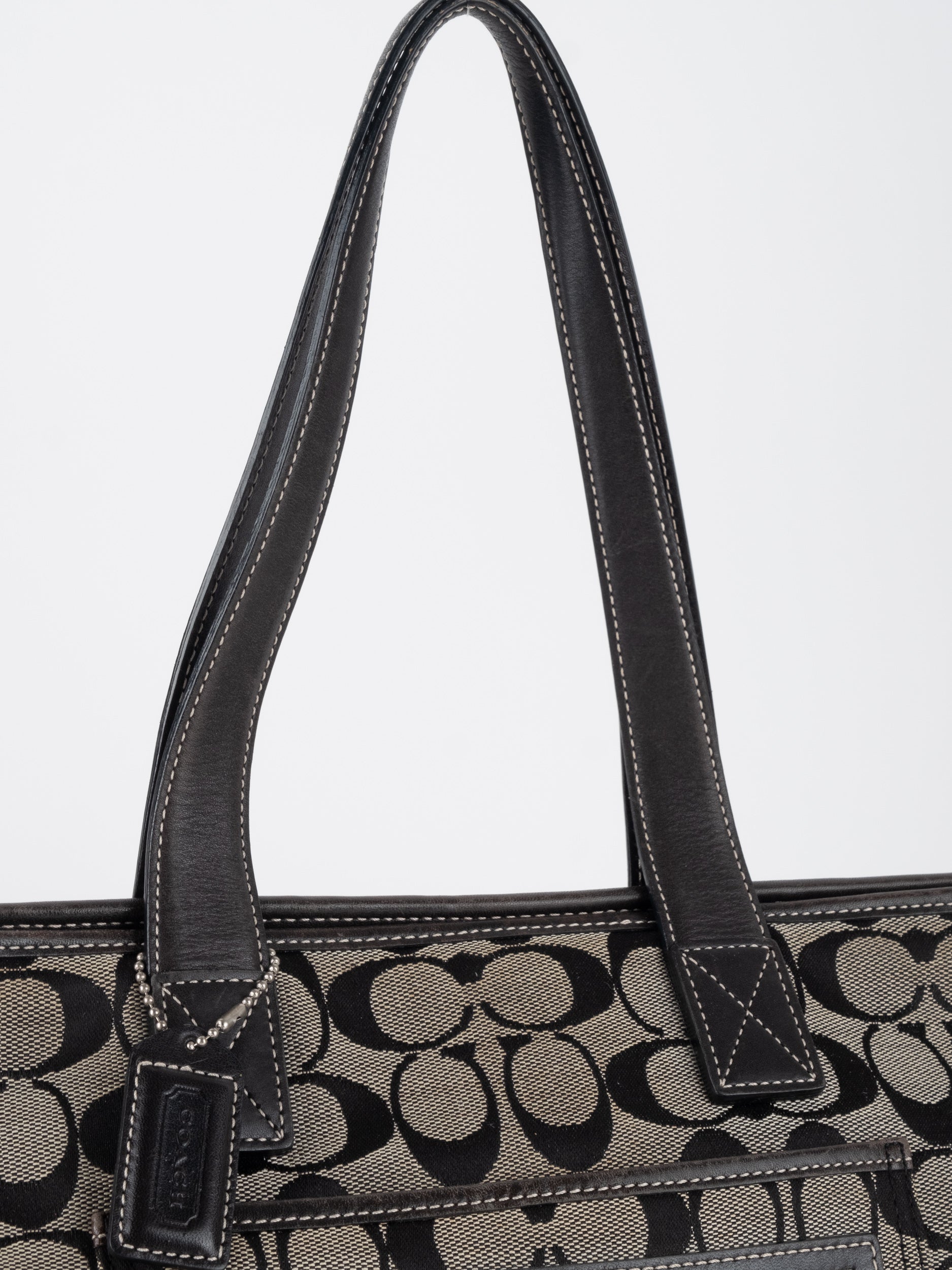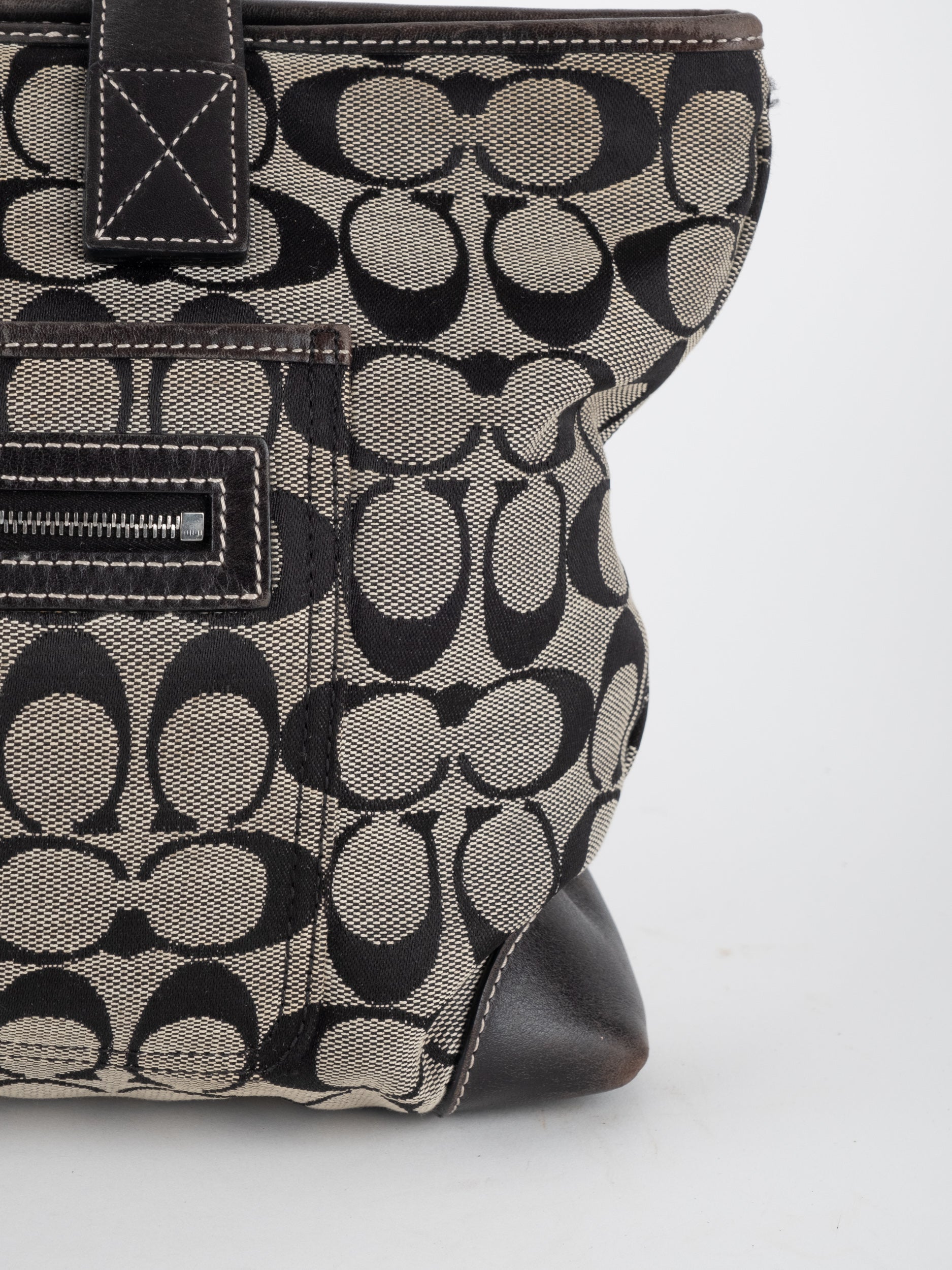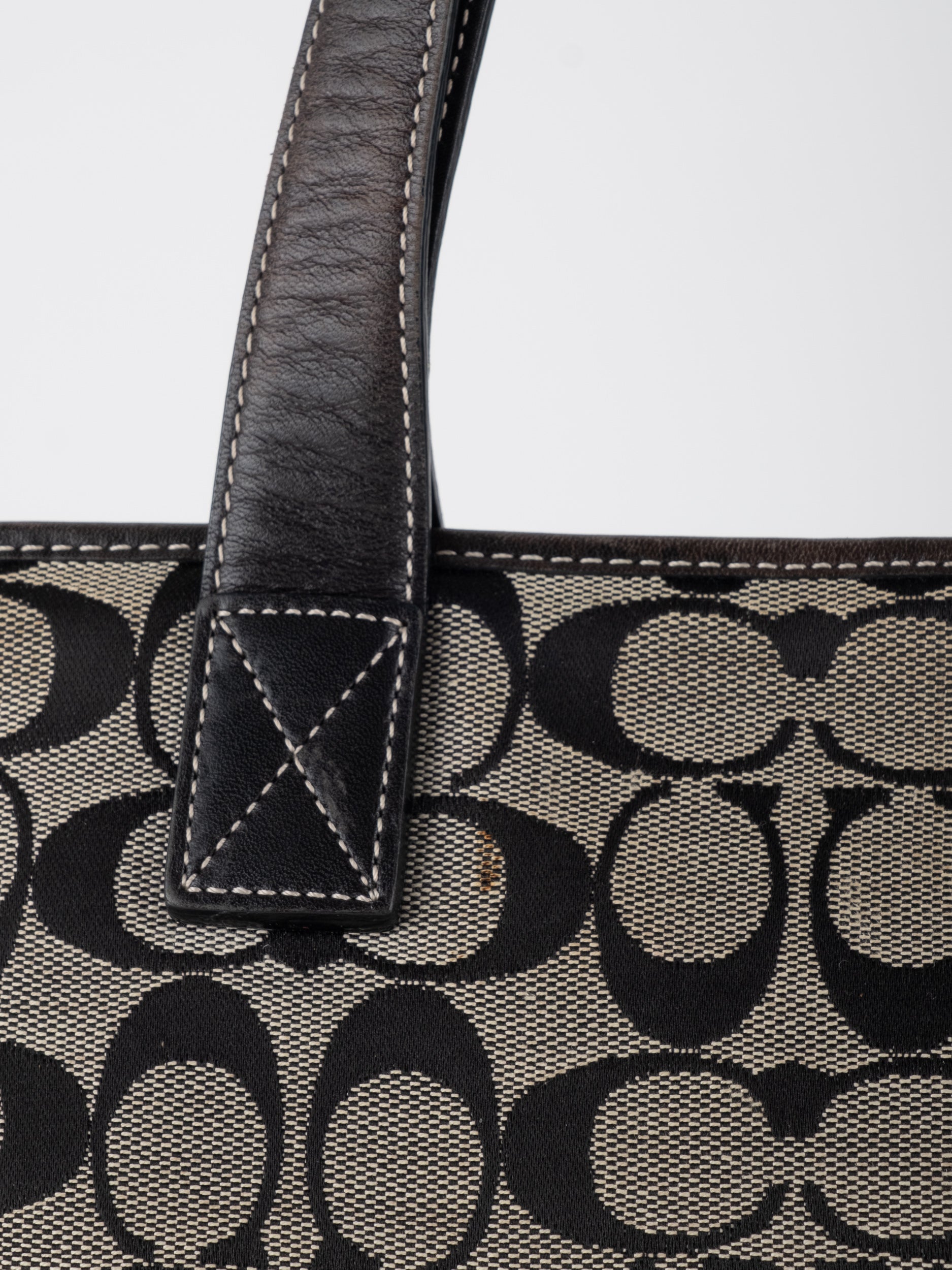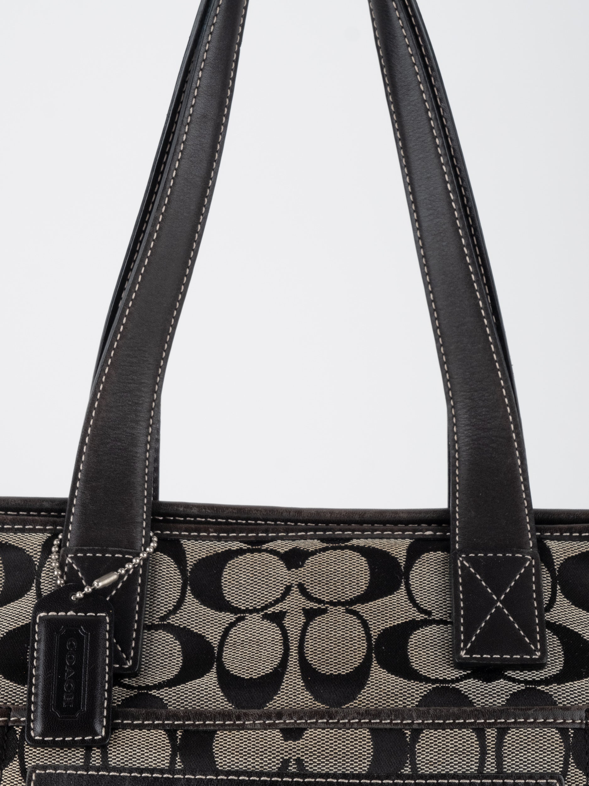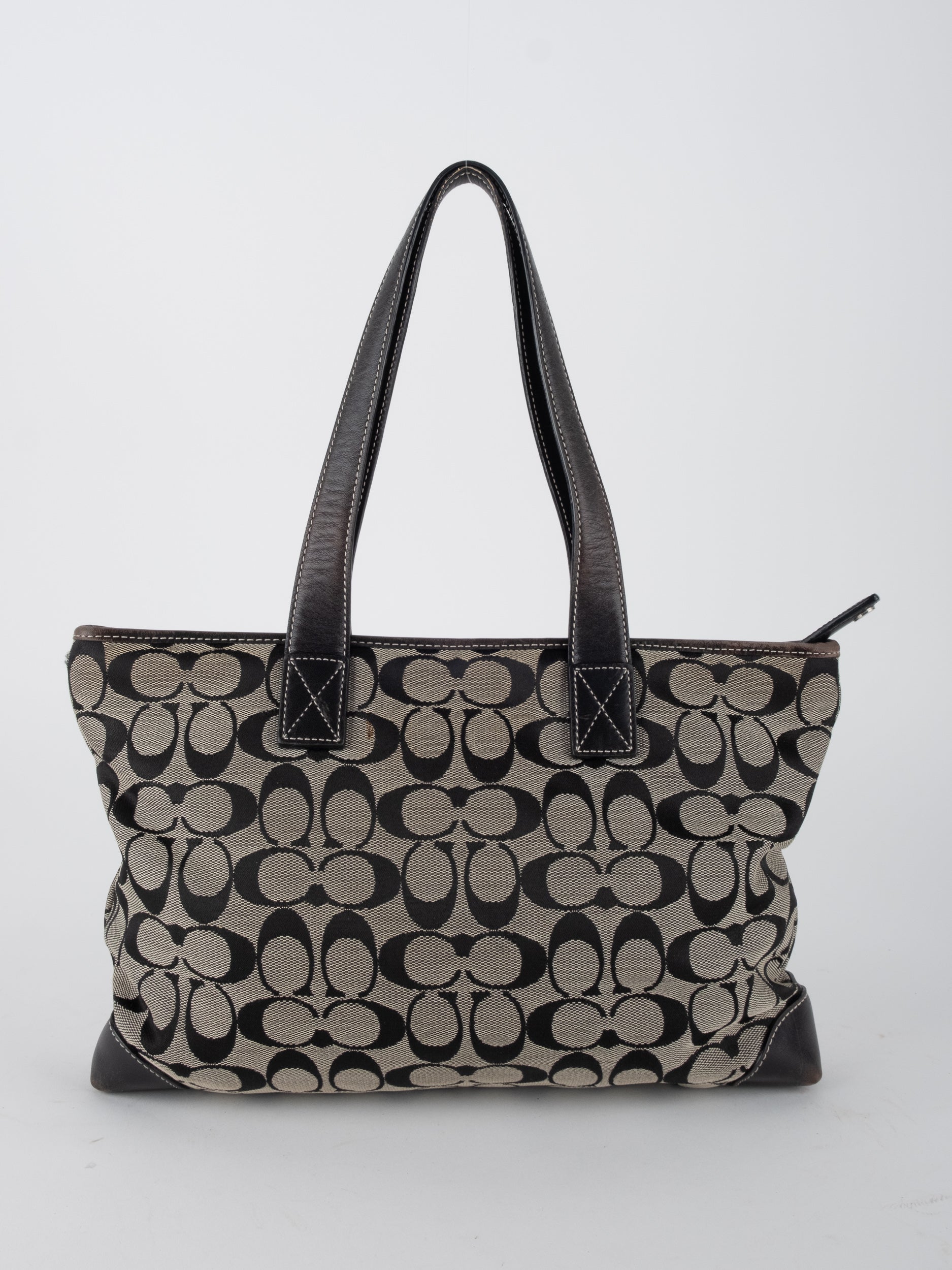 View Similar Productsקואץ' COACH וינטג' יד שנייה בדוגמת Signature בגווני שחור ואפור עם עיטורי עור שחור וכיס קדמי עם רוכסן. טote יומיומי פרקטי עם טאץ' אורבני.
