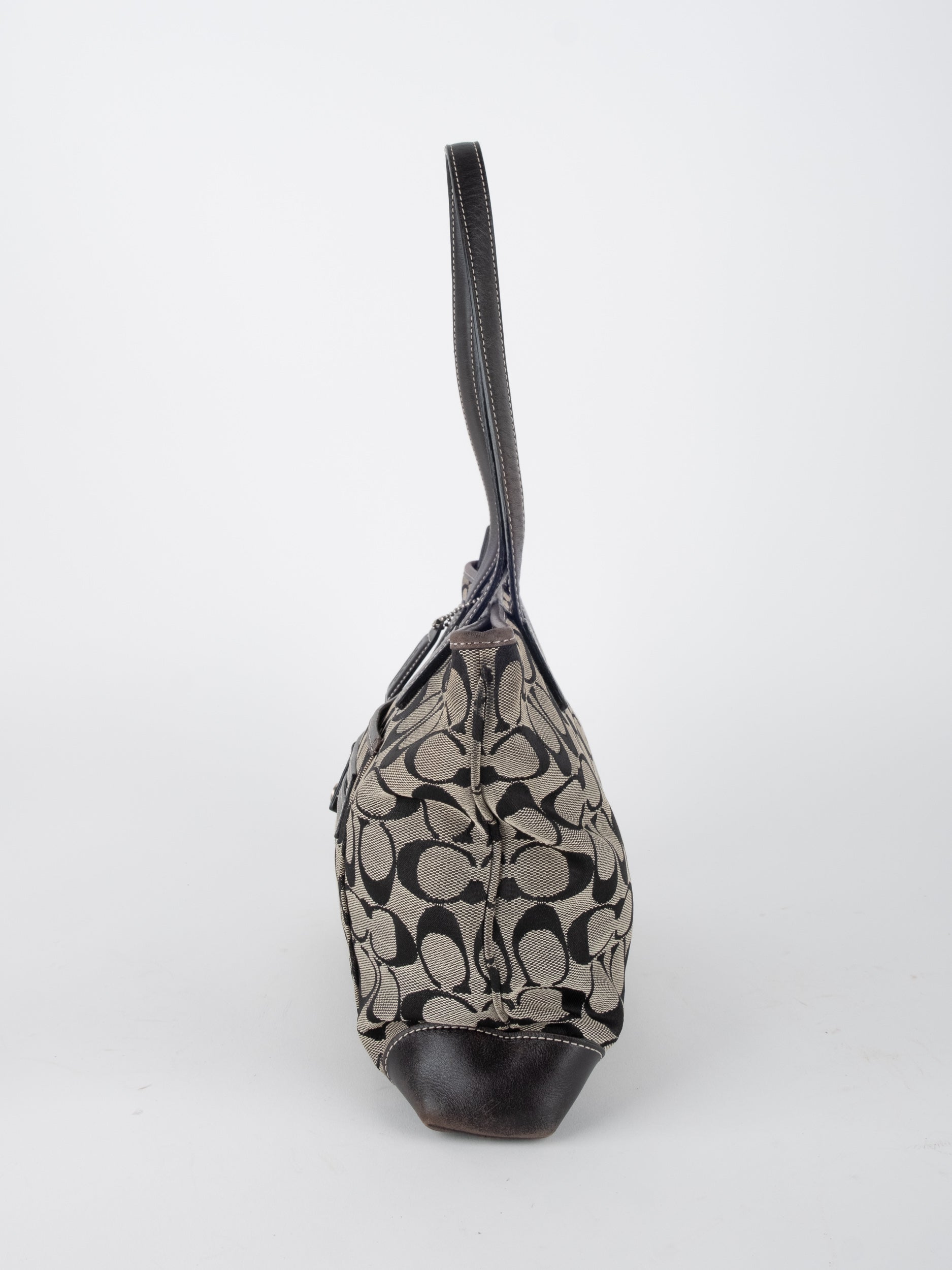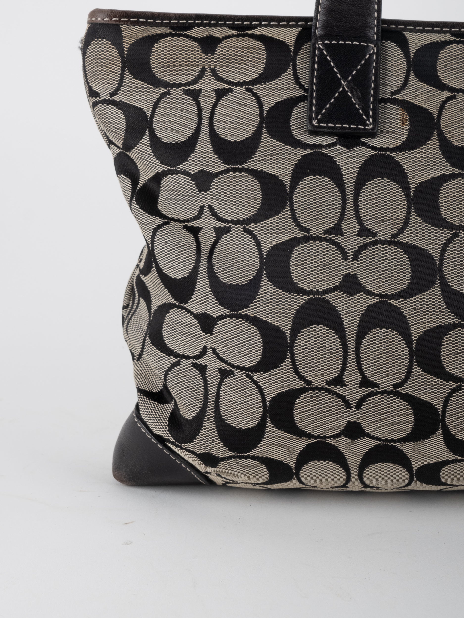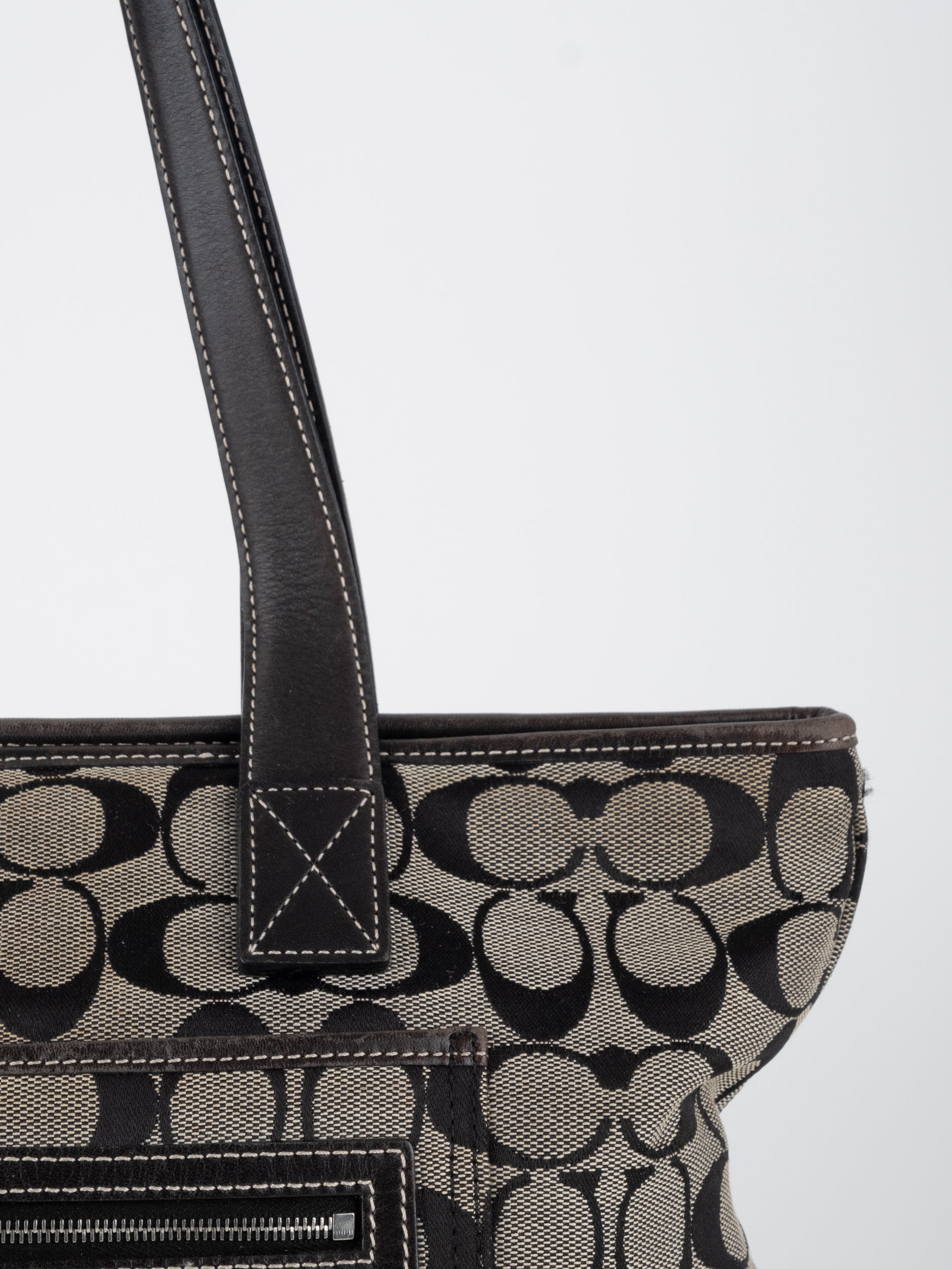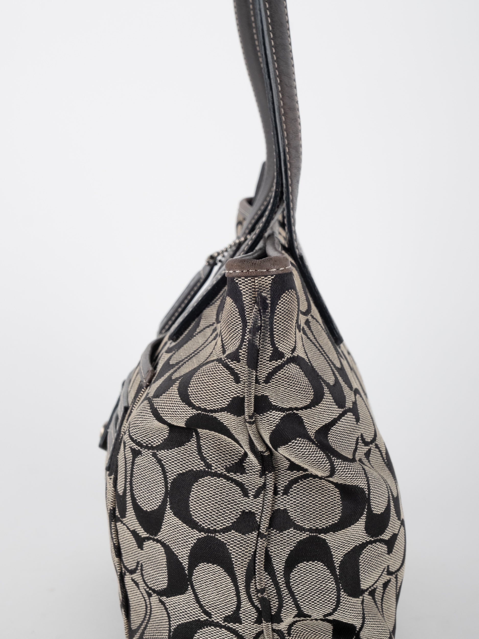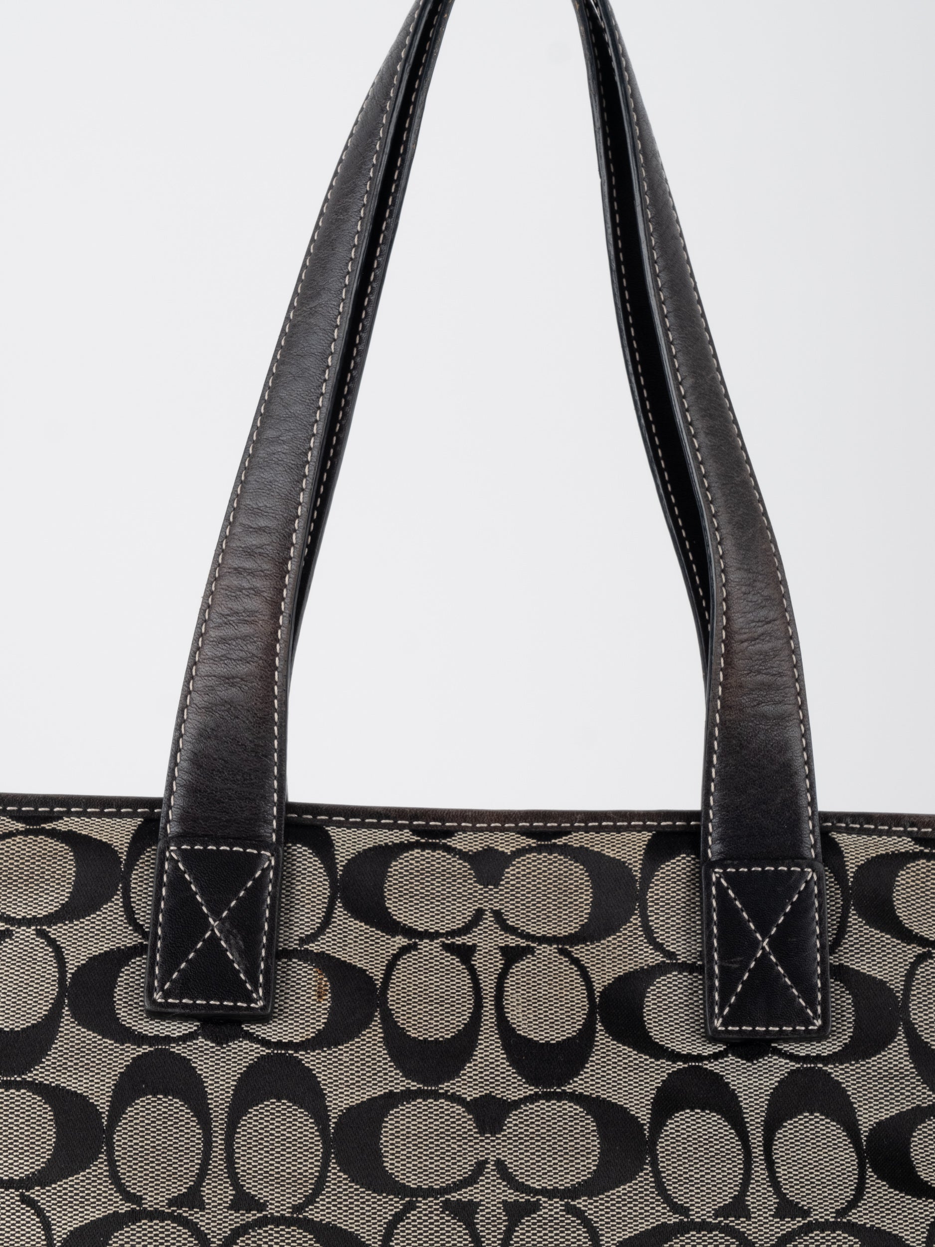 View Similar Productsקואץ' COACH וינטג' יד שנייה בדוגמת Signature בגווני שחור ואפור עם עיטורי עור שחור וכיס קדמי עם רוכסן. טote יומיומי פרקטי עם טאץ' אורבני.