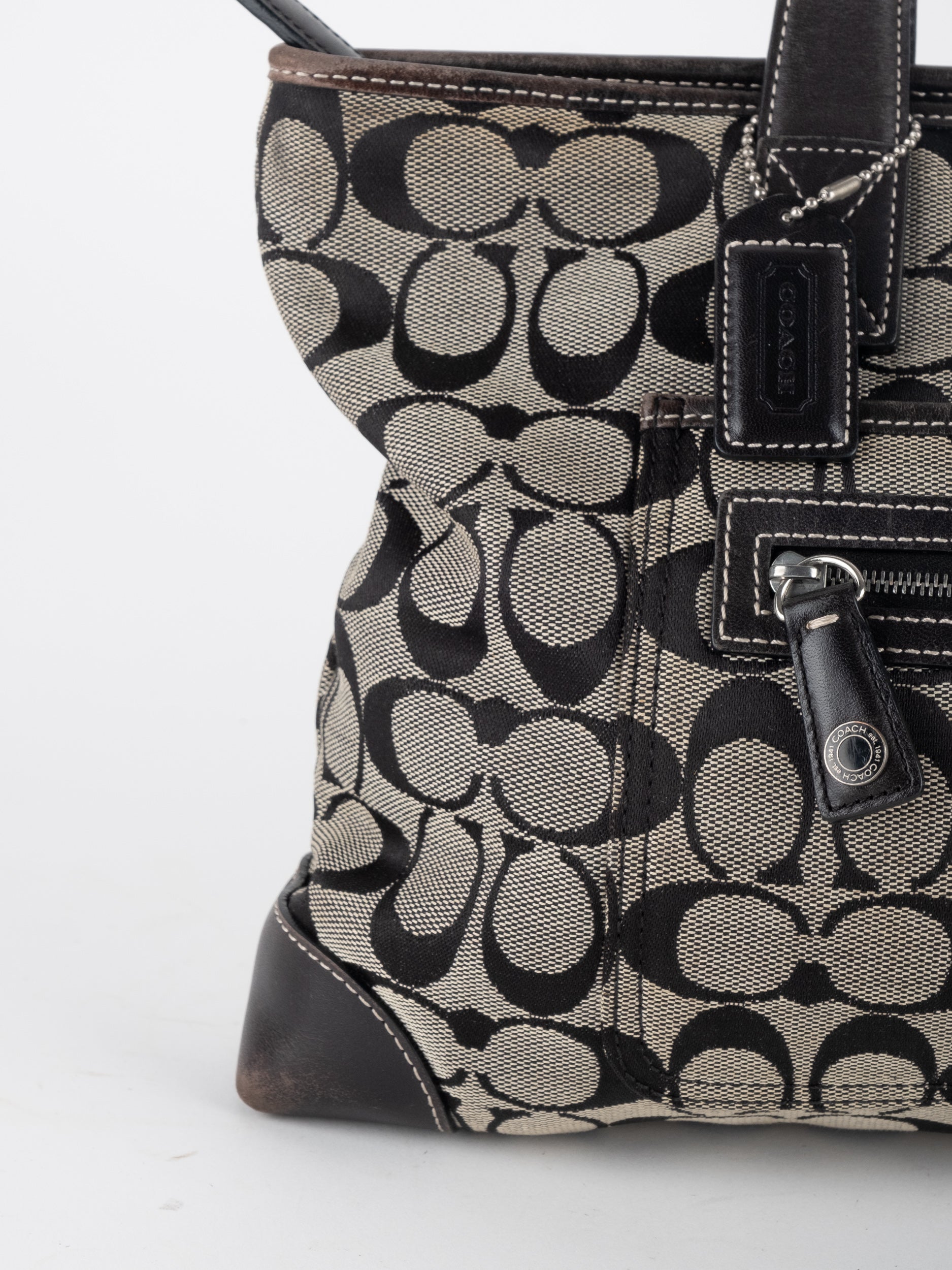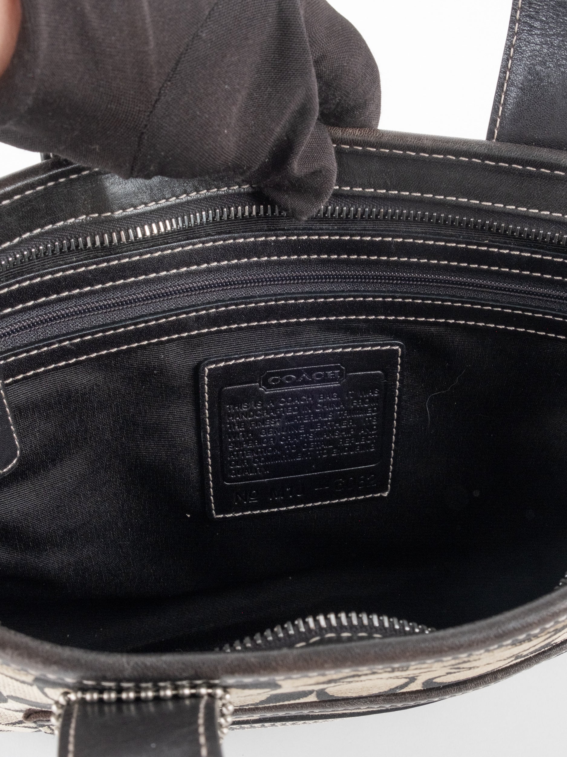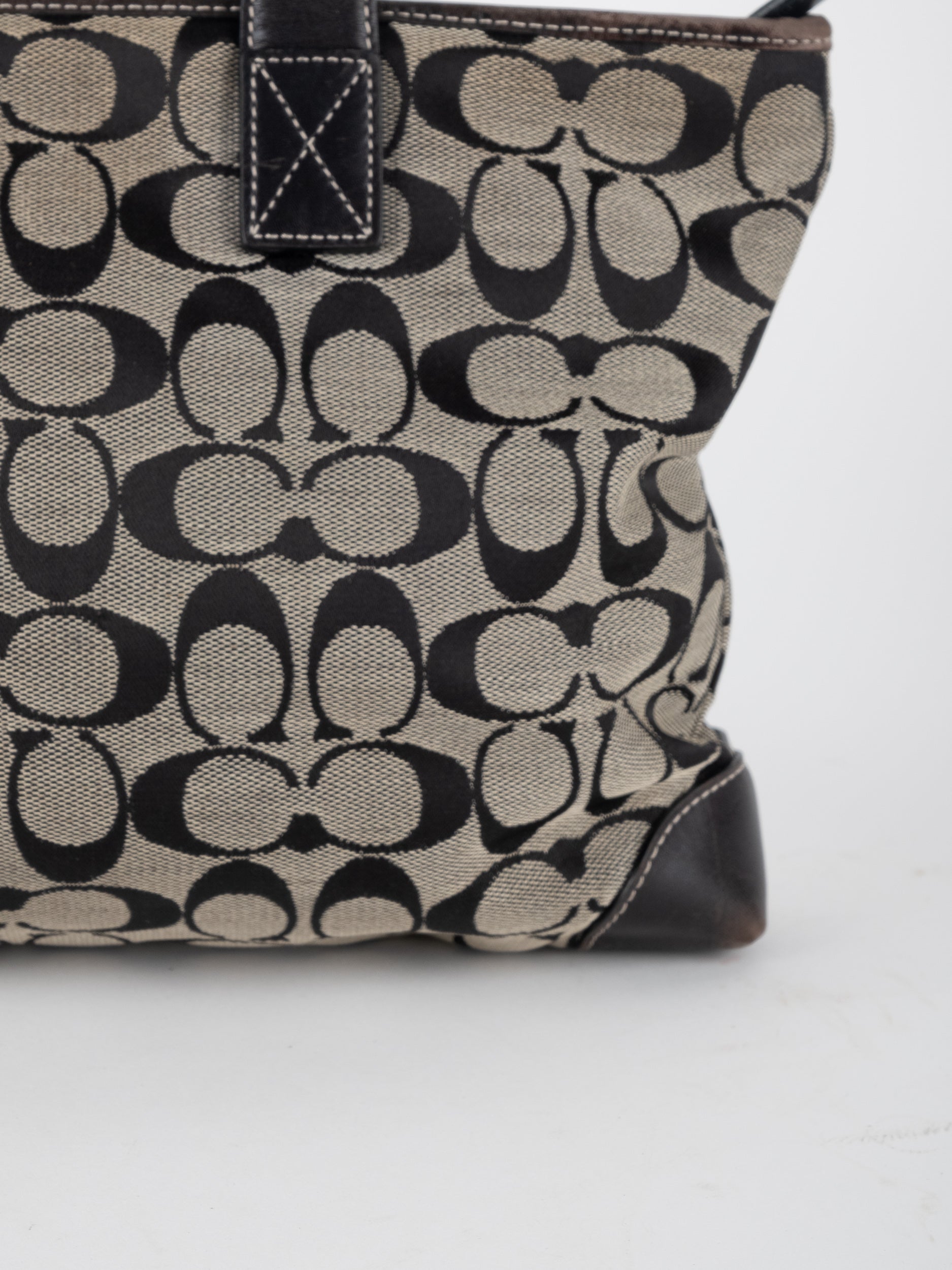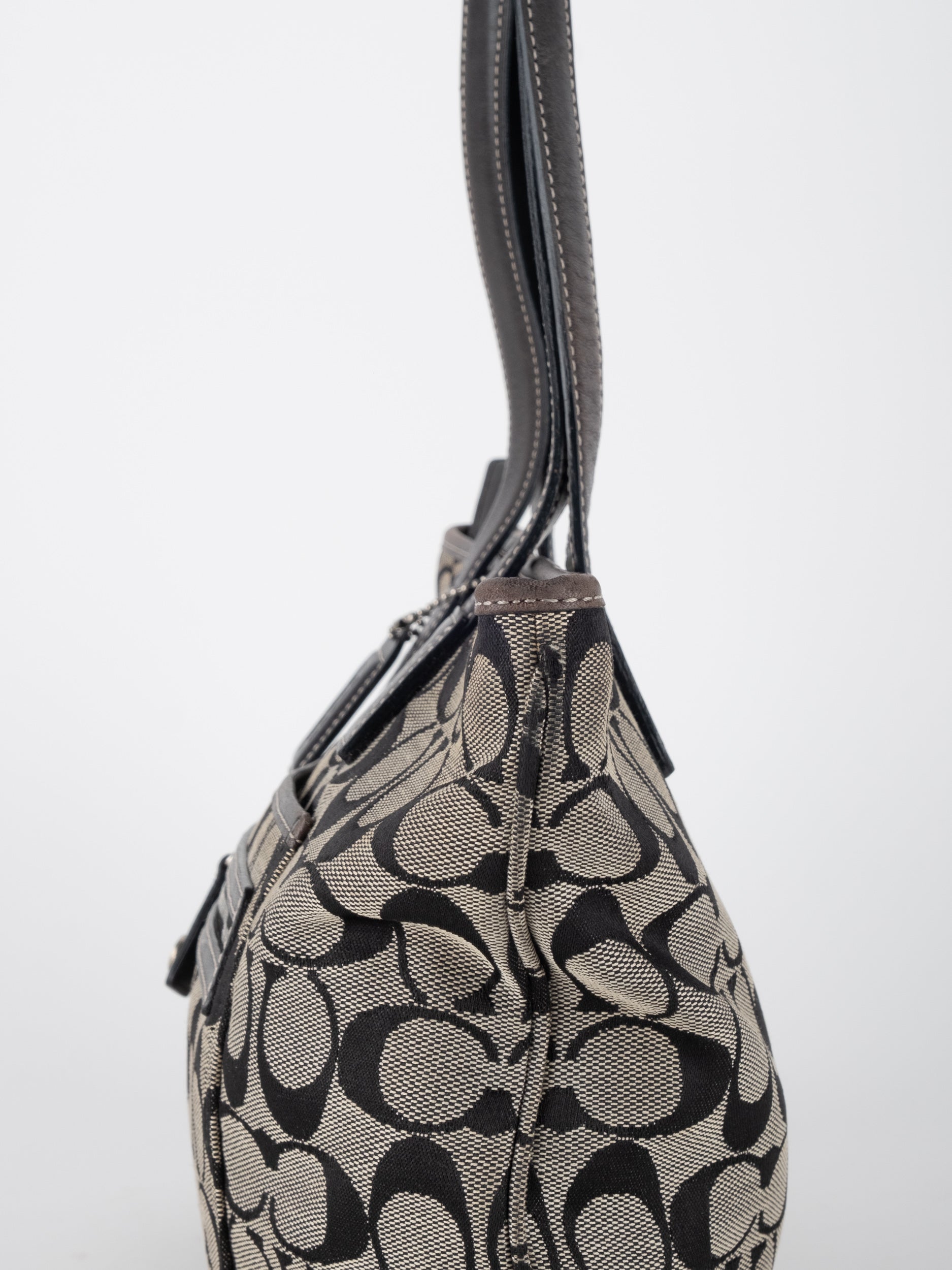 View Similar Productsקואץ' COACH וינטג' יד שנייה בדוגמת Signature בגווני שחור ואפור עם עיטורי עור שחור וכיס קדמי עם רוכסן. טote יומיומי פרקטי עם טאץ' אורבני.