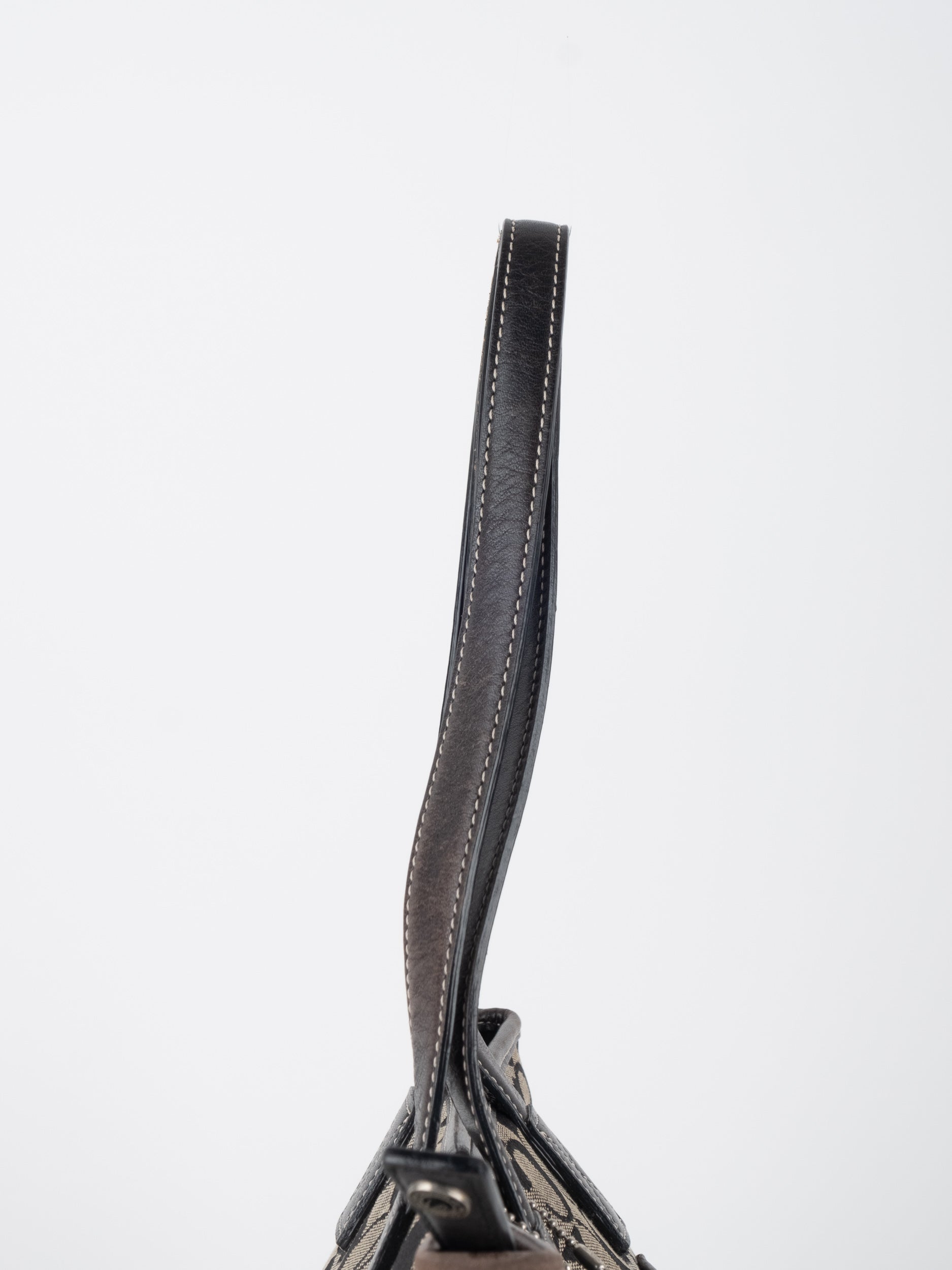 התיק עשוי קנבס בדוגמת Signature בגווני שחור ואפור, עם ידיות כתף מעור שחור וסגירת רוכסן עליונה. כולל כיס חיצוני קדמי עם רוכסן וחלל פנימי מרווח.