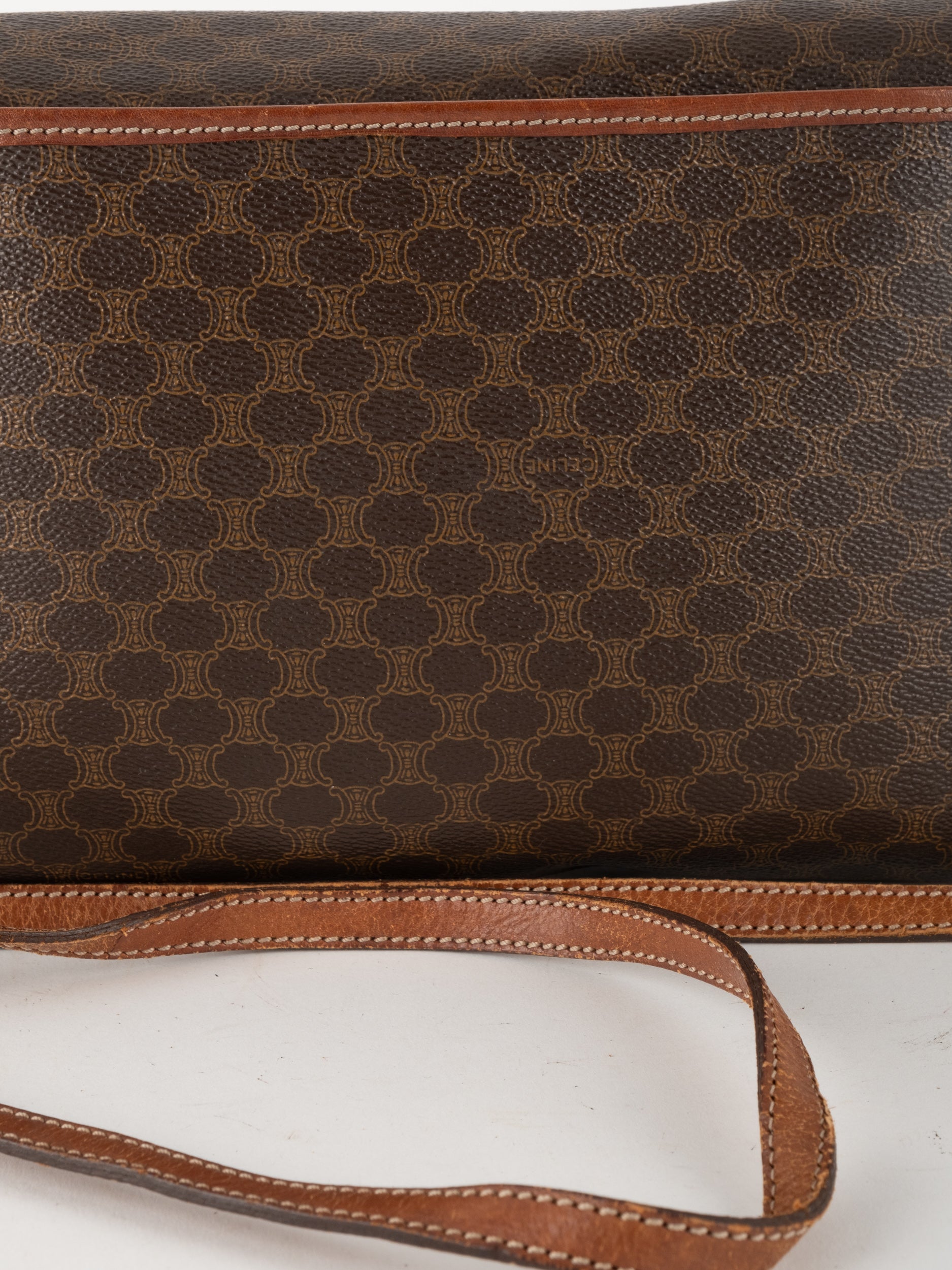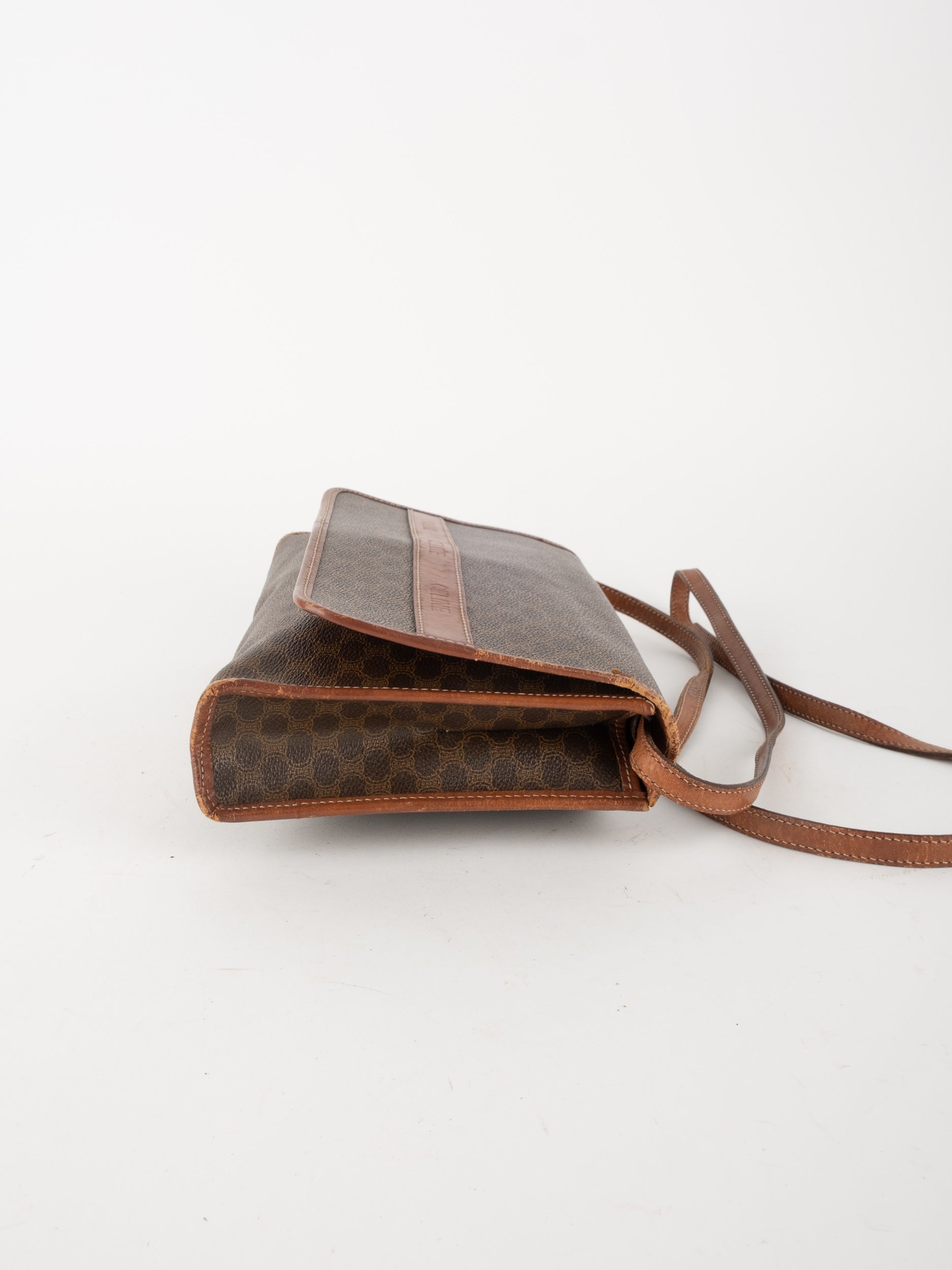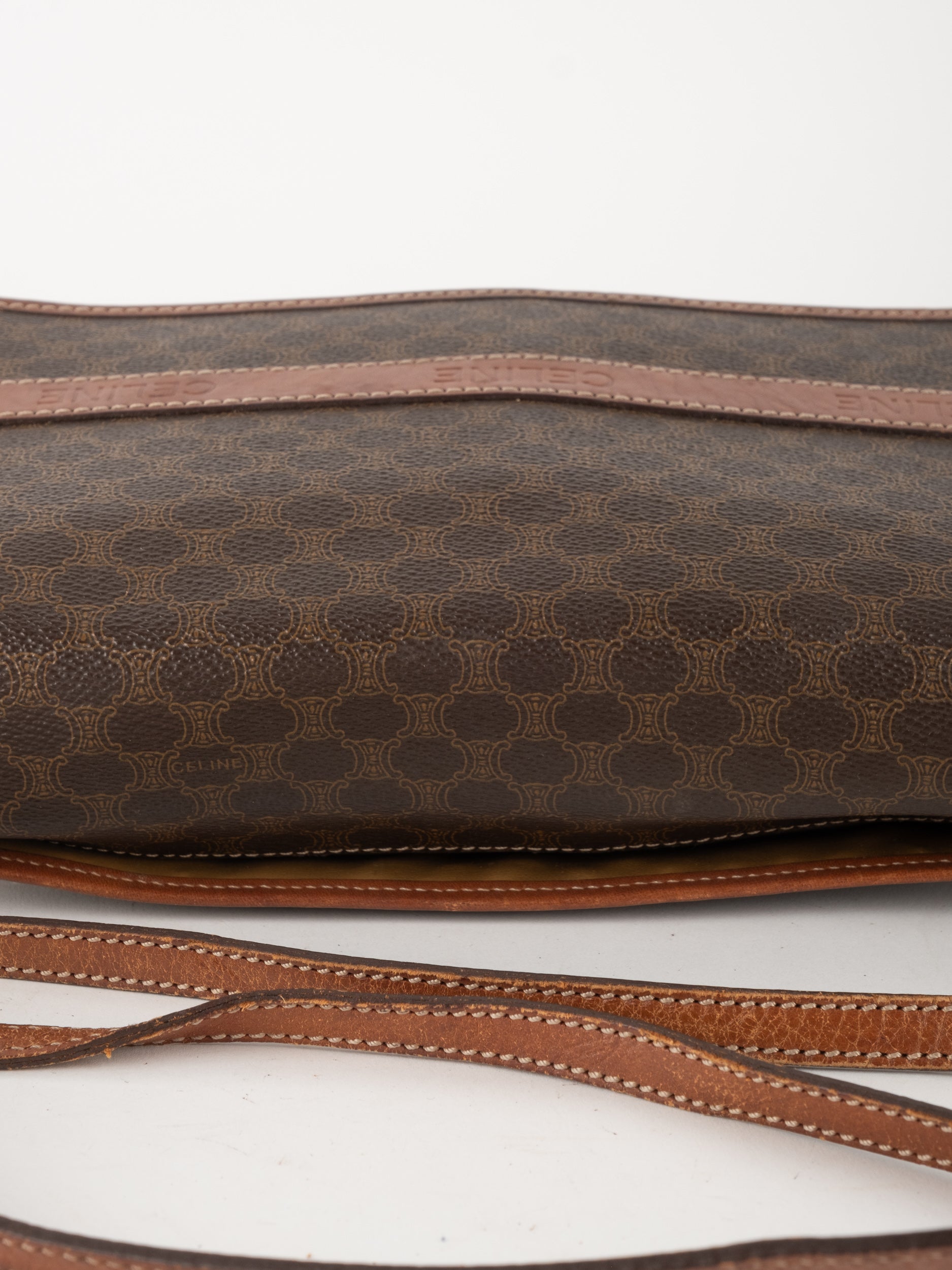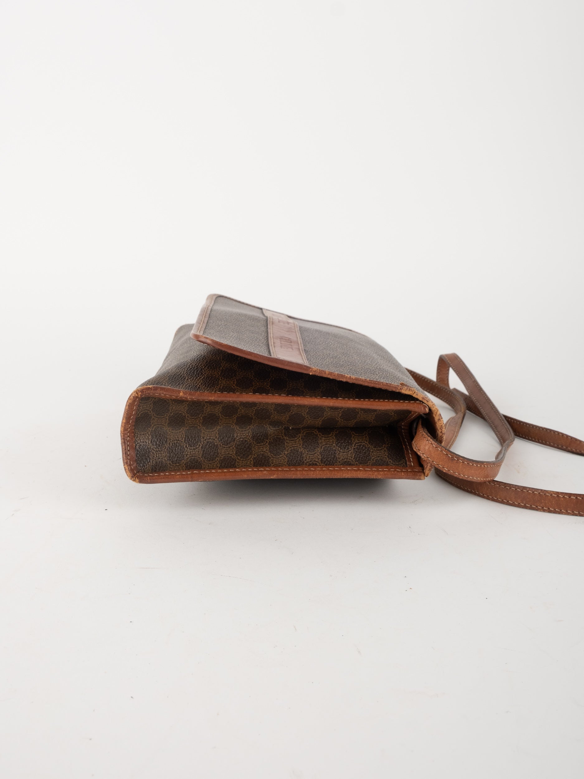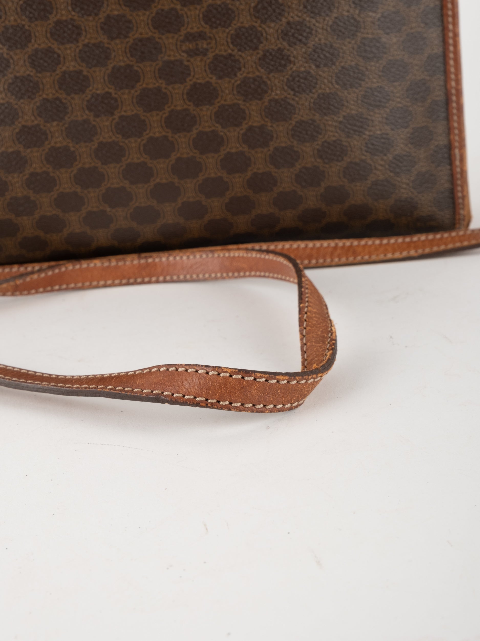 סלין CELINE וינטג' יד שנייה בדוגמת Macadam בגווני חום עם פס עור קוניאק ורצועת כתף תואמת. תיק קרוסבודי קלאסי ועל־זמני עם נוכחות פריזאית שקטה ואלגנטית.