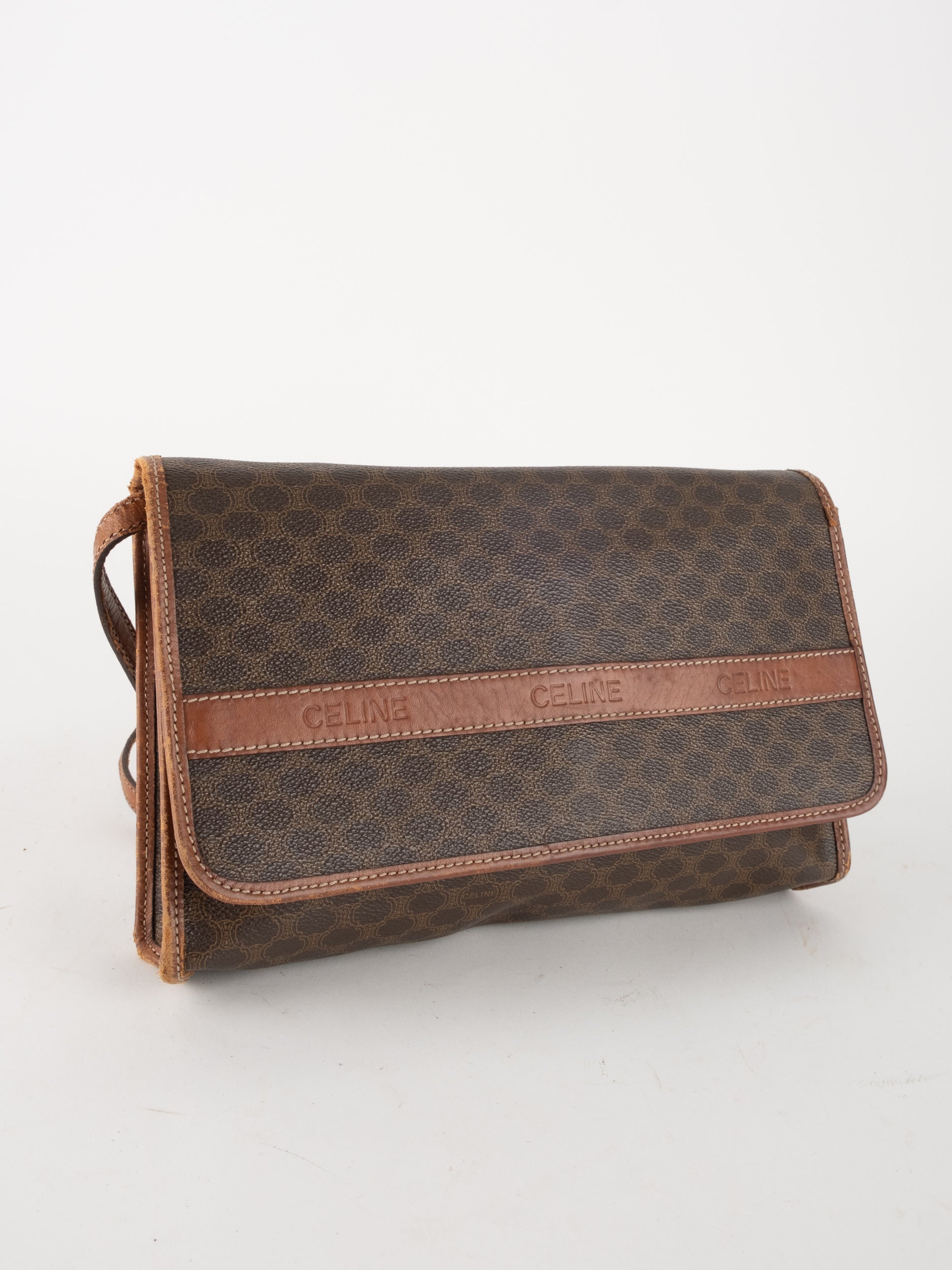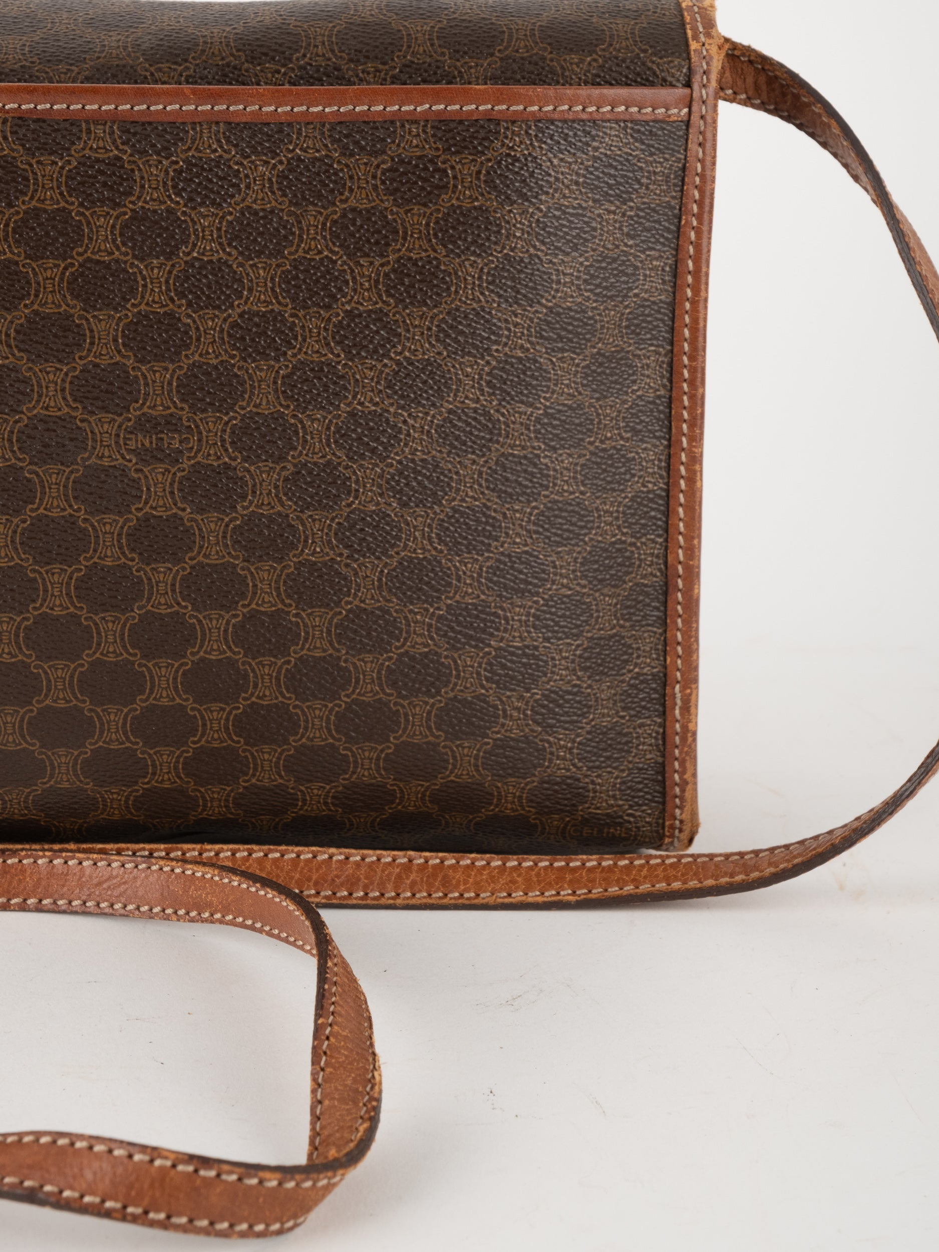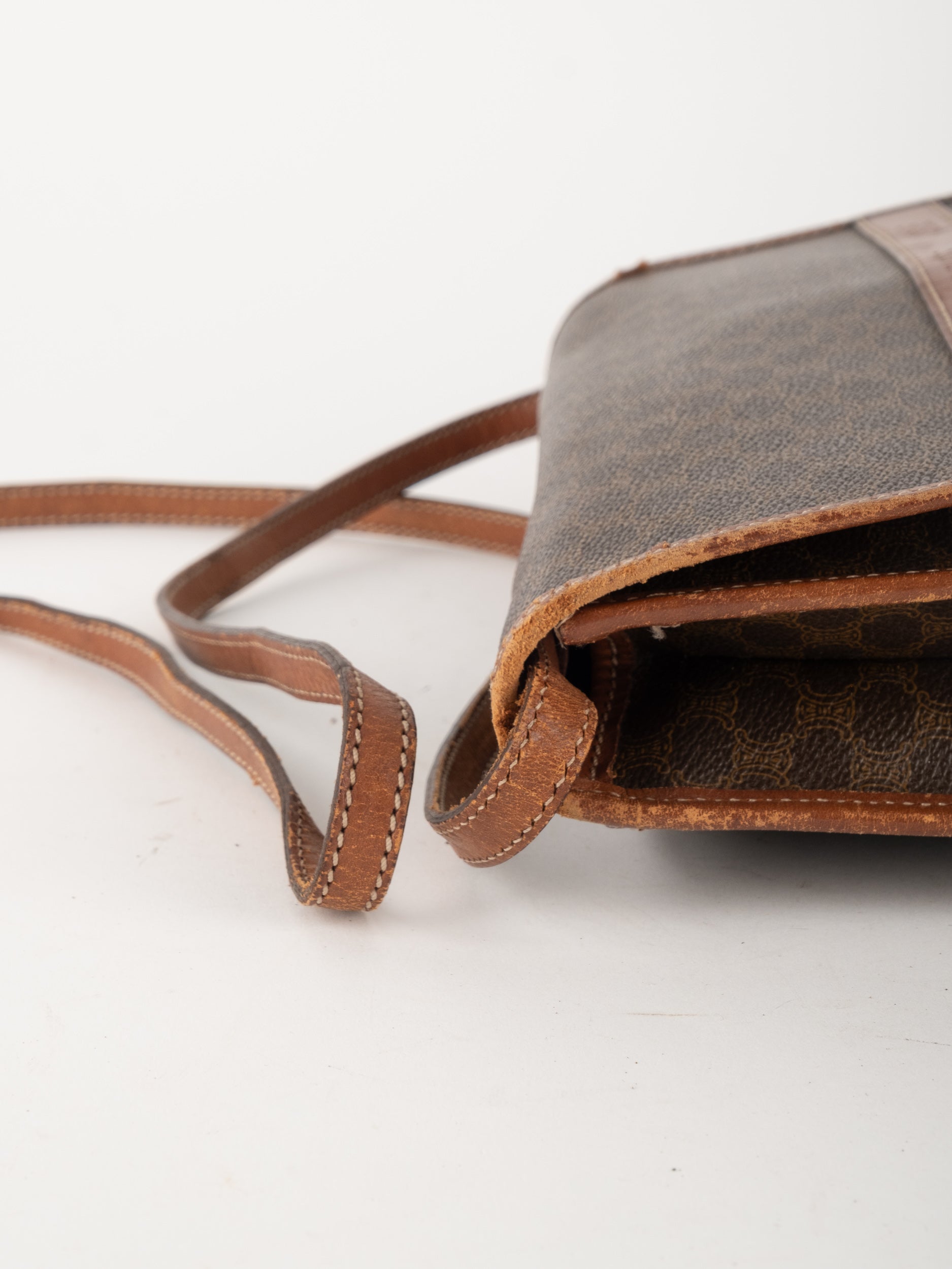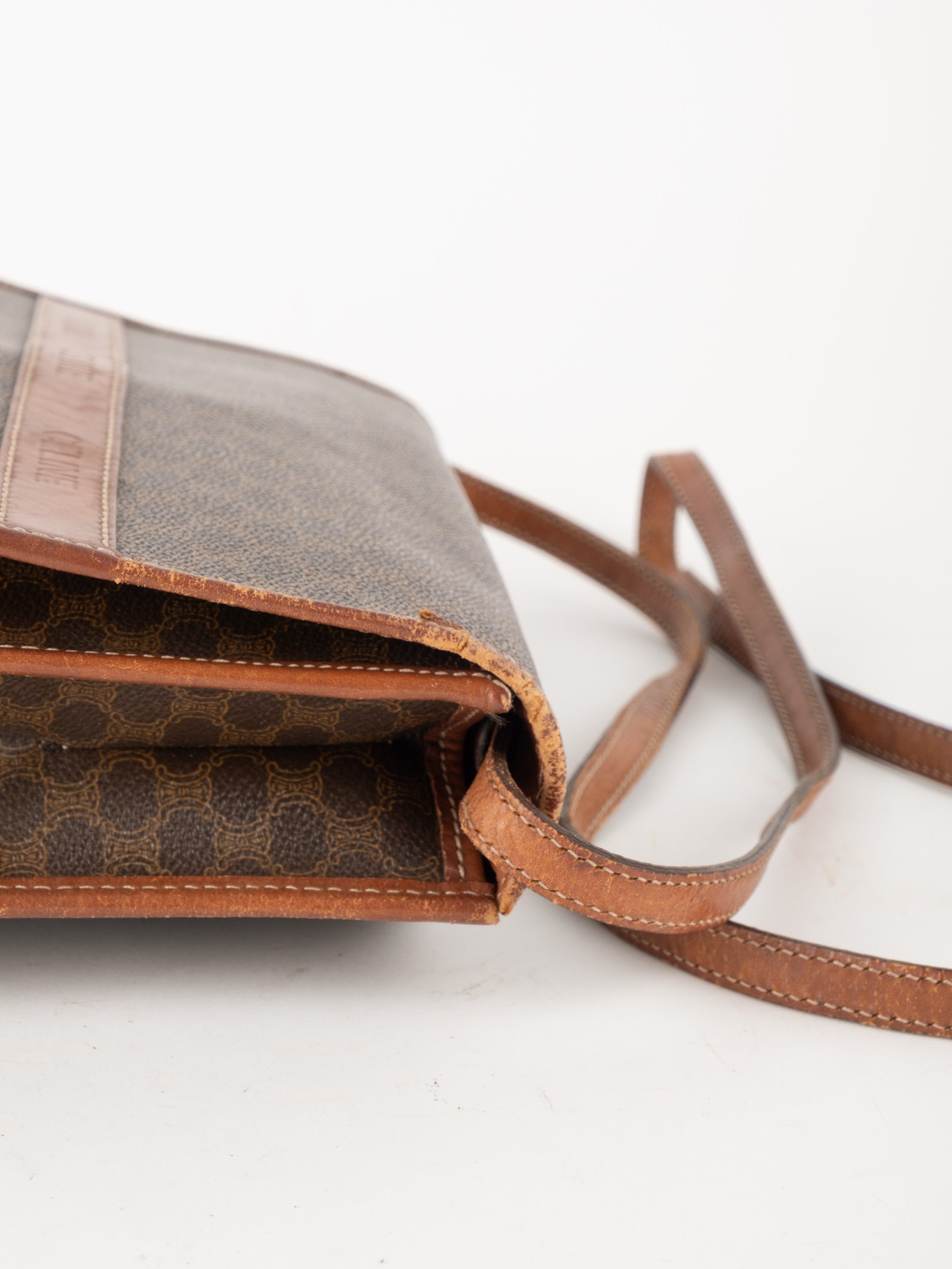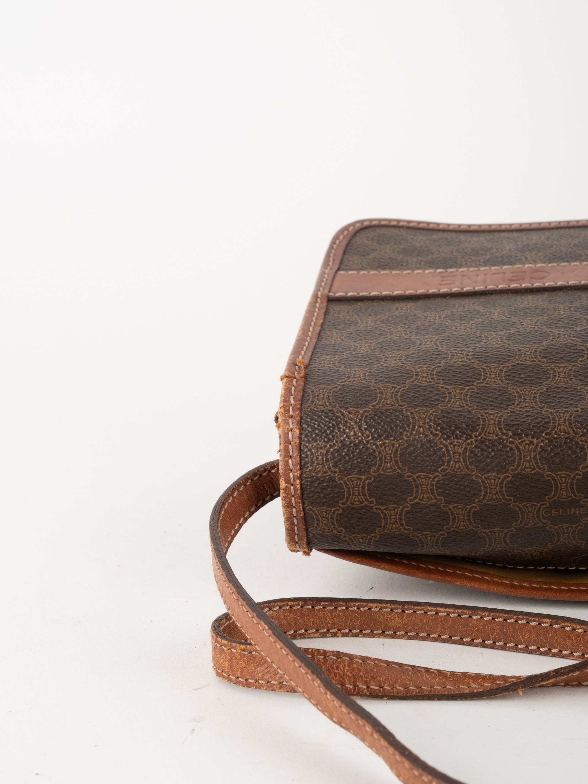סלין CELINE וינטג' יד שנייה בדוגמת Macadam בגווני חום עם פס עור קוניאק ורצועת כתף תואמת. תיק קרוסבודי קלאסי ועל־זמני עם נוכחות פריזאית שקטה ואלגנטית.