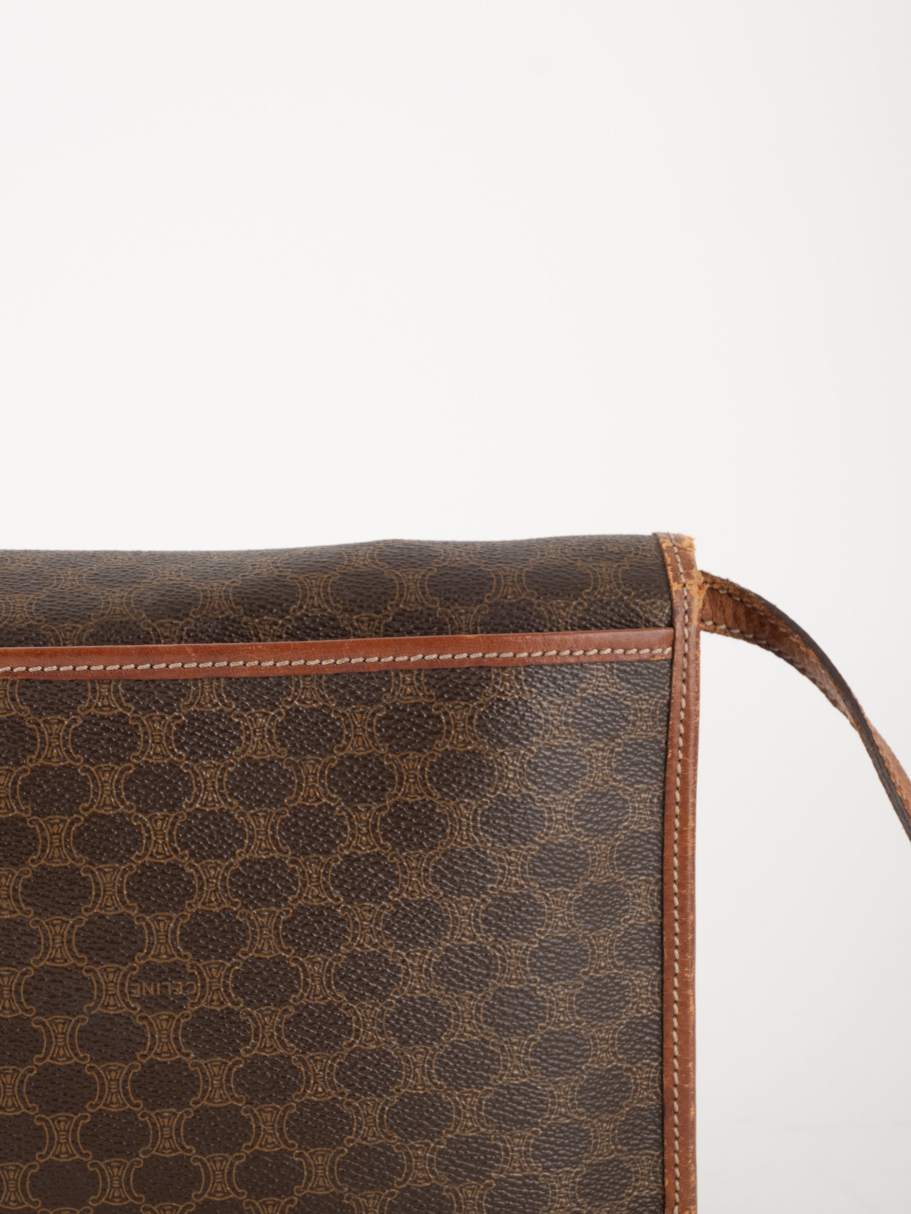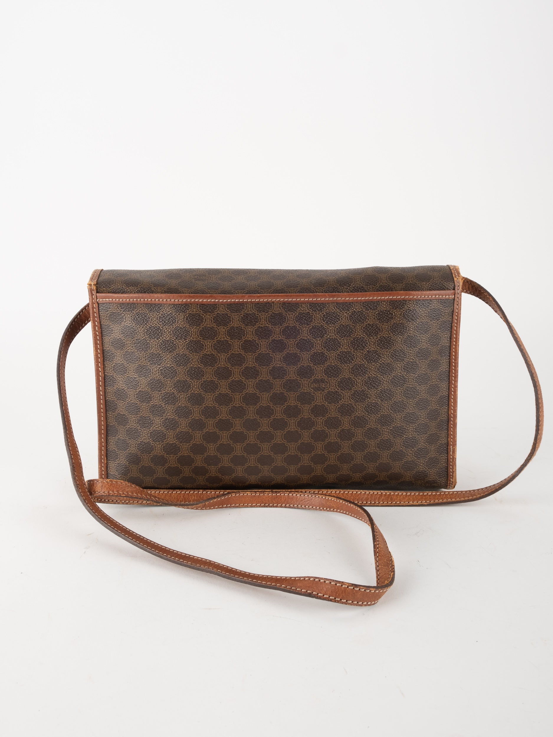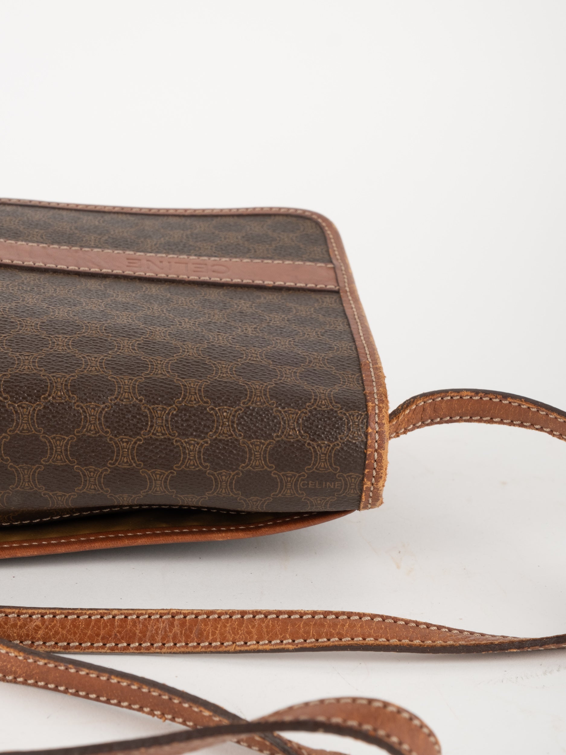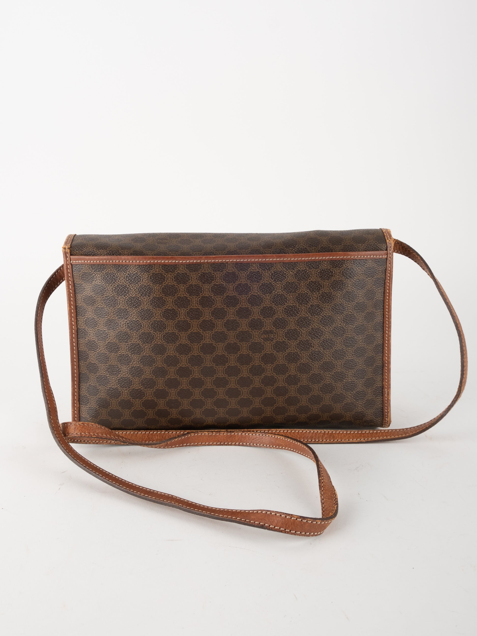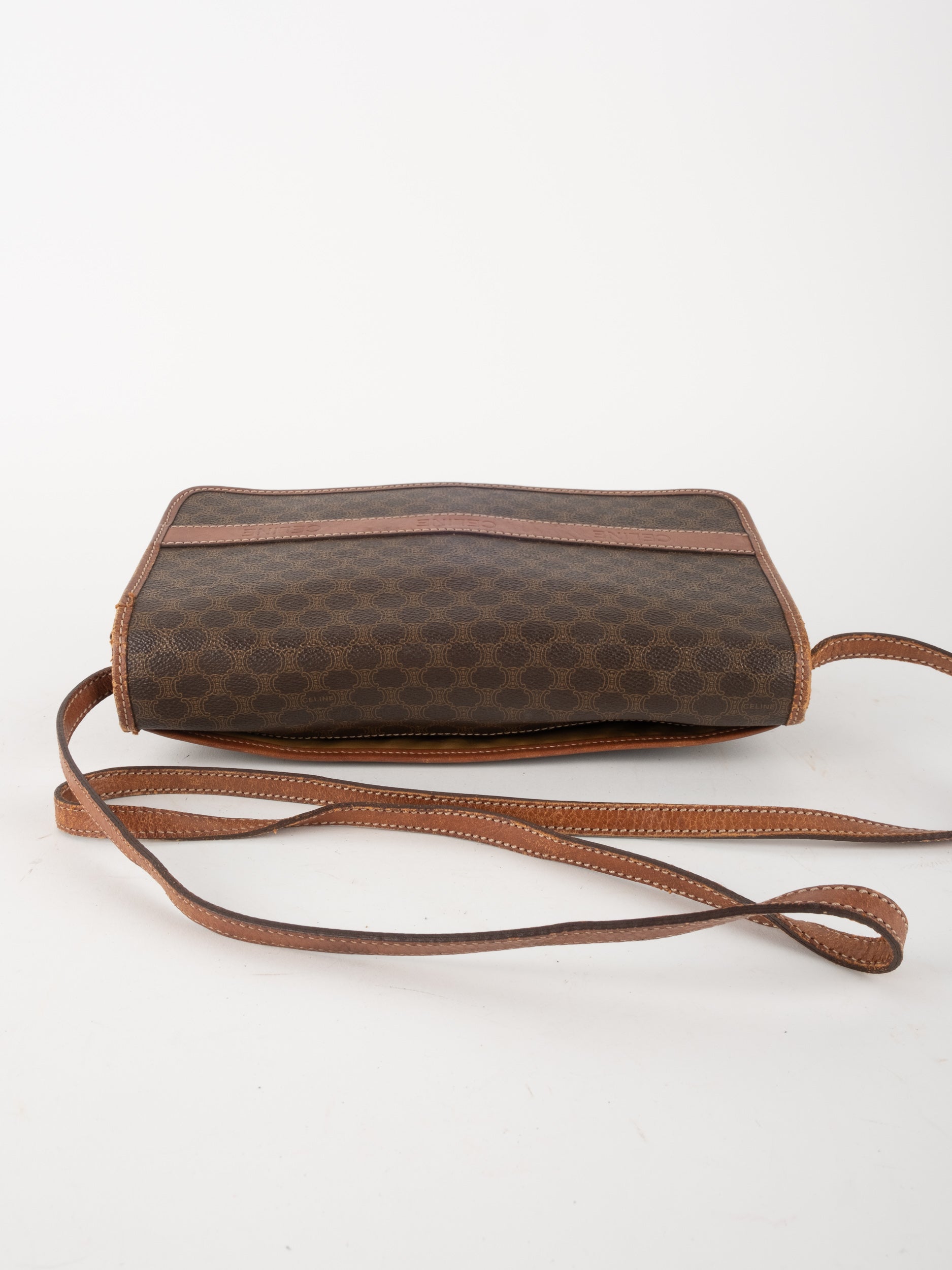 סלין CELINE וינטג' יד שנייה בדוגמת Macadam בגווני חום עם פס עור קוניאק ורצועת כתף תואמת. תיק קרוסבודי קלאסי ועל־זמני עם נוכחות פריזאית שקטה ואלגנטית.