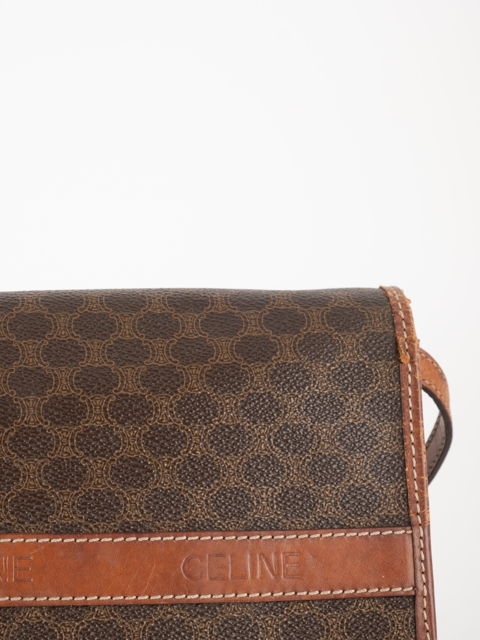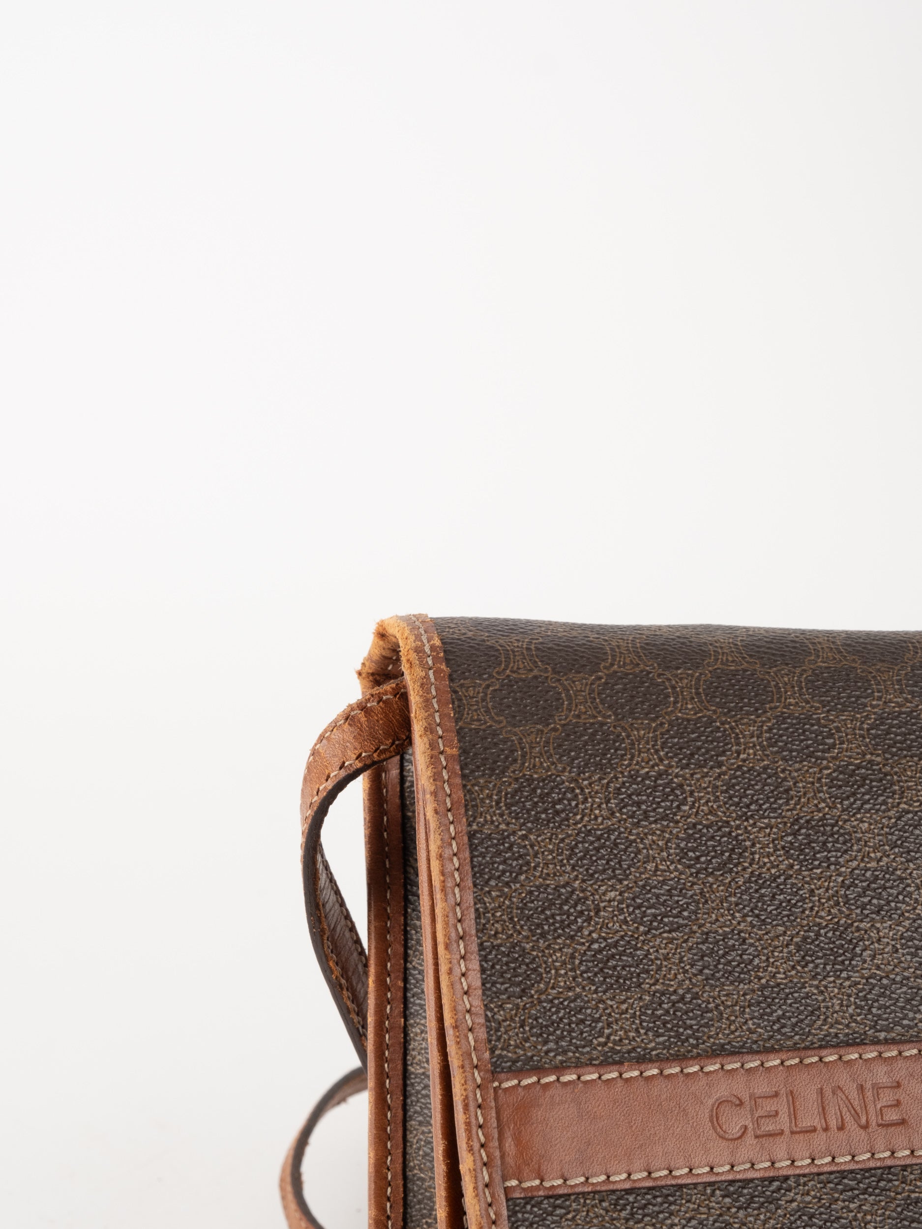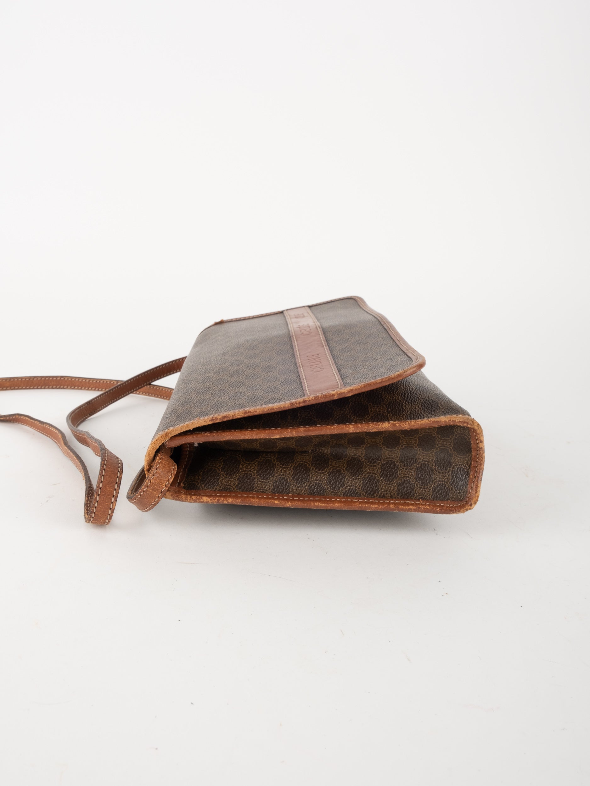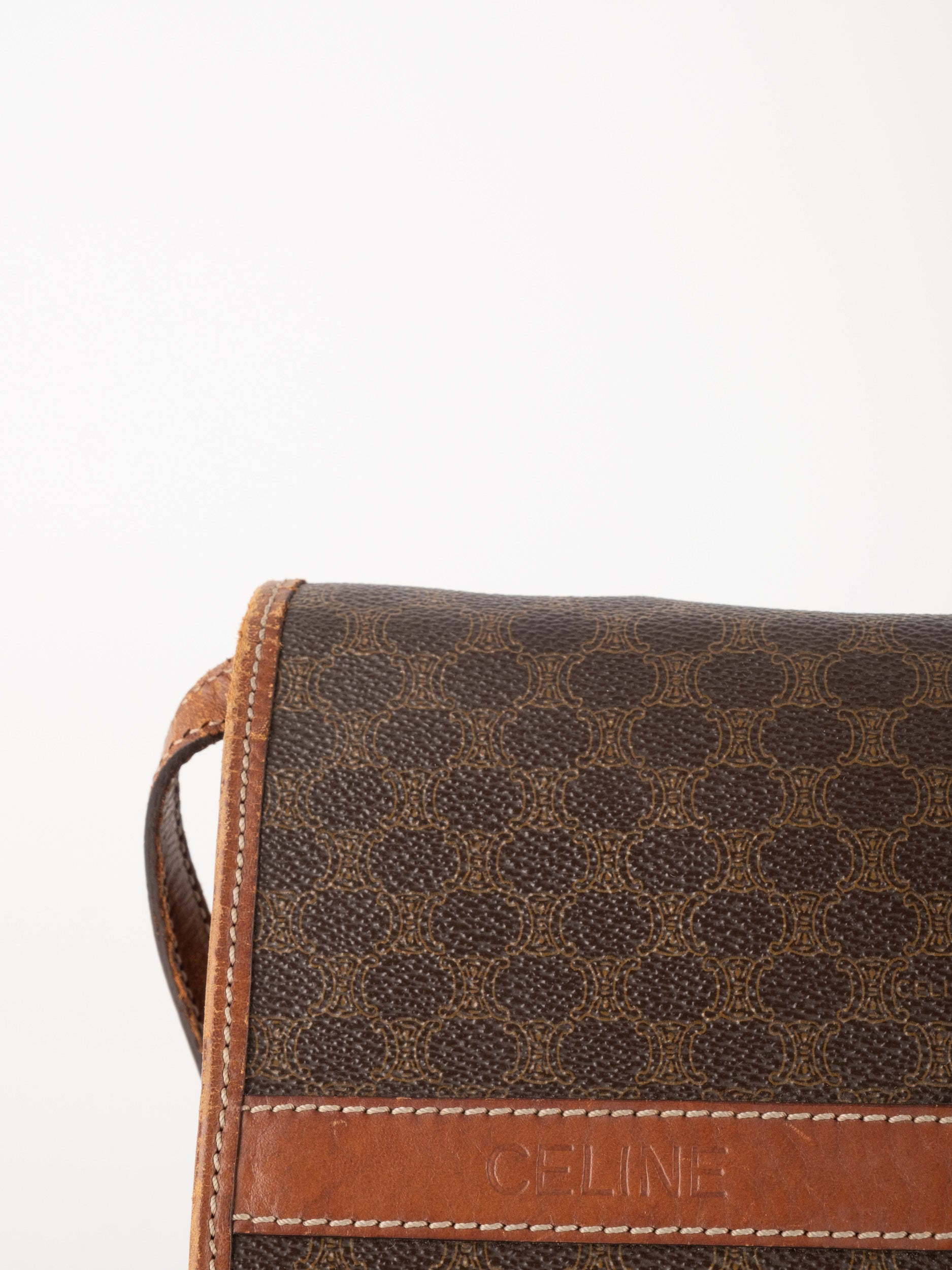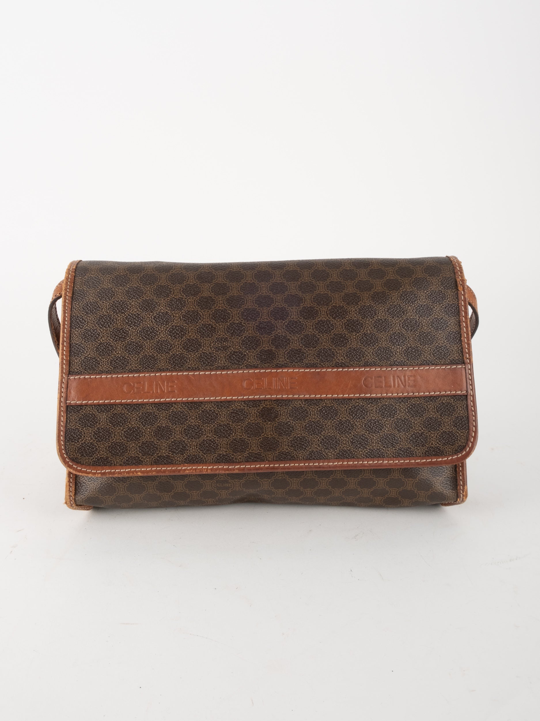 סלין CELINE וינטג' יד שנייה בדוגמת Macadam בגווני חום עם פס עור קוניאק ורצועת כתף תואמת. תיק קרוסבודי קלאסי ועל־זמני עם נוכחות פריזאית שקטה ואלגנטית.