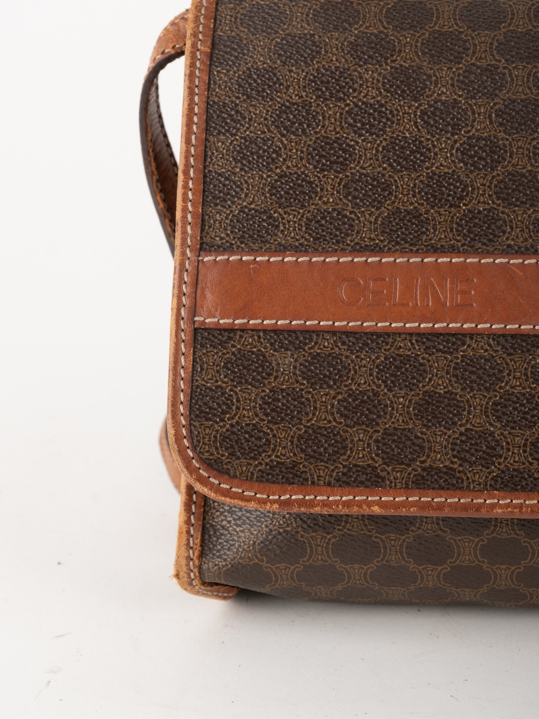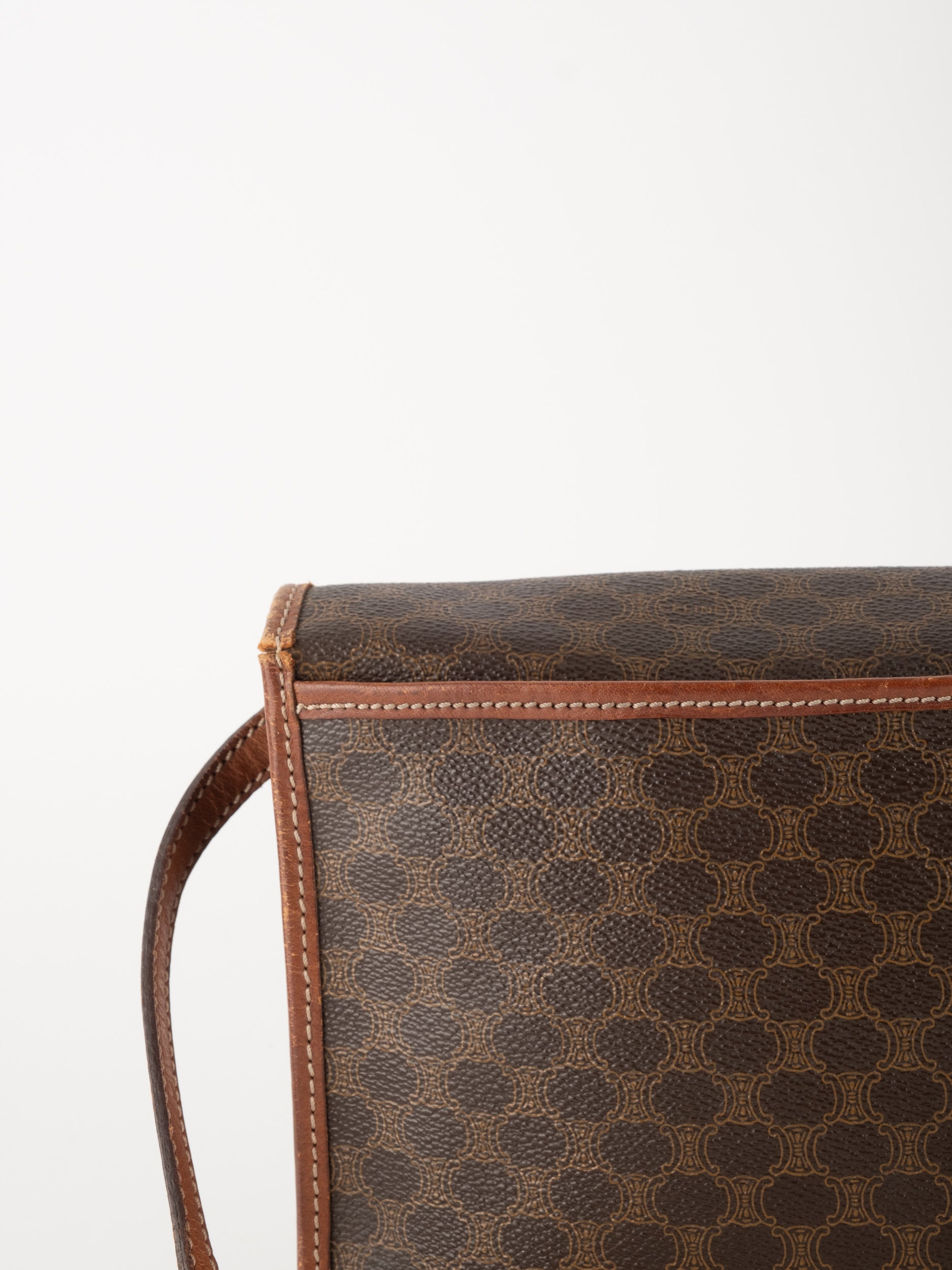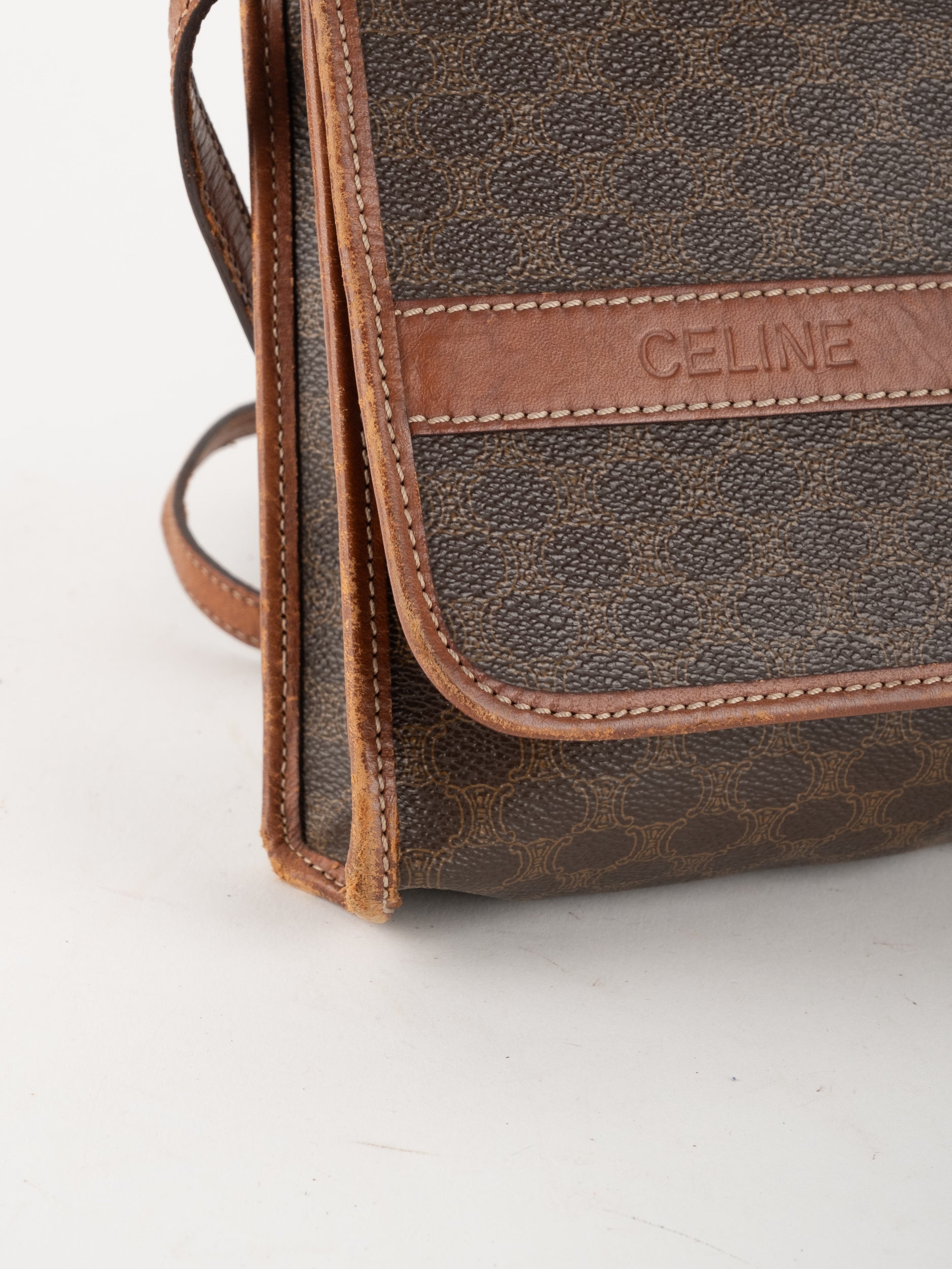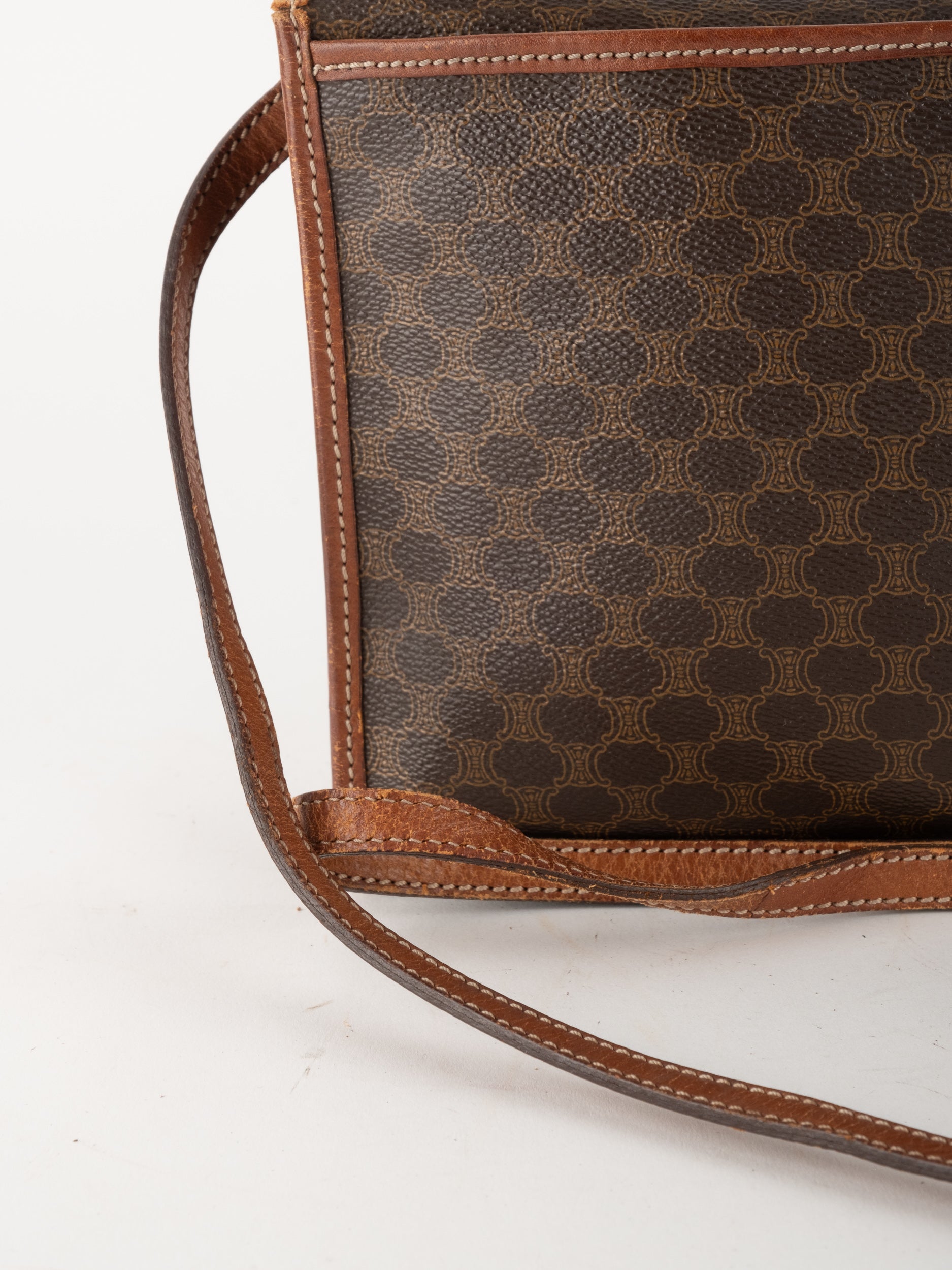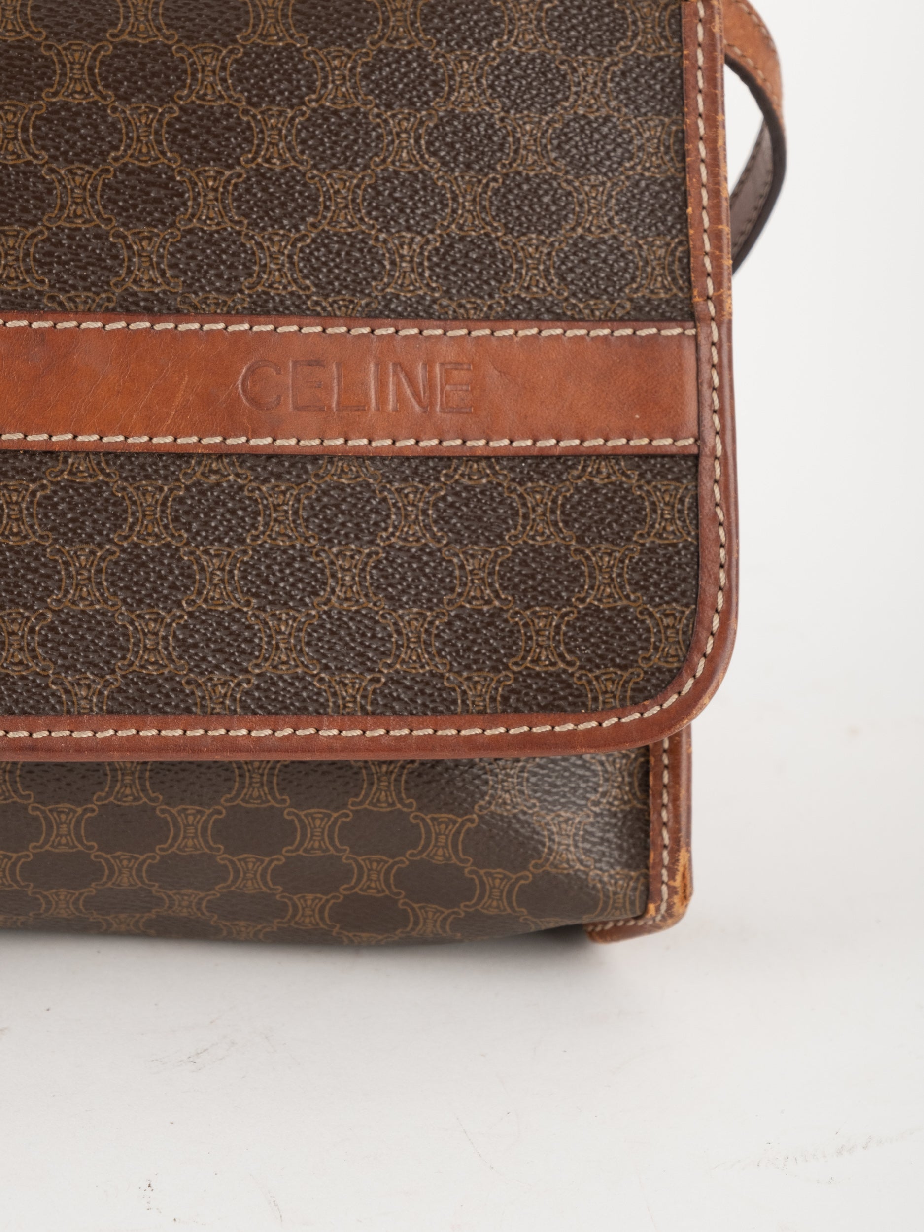 סלין CELINE וינטג' יד שנייה בדוגמת Macadam בגווני חום עם פס עור קוניאק ורצועת כתף תואמת. תיק קרוסבודי קלאסי ועל־זמני עם נוכחות פריזאית שקטה ואלגנטית.