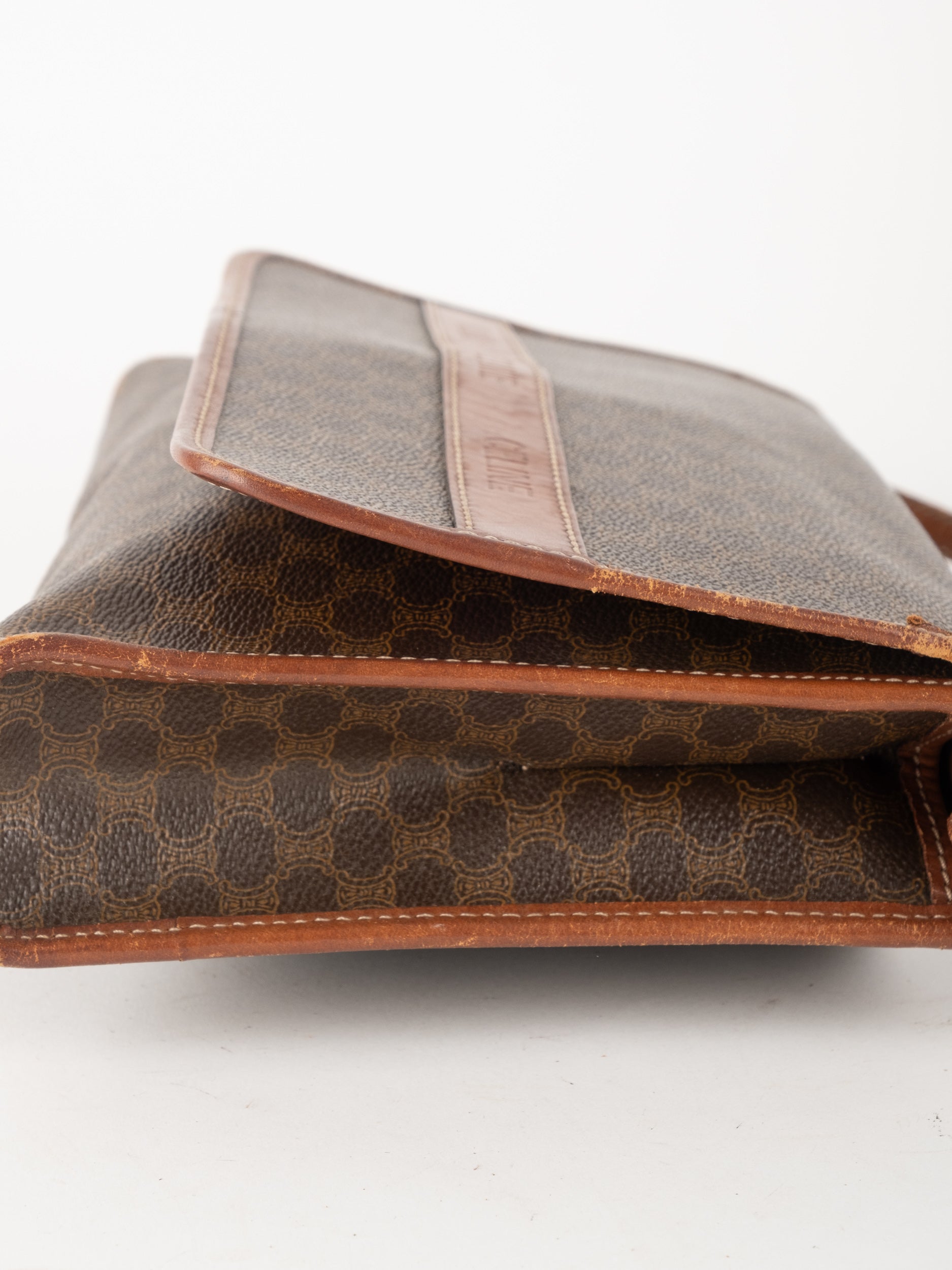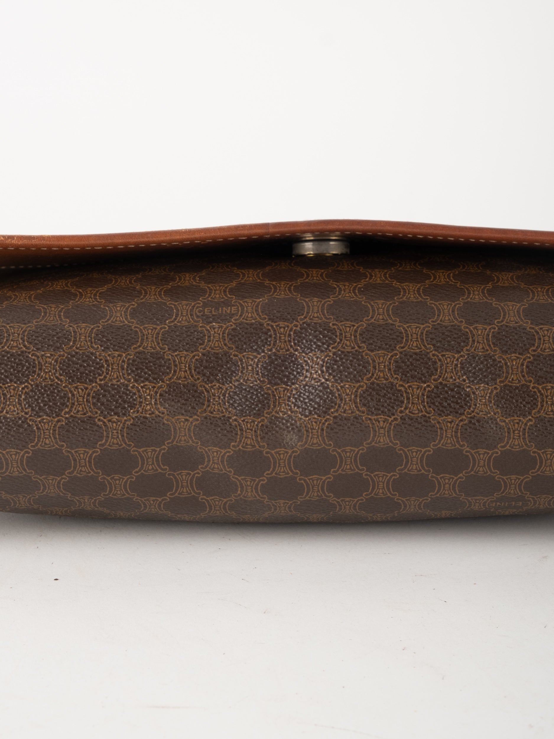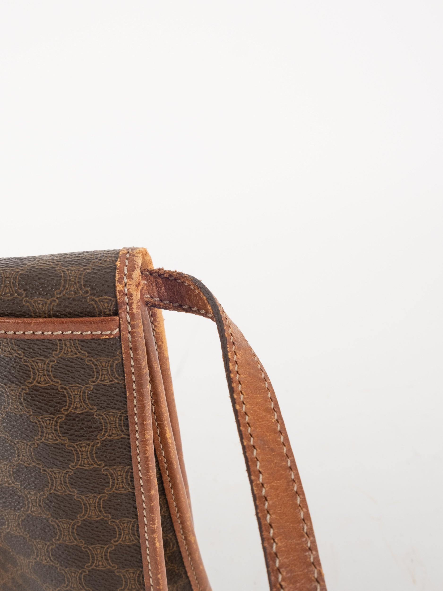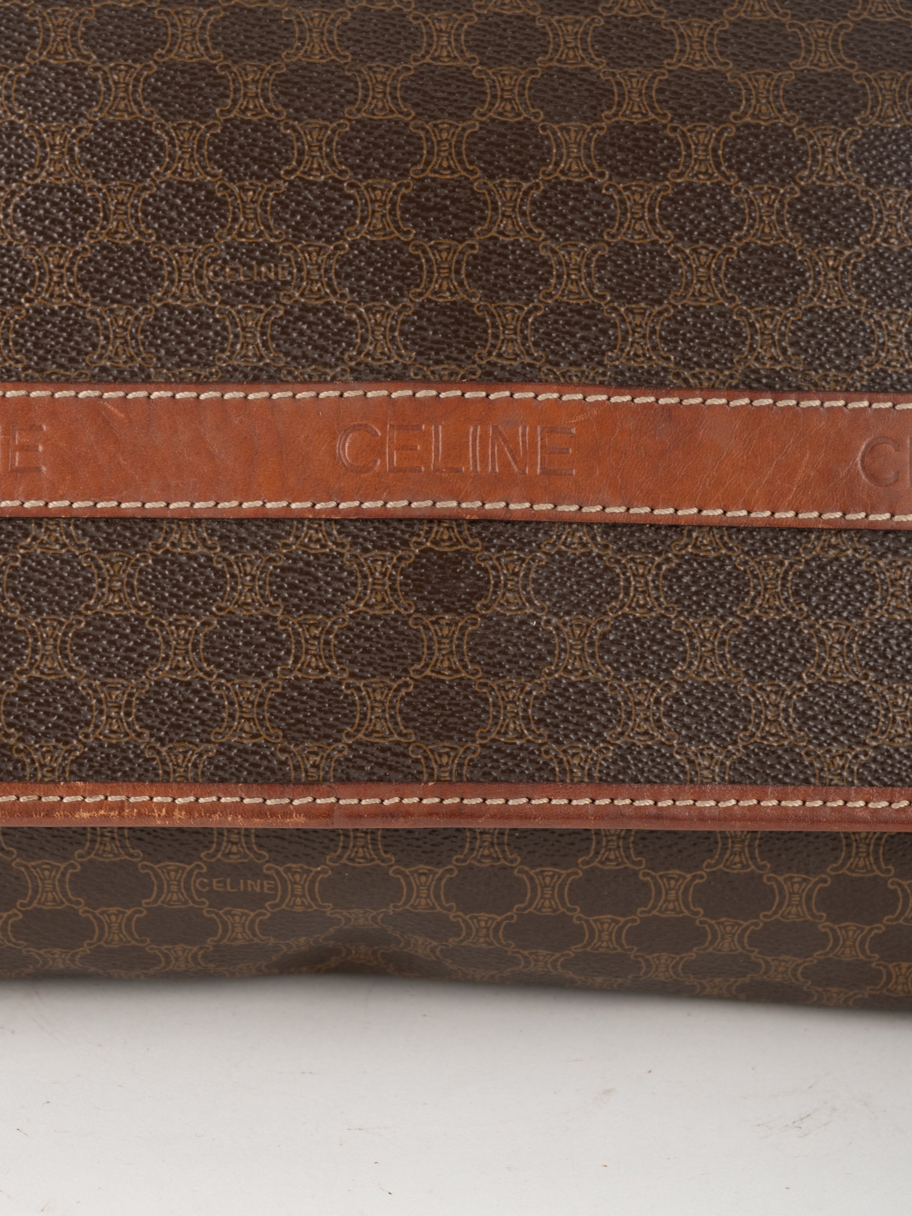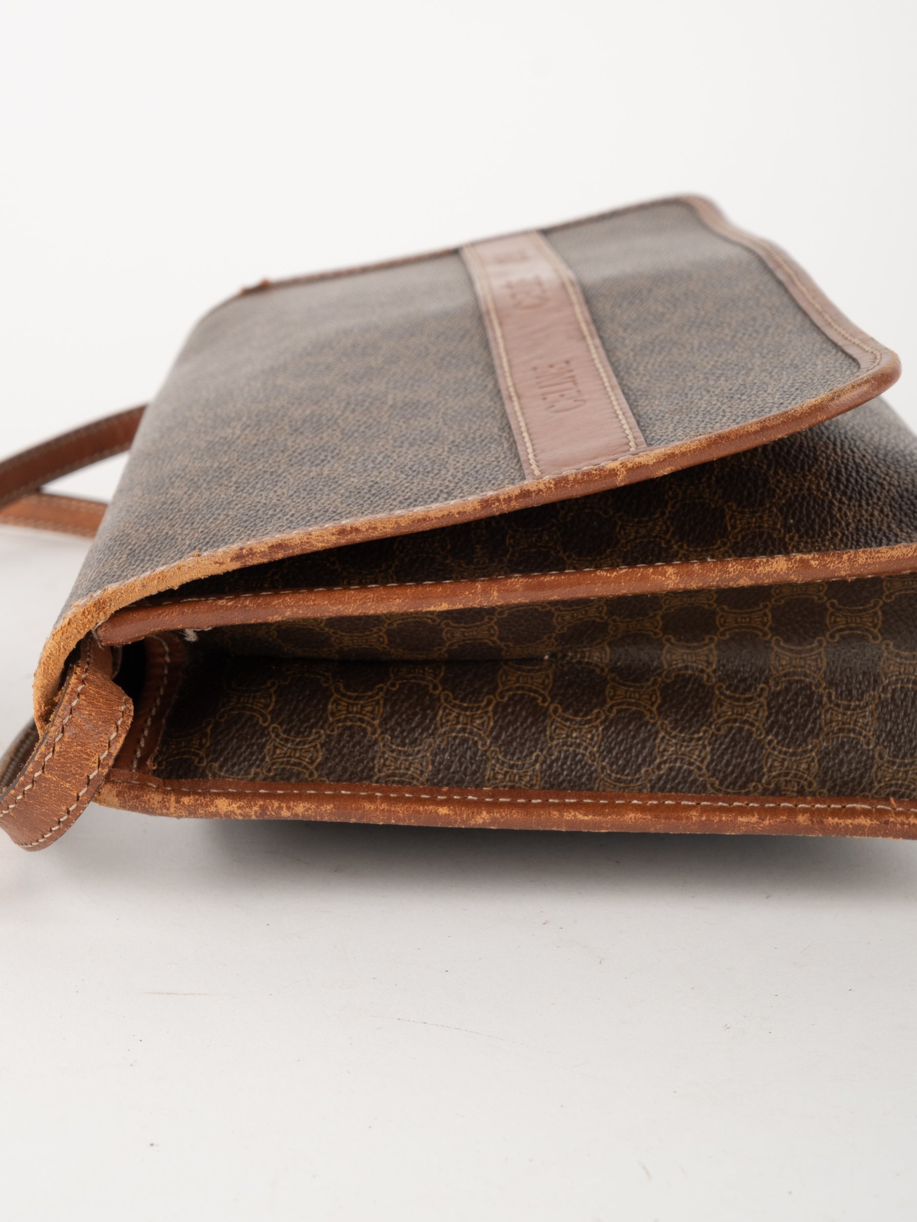 סלין CELINE וינטג' יד שנייה בדוגמת Macadam בגווני חום עם פס עור קוניאק ורצועת כתף תואמת. תיק קרוסבודי קלאסי ועל־זמני עם נוכחות פריזאית שקטה ואלגנטית.