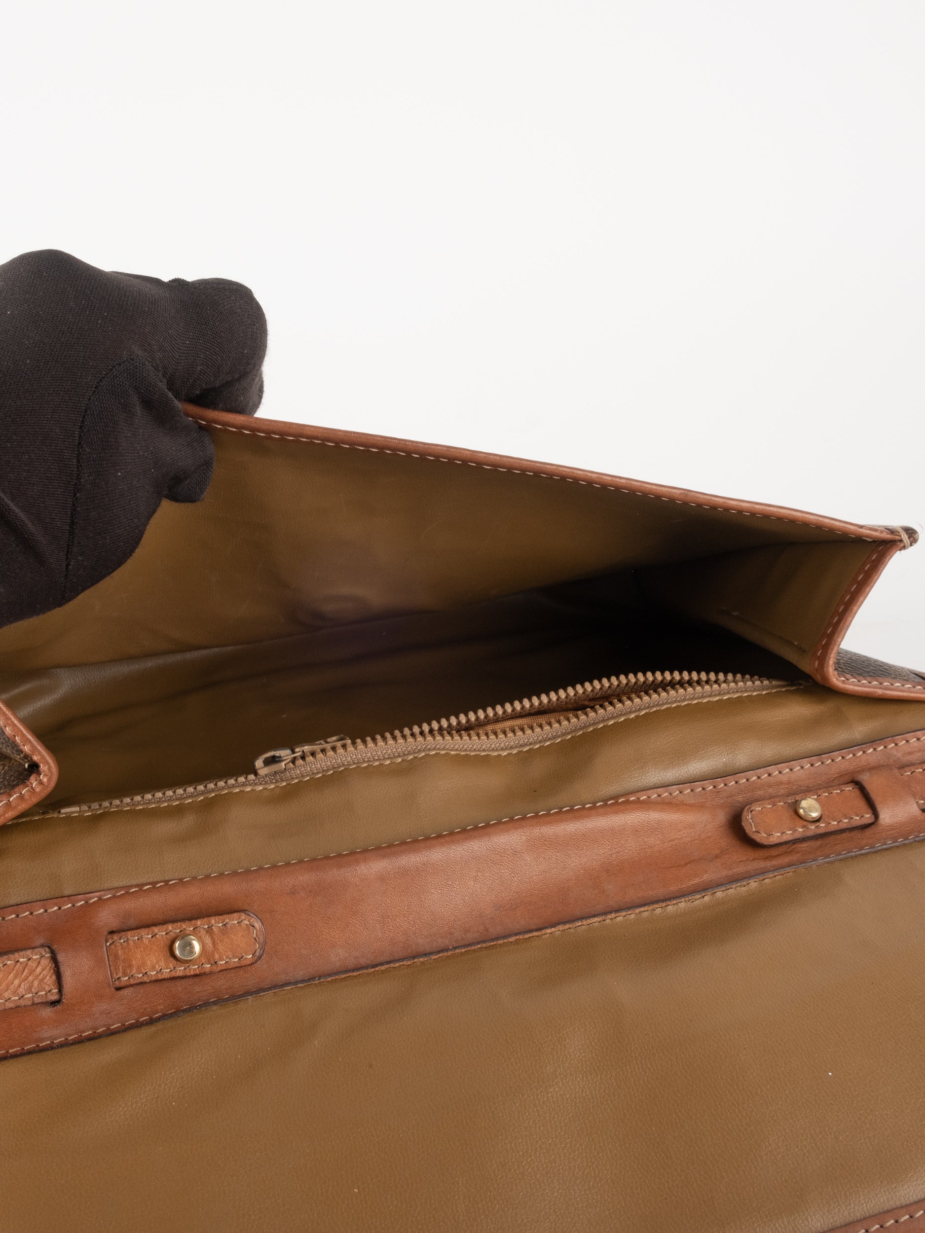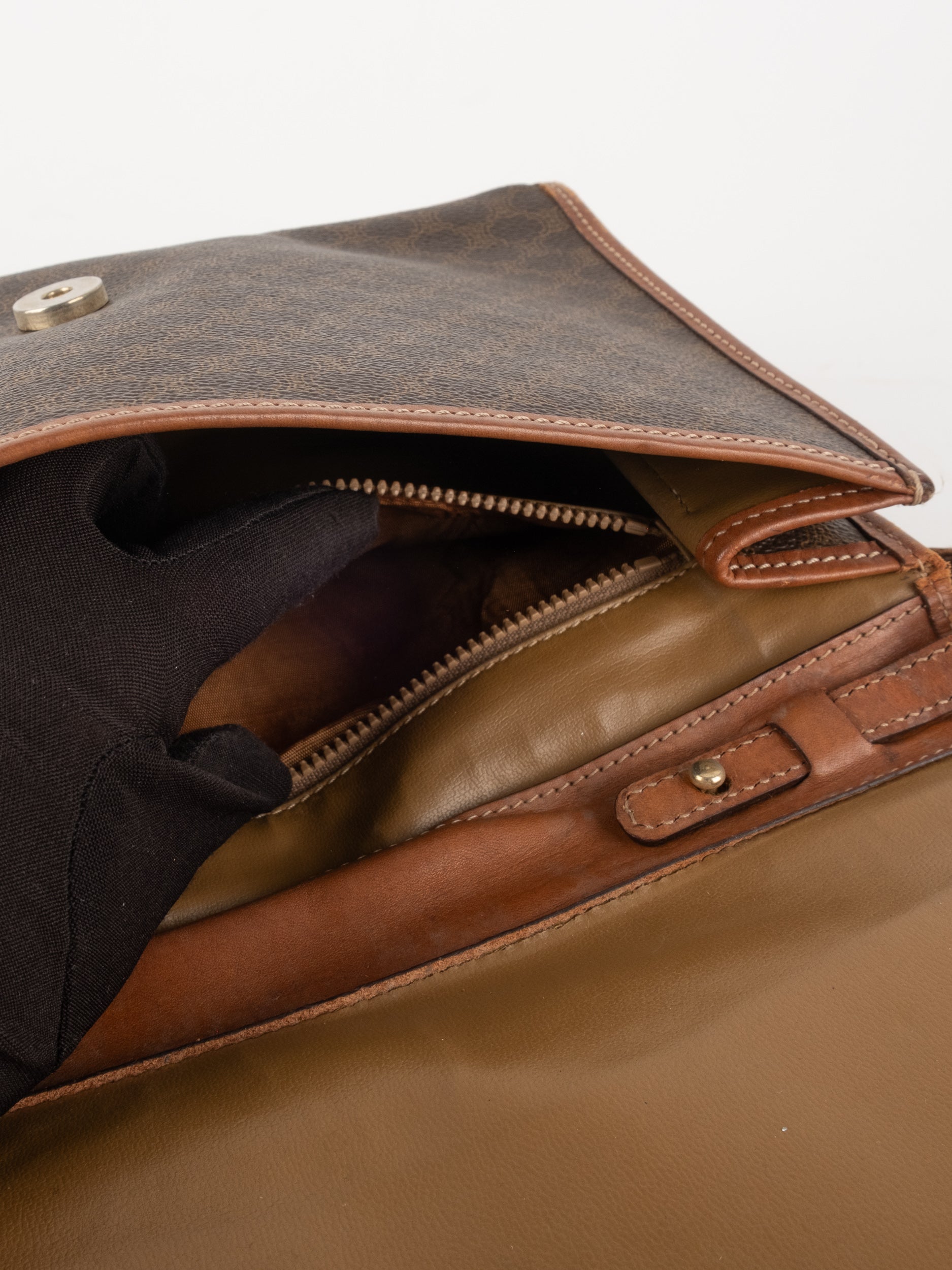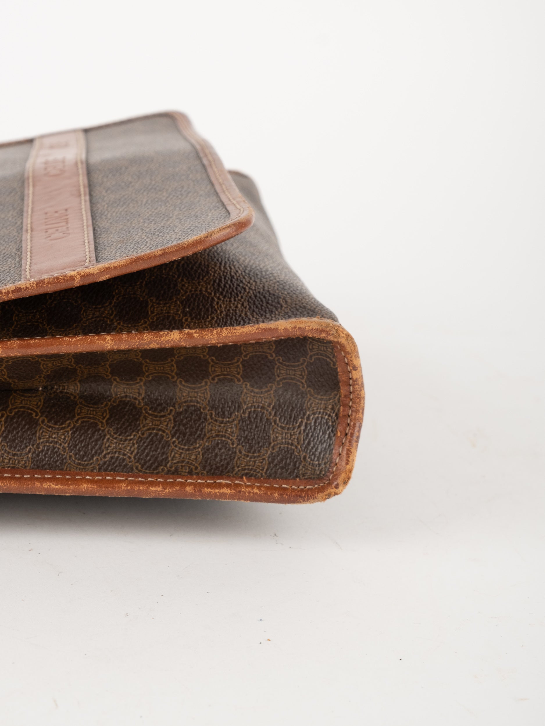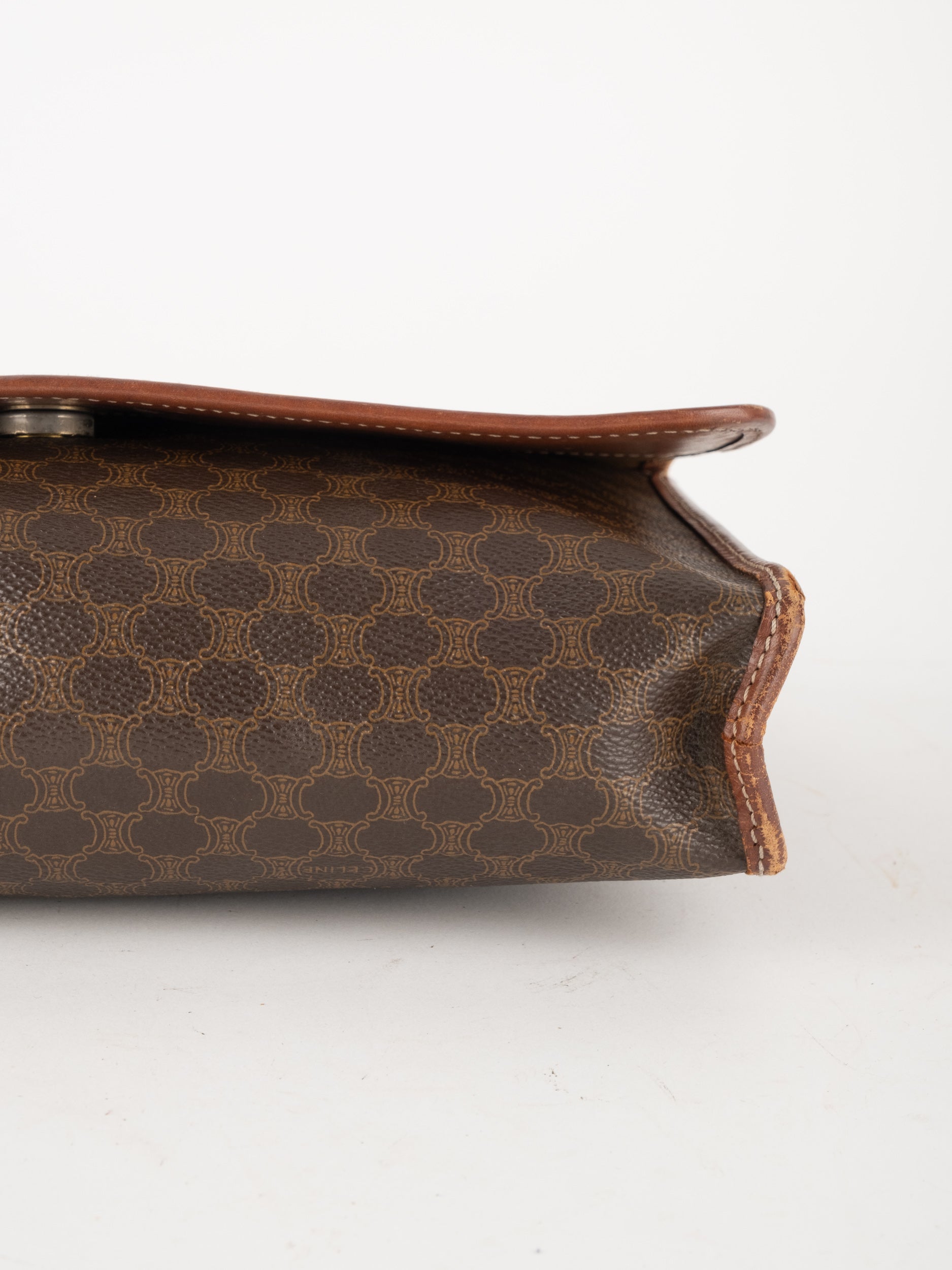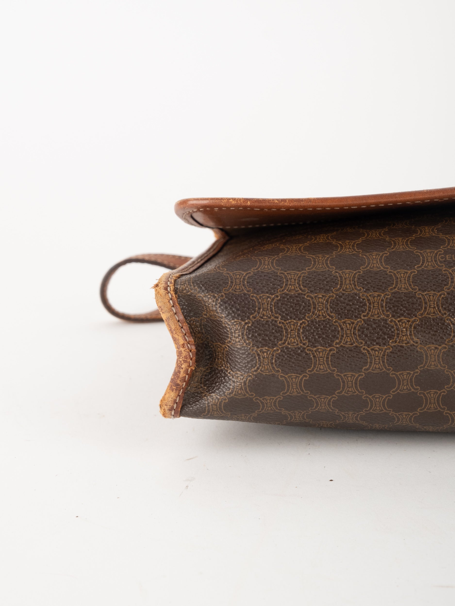 סלין CELINE וינטג' יד שנייה בדוגמת Macadam בגווני חום עם פס עור קוניאק ורצועת כתף תואמת. תיק קרוסבודי קלאסי ועל־זמני עם נוכחות פריזאית שקטה ואלגנטית.