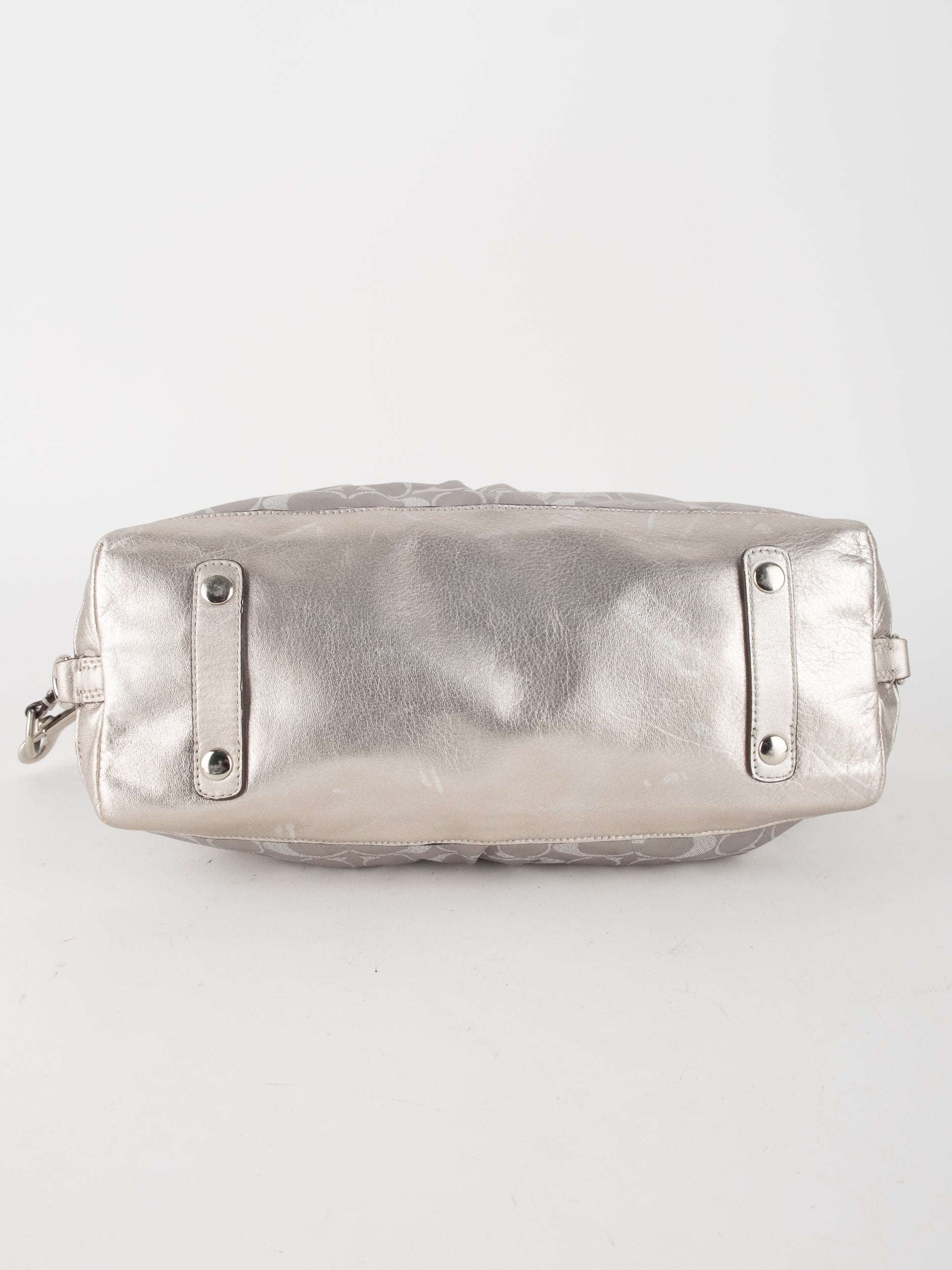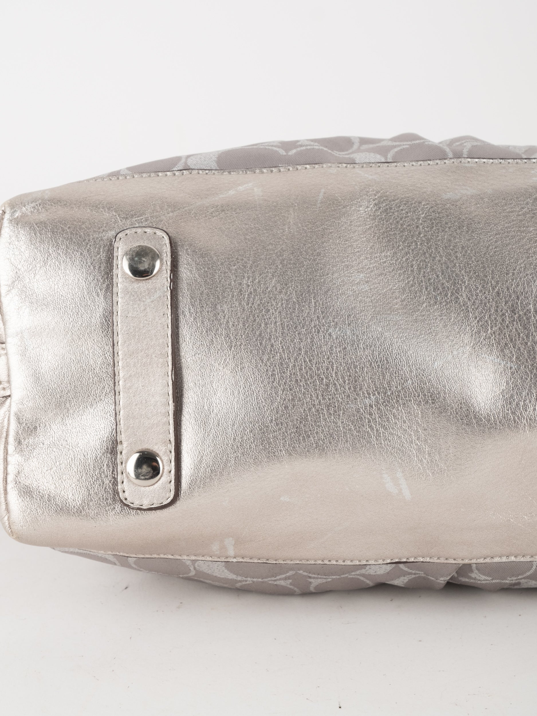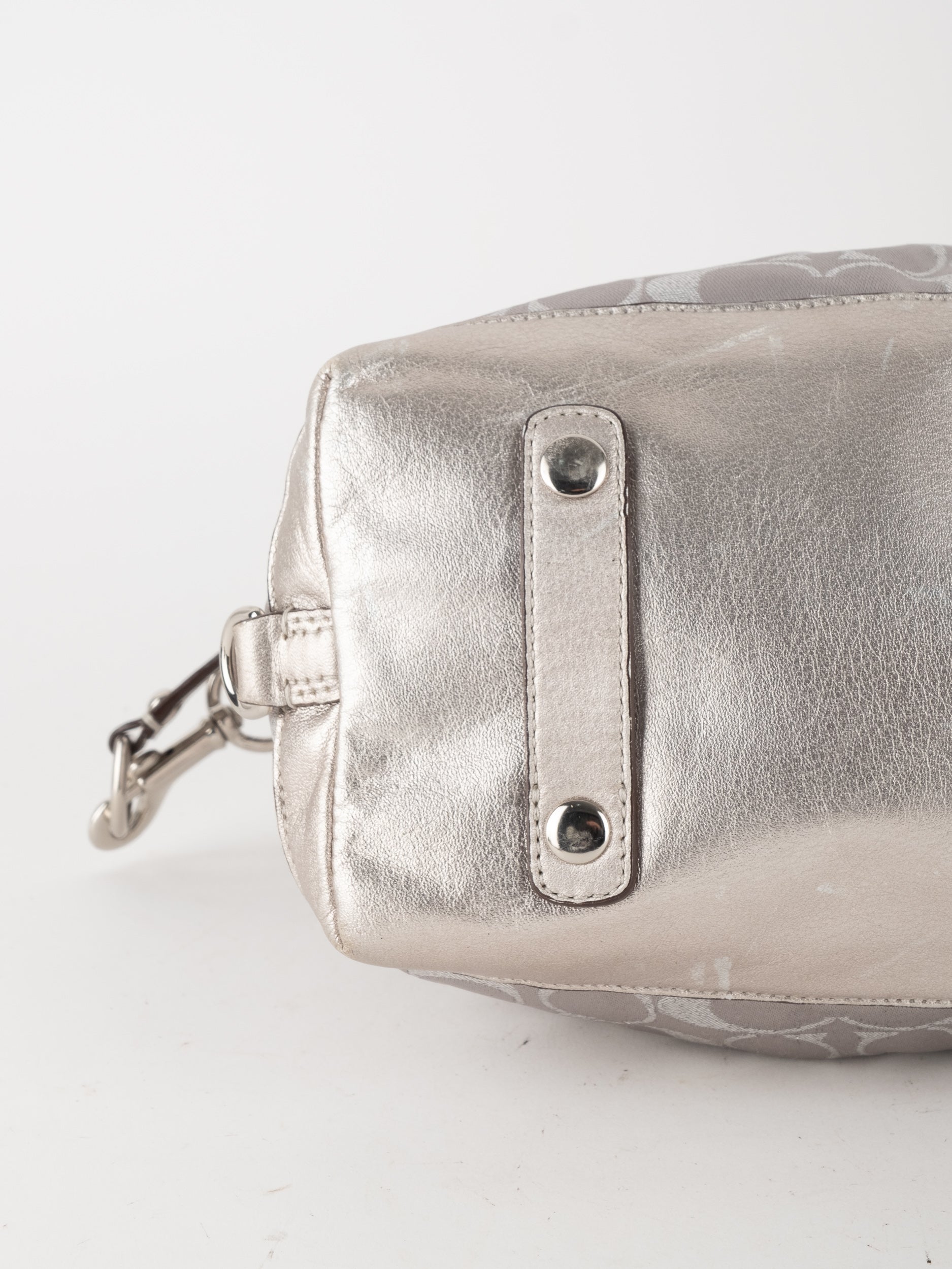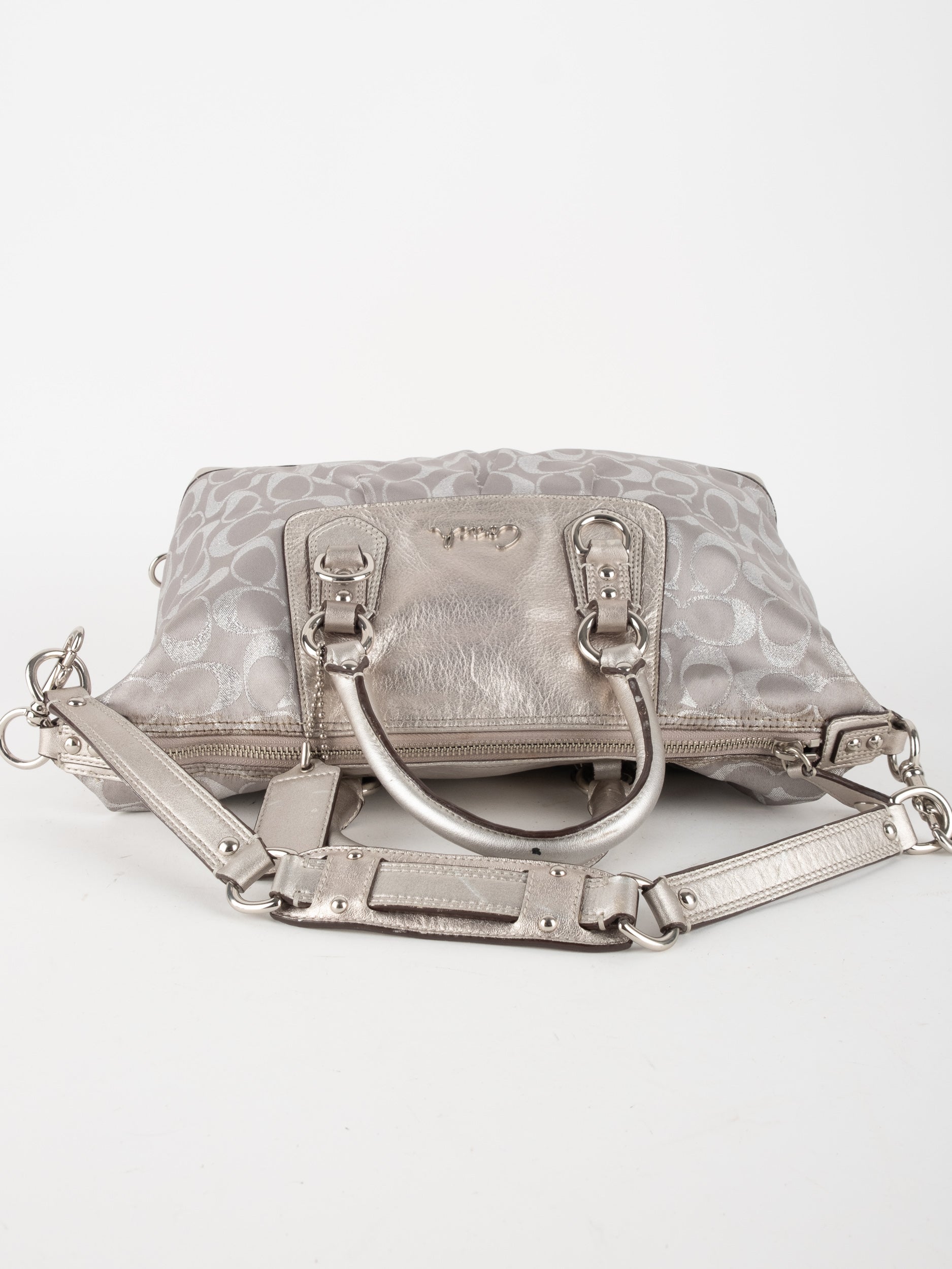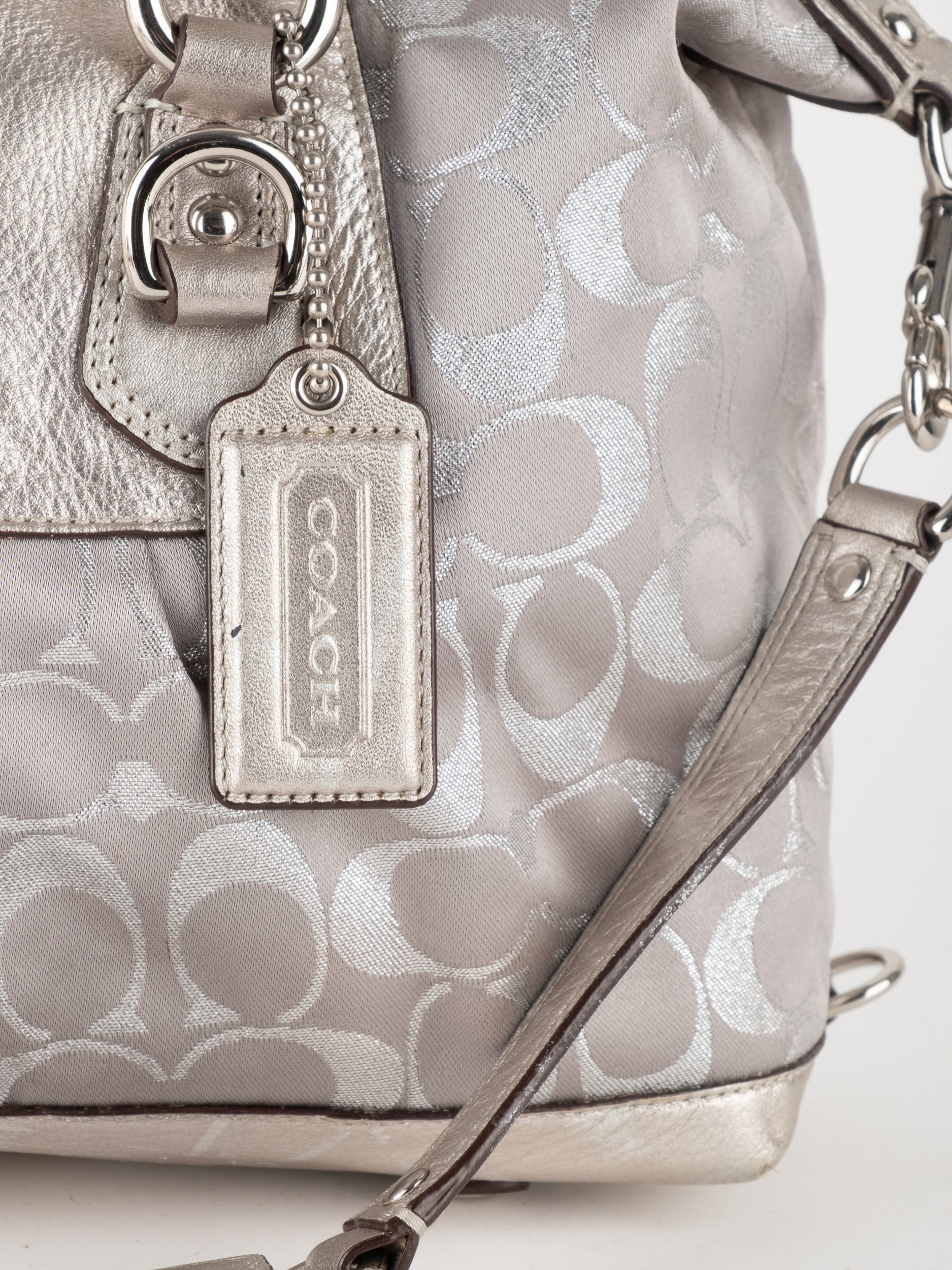 התיק עשוי בד Signature בשילוב עור מטאלי כסוף. כולל ידיות נשיאה ורצועת כתף נשלפת לנשיאה מגוונת.
