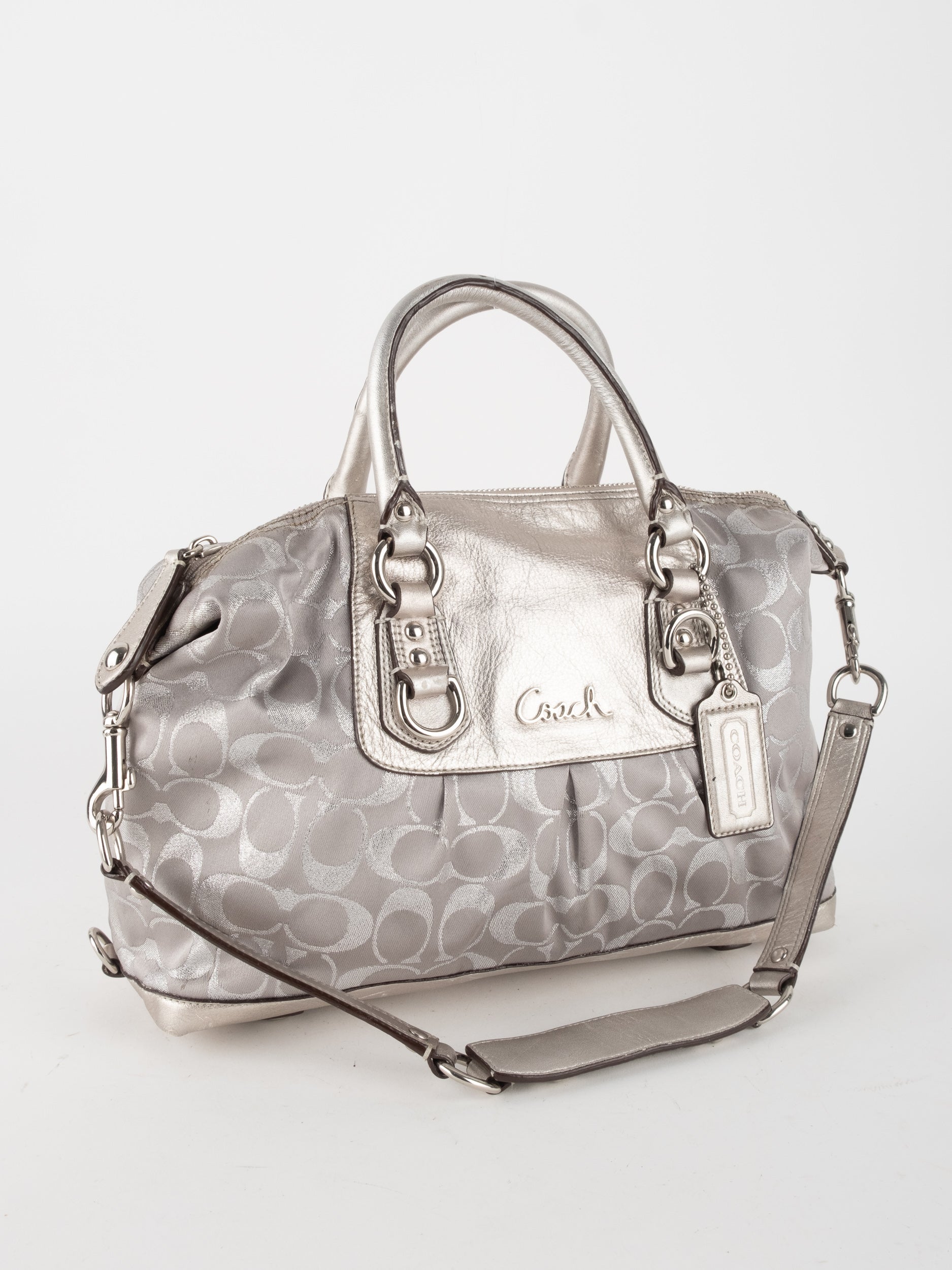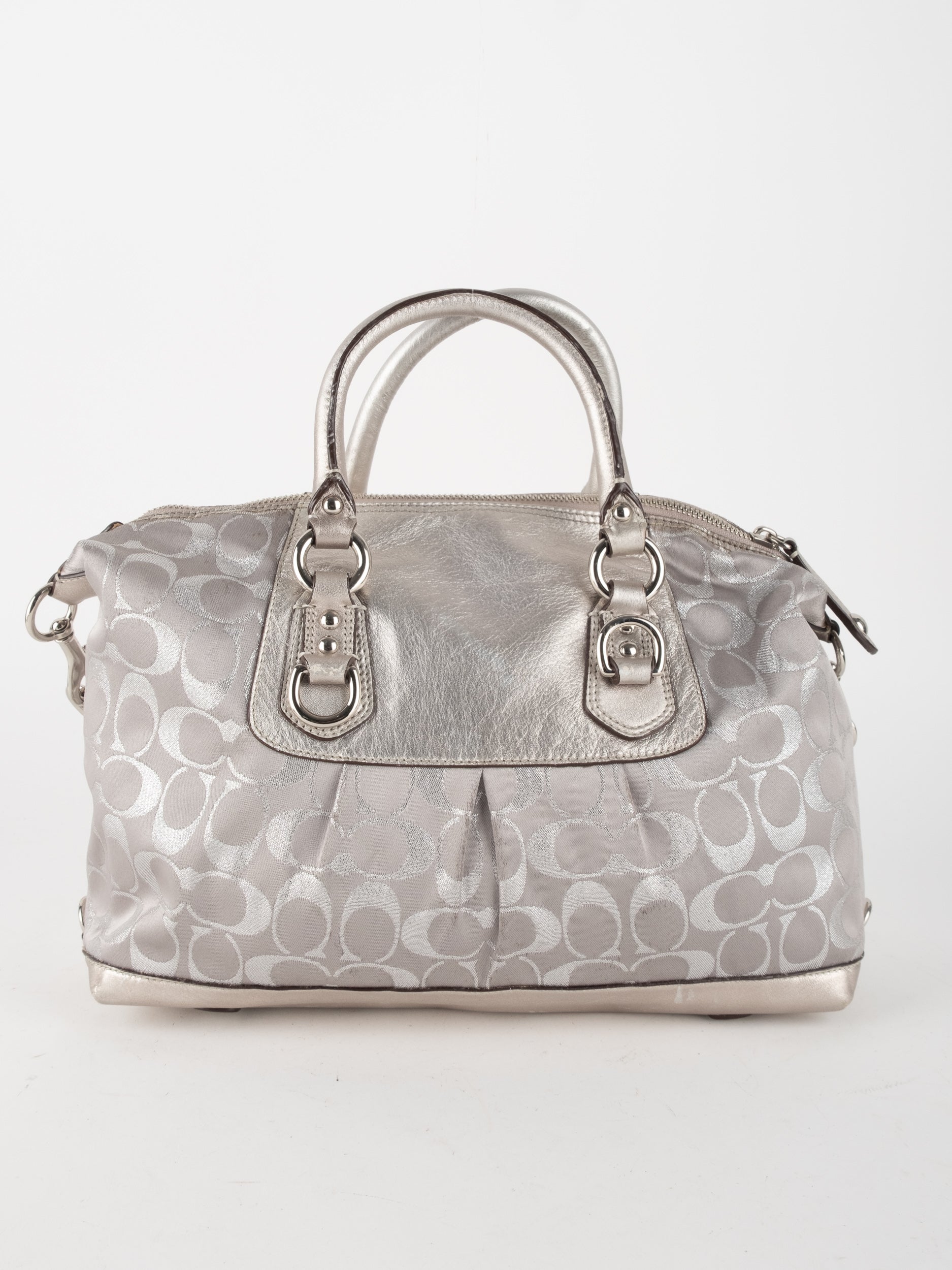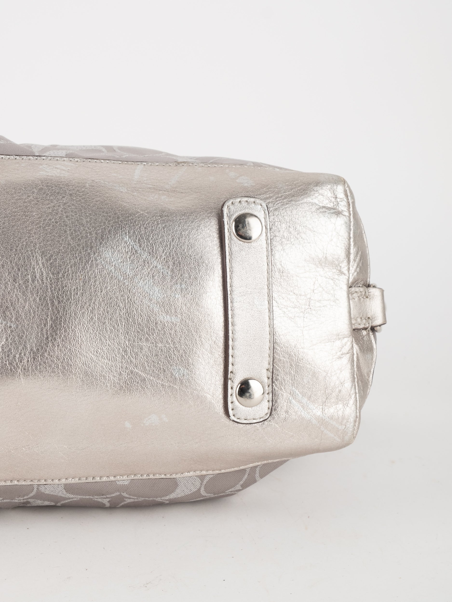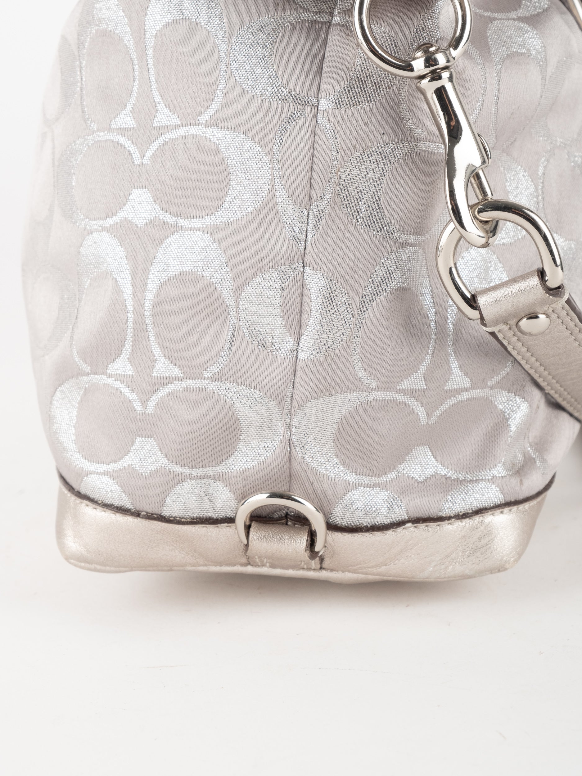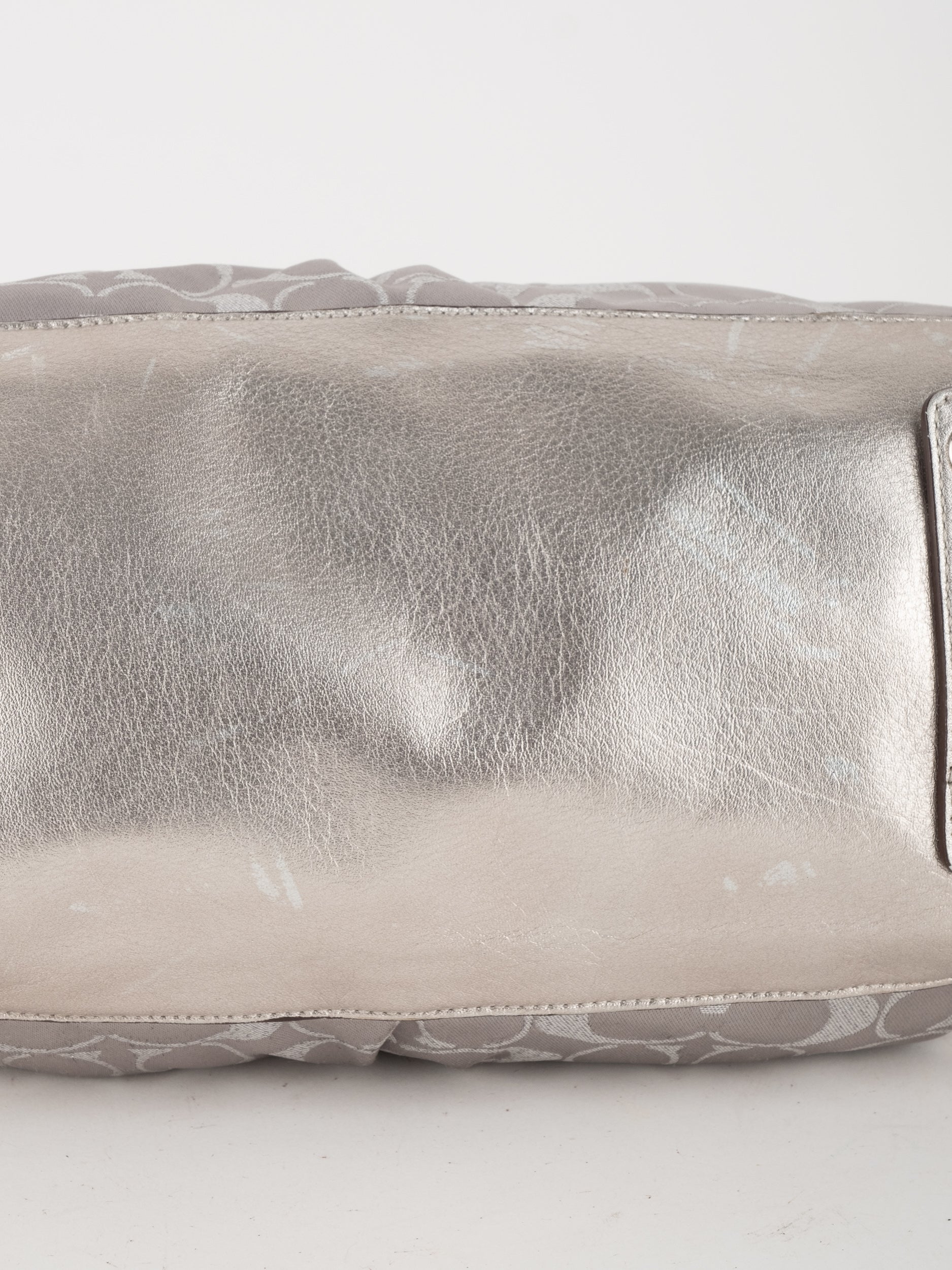 התיק עשוי בד Signature בשילוב עור מטאלי כסוף. כולל ידיות נשיאה ורצועת כתף נשלפת לנשיאה מגוונת.