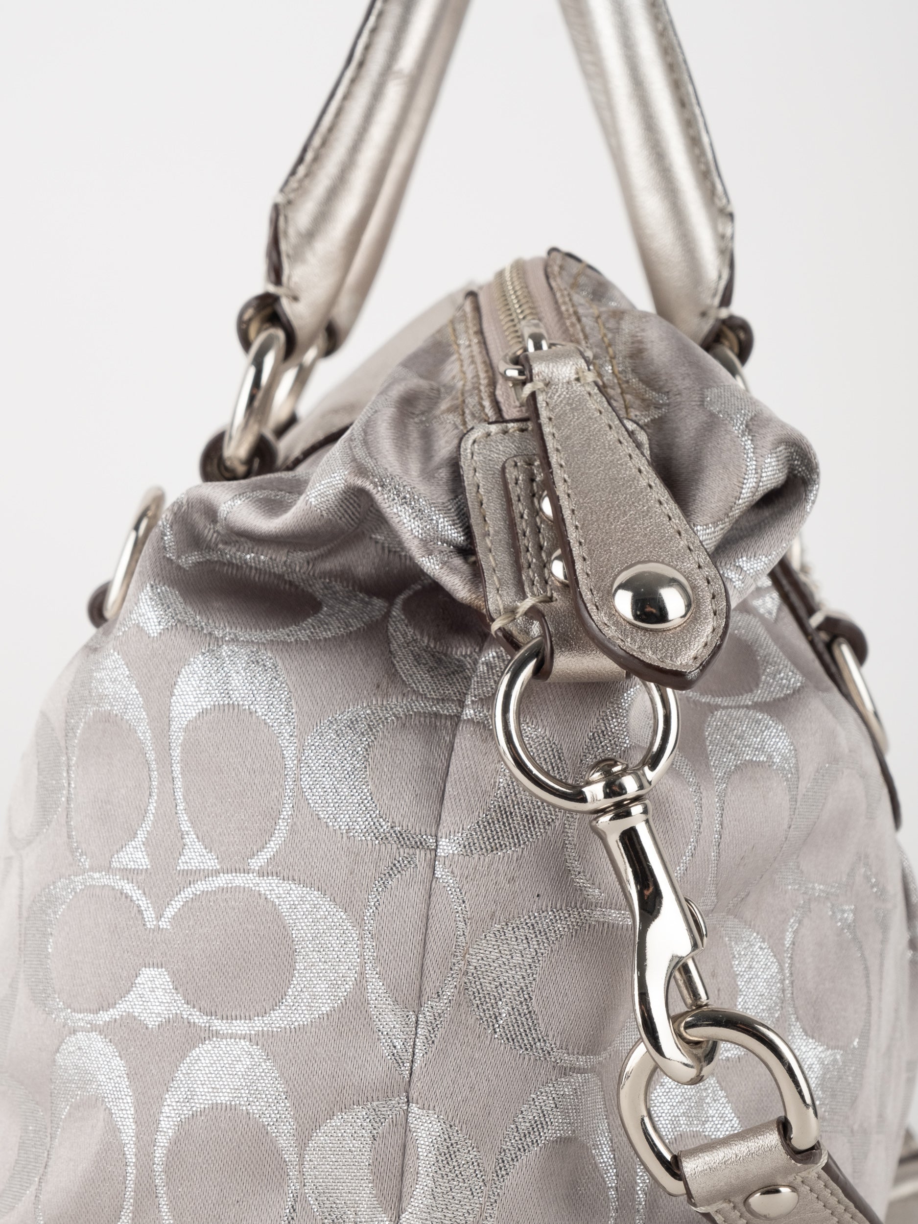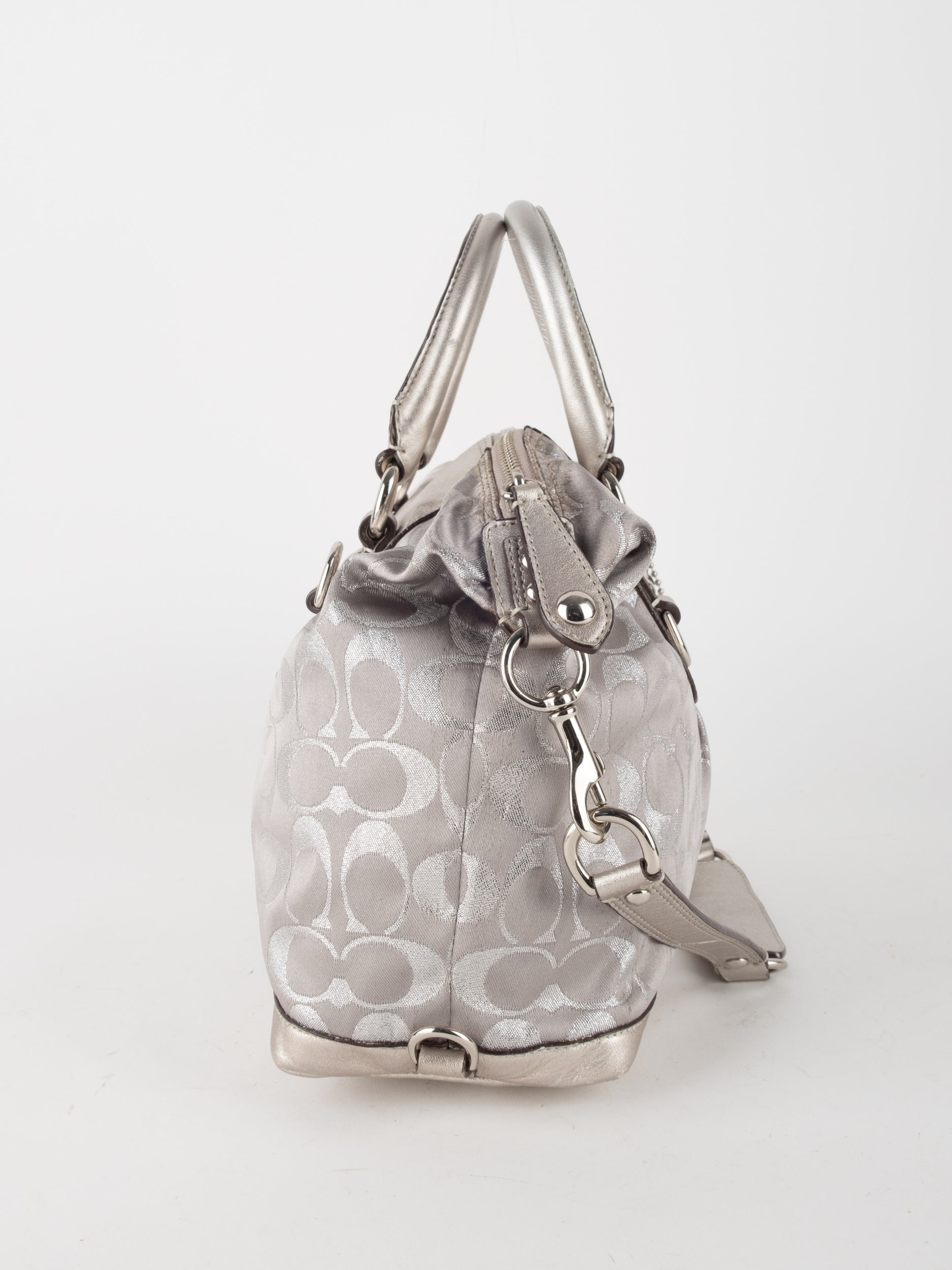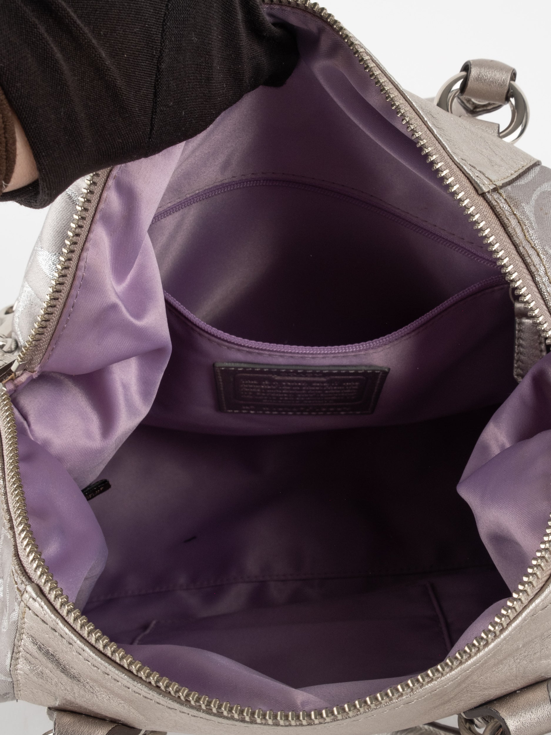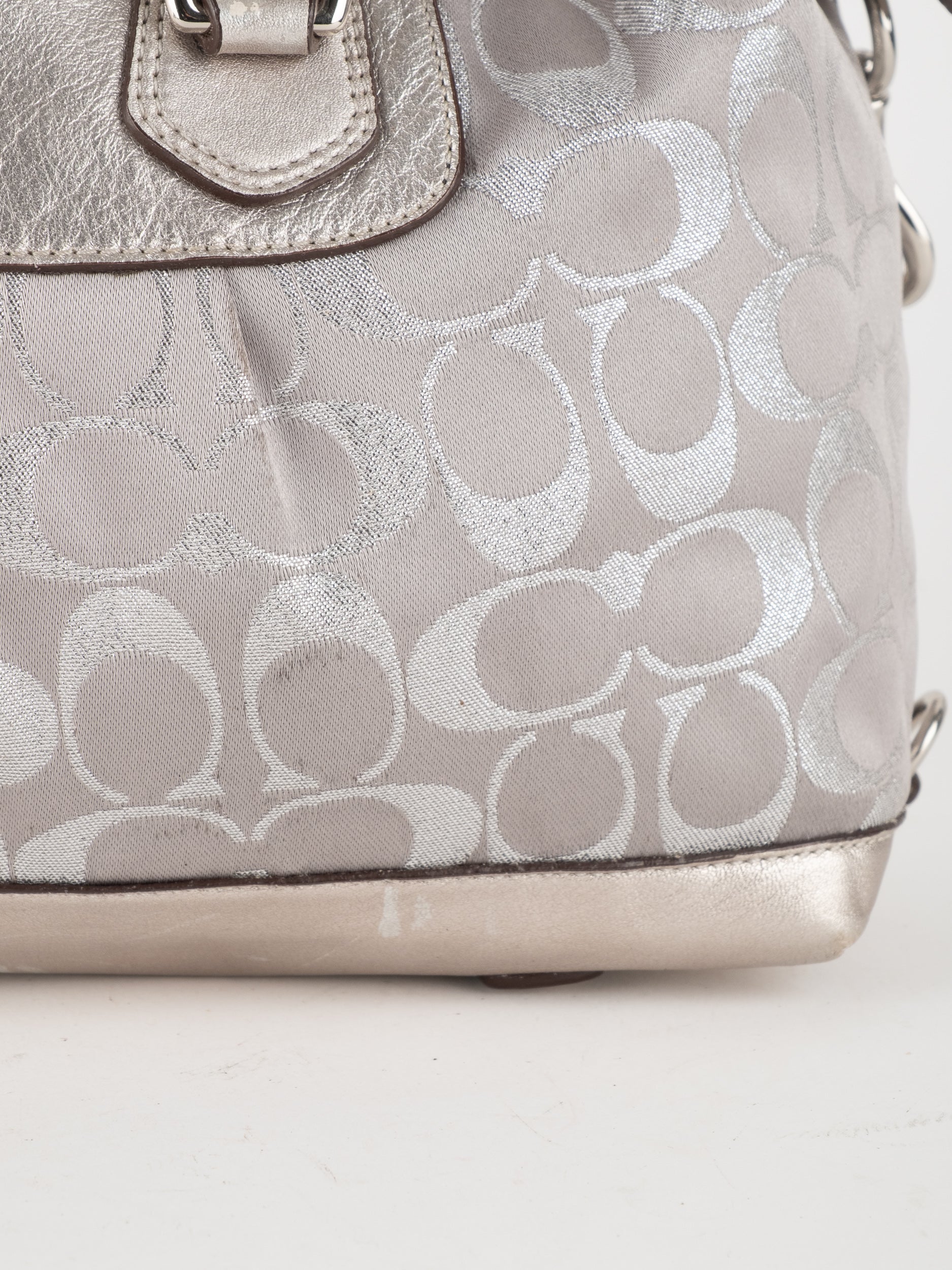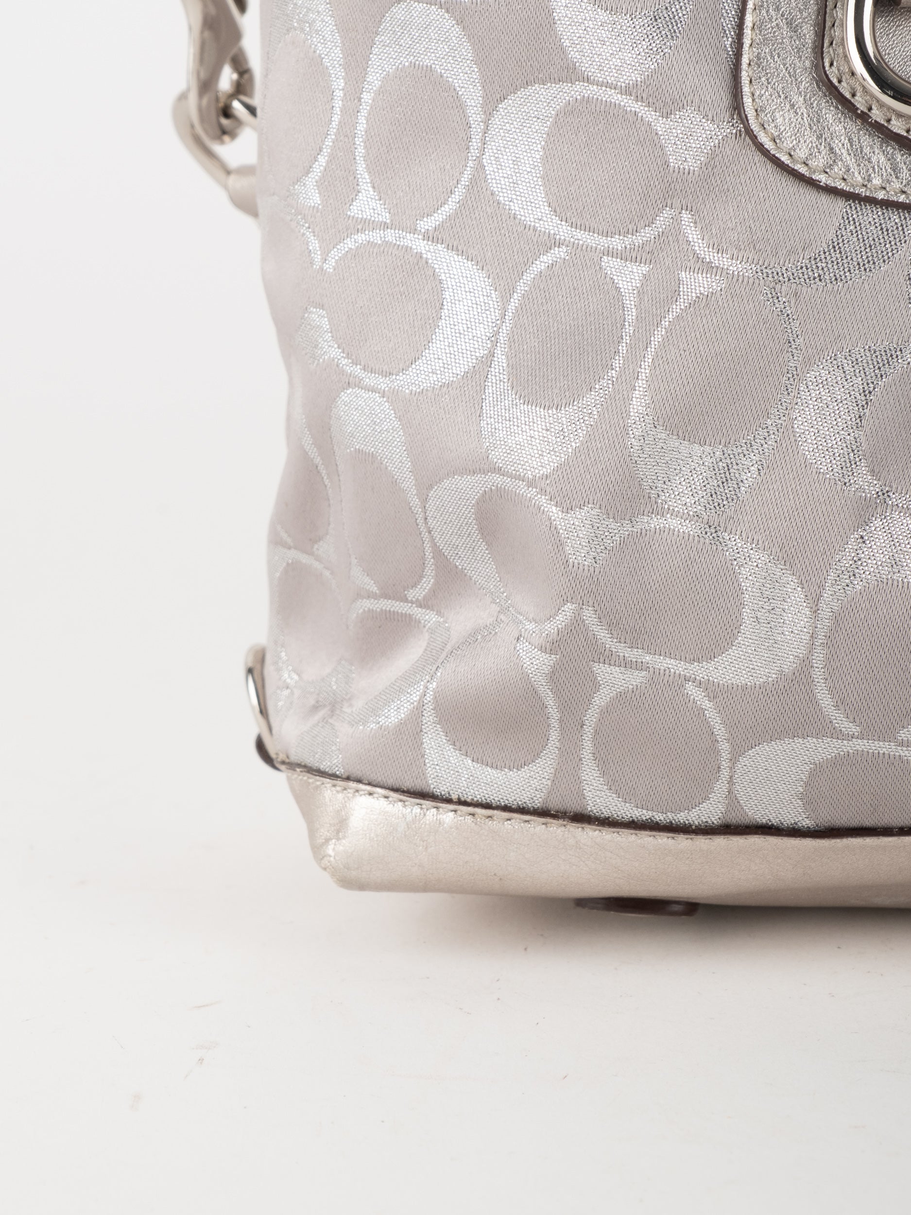 התיק עשוי בד Signature בשילוב עור מטאלי כסוף. כולל ידיות נשיאה ורצועת כתף נשלפת לנשיאה מגוונת.