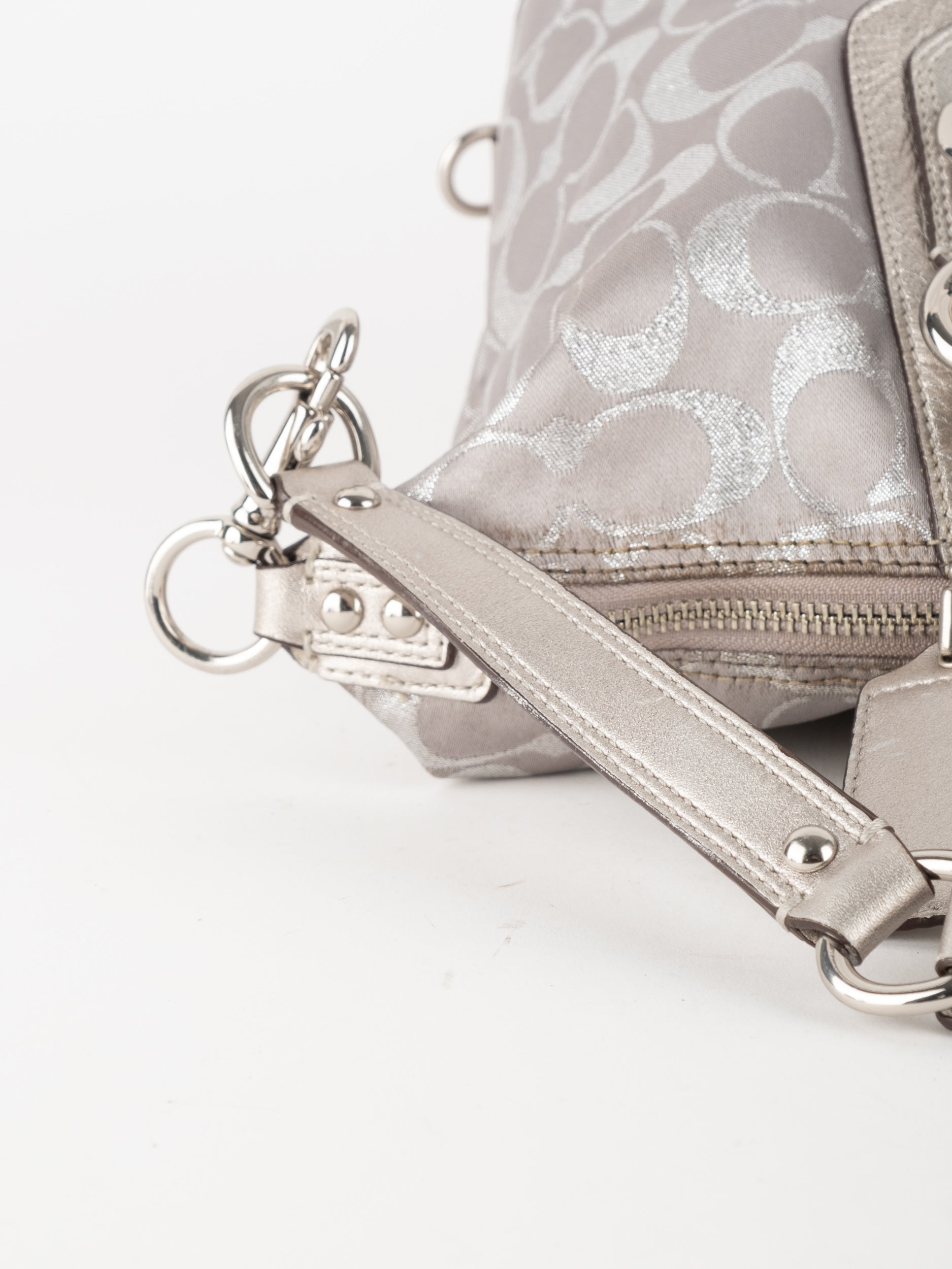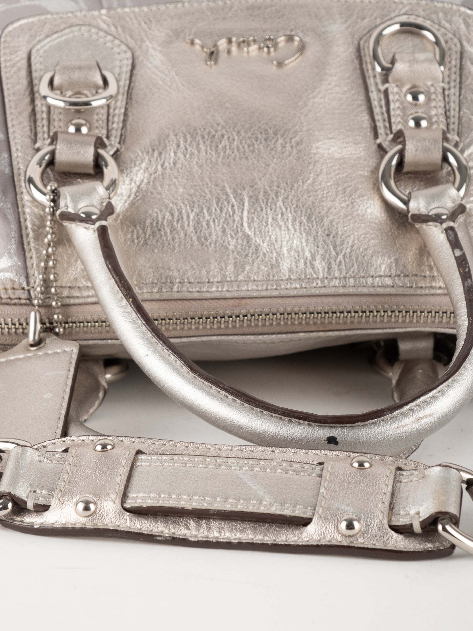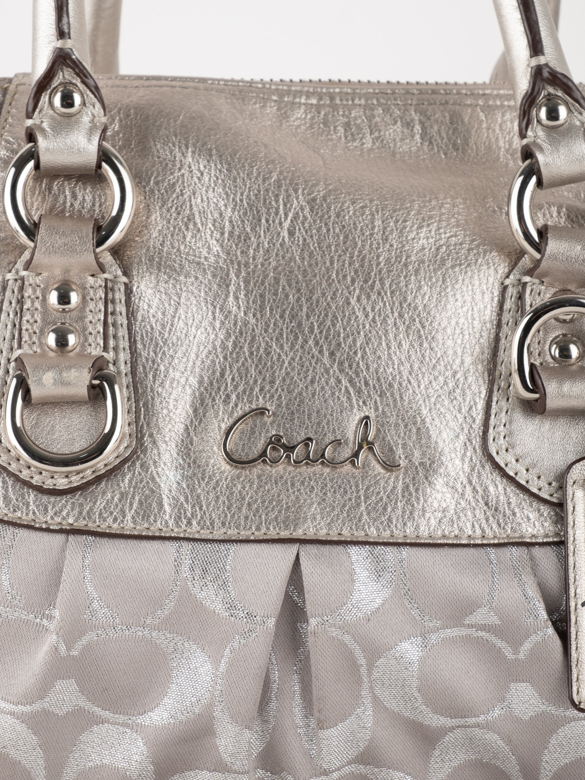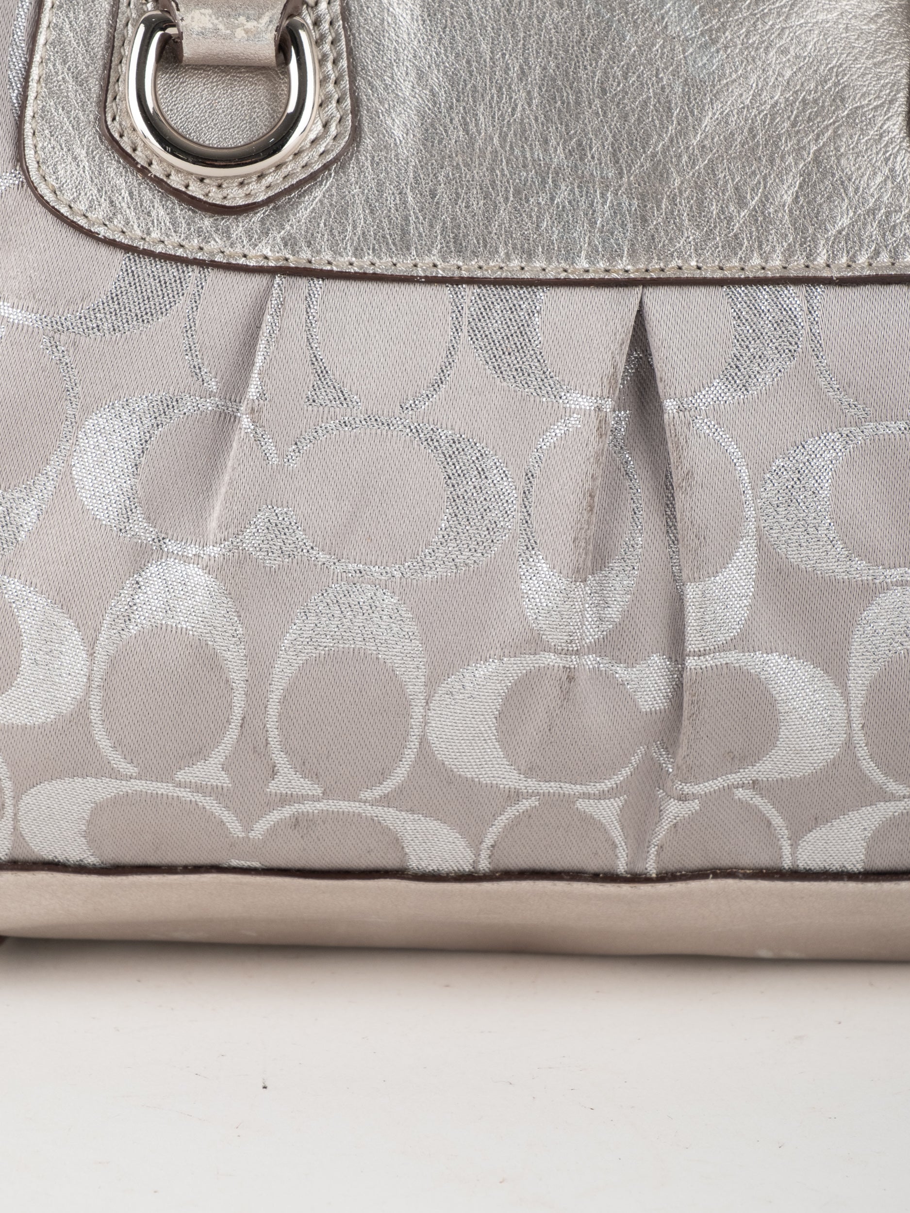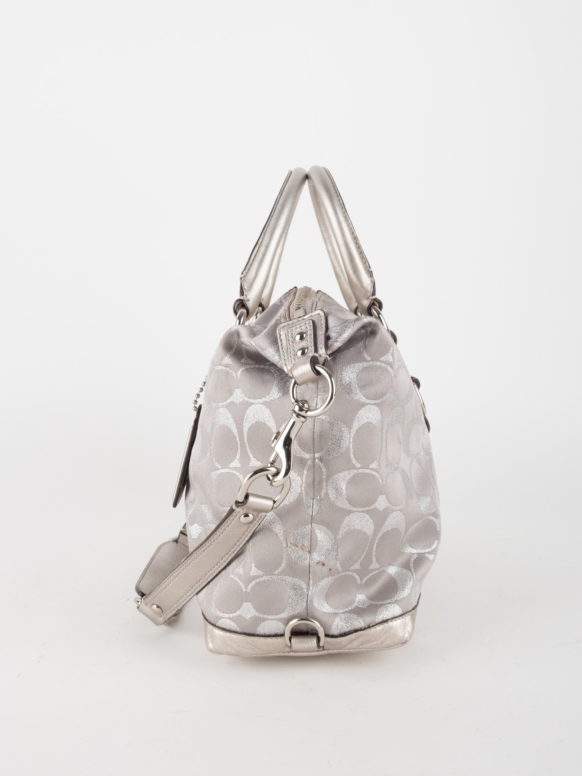 התיק עשוי בד Signature בשילוב עור מטאלי כסוף. כולל ידיות נשיאה ורצועת כתף נשלפת לנשיאה מגוונת.
