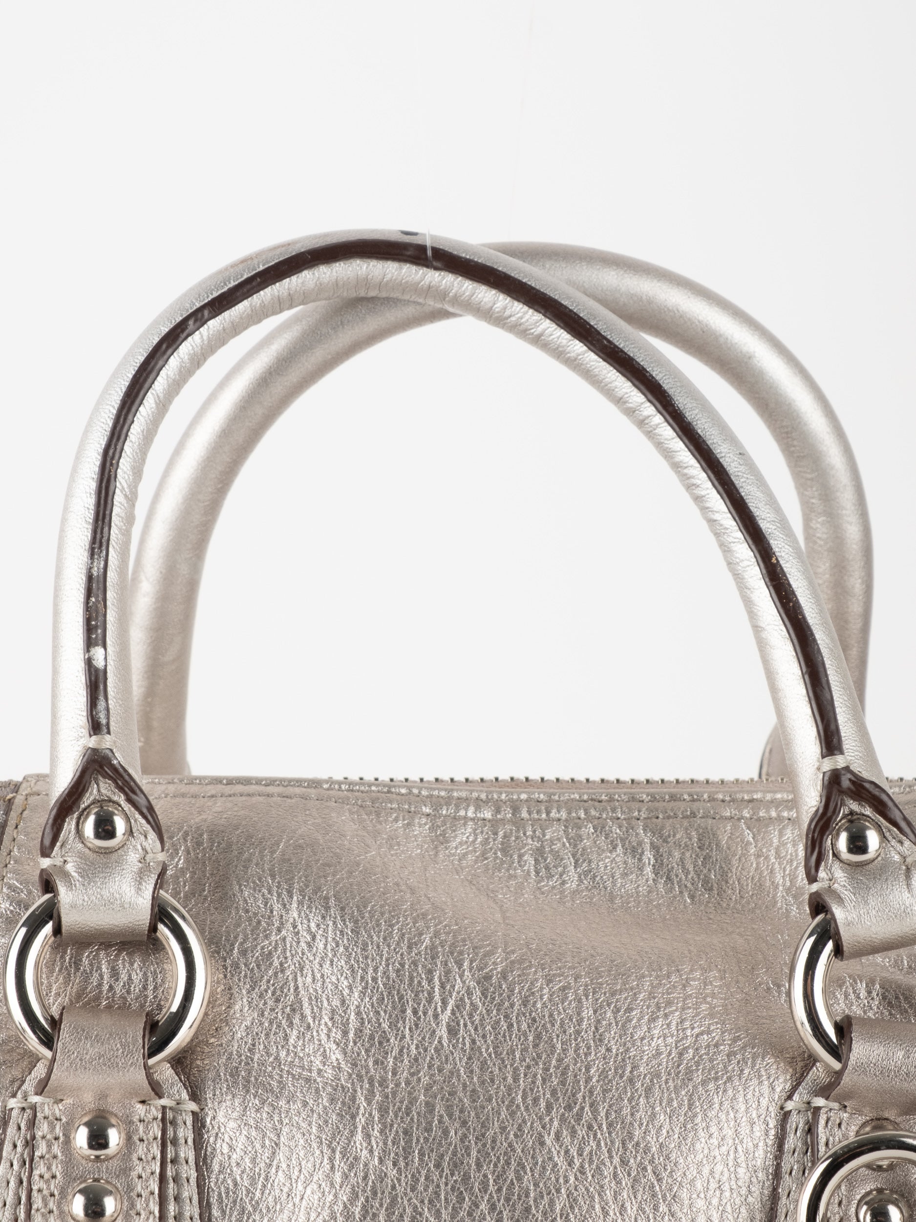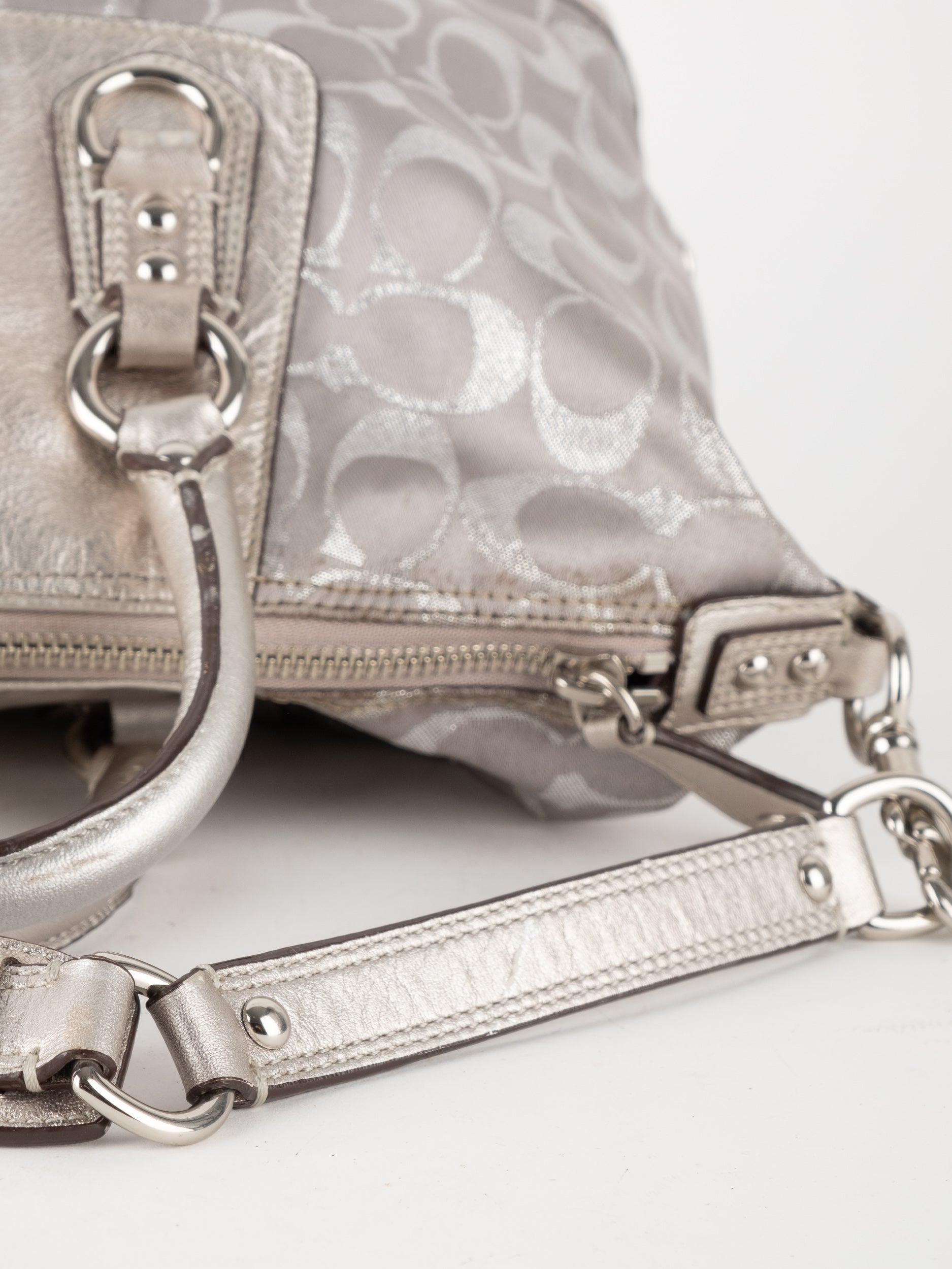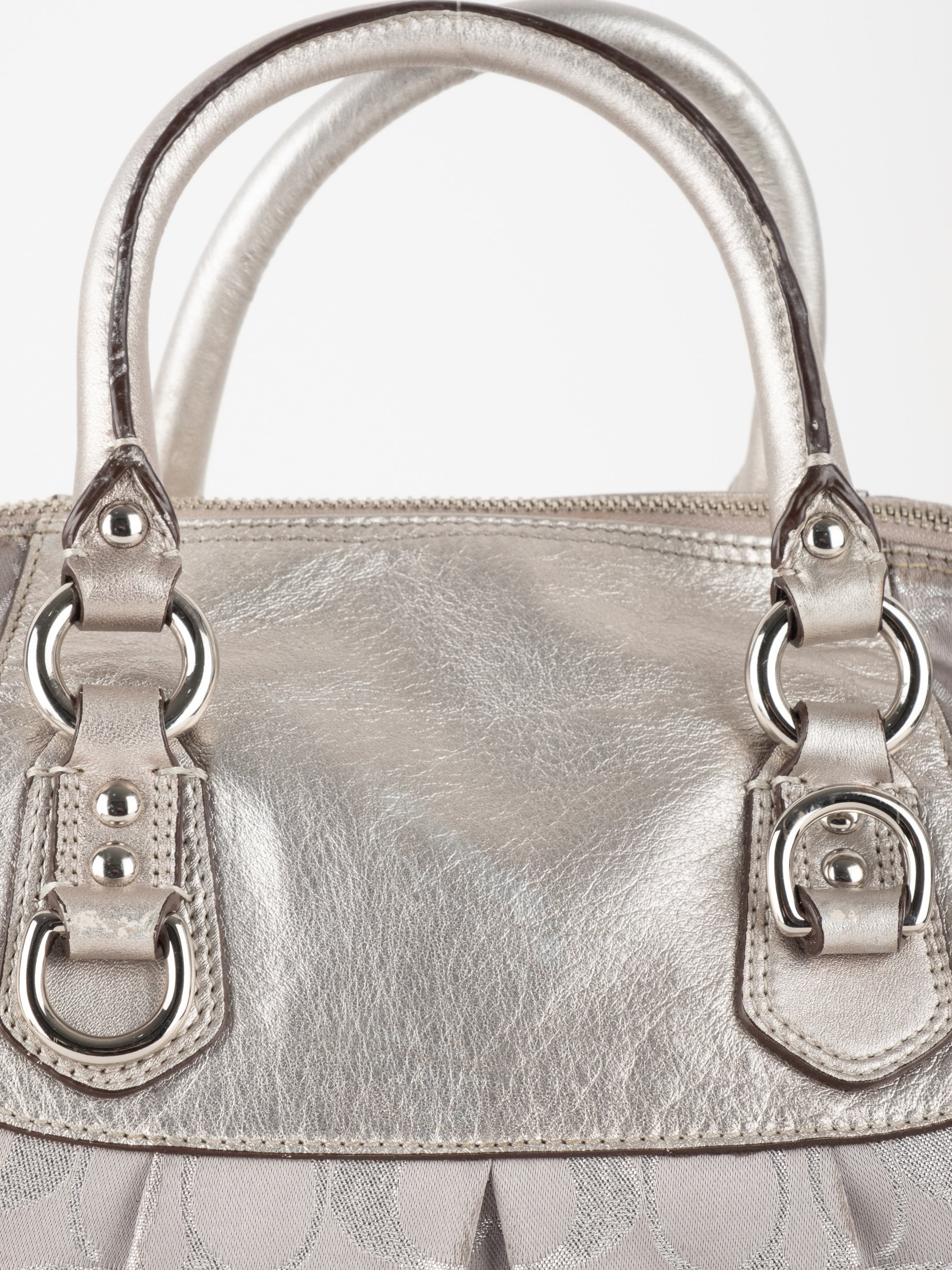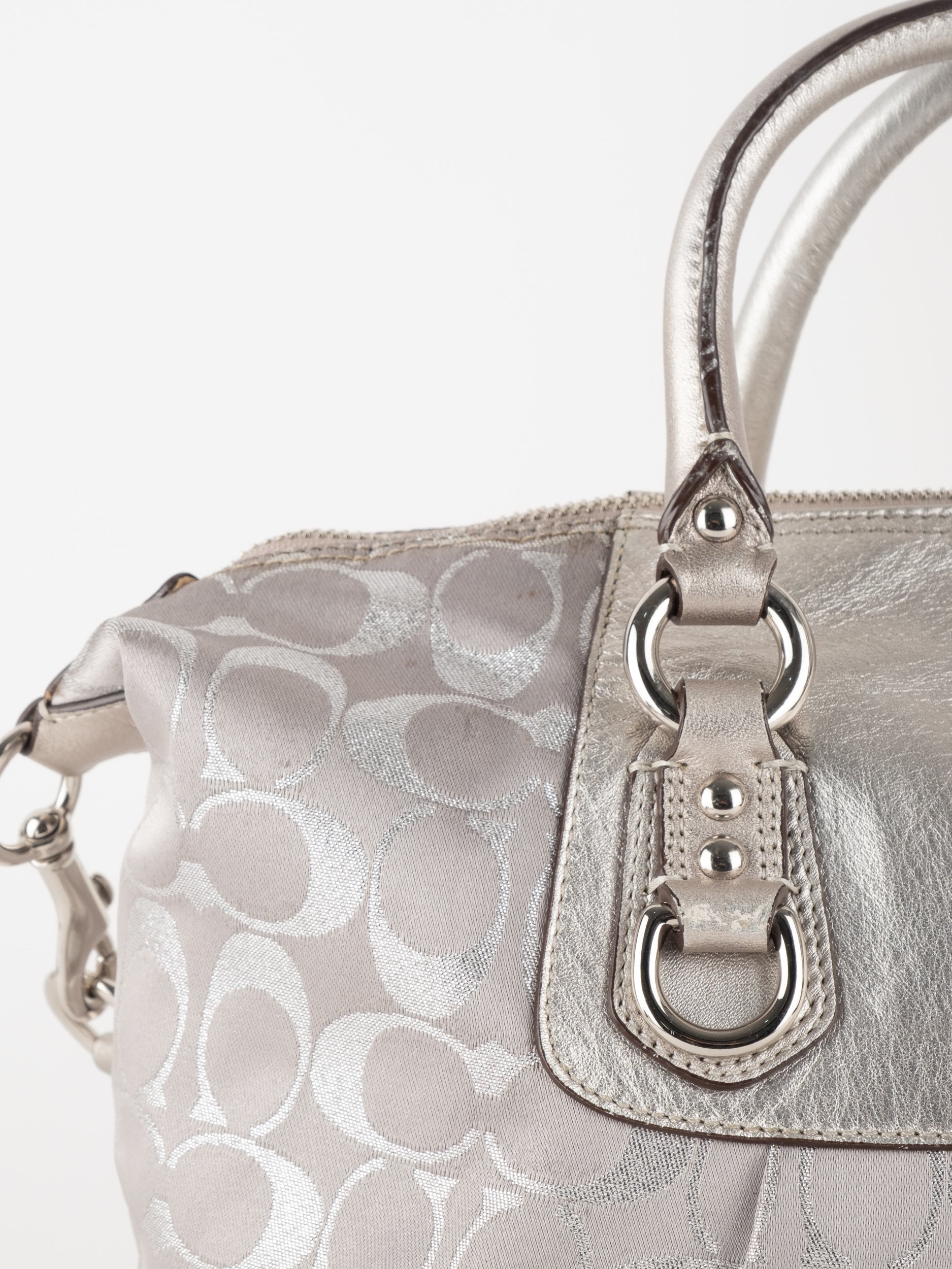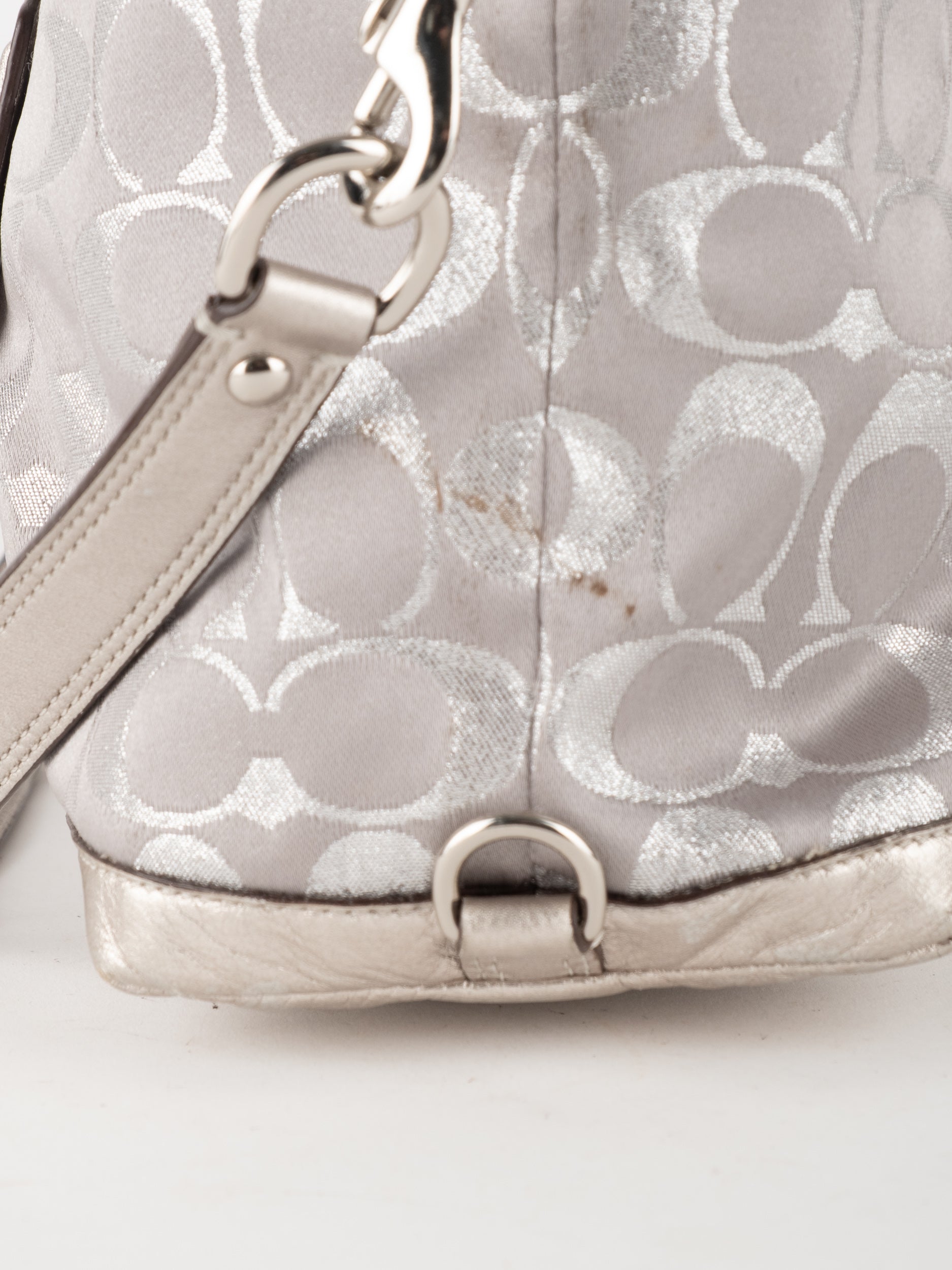 התיק עשוי בד Signature בשילוב עור מטאלי כסוף. כולל ידיות נשיאה ורצועת כתף נשלפת לנשיאה מגוונת.