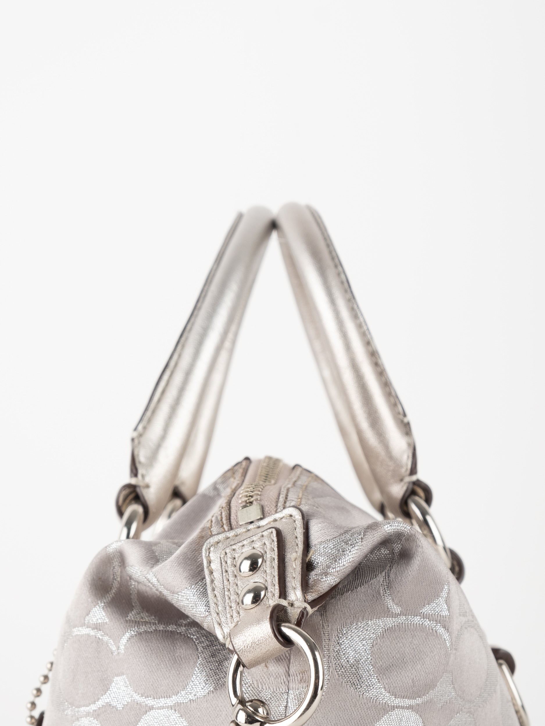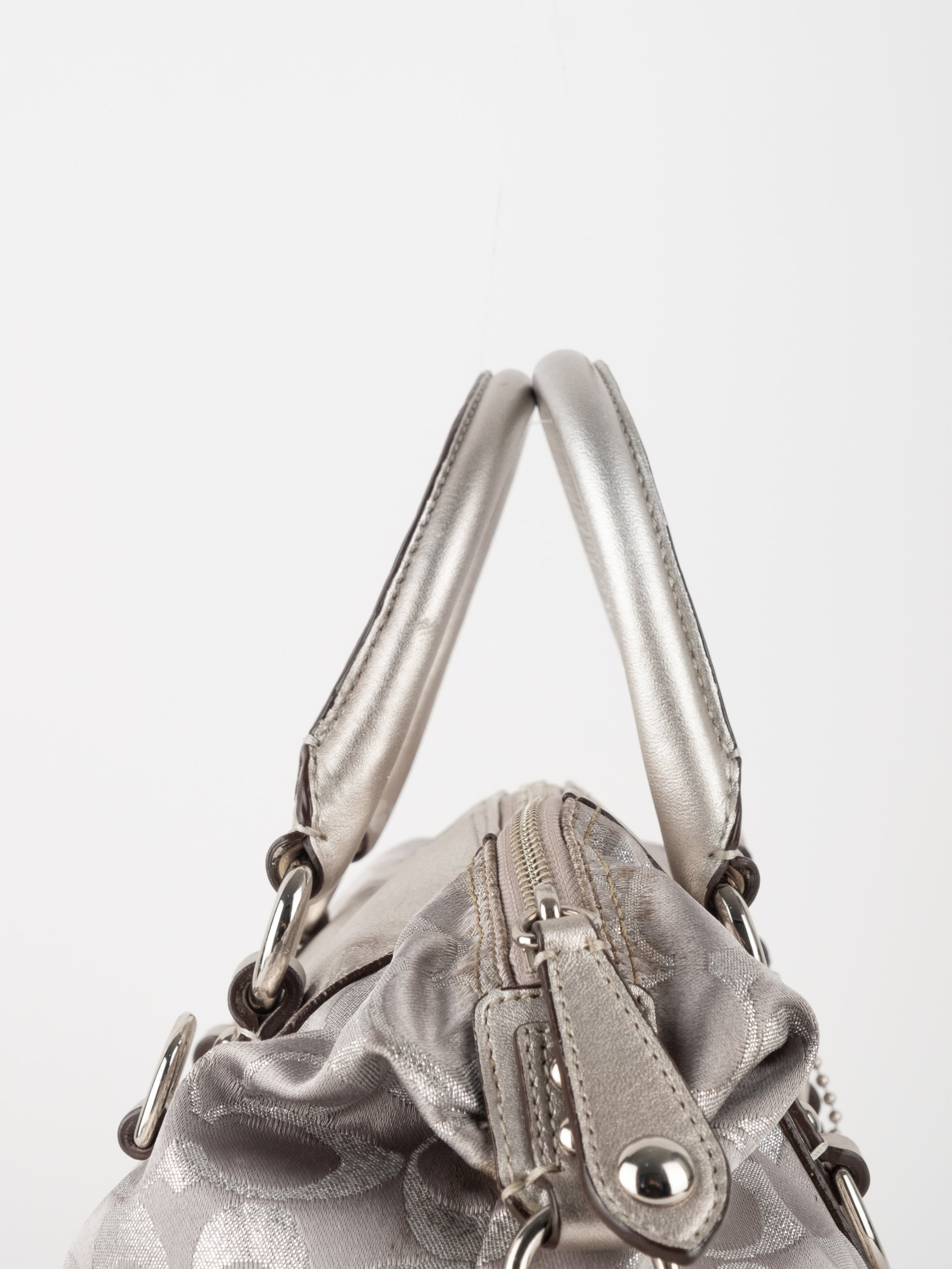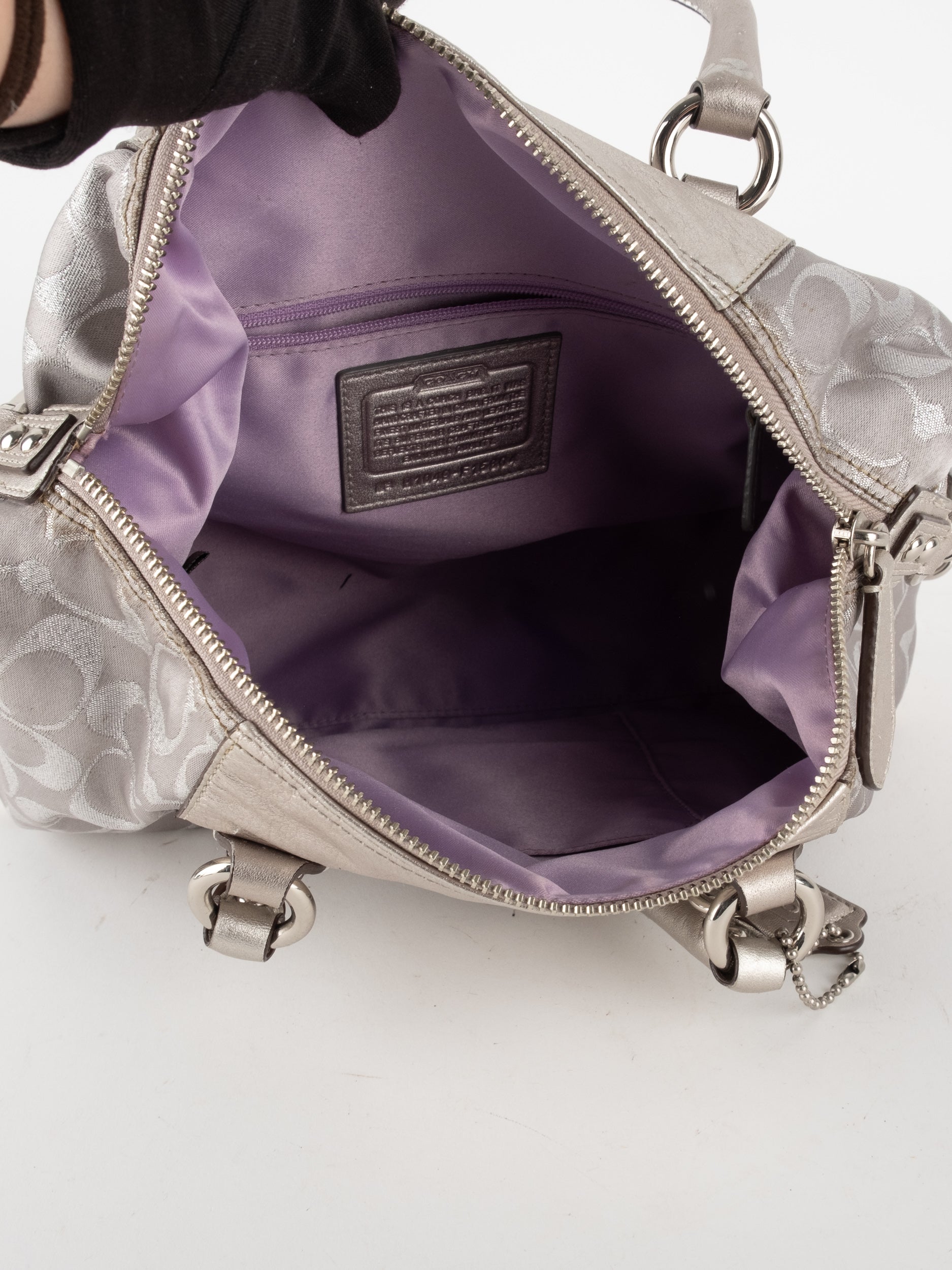 תיק יד של קואץ' וינטג' יד שנייה במהדורה מוגבלת בדוגמת Signature בגוון כסוף מטאלי. דגם נשי ומרשים עם ברק עדין ונוכחות אלגנטית. השילוב בין הבד המודפס לעור המטאלי יוצר מראה מוקפד אך רענן, כזה שמאיר את ההופעה ומוסיף טאץ' מיוחד מבלי להיות מוגזם.