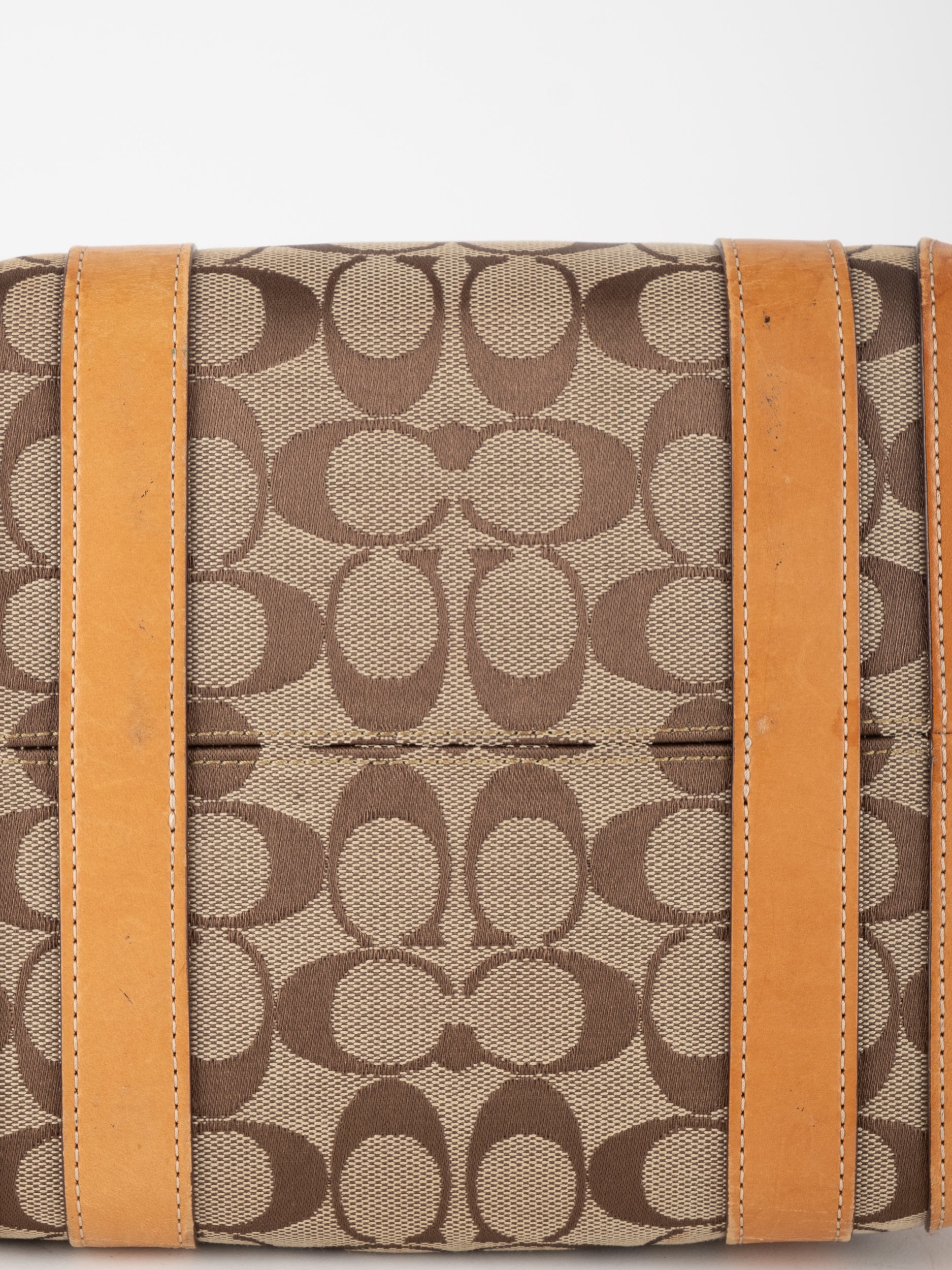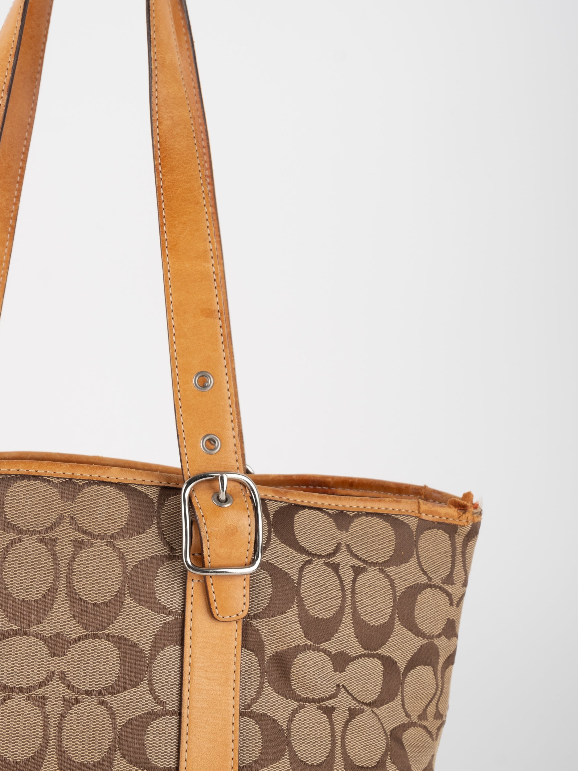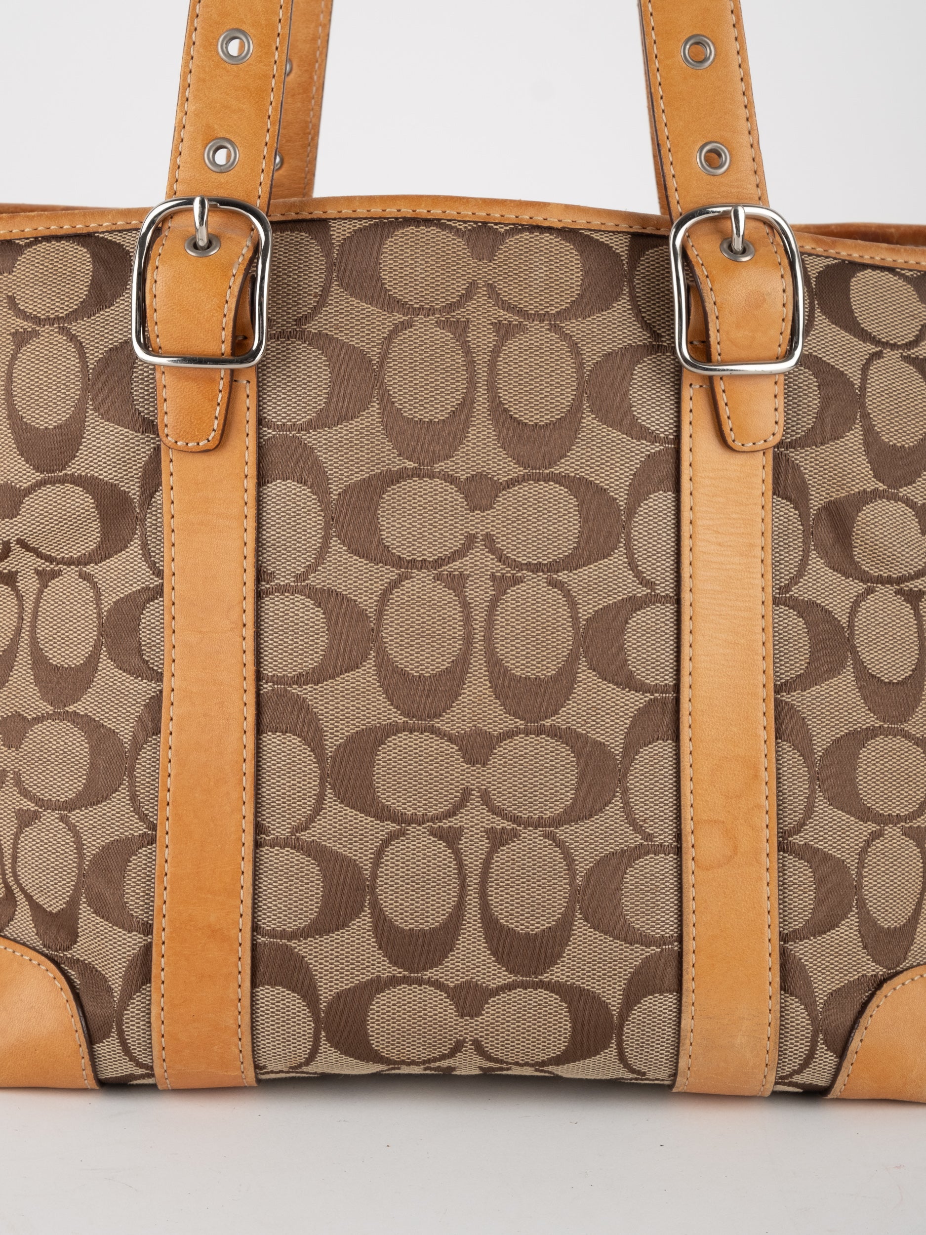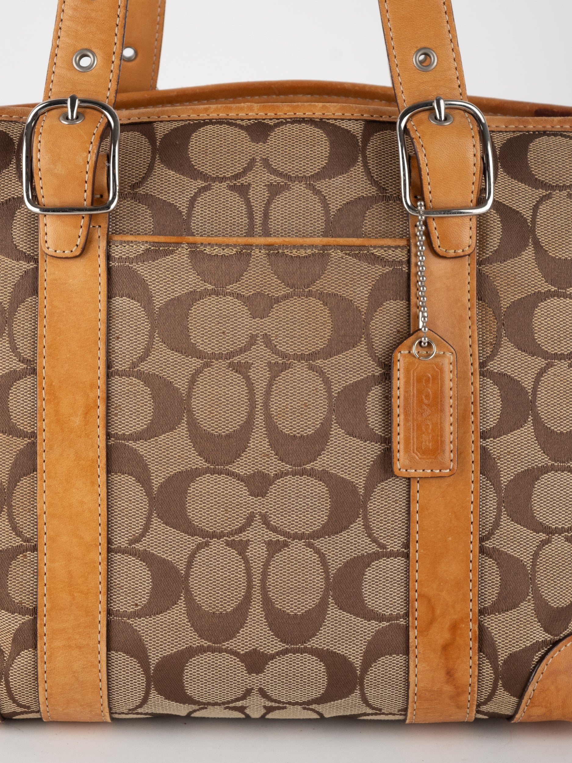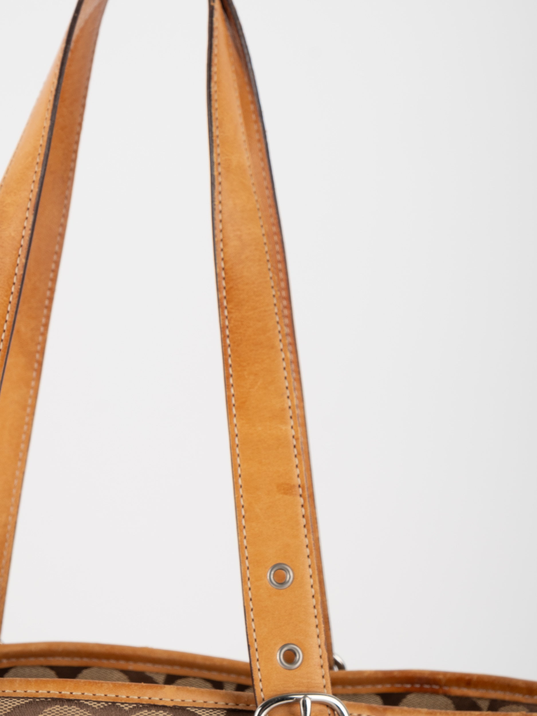 קואץ' COACH וינטג' יד שנייה בדוגמת Signature בגווני בז’ עם רצועות עור בגוון קוניאק חם. ote קלאסי עם אמירה ברורה ומראה אמריקאי על־זמני.