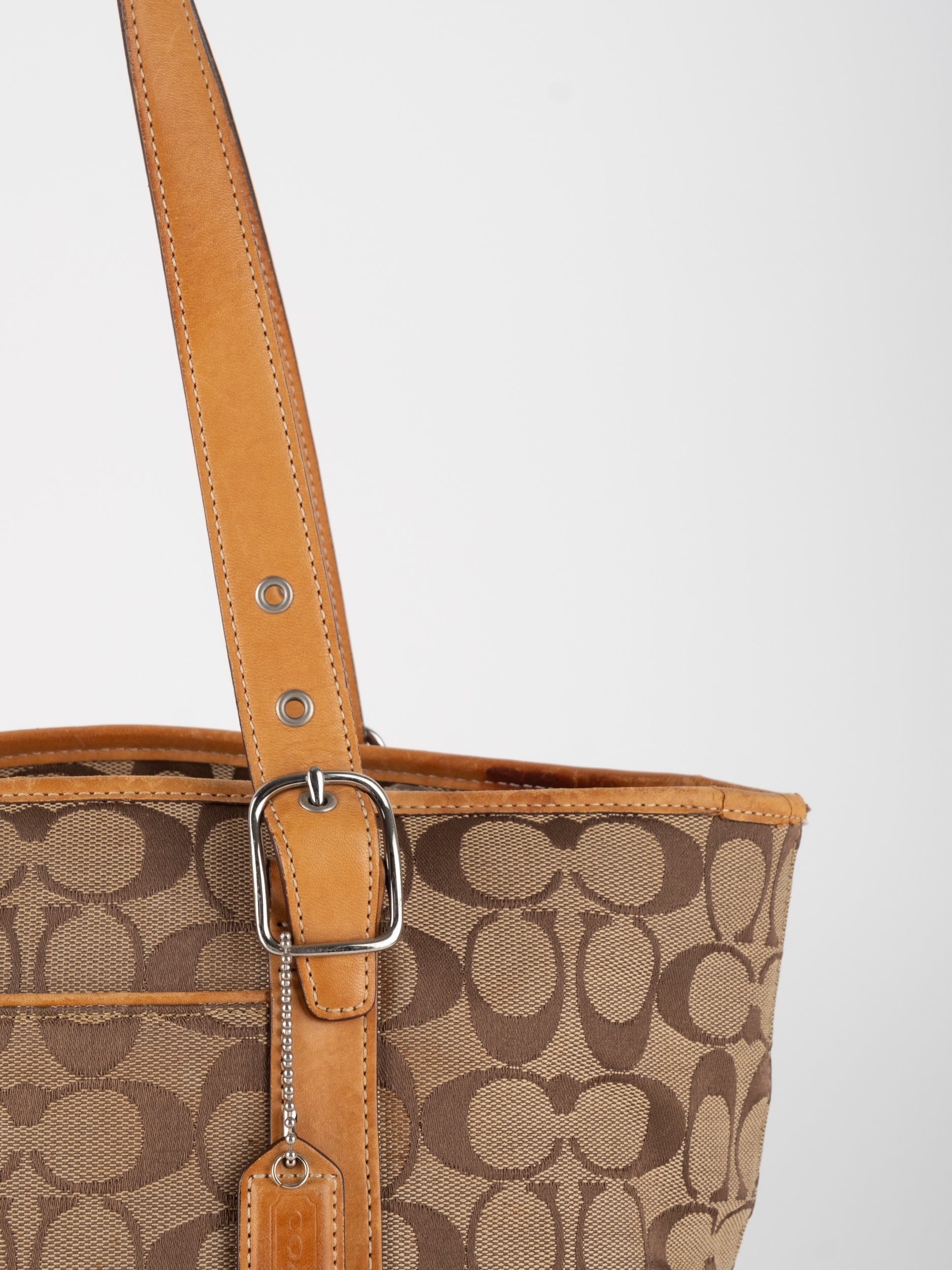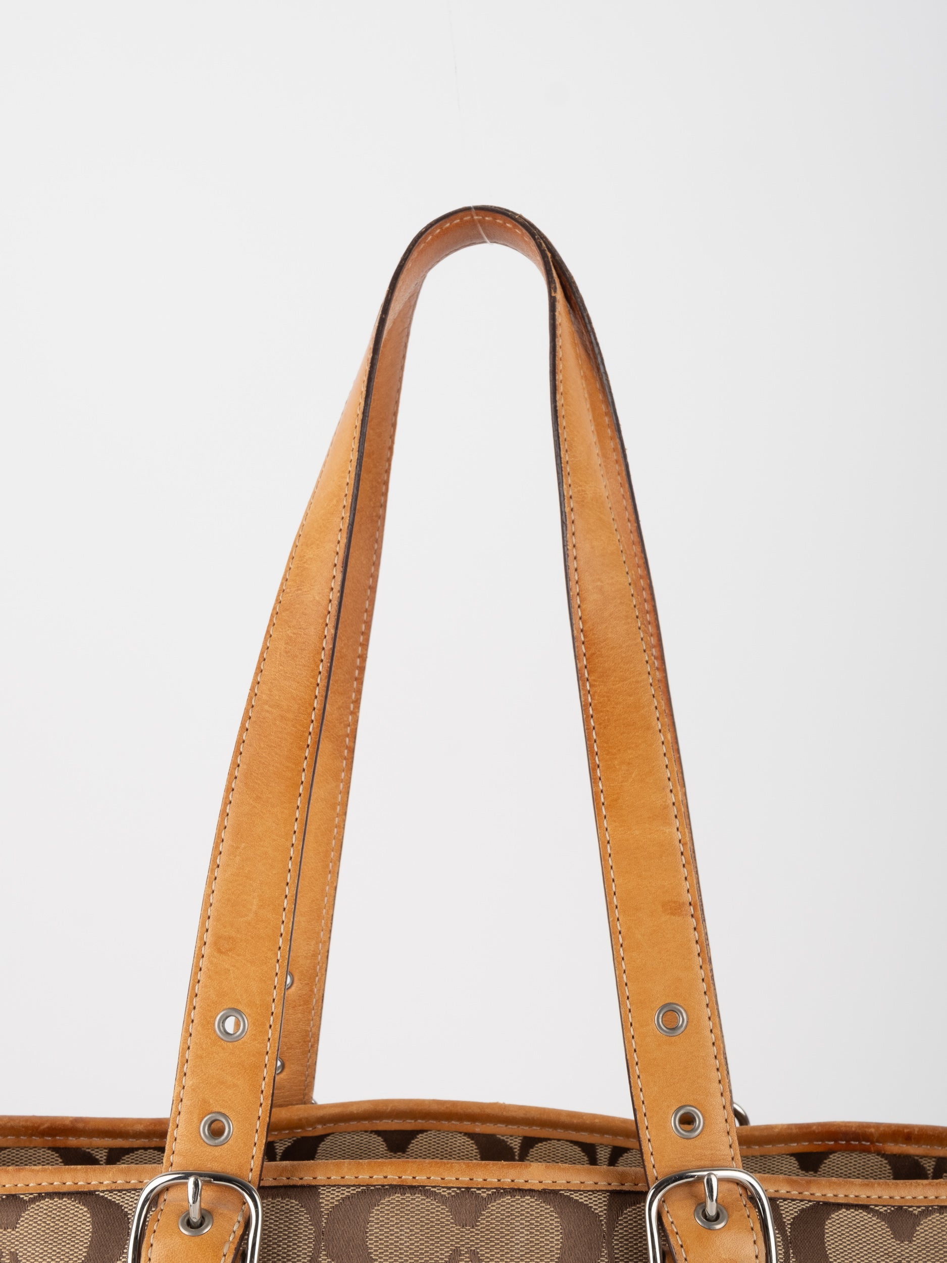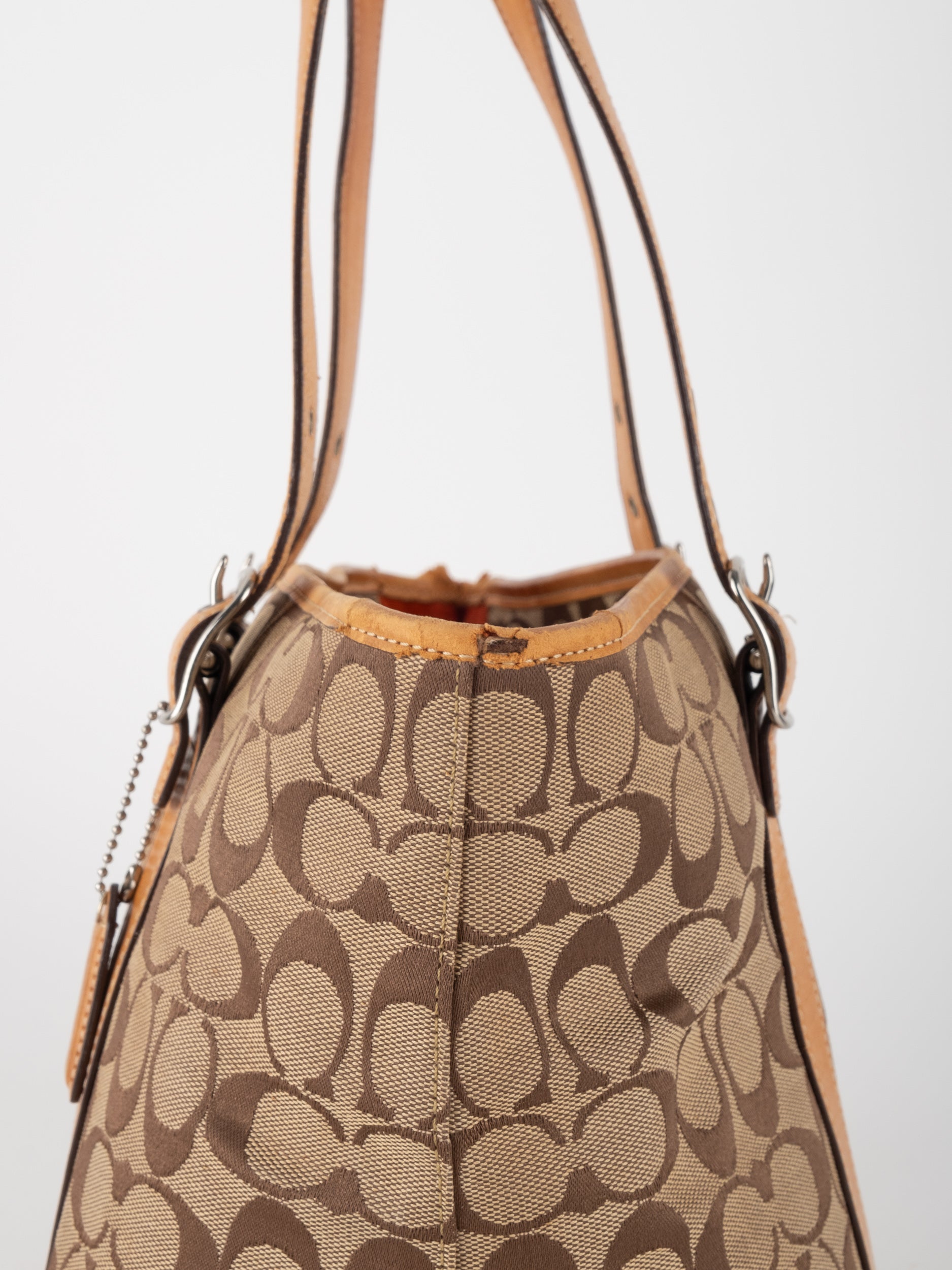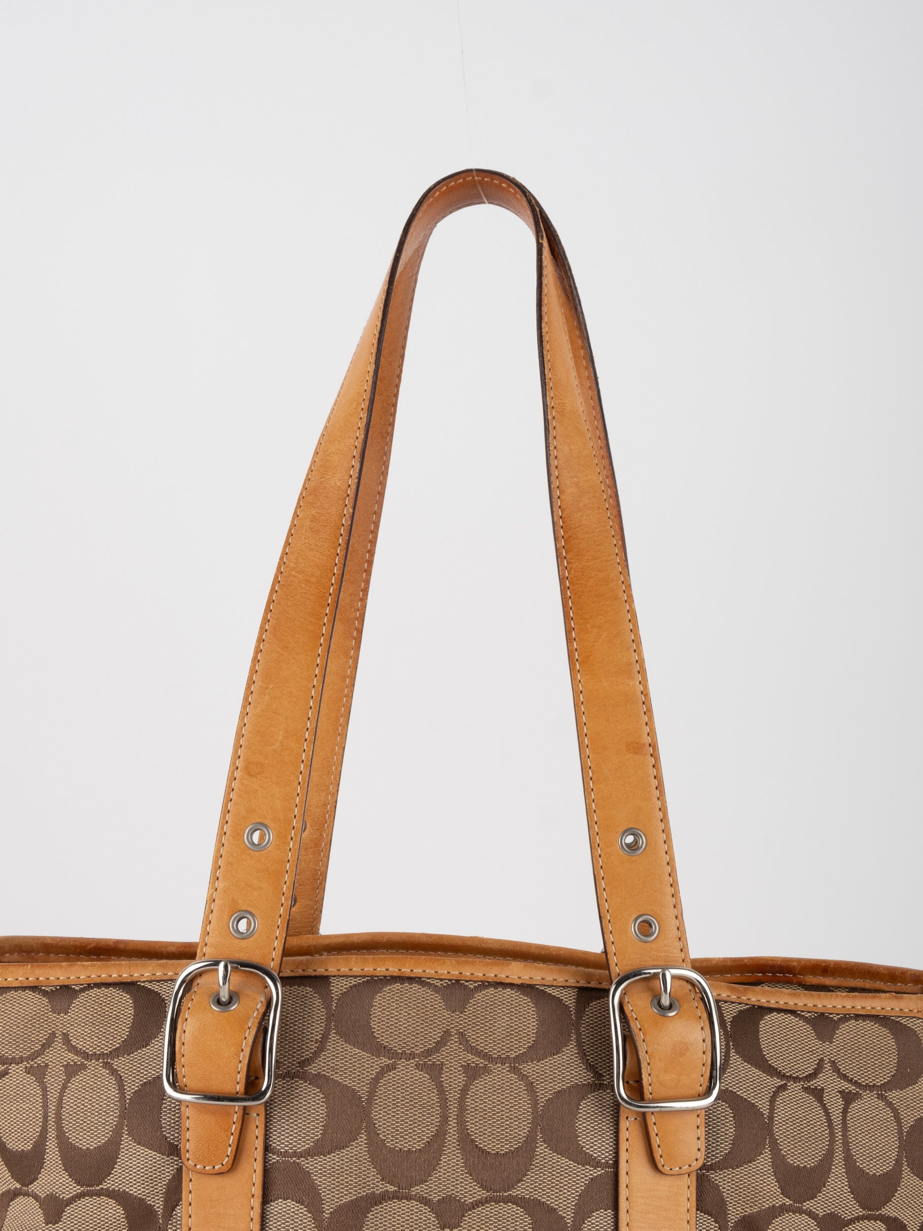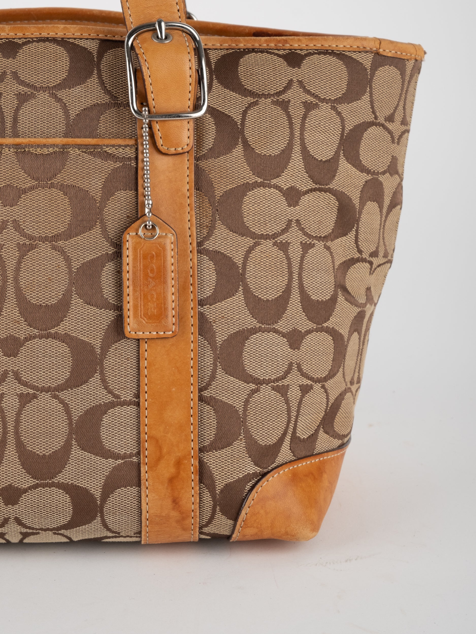 קואץ' COACH וינטג' יד שנייה בדוגמת Signature בגווני בז’ עם רצועות עור בגוון קוניאק חם. ote קלאסי עם אמירה ברורה ומראה אמריקאי על־זמני.