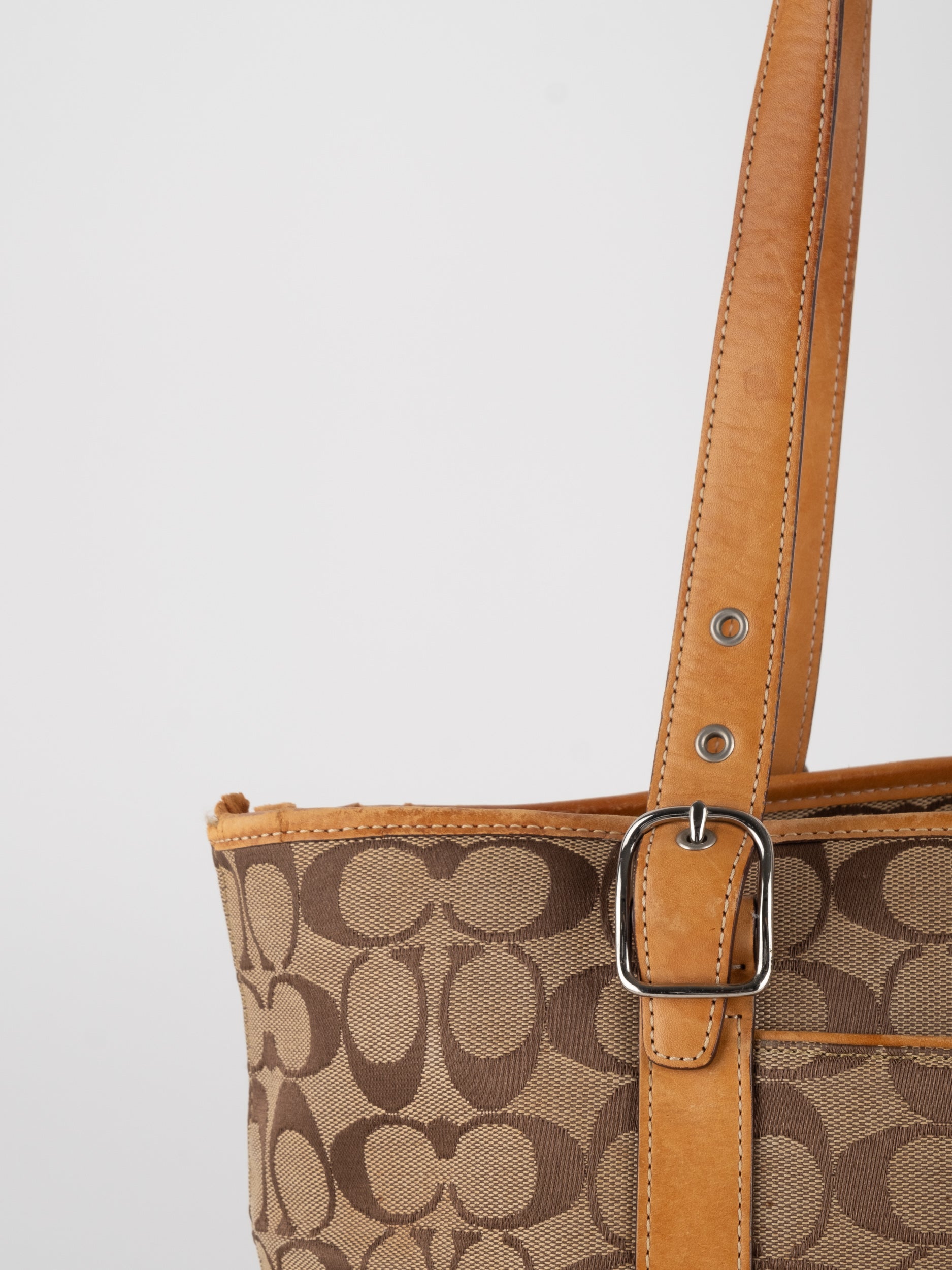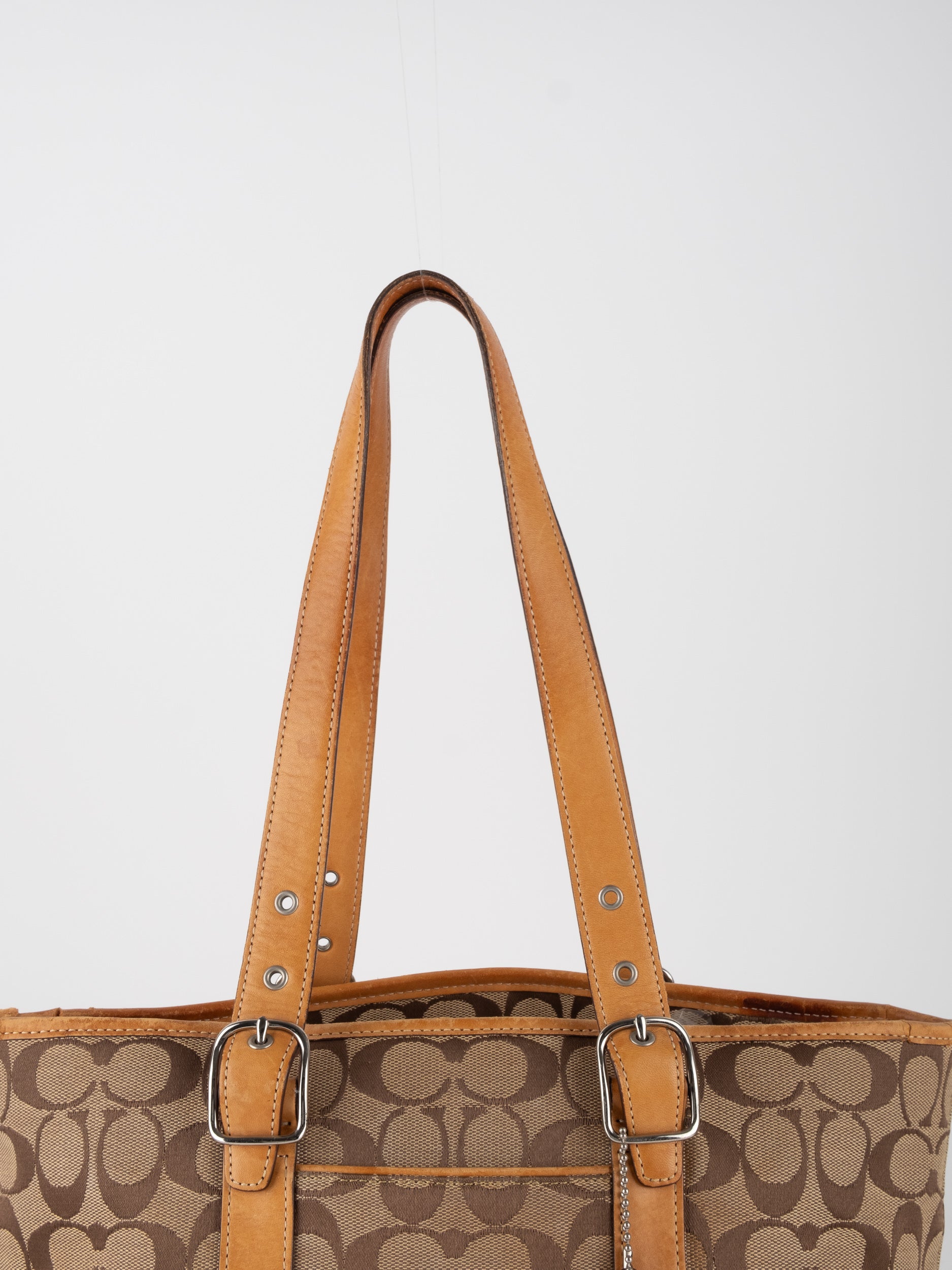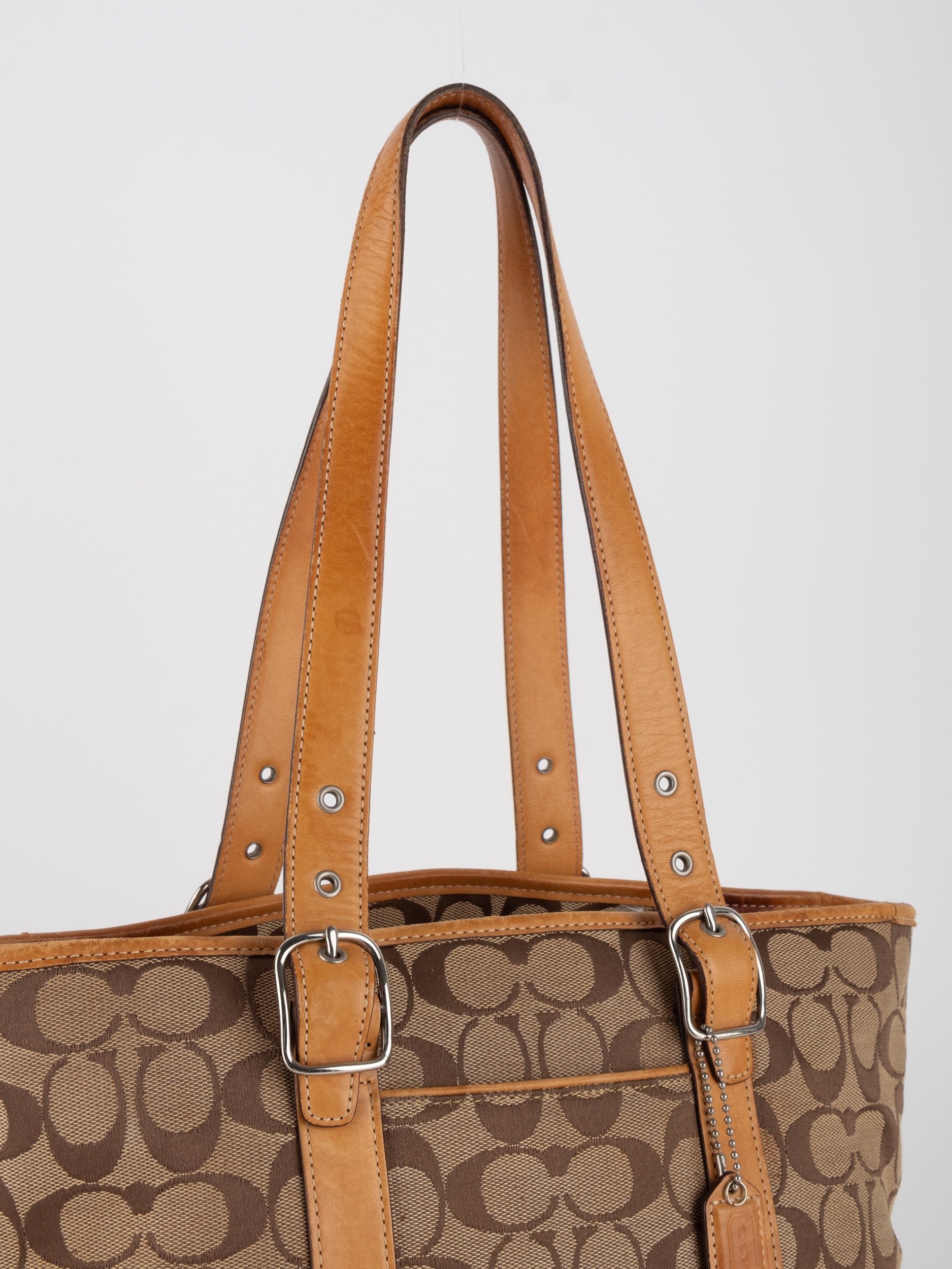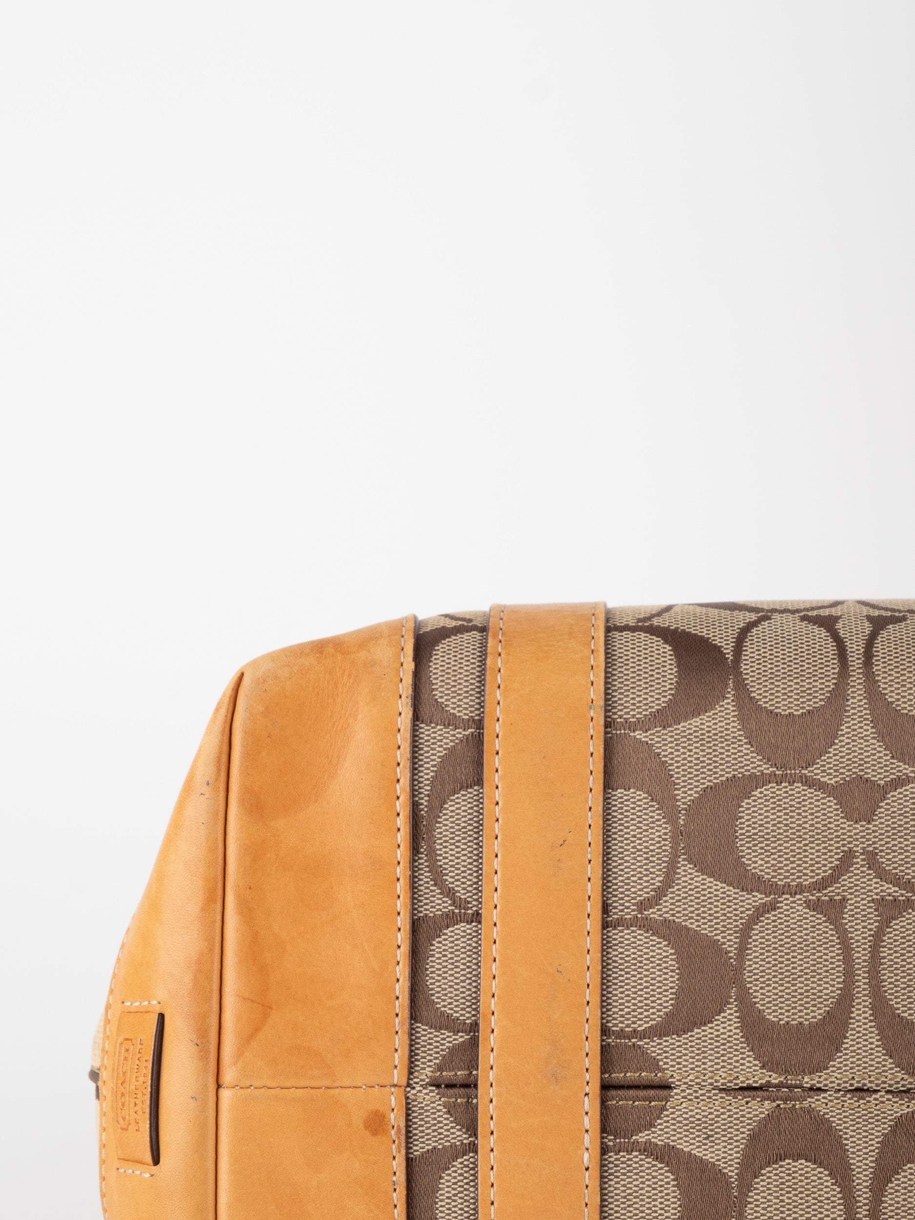 קואץ' COACH וינטג' יד שנייה בדוגמת Signature בגווני בז’ עם רצועות עור בגוון קוניאק חם. ote קלאסי עם אמירה ברורה ומראה אמריקאי על־זמני.