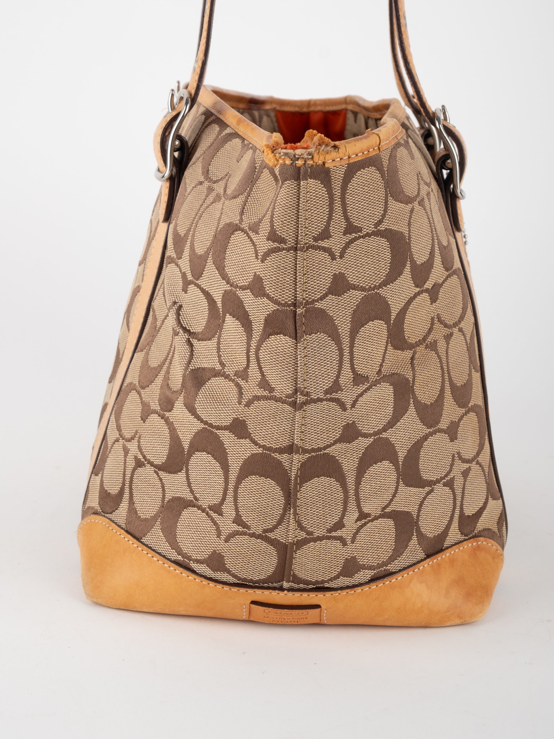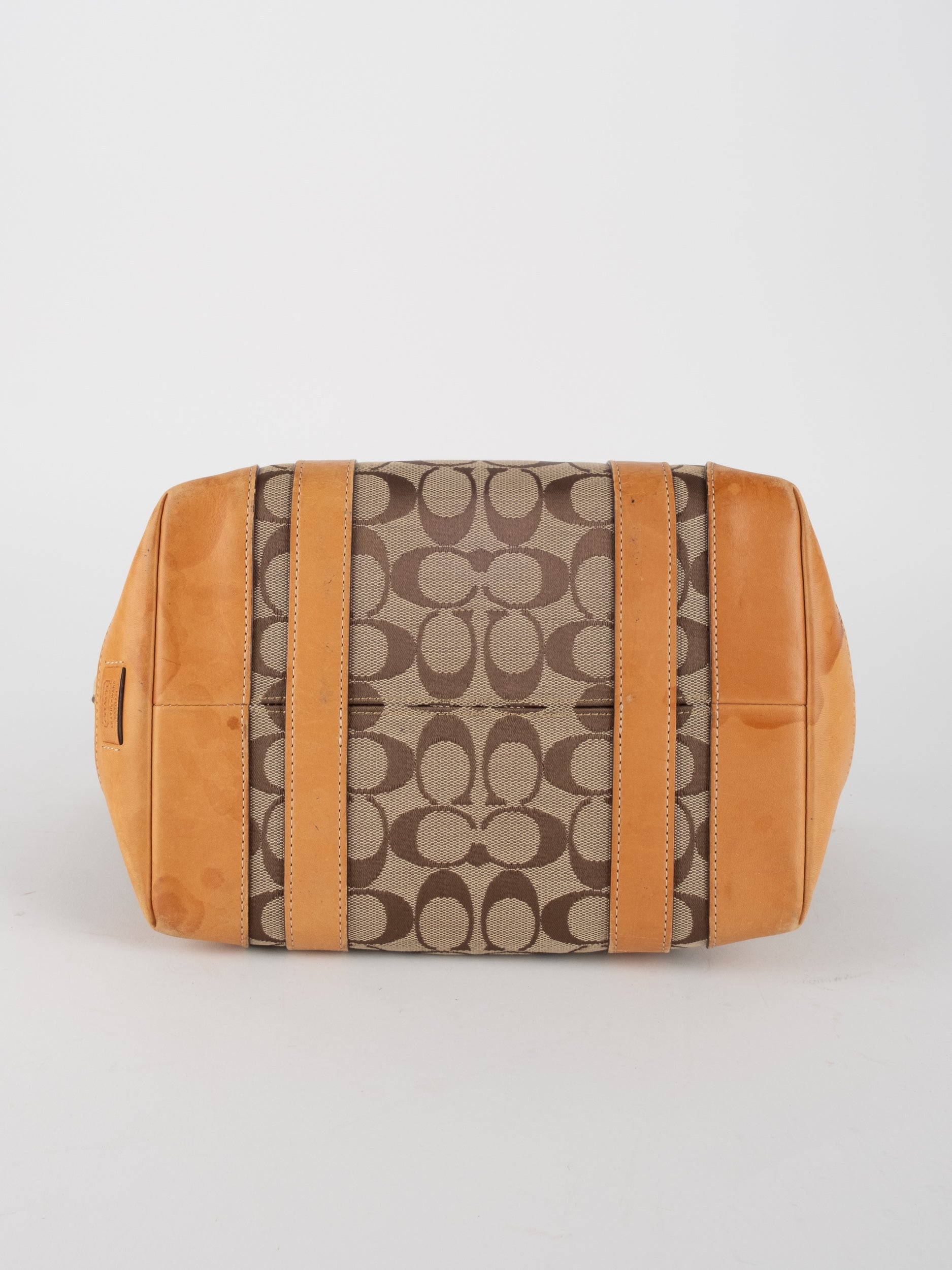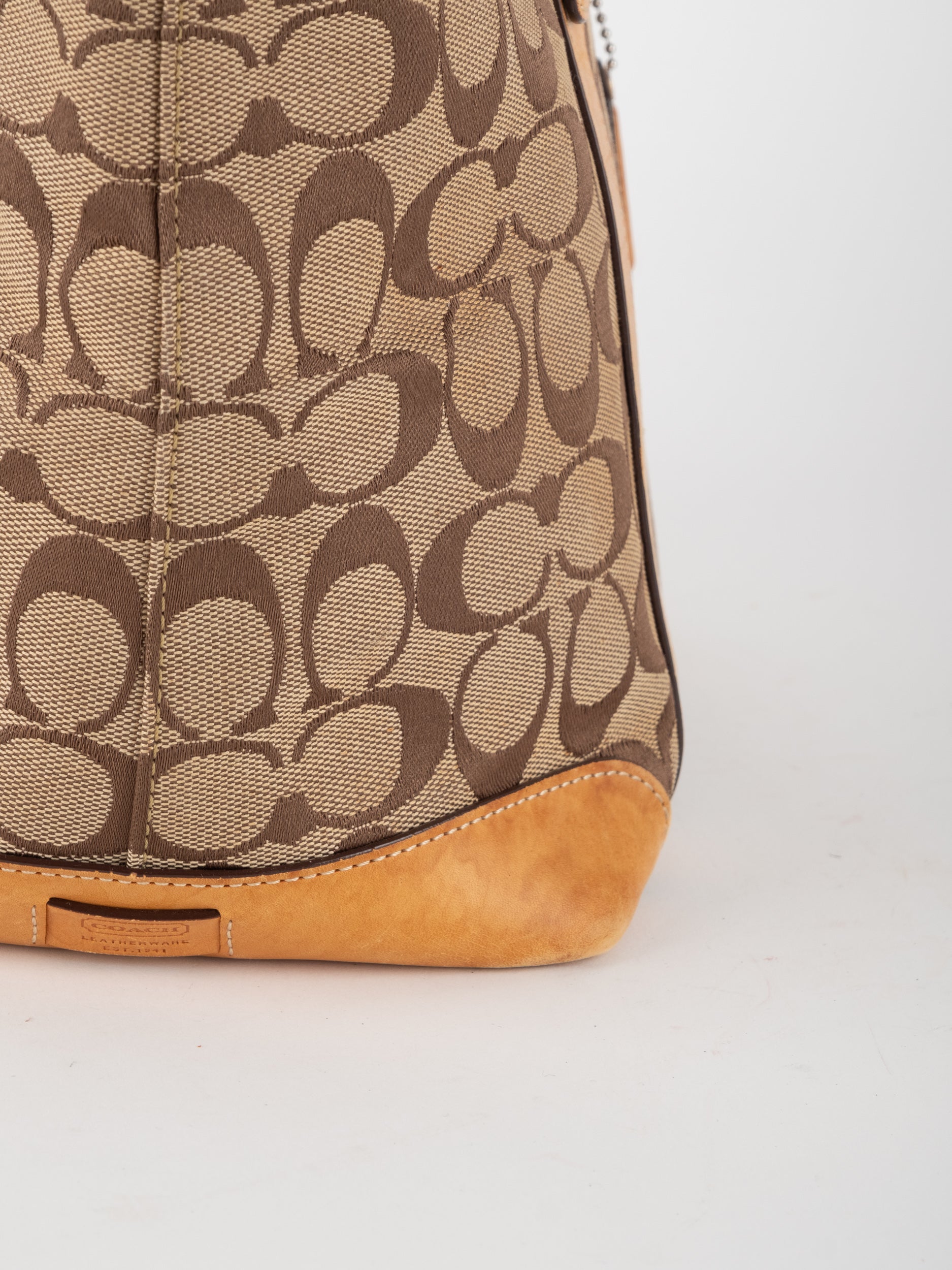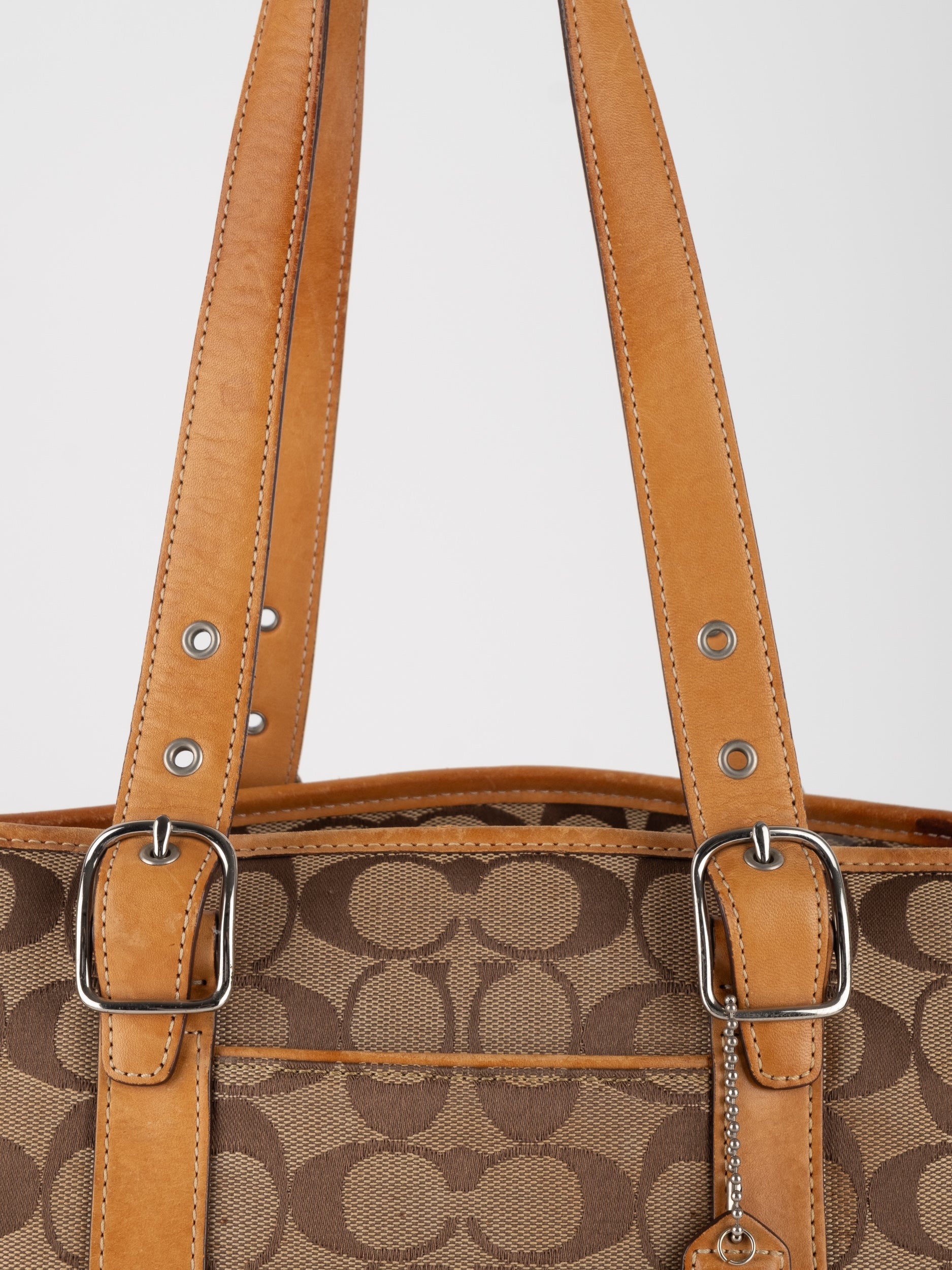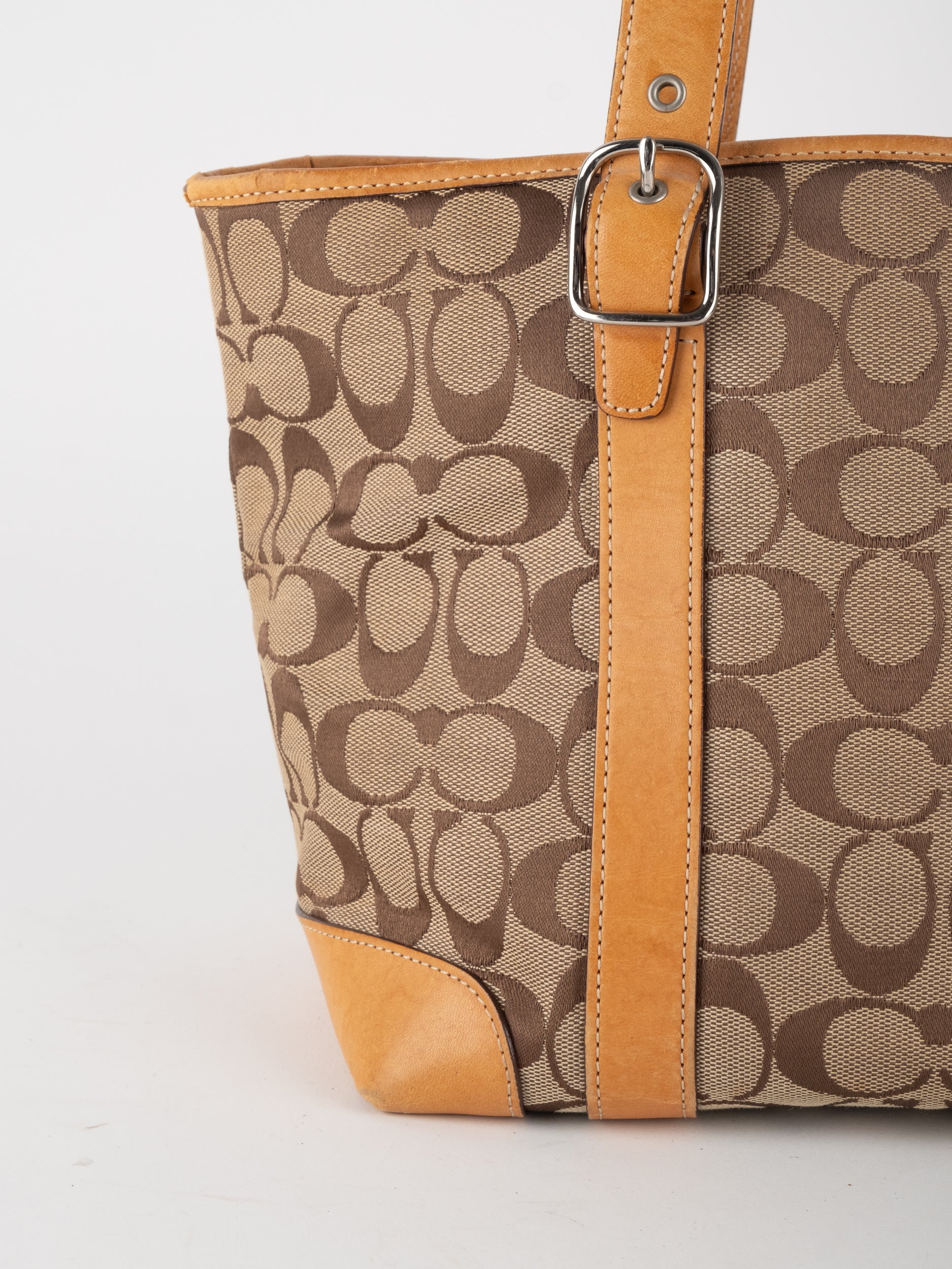 קואץ' COACH וינטג' יד שנייה בדוגמת Signature בגווני בז’ עם רצועות עור בגוון קוניאק חם. ote קלאסי עם אמירה ברורה ומראה אמריקאי על־זמני.