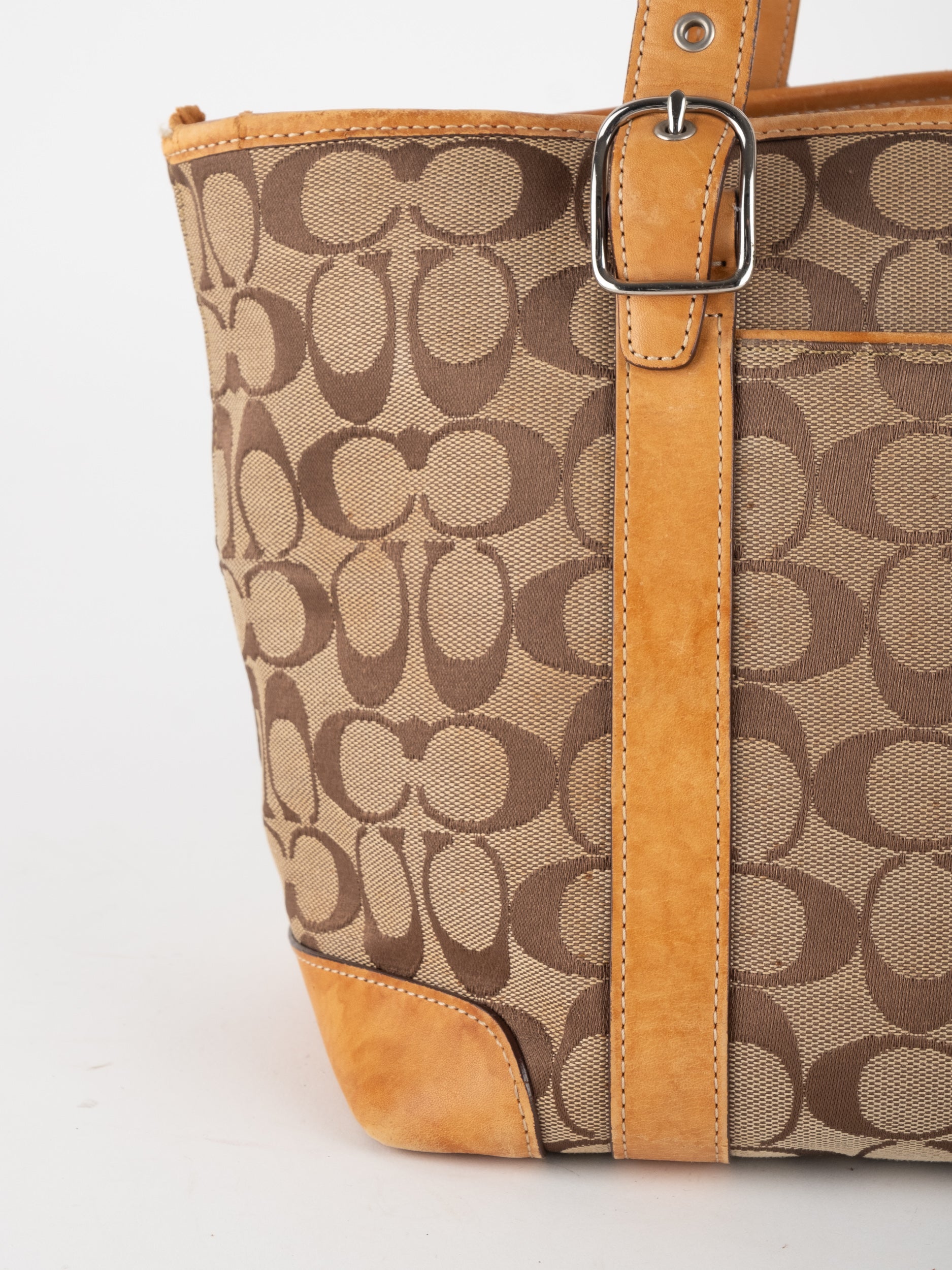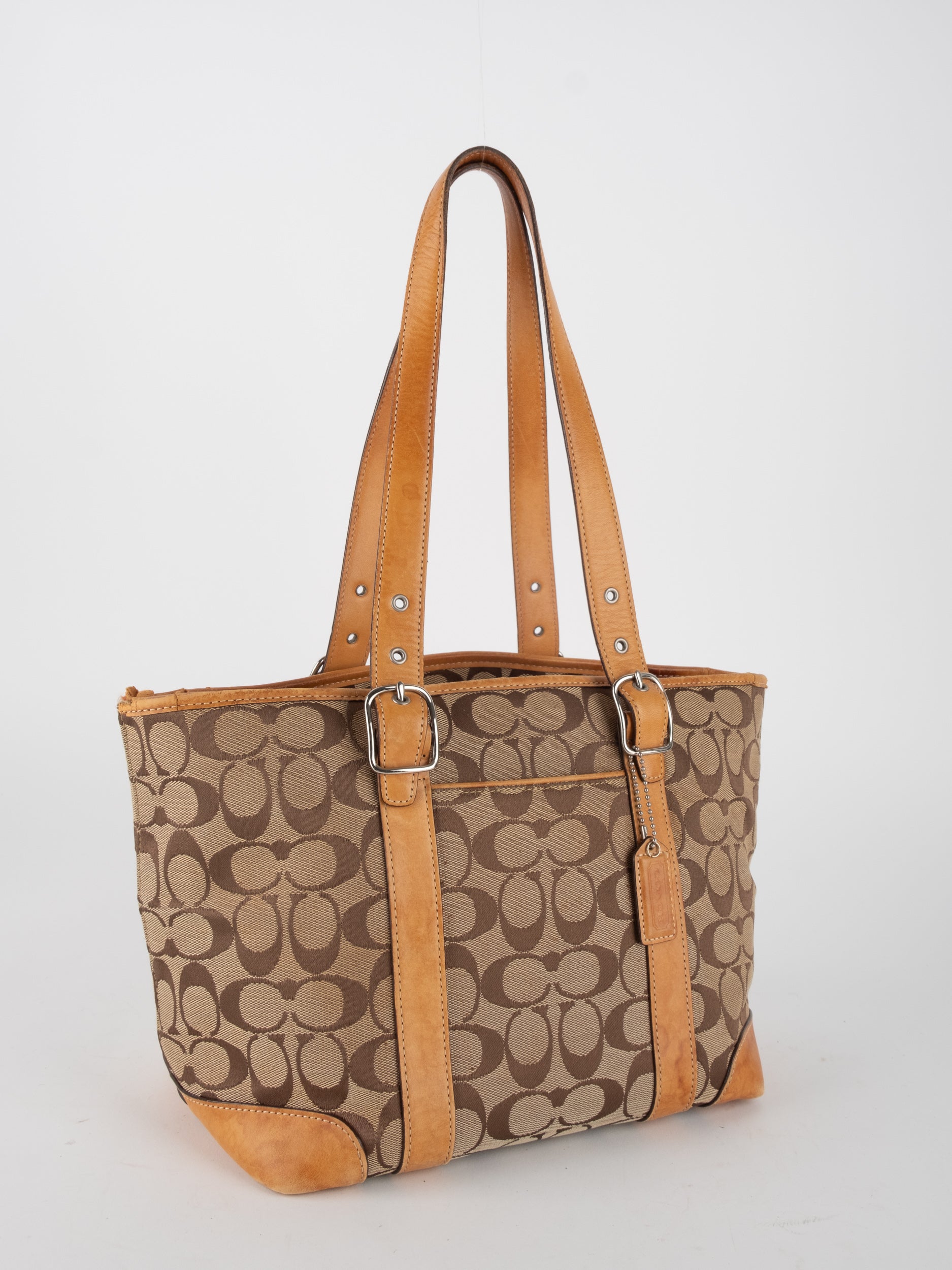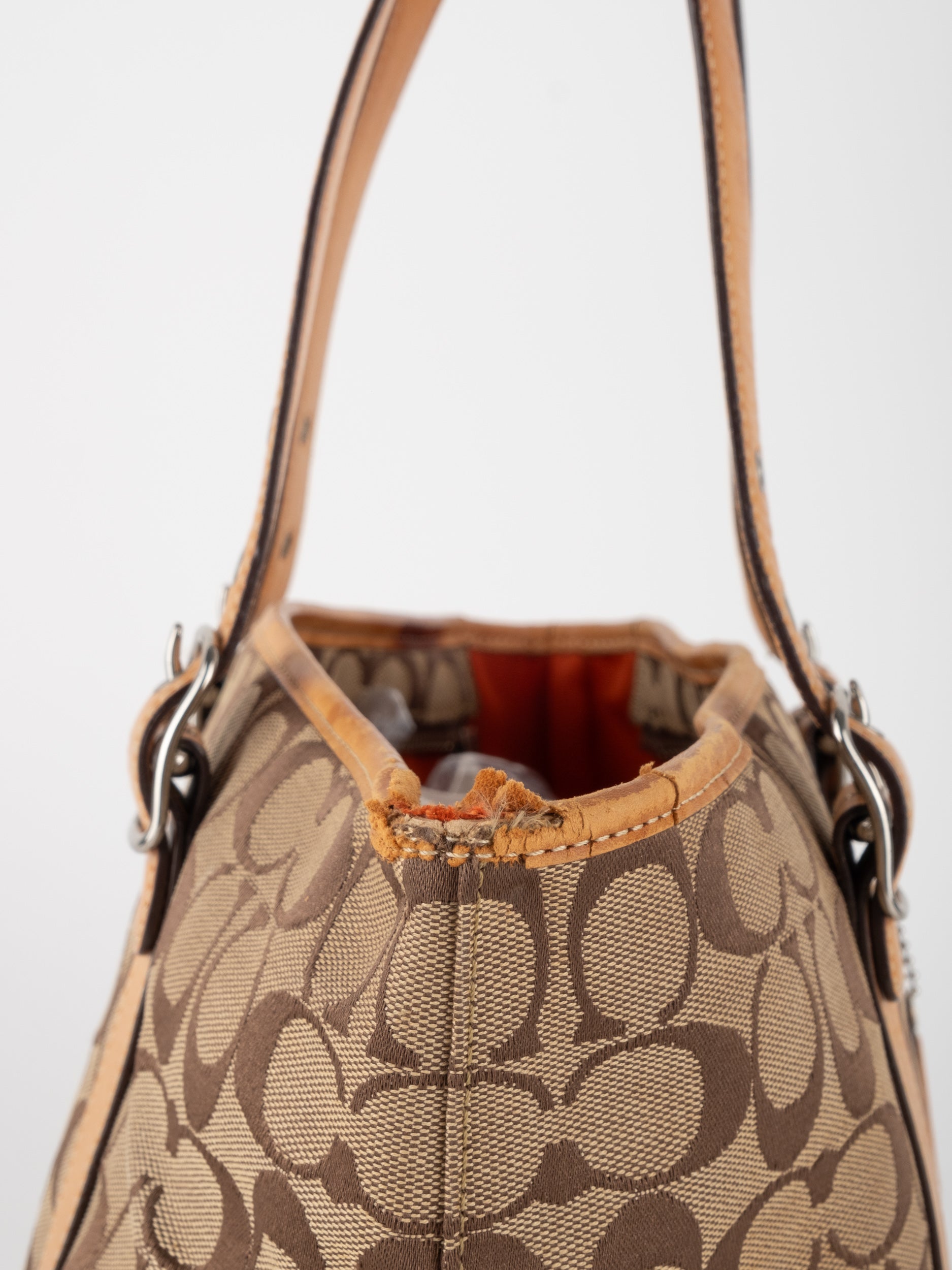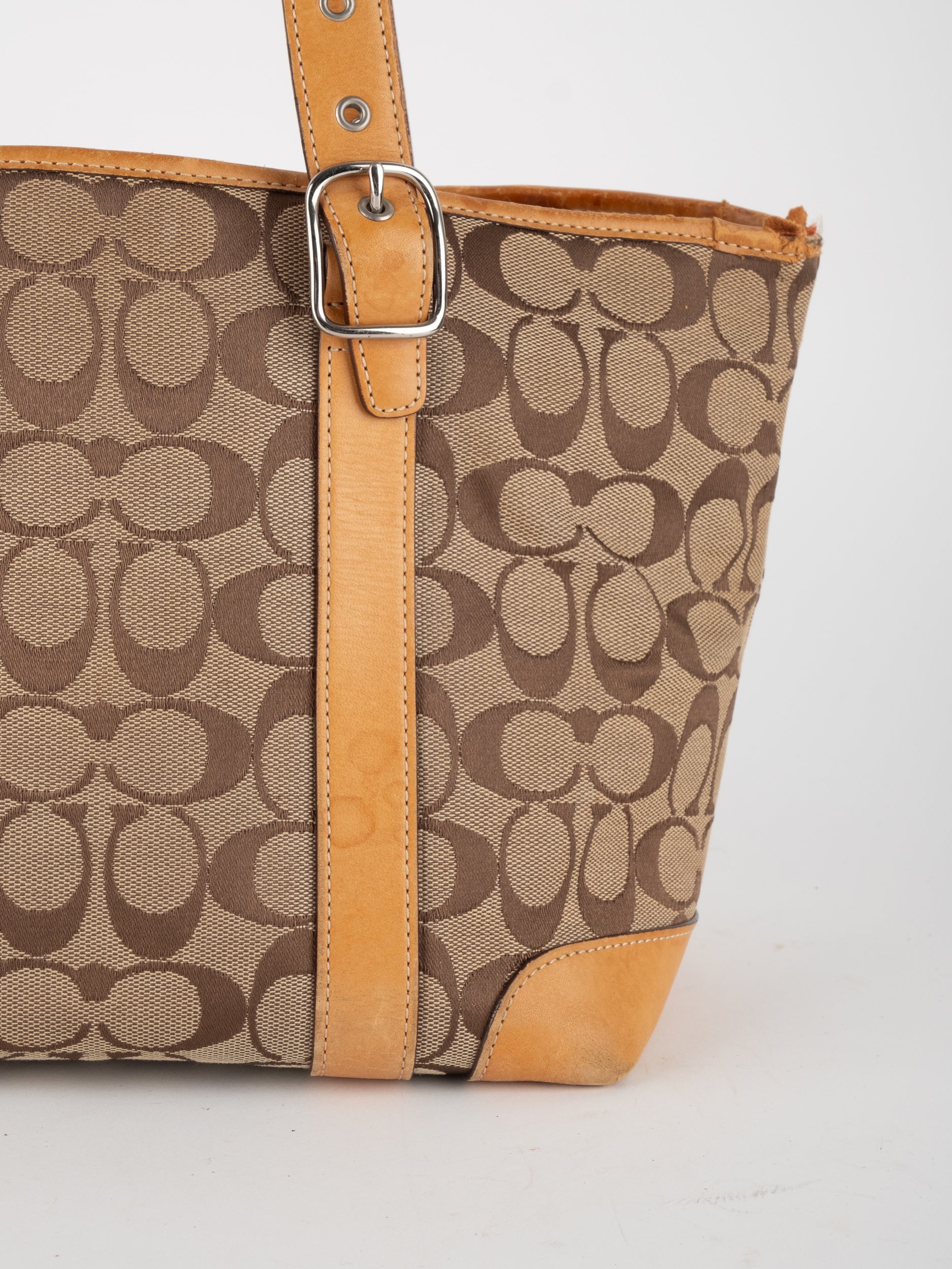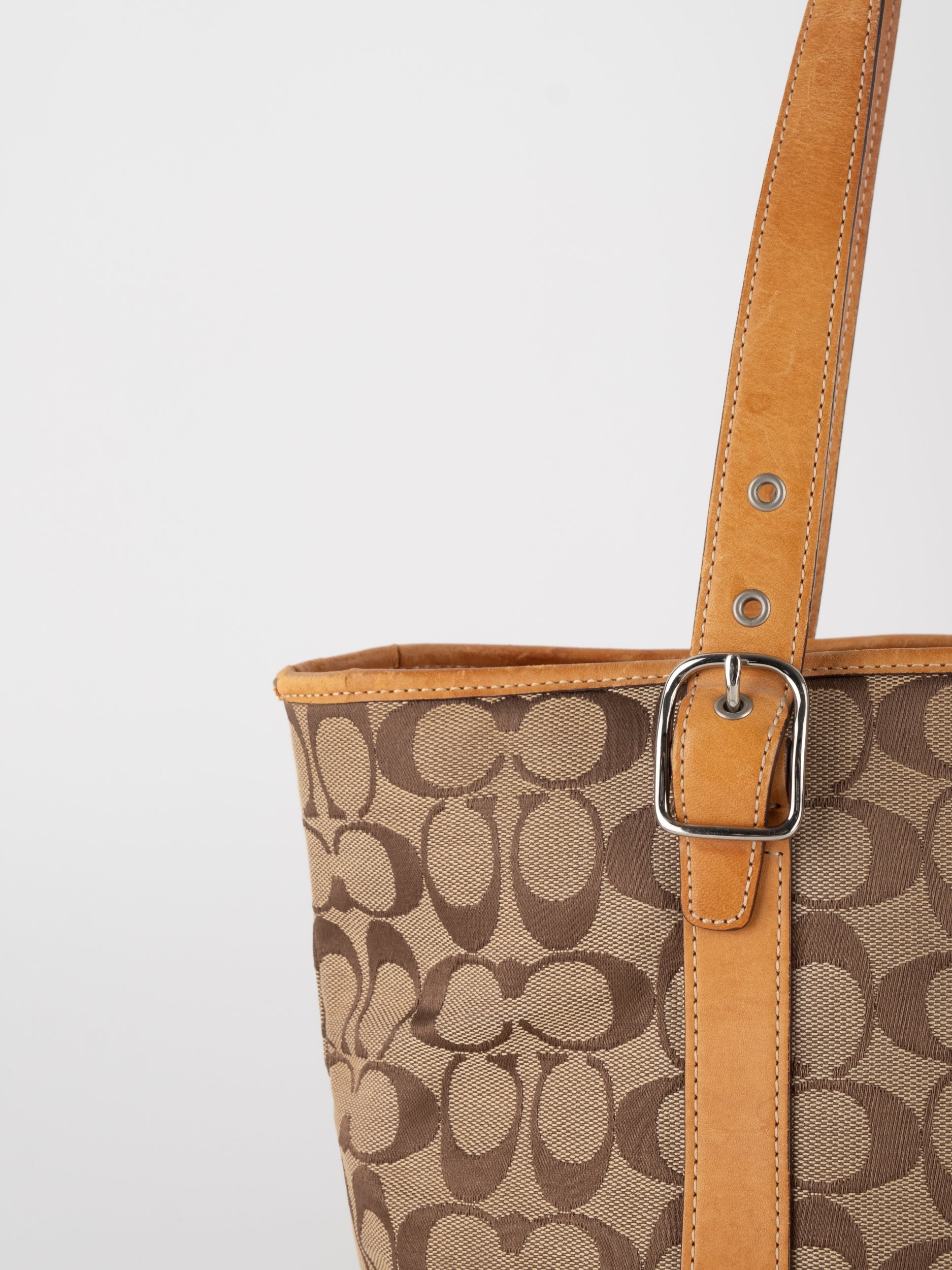 קואץ' COACH וינטג' יד שנייה בדוגמת Signature בגווני בז’ עם רצועות עור בגוון קוניאק חם. ote קלאסי עם אמירה ברורה ומראה אמריקאי על־זמני.