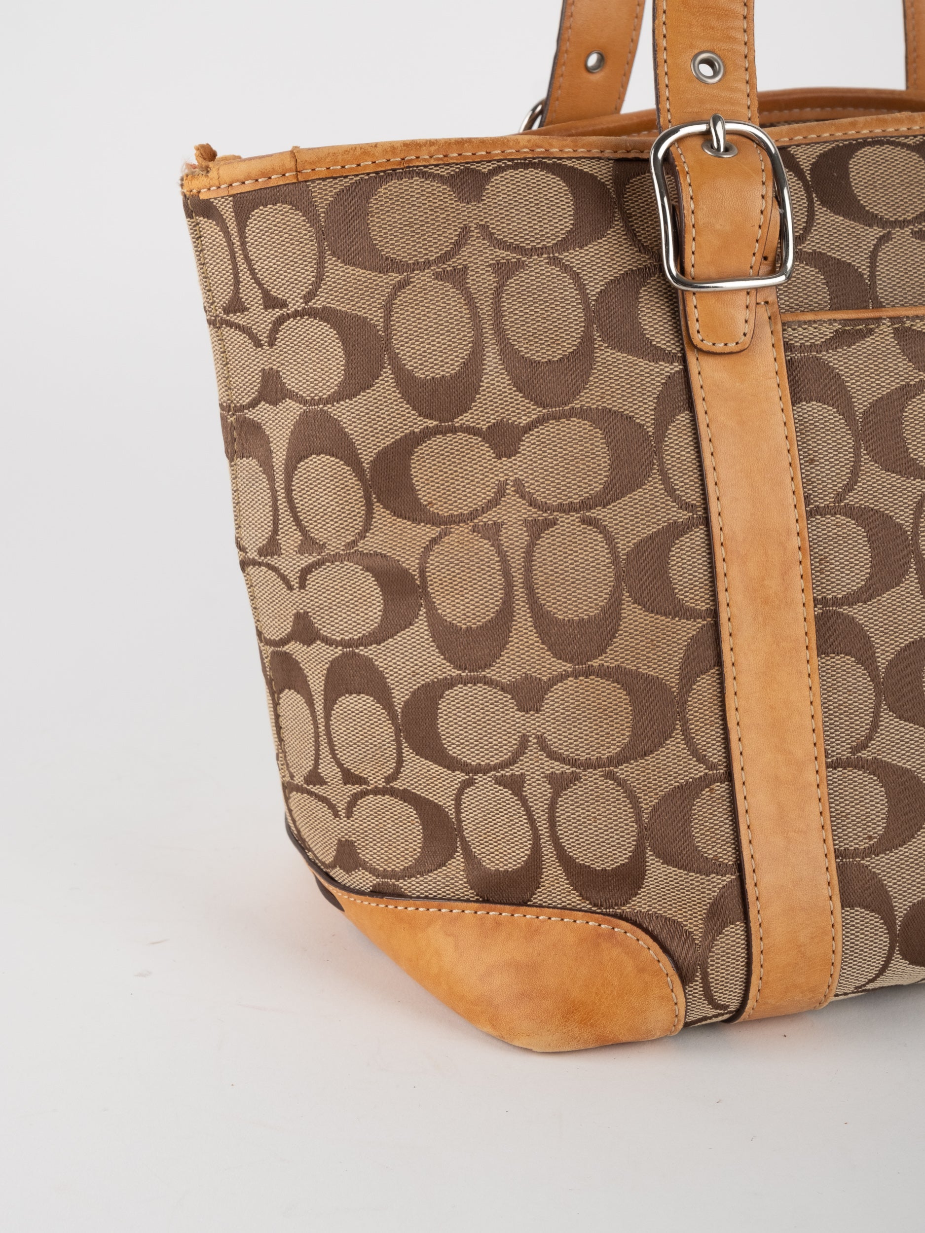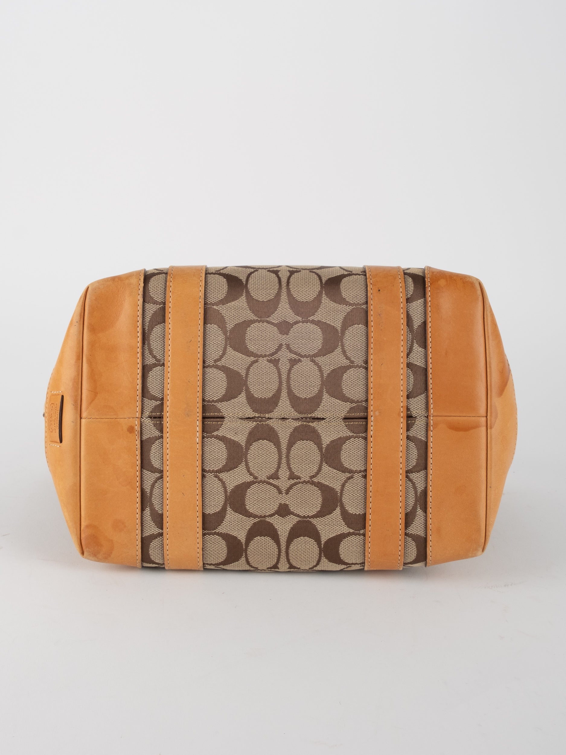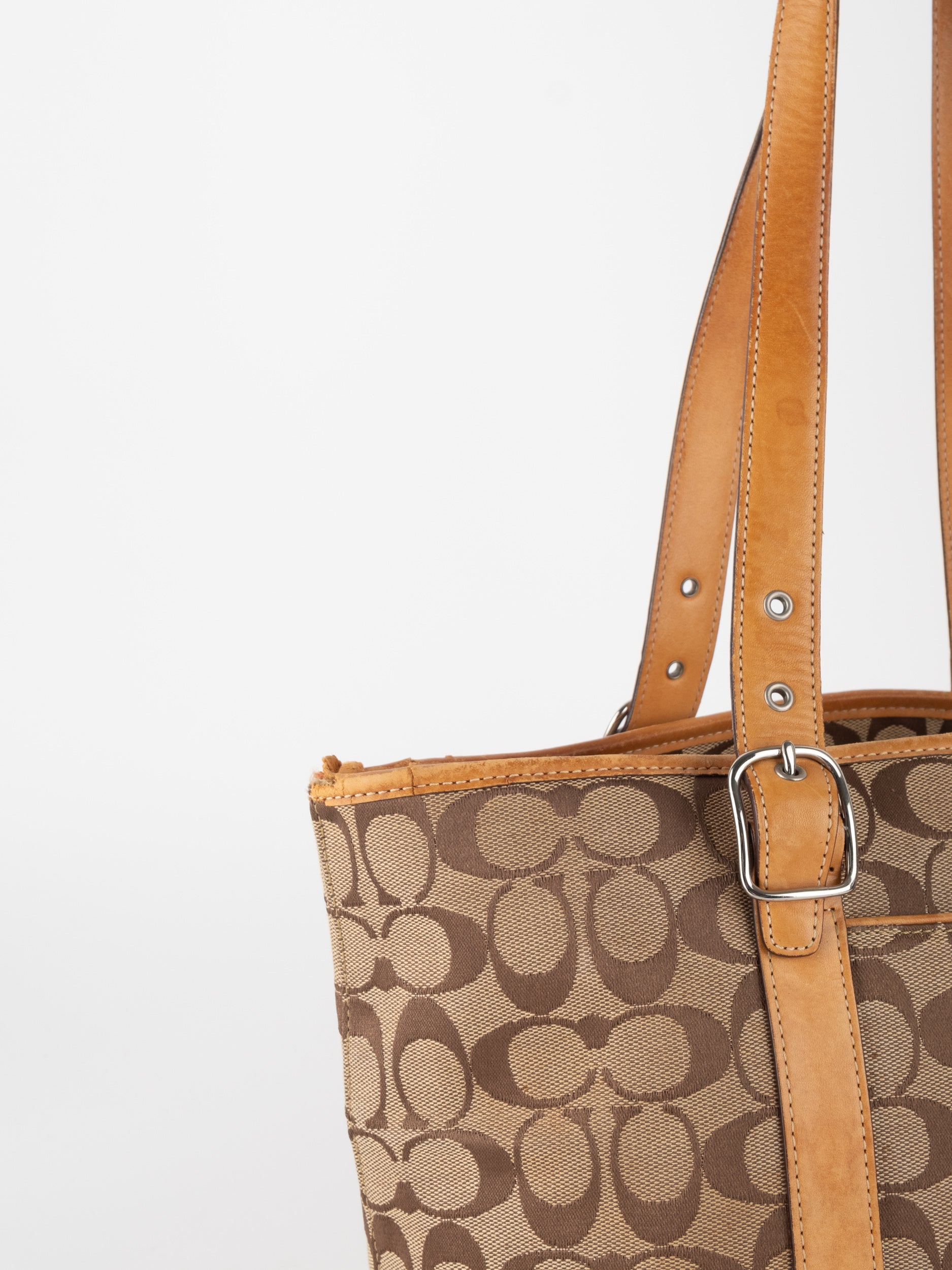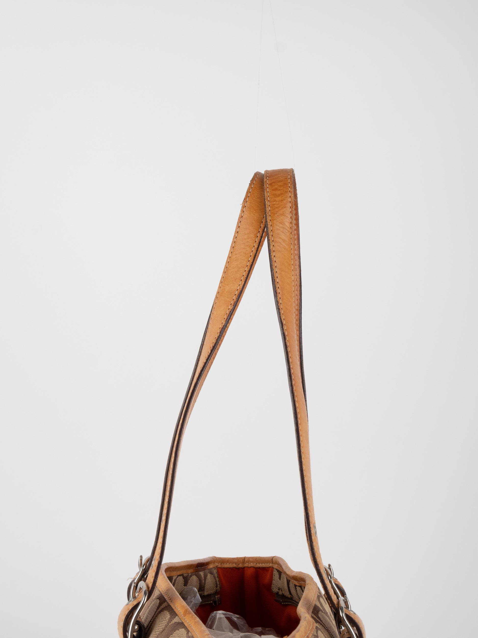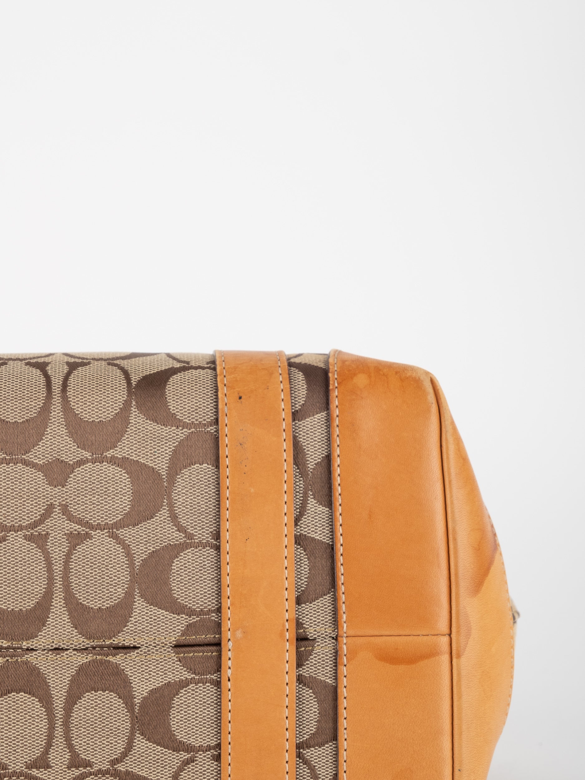 קואץ' COACH וינטג' יד שנייה בדוגמת Signature בגווני בז’ עם רצועות עור בגוון קוניאק חם. ote קלאסי עם אמירה ברורה ומראה אמריקאי על־זמני.