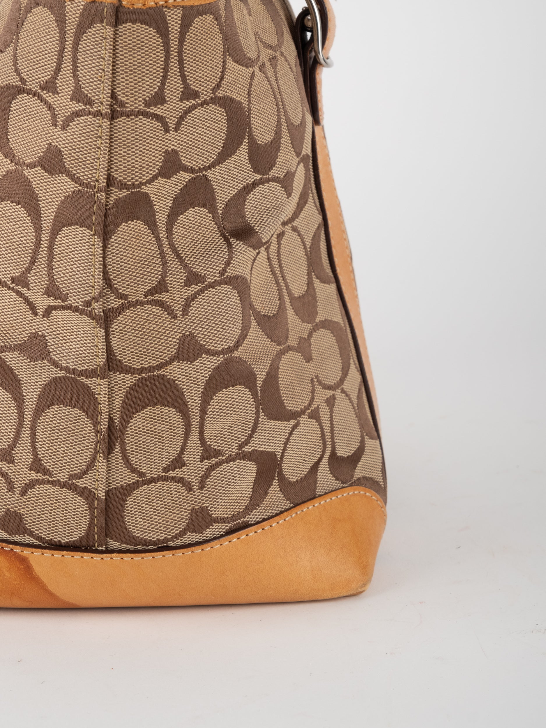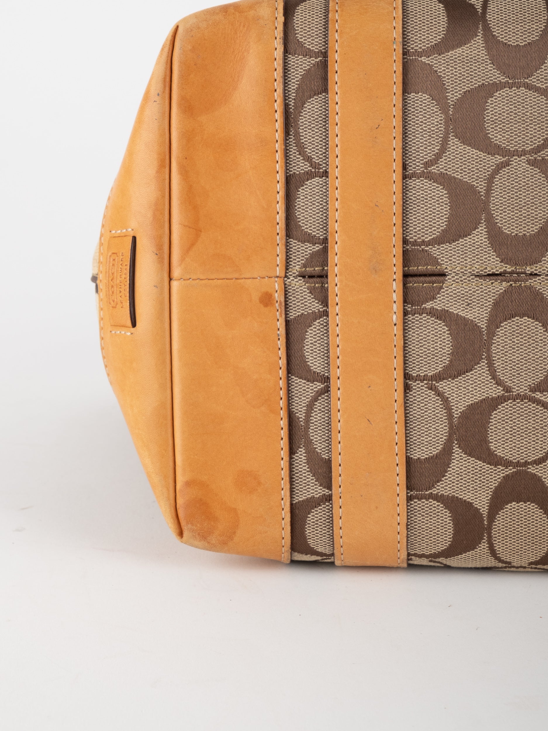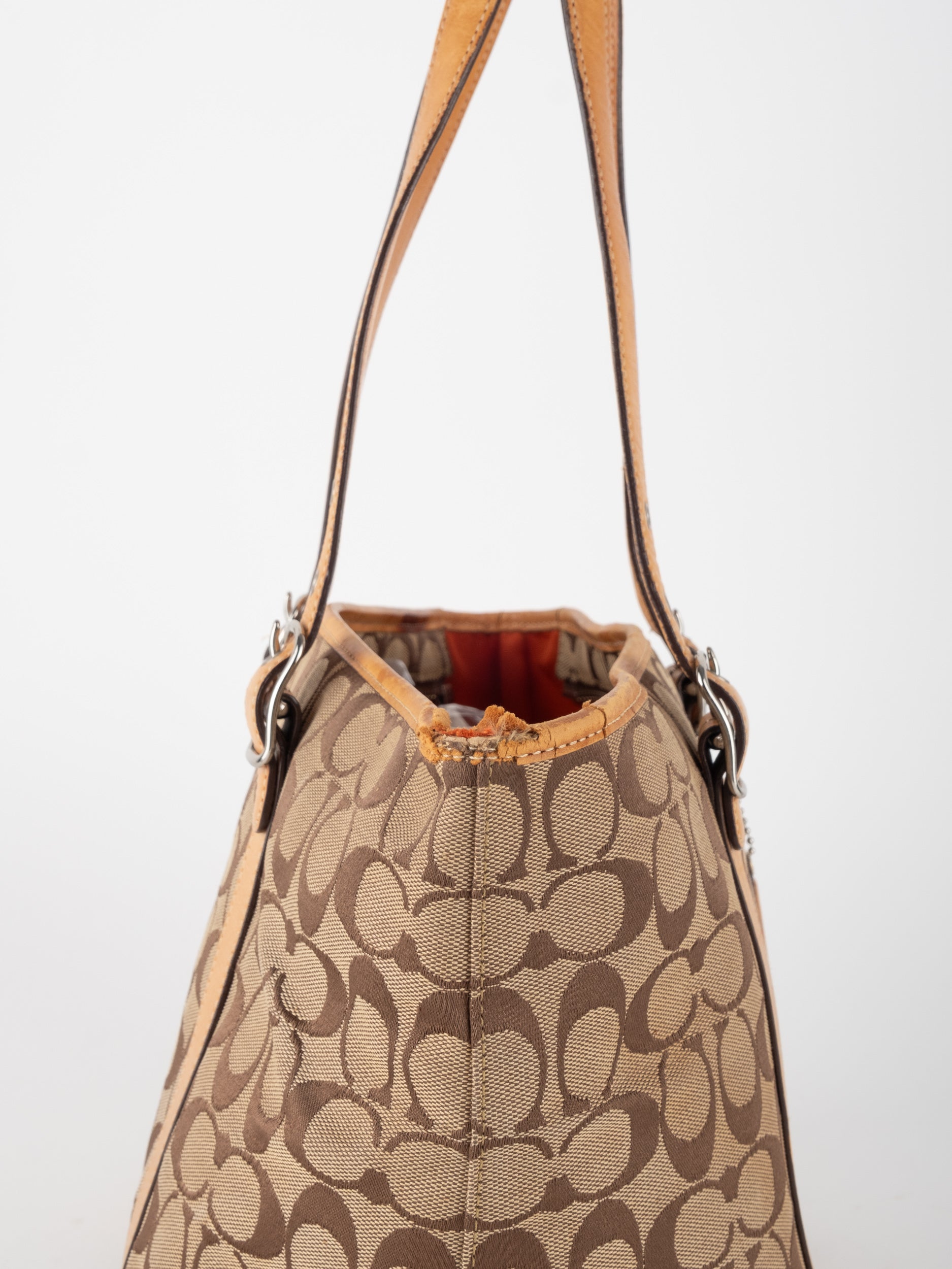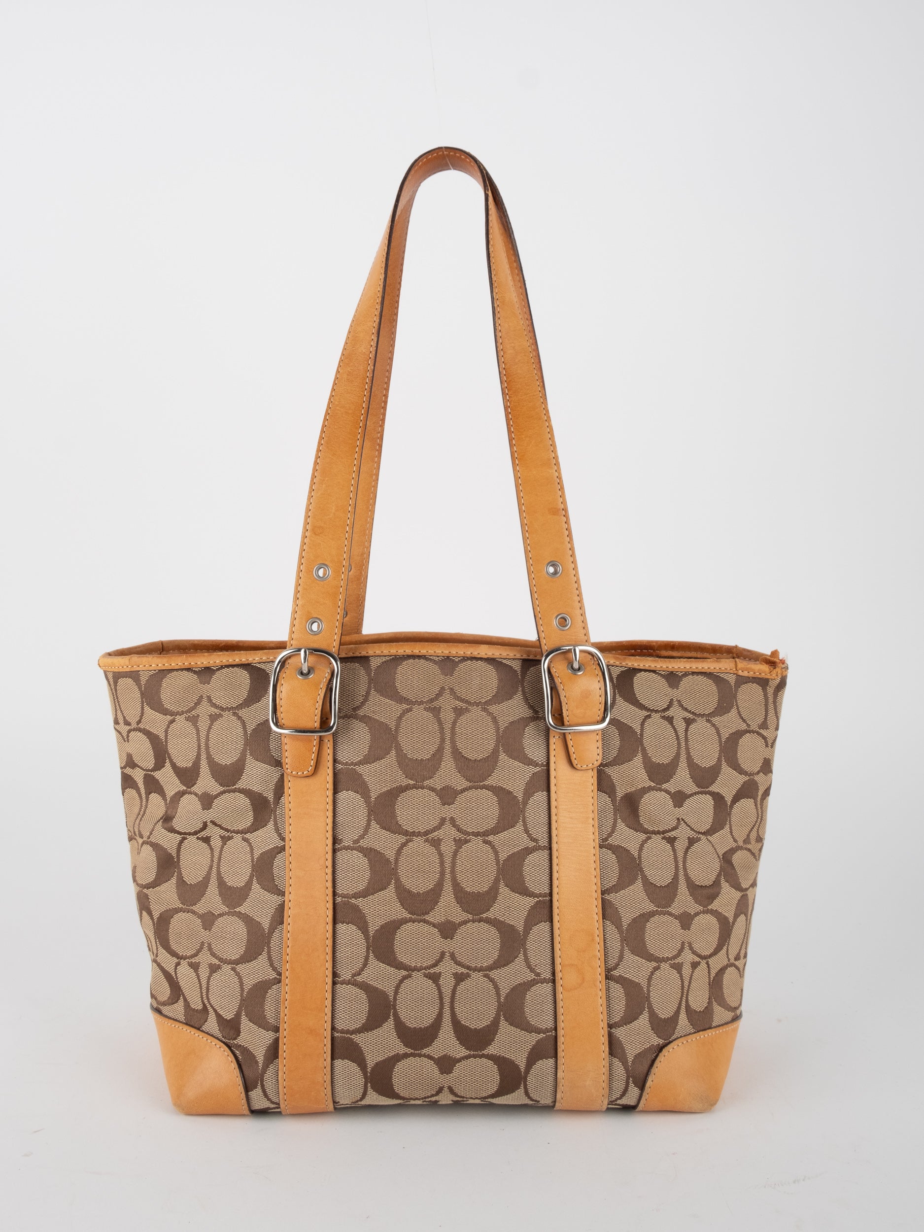 קואץ' COACH וינטג' יד שנייה בדוגמת Signature בגווני בז’ עם רצועות עור בגוון קוניאק חם. ote קלאסי עם אמירה ברורה ומראה אמריקאי על־זמני.